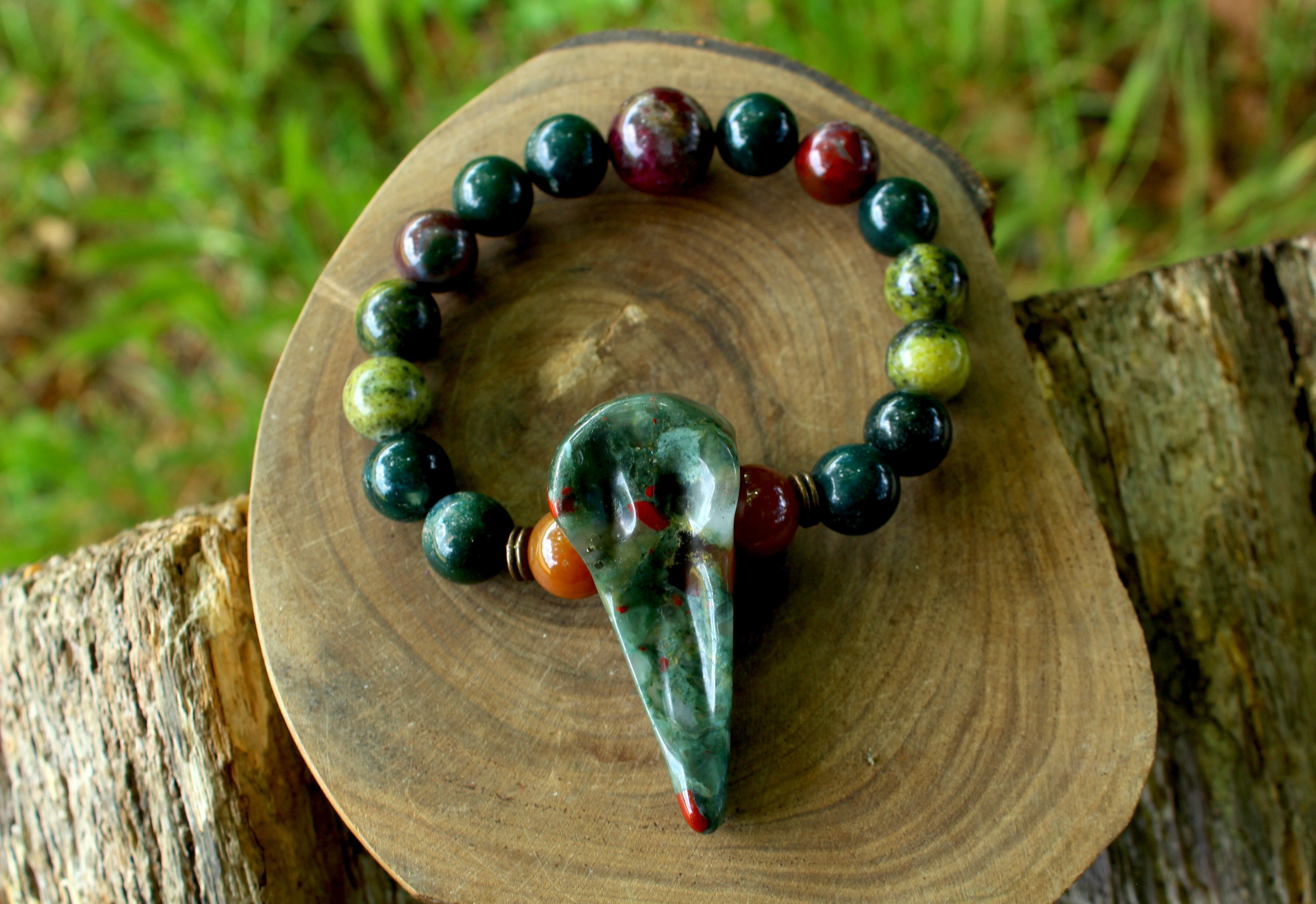 アフリカンブラッドストーンの、グリーンに赤が個性的な、レイブンスカル。強力な癒しの効果を持ち、潜在能力を開花する、神秘的で魔術的な特性を持った石です。同じく10ミリのブラッドストーン、