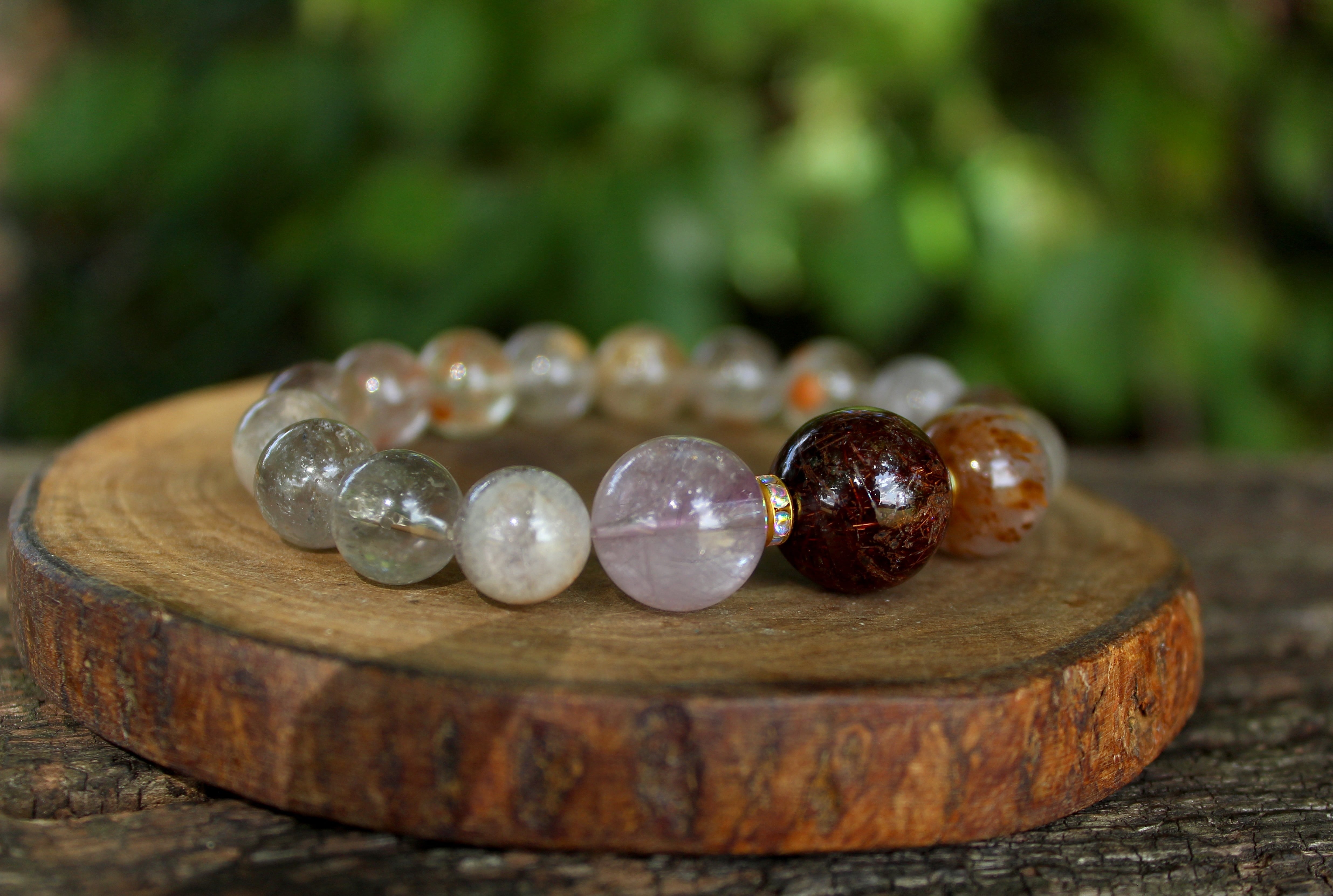 追加のブレスレットは、14.5ミリのオーラライトの複合鉱物が多く入っており、濃い色合いになっています。10ミリのオーラライトは、逆に内包物が少なめで淡い色合いです。