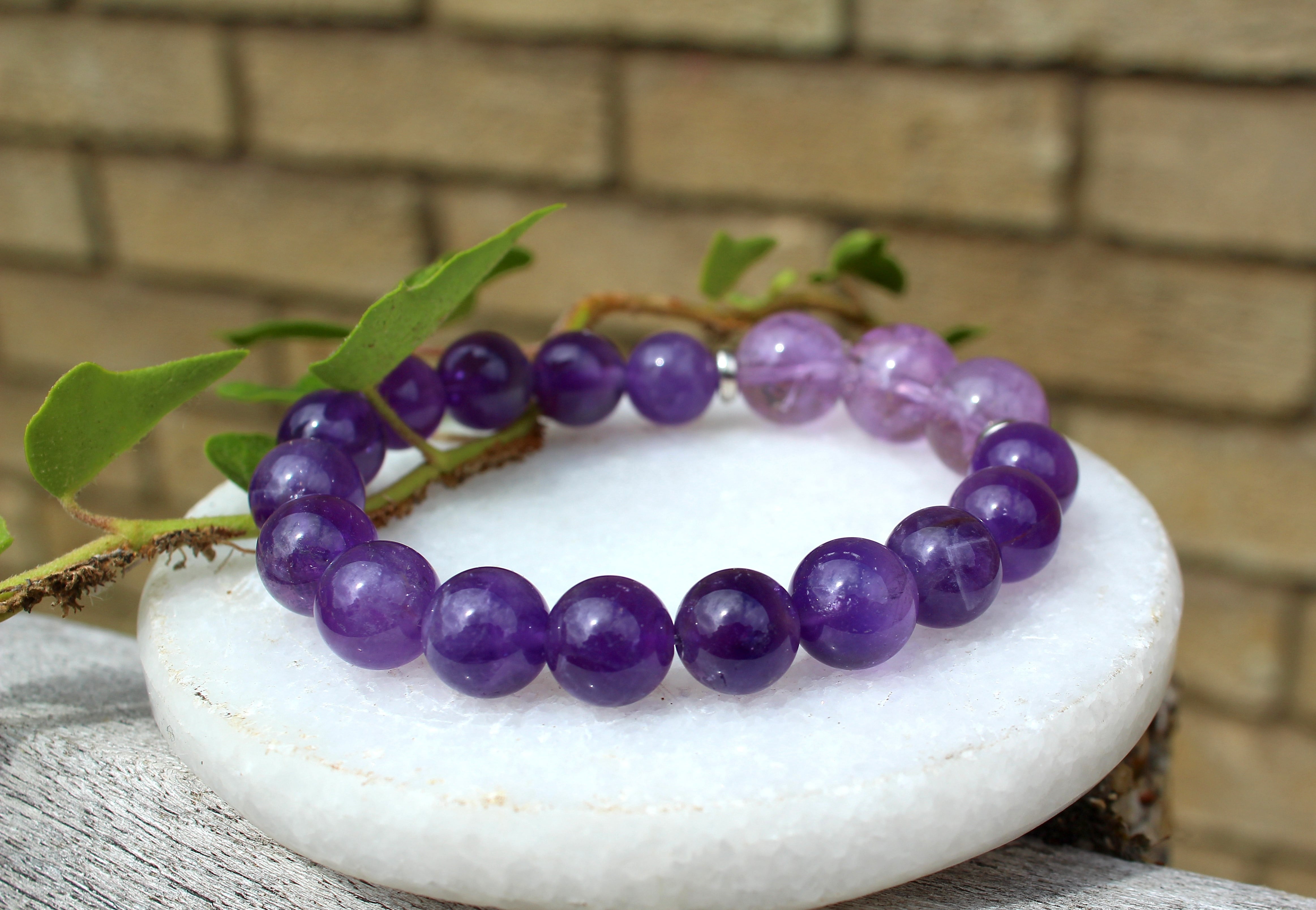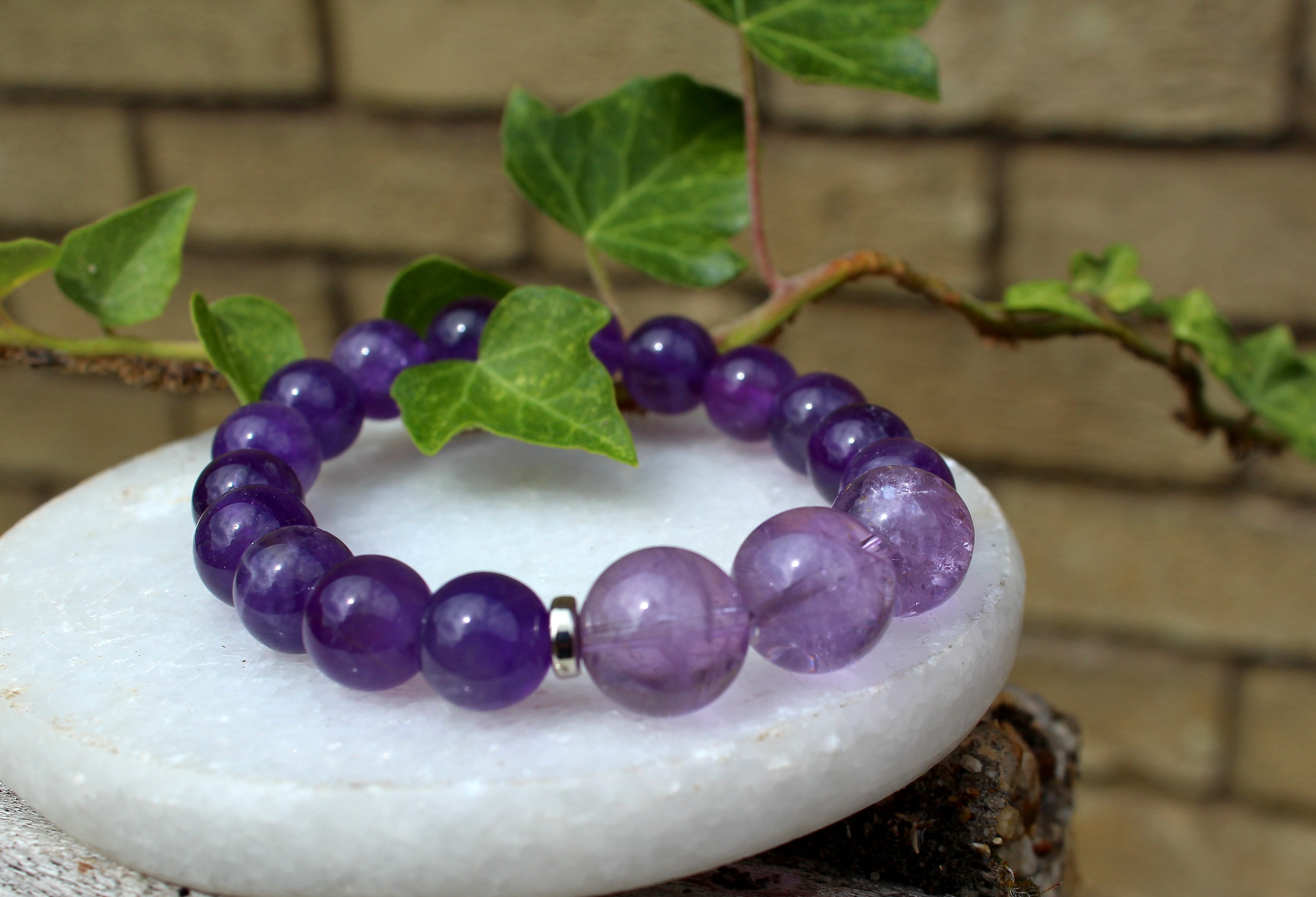 アメジストは「恋愛成就の石、愛の守護石」ともいわれ、真実の愛を守りぬく強さを育て、恋人、家族、友人との絆を深めます。インスピレーションや直感力を高める作用があり、高度なチャネリングやテレパシーが可能になったり、守護霊を強くして邪悪な霊から身を守ってくれます。周囲に流されない強い心と冷静な判断力が与えられます。心配、怖れ、不安など強く感じる人は、お守りとしてこの石を持つと良いでしょう。心の余裕や精神の安定をもたらしてくれます。紫は芸術的な色でもあるので、アートに感心のある方にも良いでしょう。集中力を養い、優れた創造力や表現力を養います。