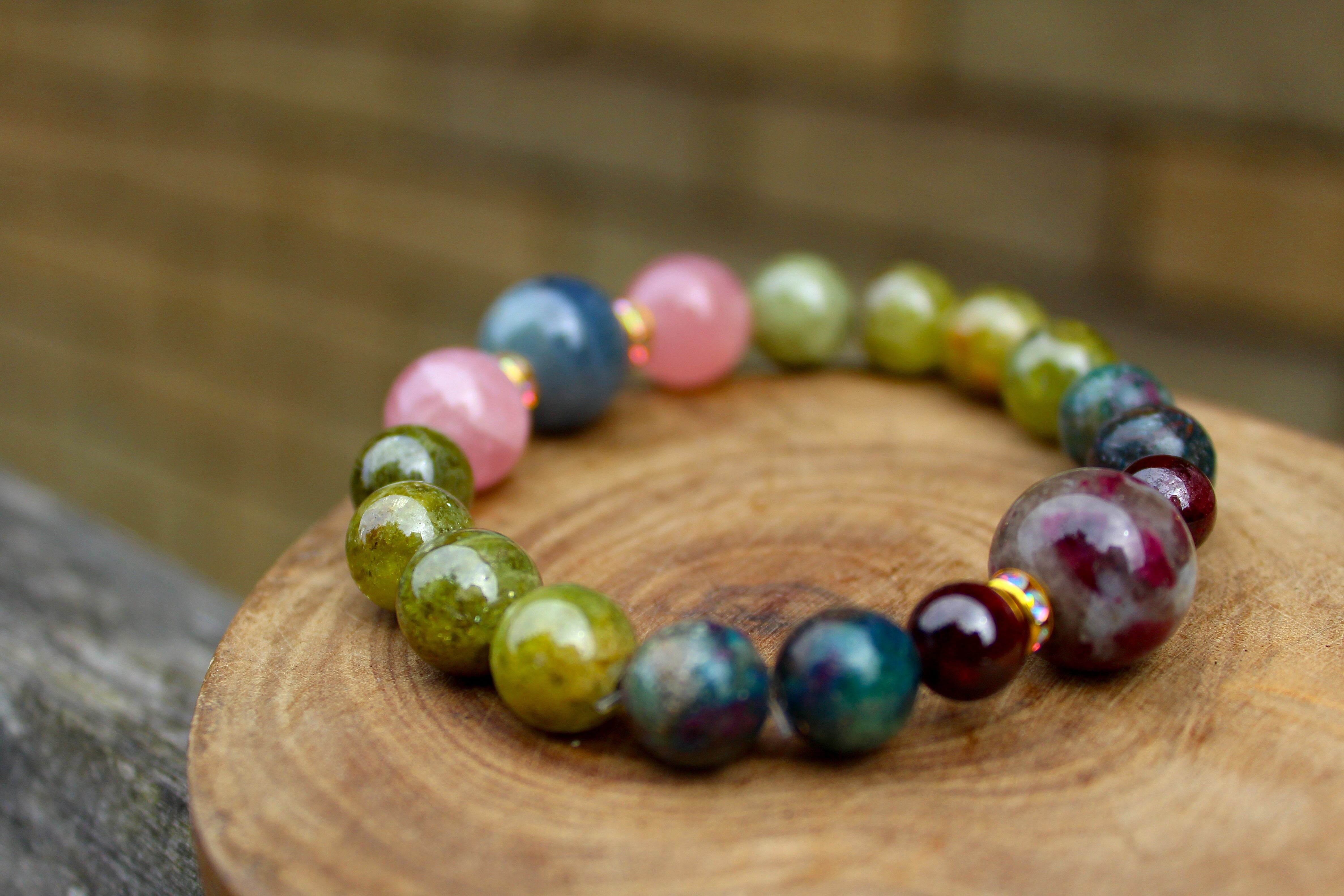 中心に14ミリのブルーサファイア、13ミリのAAA級マダガスカルローズクォーツ、10ミリのツァボライト、10ミリのカイヤナイトルビー、8ミリのガーネット、最後に14ミリのレッドホワイトマダガスカルユーディアライトAAA級で組ませました。