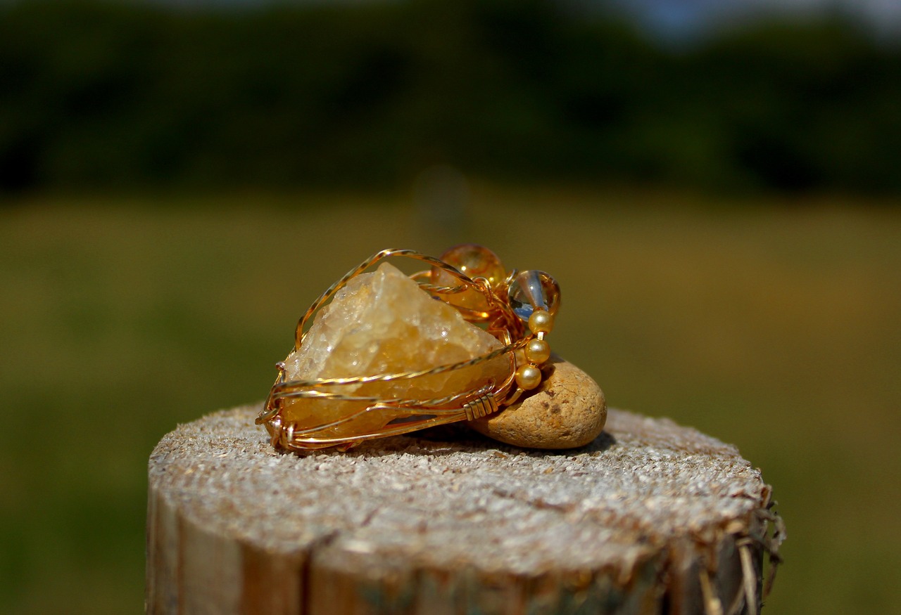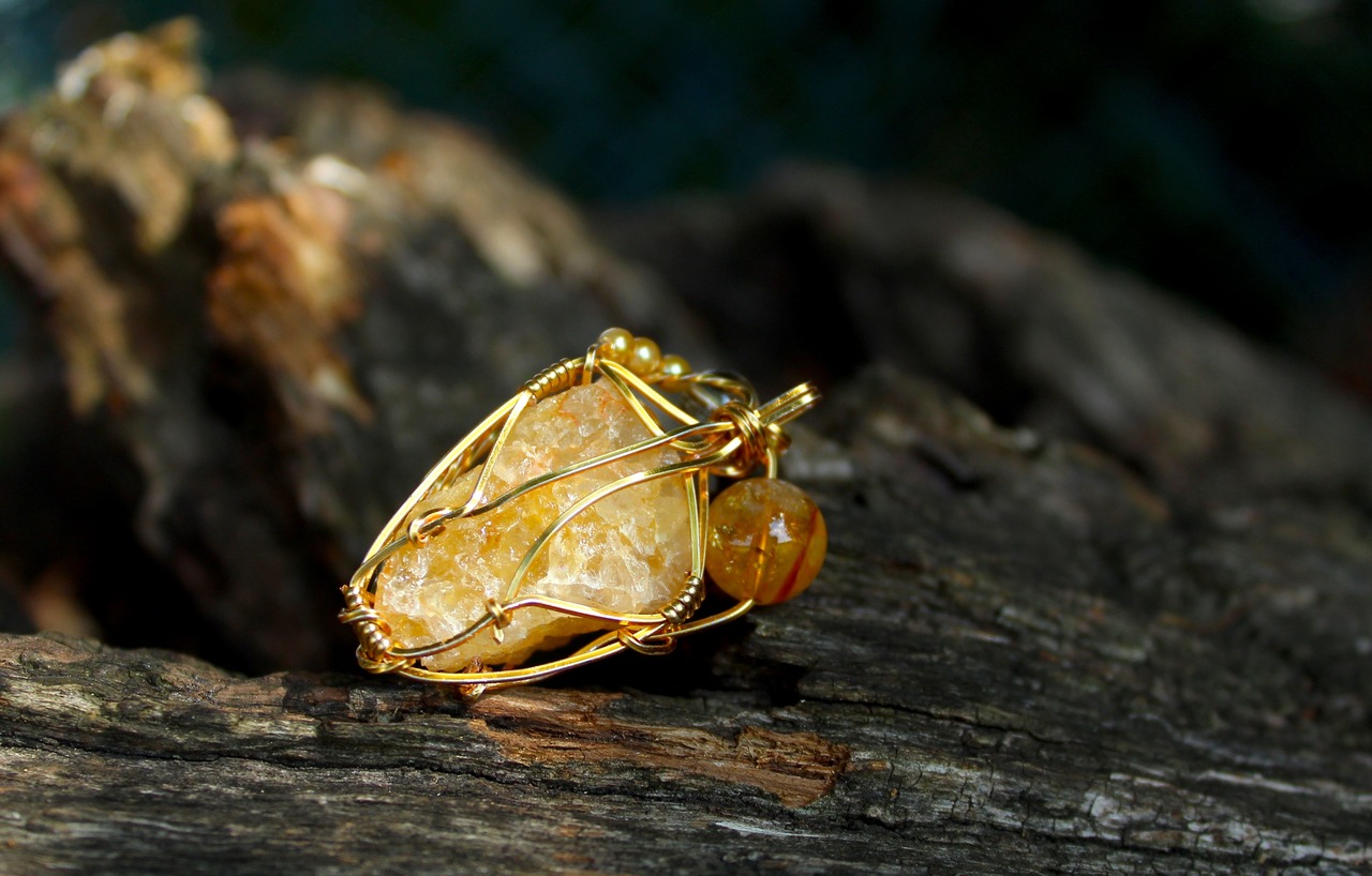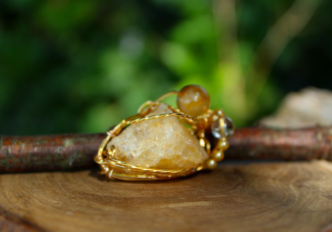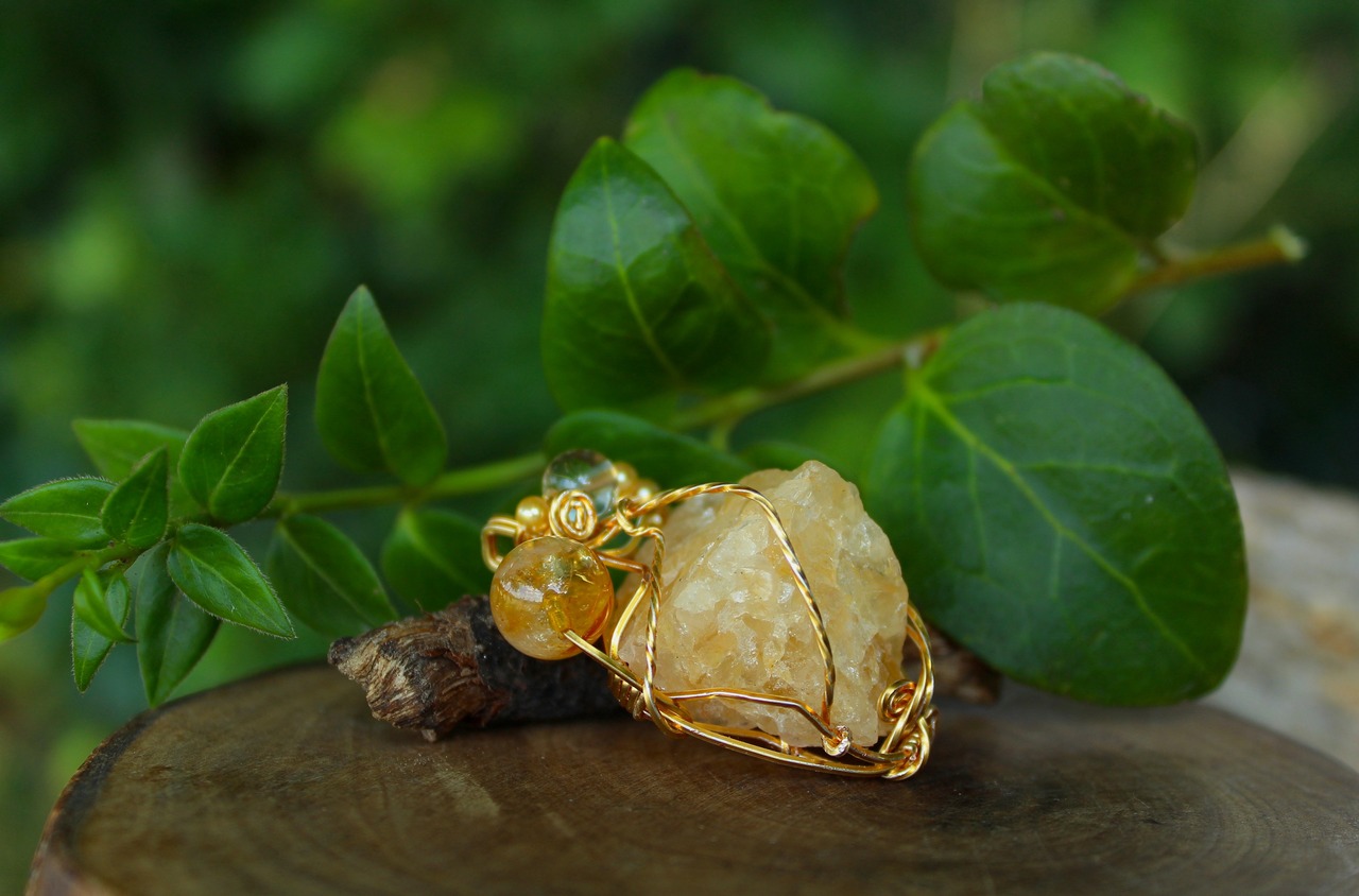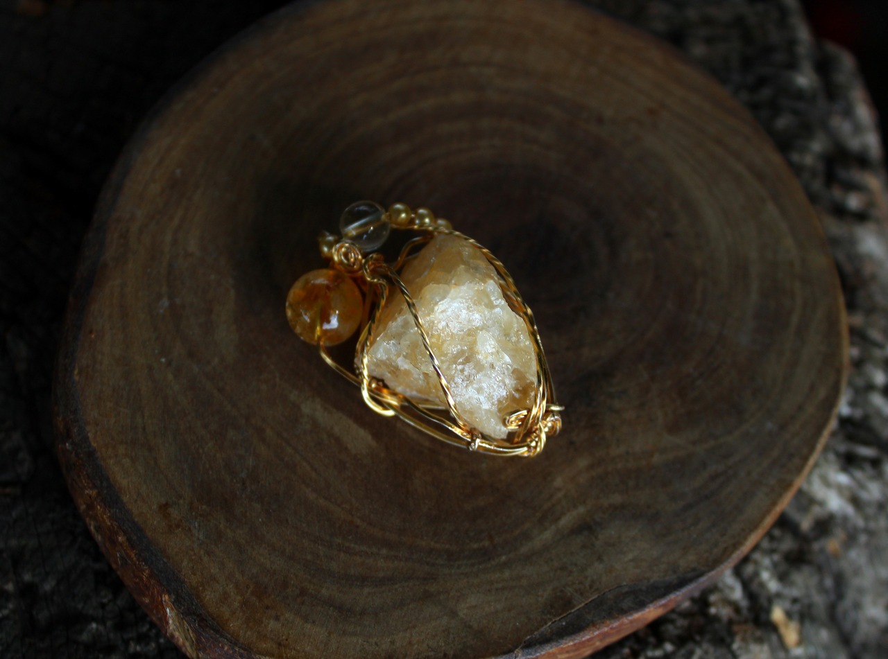 ゴールドの光に合わせて、ゴールドのワイヤーで巻いて、同じく美しいゴールドのシトリンの大玉ビーズを合わせました。