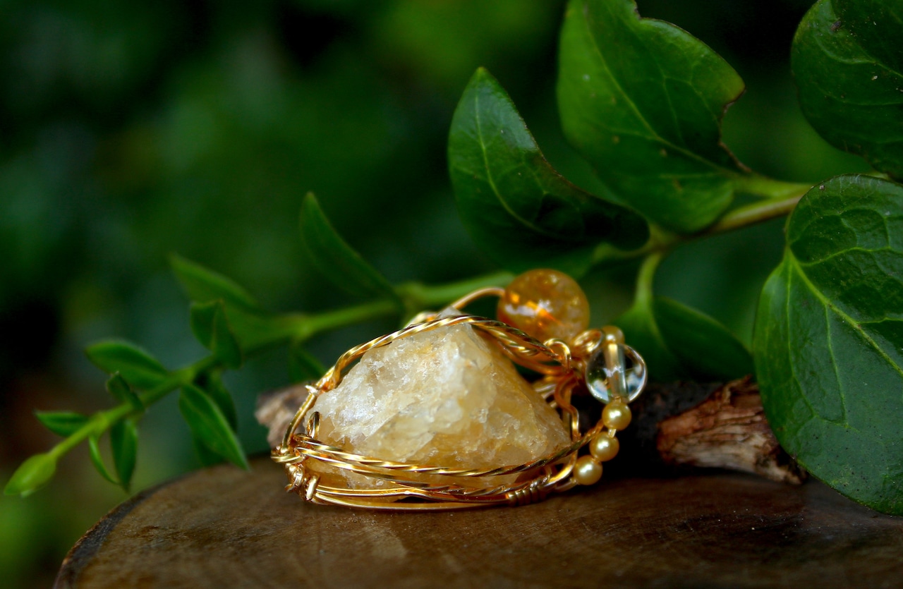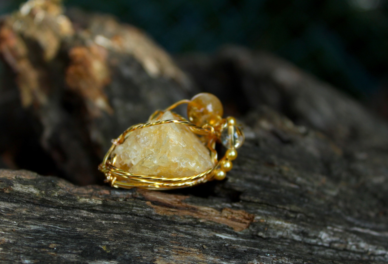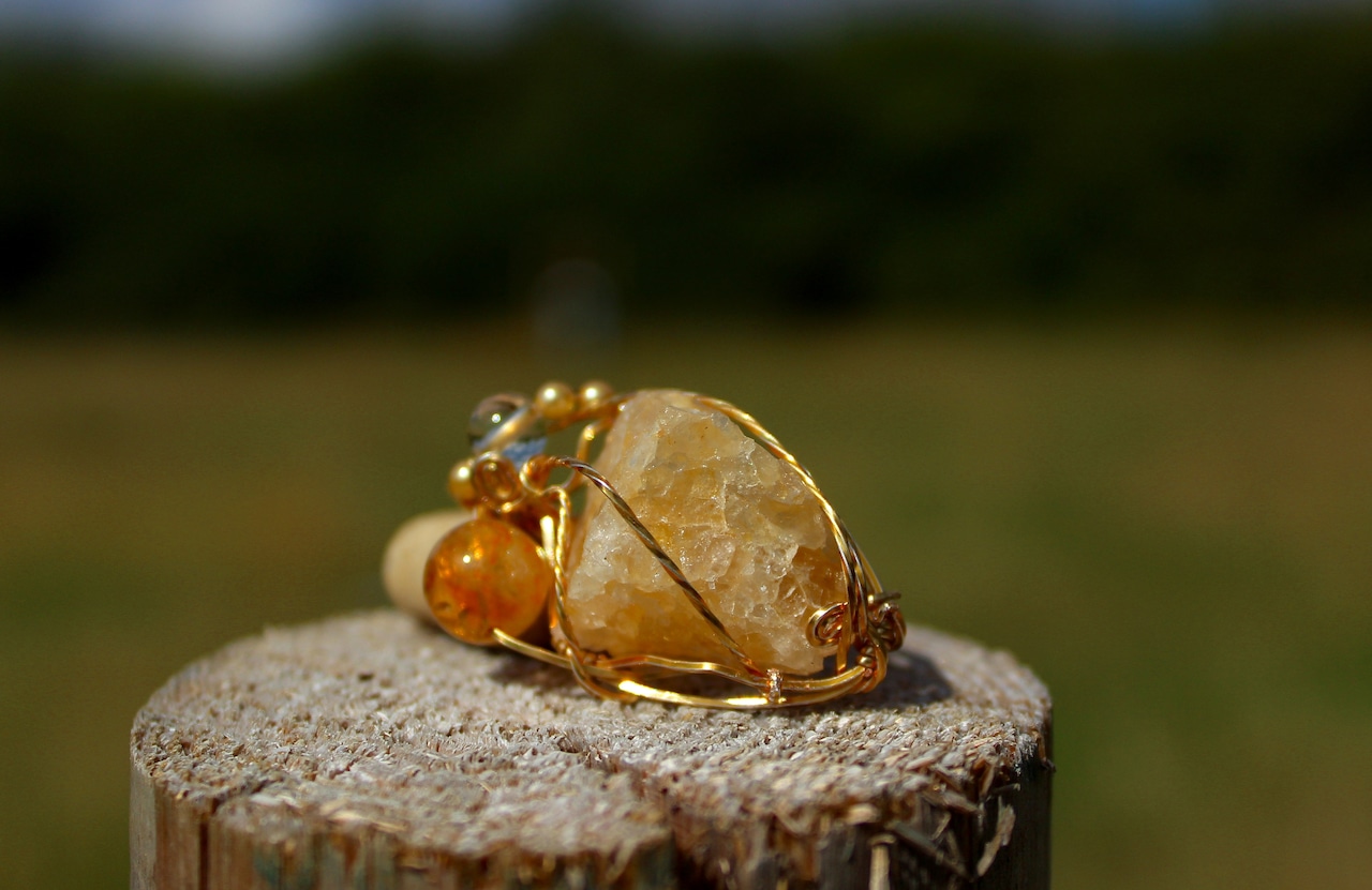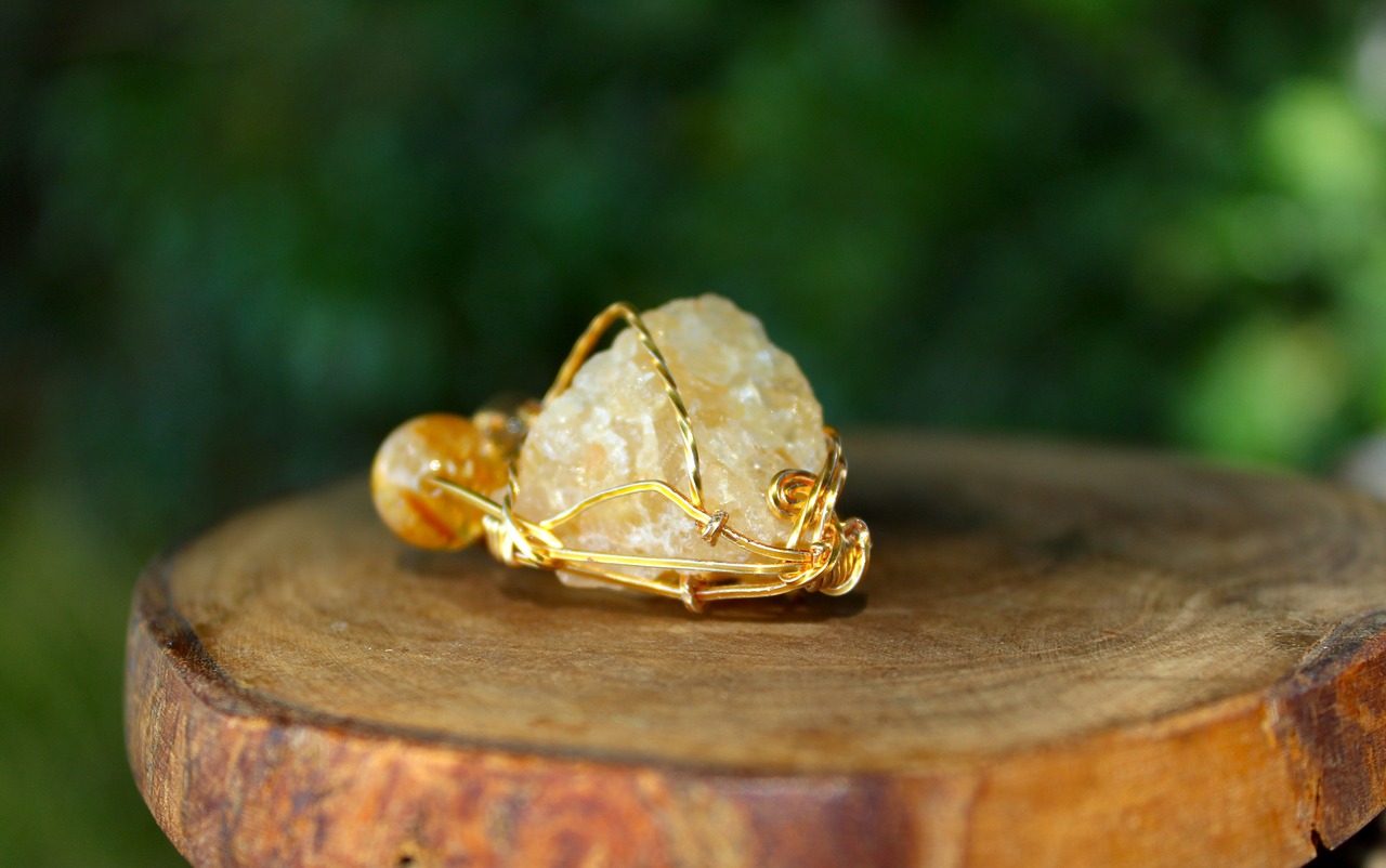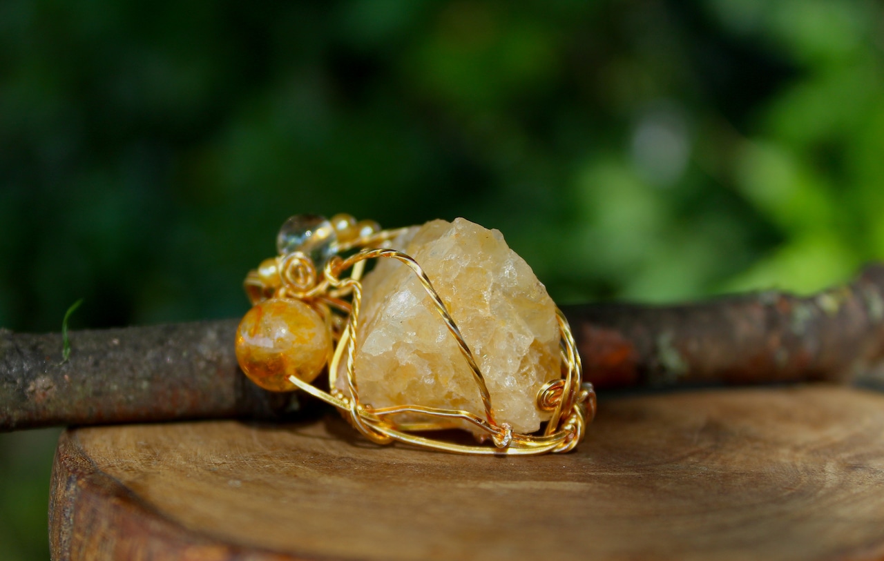 ゴールドの光に合わせて、ゴールドのワイヤーで巻いて、同じく美しいゴールドのシトリンの大玉ビーズを合わせました。