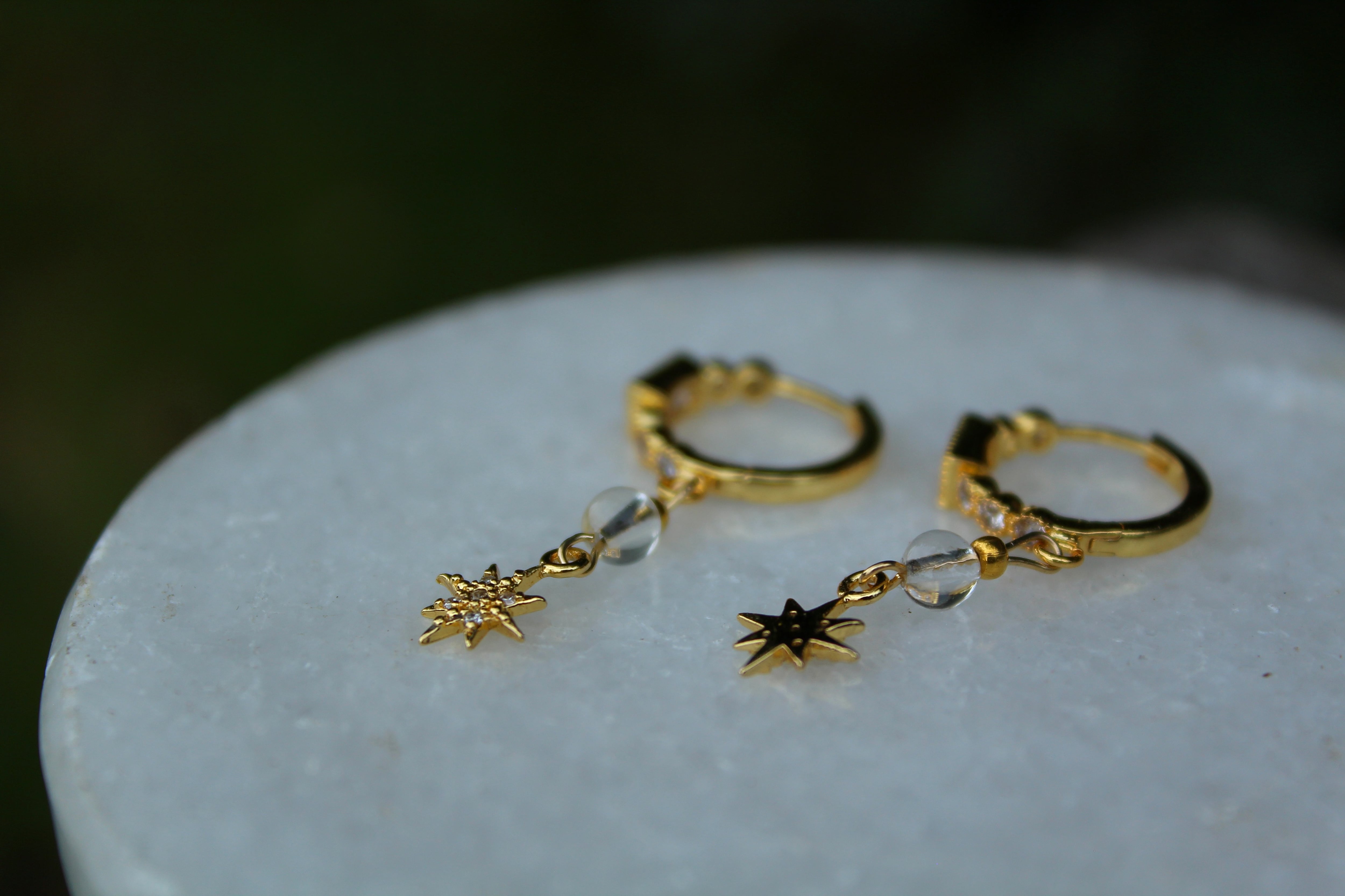 ラインストーンのゴージャスなスタッズイアリングのパーツに、4ミリの水晶と、ゴールドのスターのパーツを合わせました。