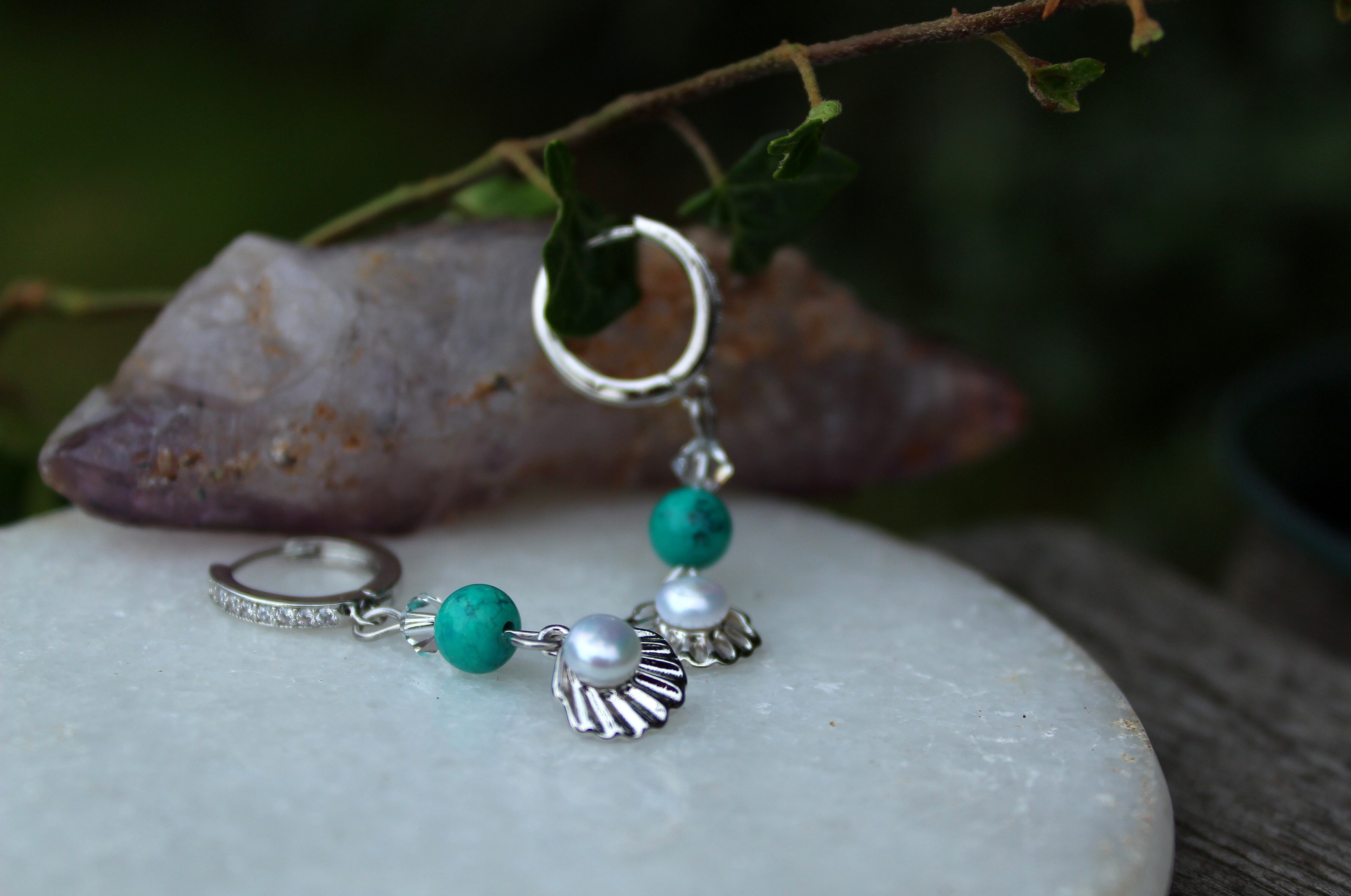シルバーのラインストーン入りのイアリングパーツに、6ミリのターコイズと、貝にパールがあしらわれたシルバーのパーツを組ませました。