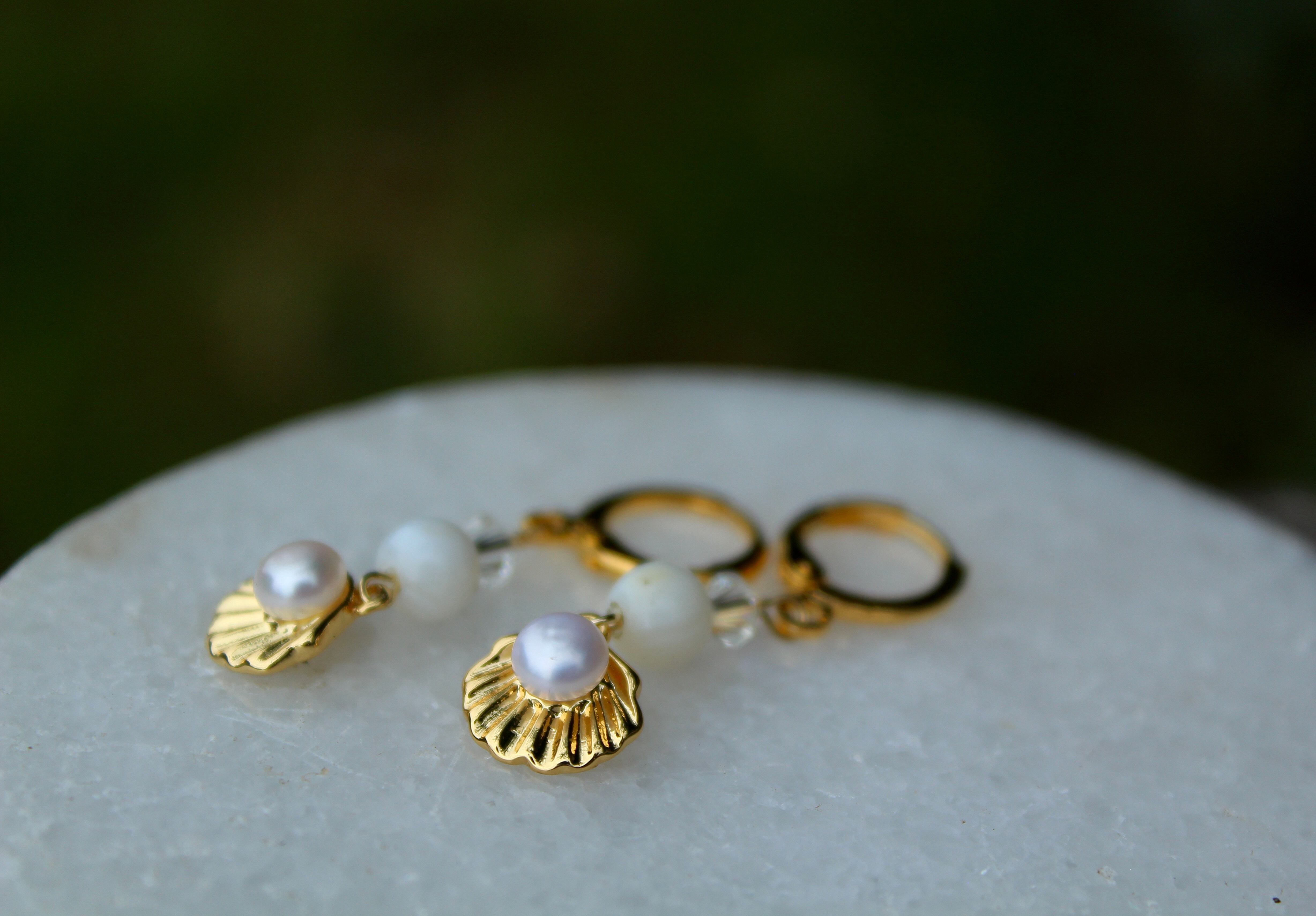 ゴールドのイアリングパーツに、6ミリのマザーオブパールと、貝にパールがあしらわれたゴールドのパーツを組ませました。