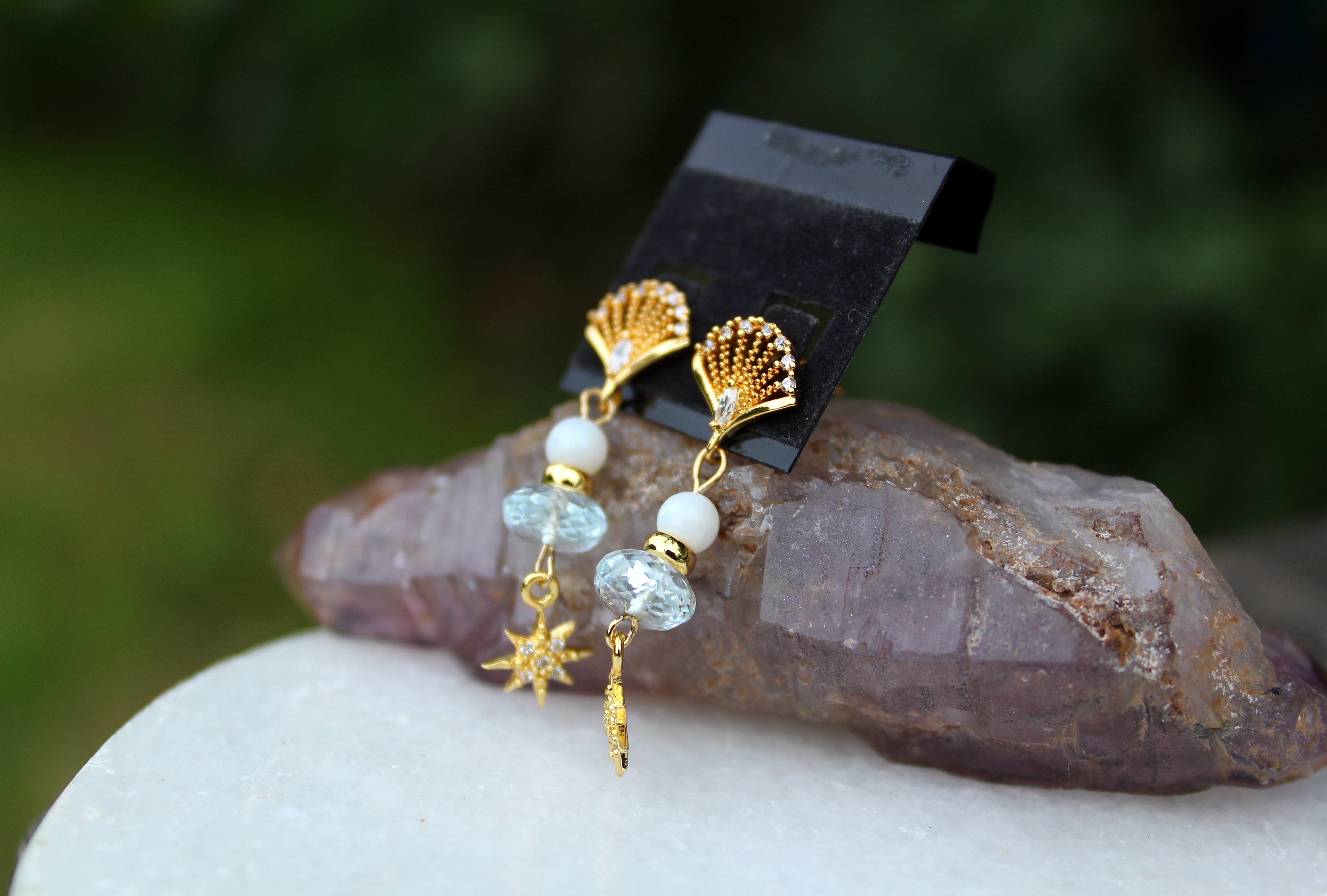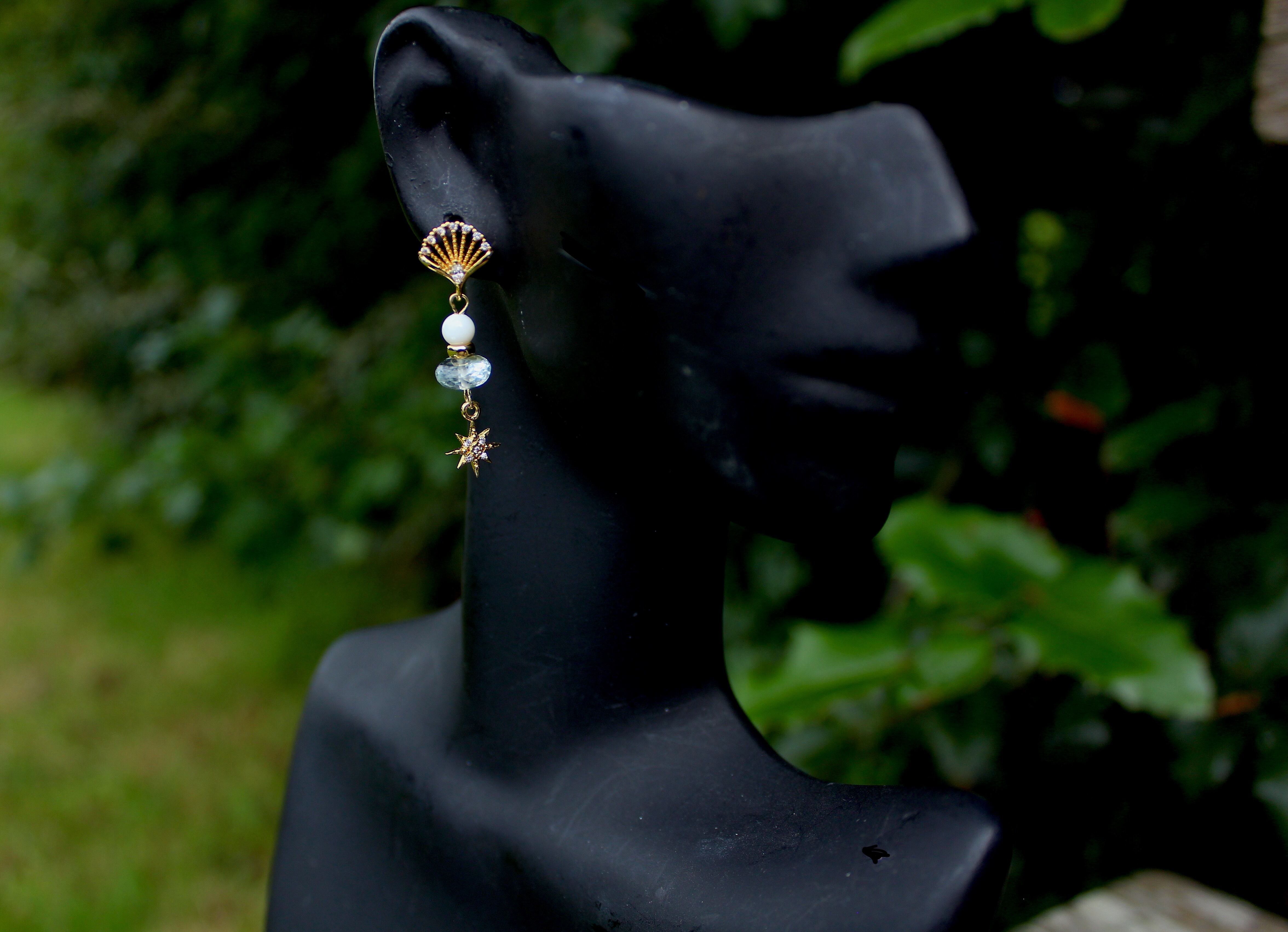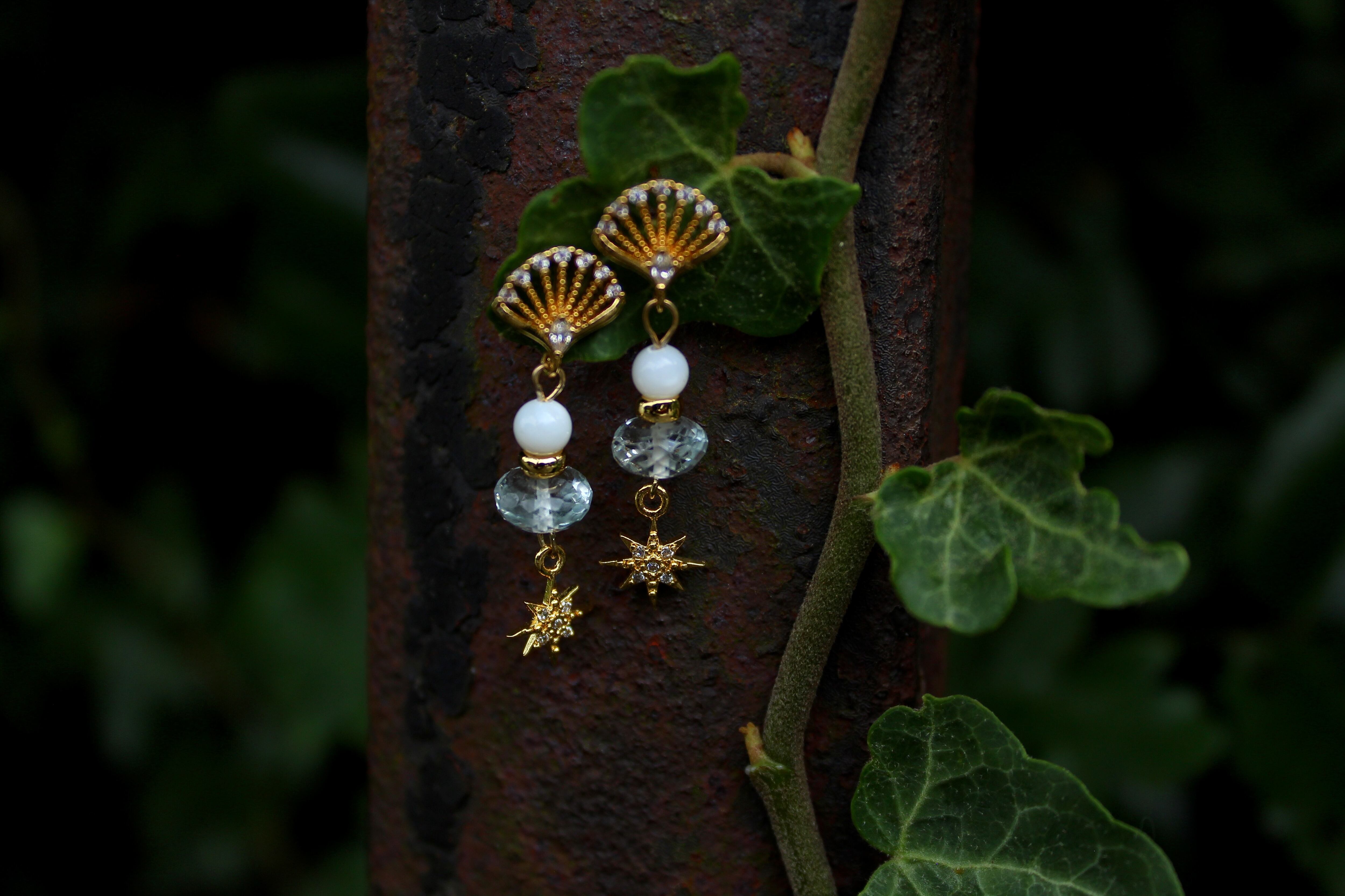 扇の形のスタッズパーツに、4ミリのマザーオブパールと8ミリのブルートパーズを組ませました。さらに、ゴールドのスターパーツをあしらってあります。