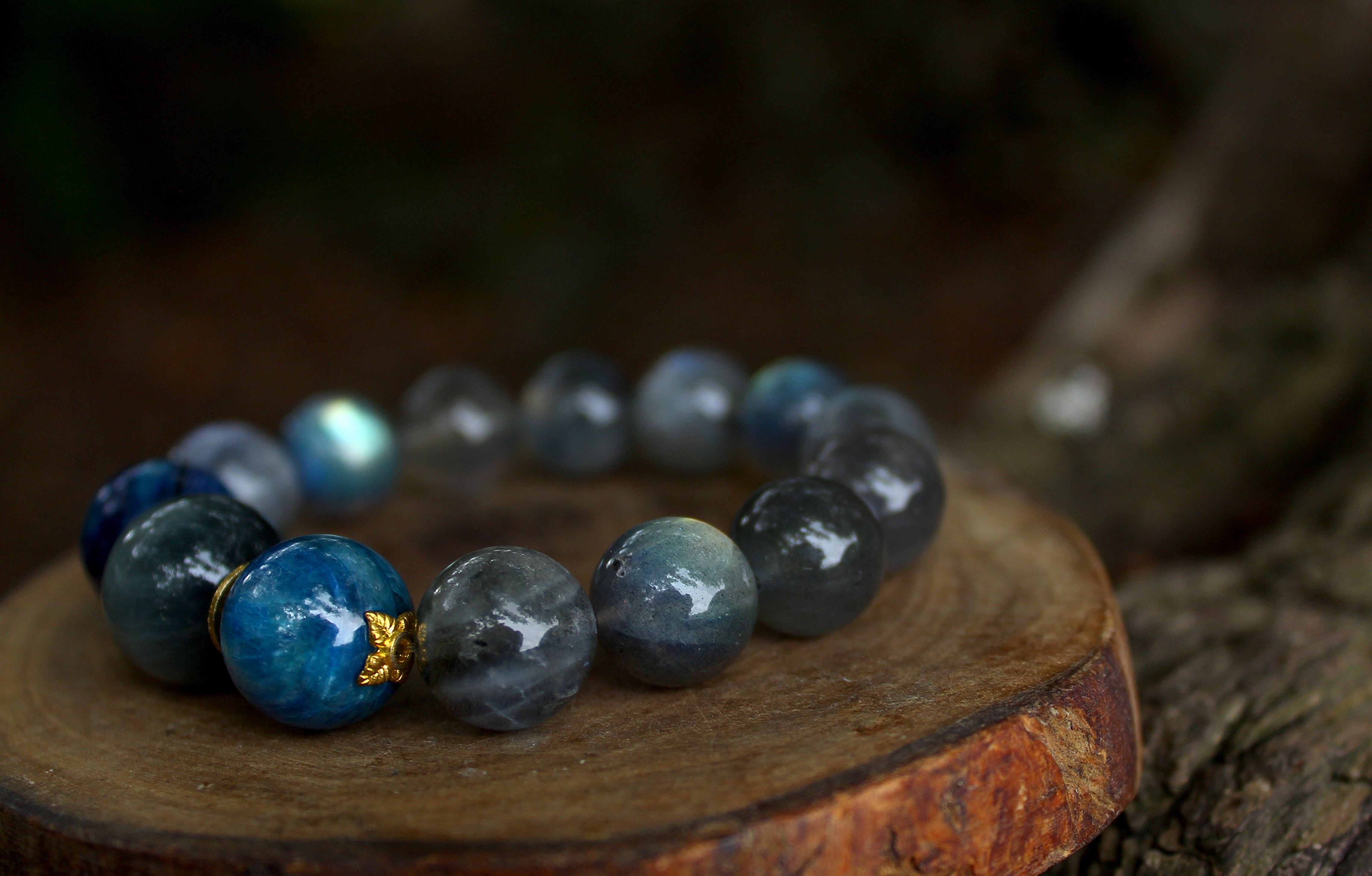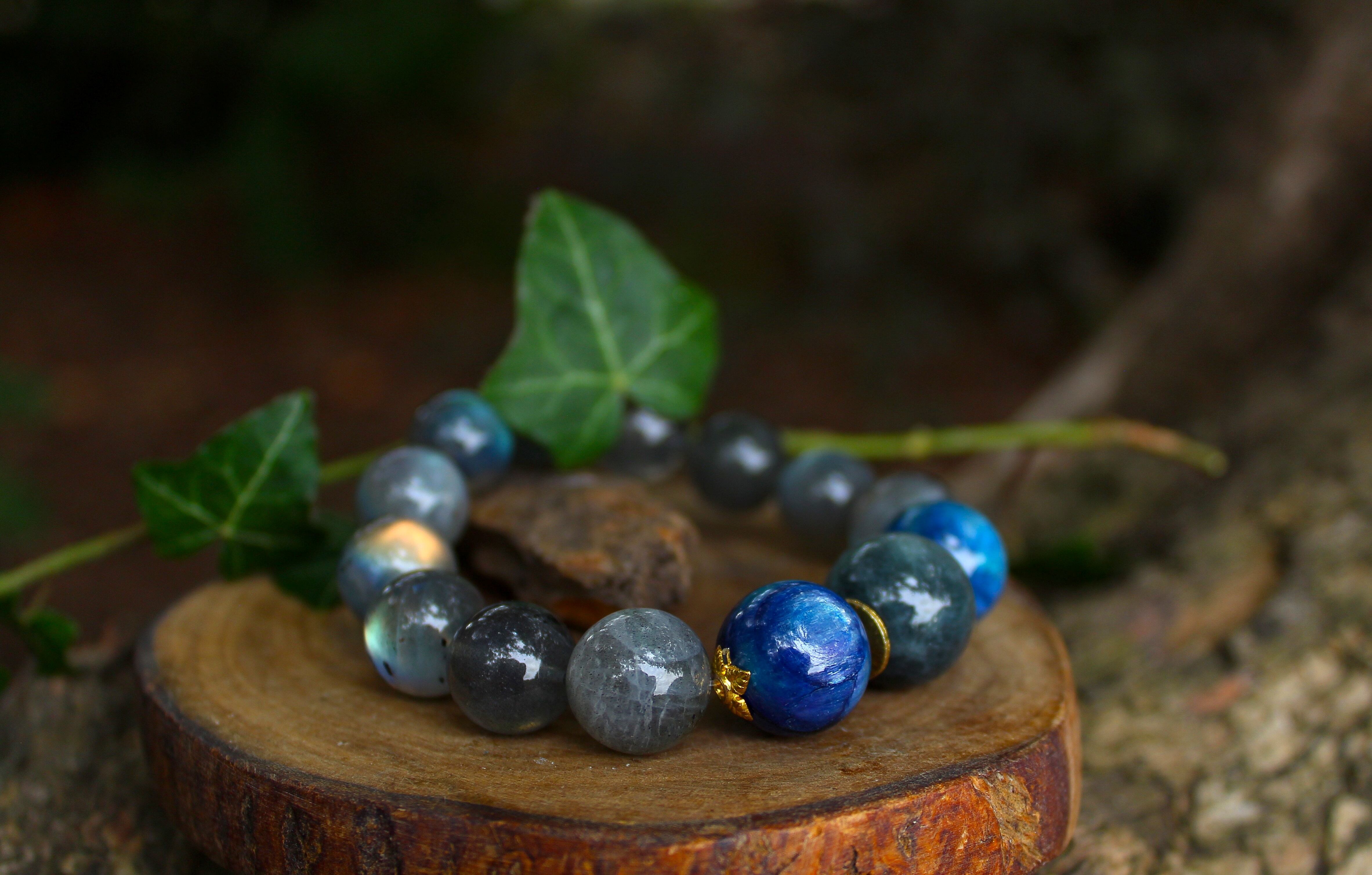 光沢の美しい大玉のクリソベリルキャッツアイ、真実を危険を予知し、霊力を高めるとされています。14ミリのブルーカイヤナイト、直感力、洞察力、創造力、表現力を豊かにします。また、スピリットガイドと繋げ、心霊能力を刺激します。AAA級の目を見張るほどに美しいラブラドライト、一粒一粒にラブラドレッセンスの光がみられます。想像力、直感力を高め、インスピレーションを与えます。宇宙からのメッセージを持ち主に届ける石です。