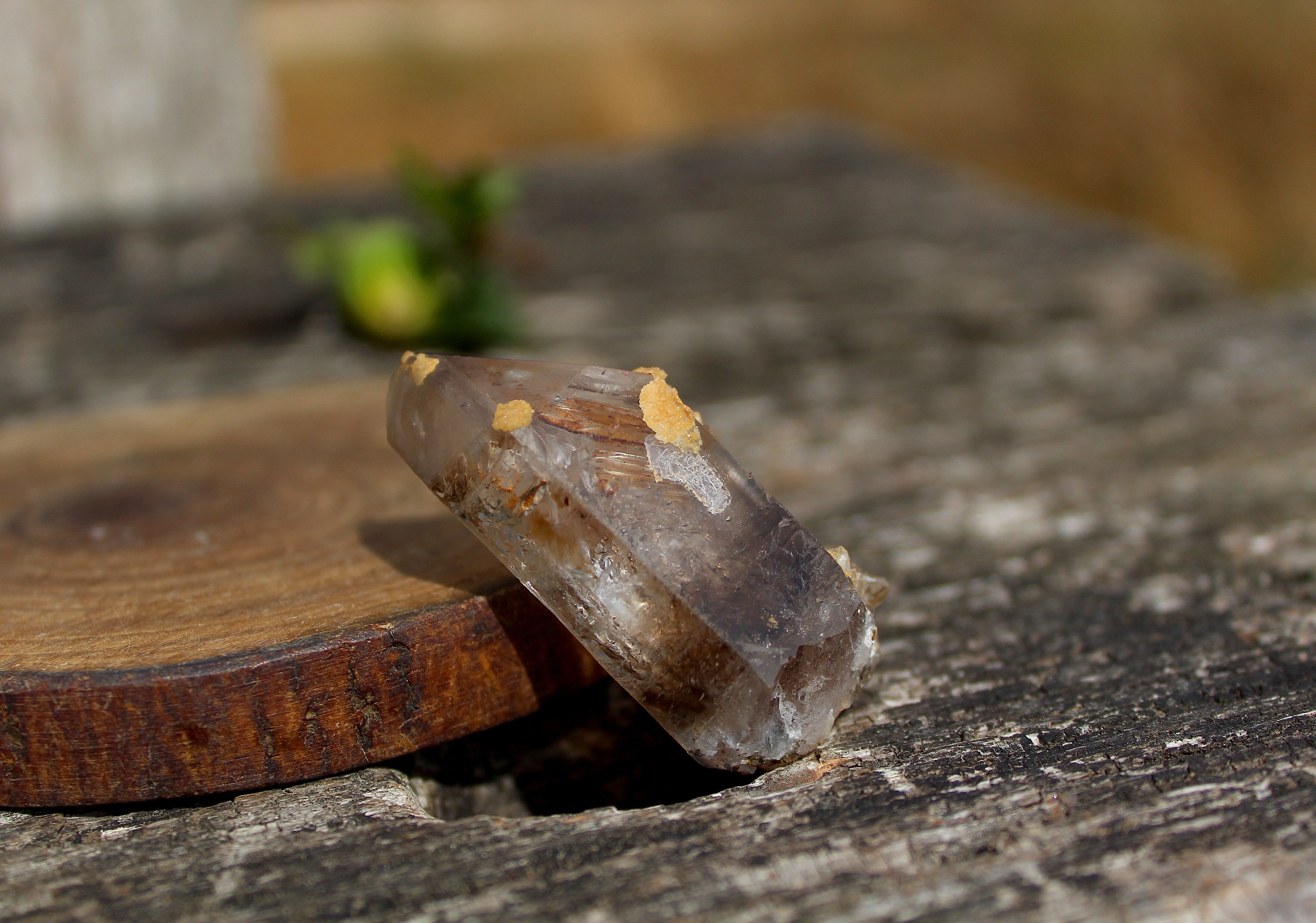 5 面のイシス面があり、はっきりとした凹みのある三方晶系のトライゴーニック。美しく積み重なったスモーキーファントムと、底辺を囲む濃い彩度の「波状」のスモーキーファントム、ゴールデンヒーラーの酸化鉄で色づけされた方解石。印象的なスターブラリのエッチング、リモナイトを含む「ネガティブ」 の顕現結晶、湾曲したエッジ、フジツボ結晶、小さなブリッジ結晶、繊維状の緑簾石を内包する部分、美しいレインボー。並外れた透明度、結晶本体の高度な光沢を伴うサテンのような表面が特徴です。息を呑むほど美しく、希少で、形而上学的な魅力が詰まった自然のアートと言えるでしょう。