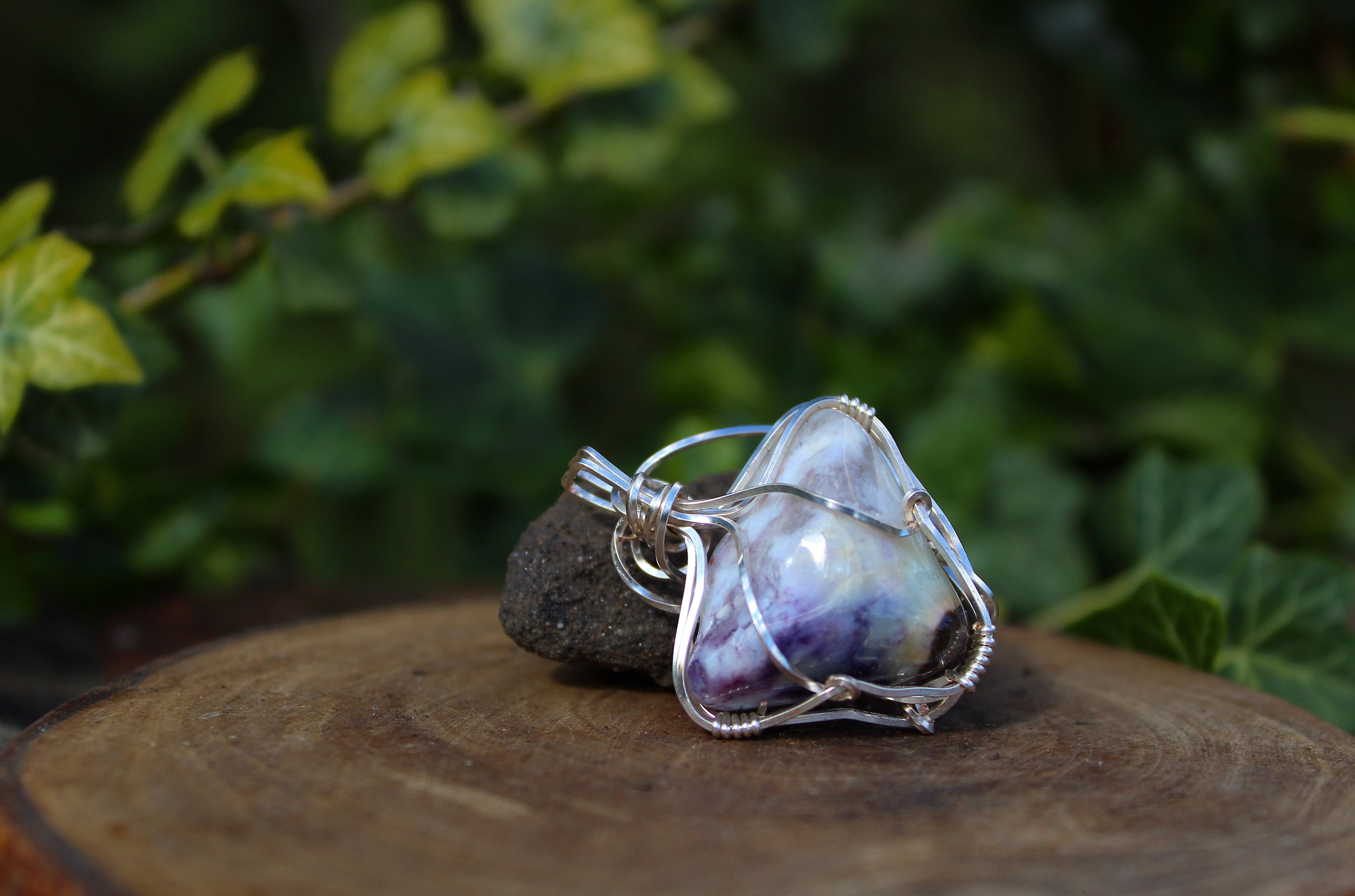 白とパープルの色合いが非常に美しい、高品質のバイオレットフレームオパールのタンブルを、シルバーのワイヤーで巻きました。
