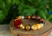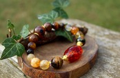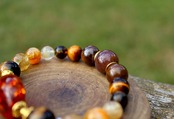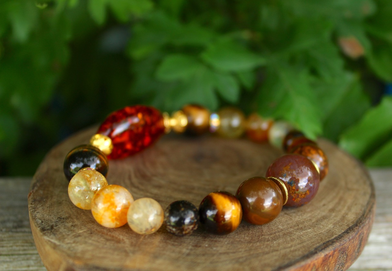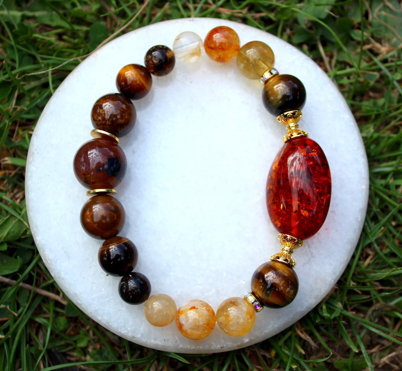 中心にオーバルのアンバー、12ミリのタイガーズアイ、10ミリのシトリン、8ミリの御ールデンアゼツライト、8ミリのアンバー、10ミリのタイガーズアイ、10ミリのナチュラルアイロンボルダーオパールAAA級、最後に14ミリのアフリカンピーターサイトAAA級のビーズを組ませました。