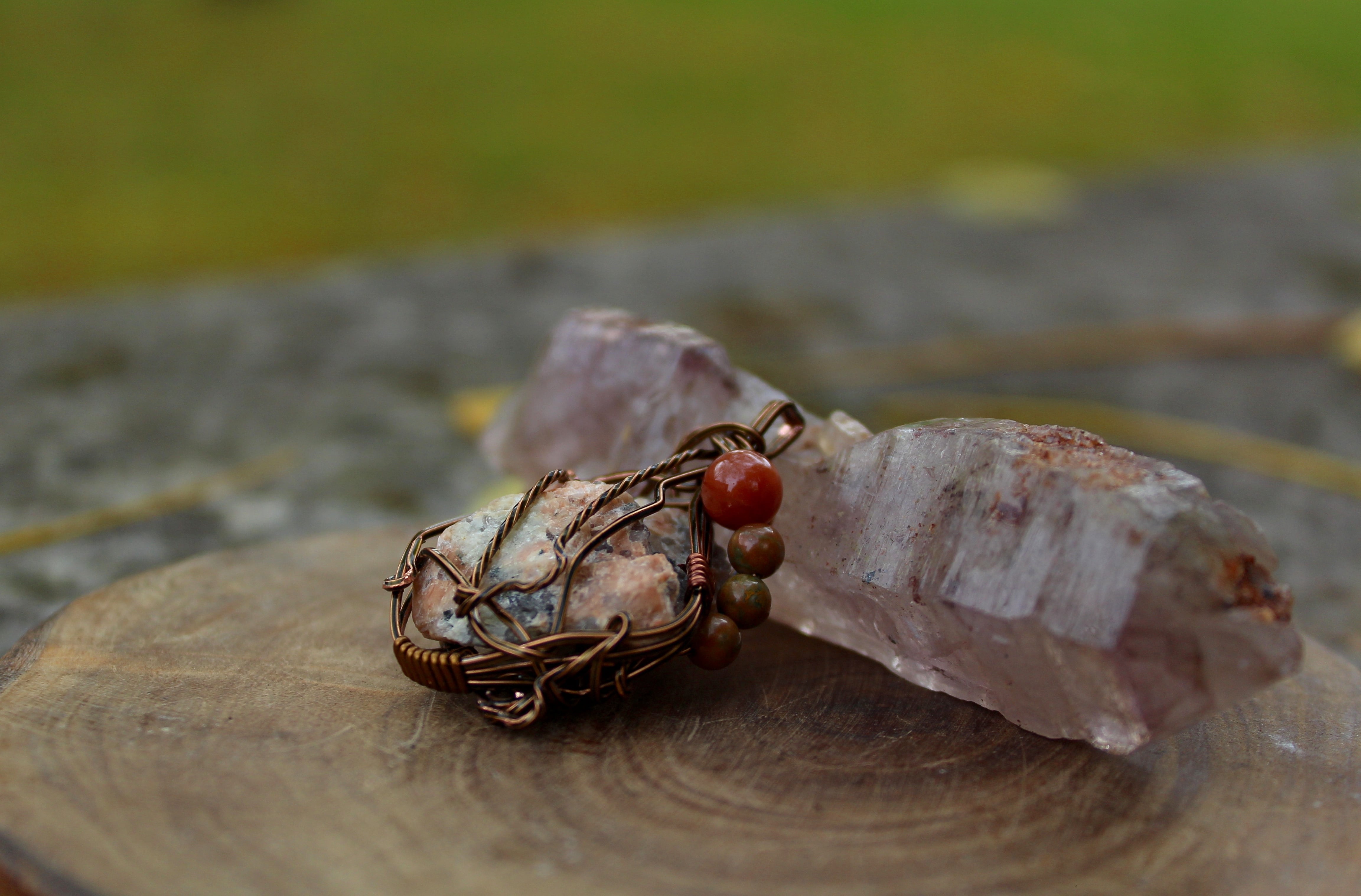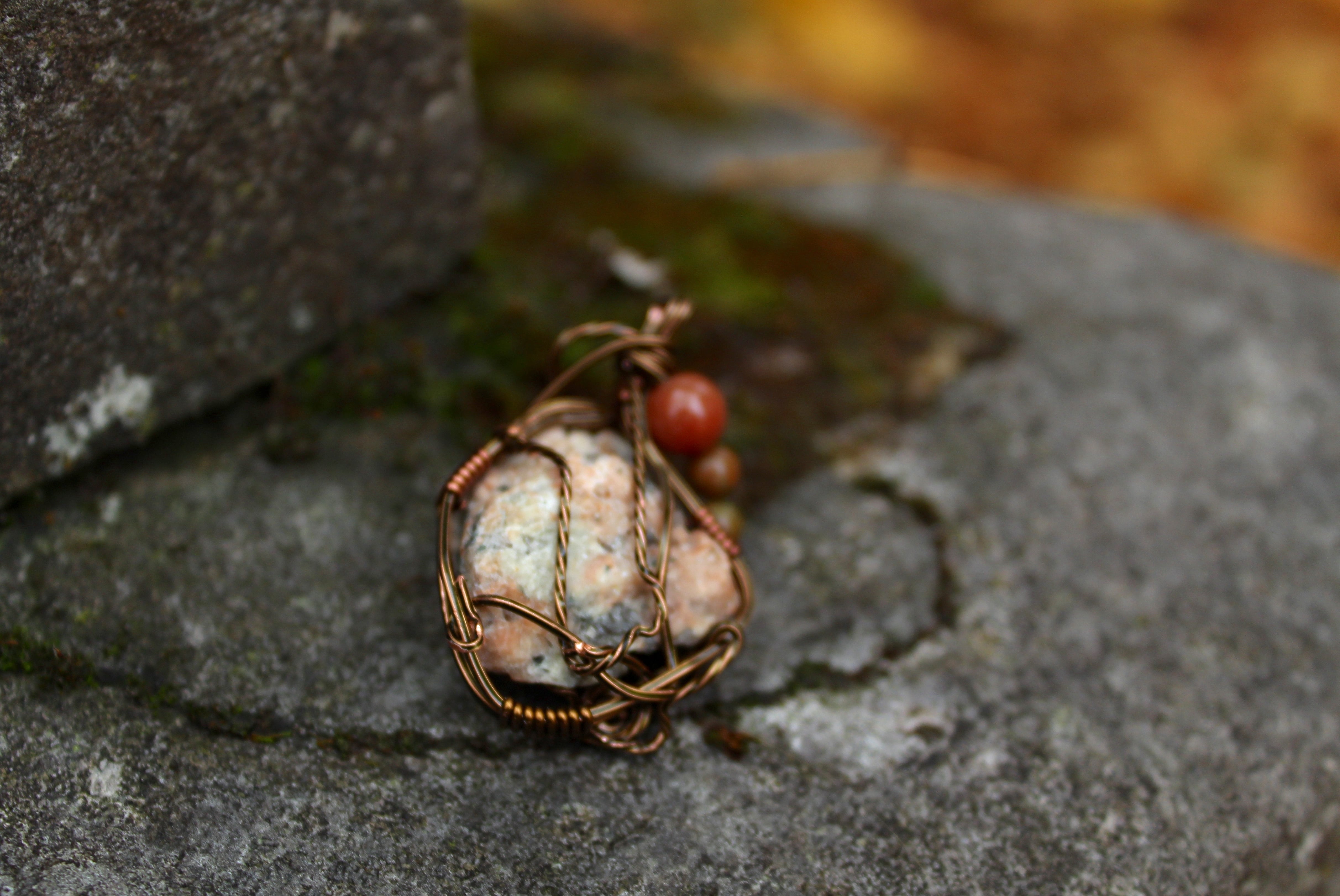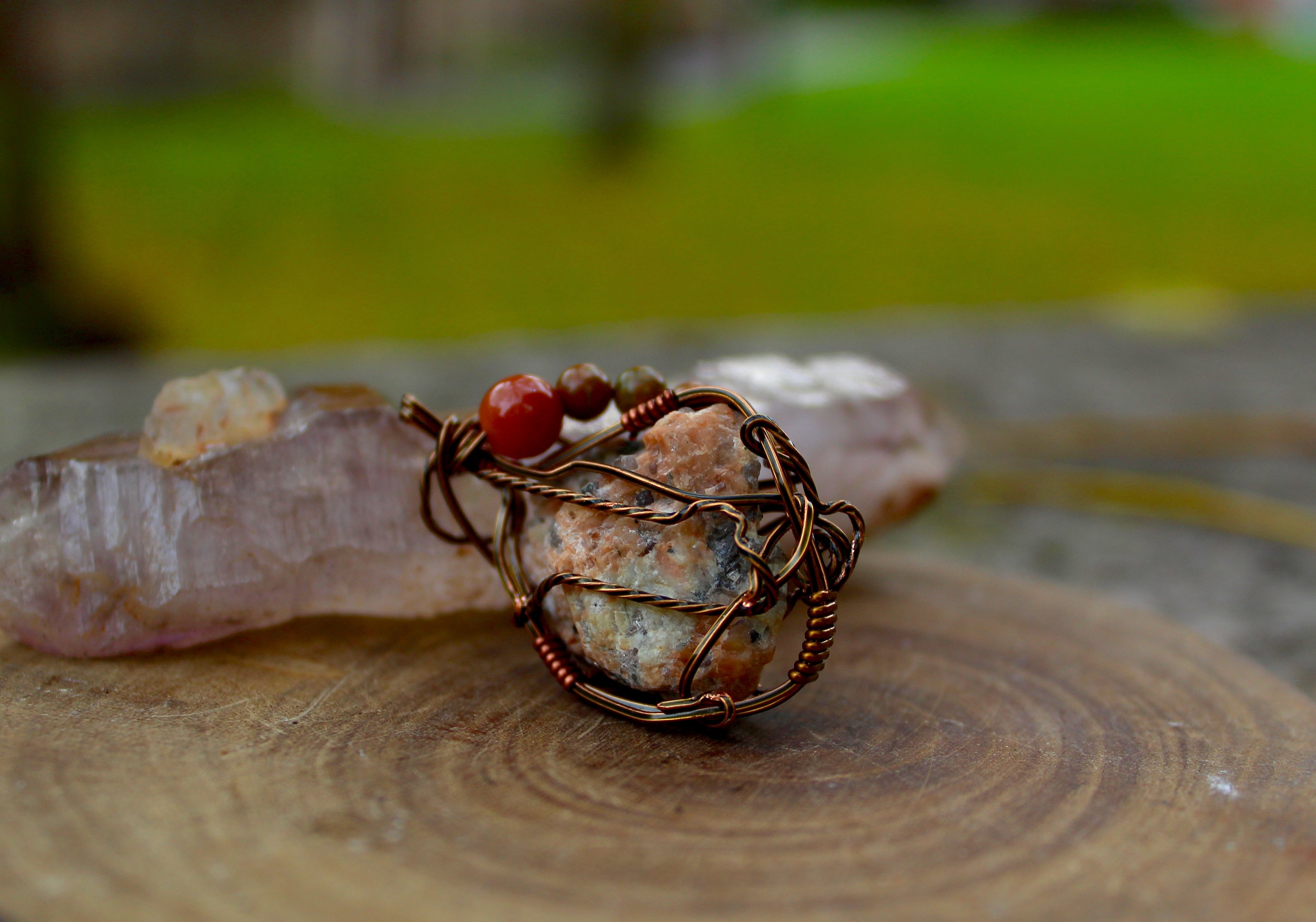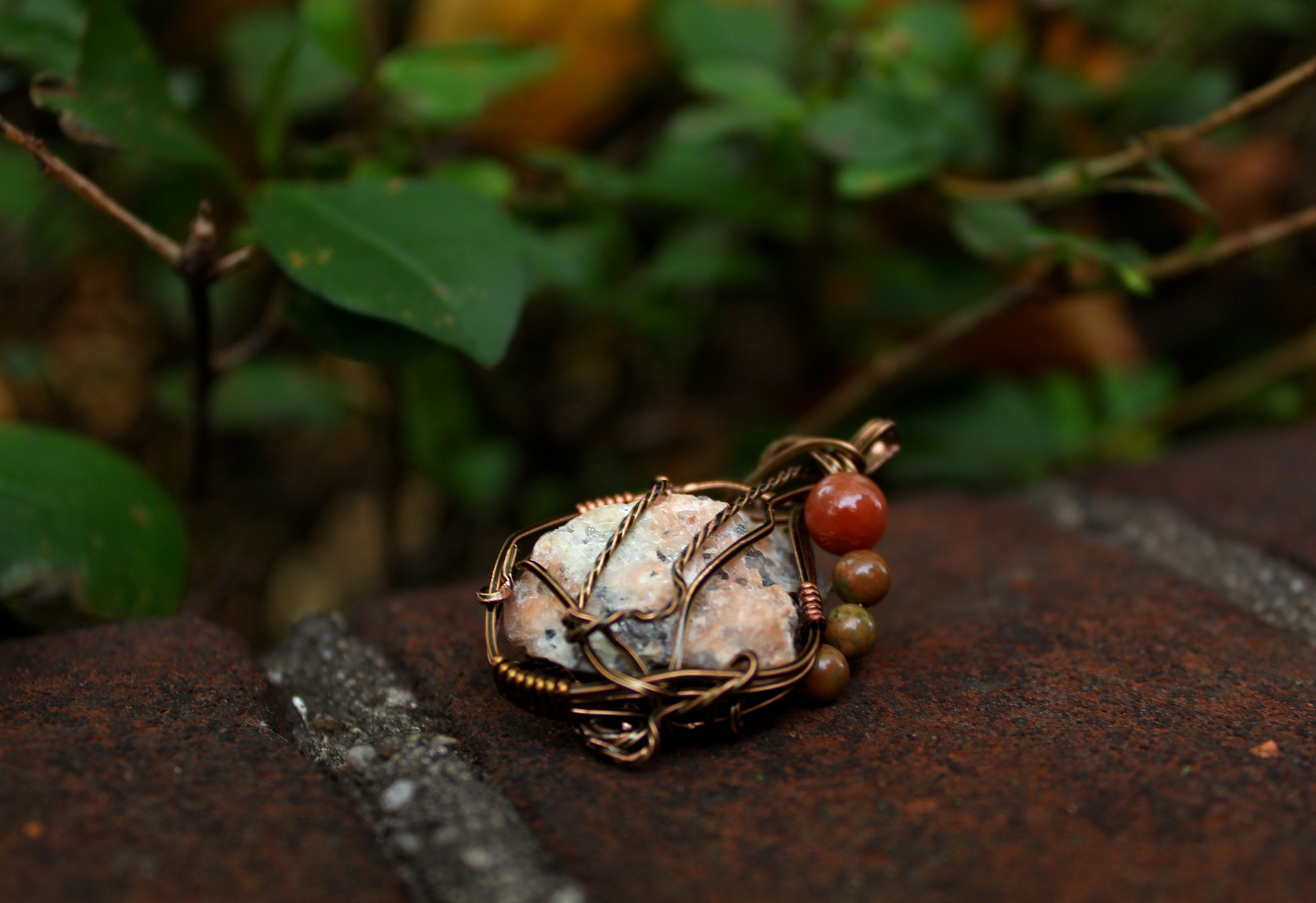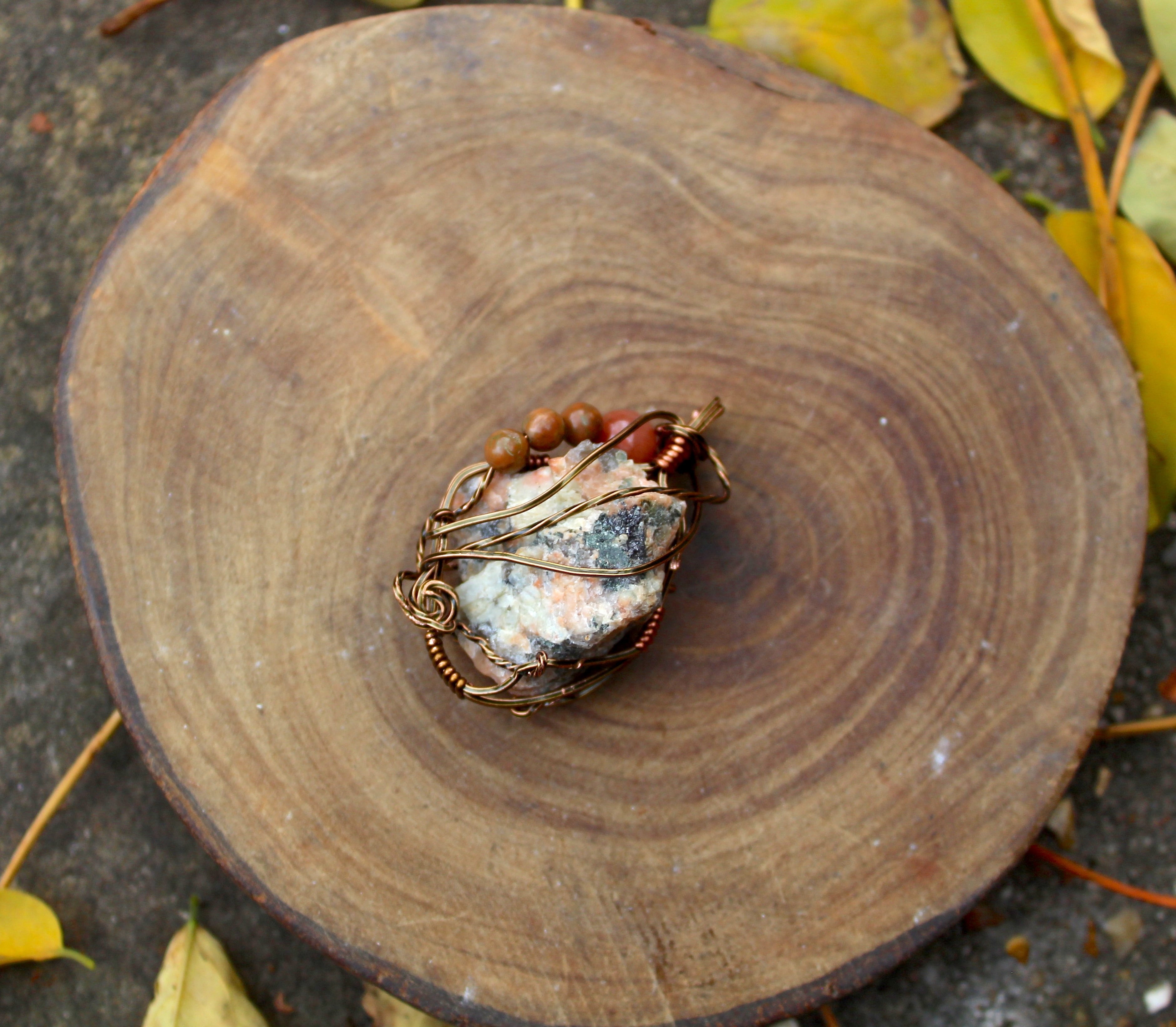 自然な風合いを生かして、アンティークゴールドのワイヤーで巻きました。