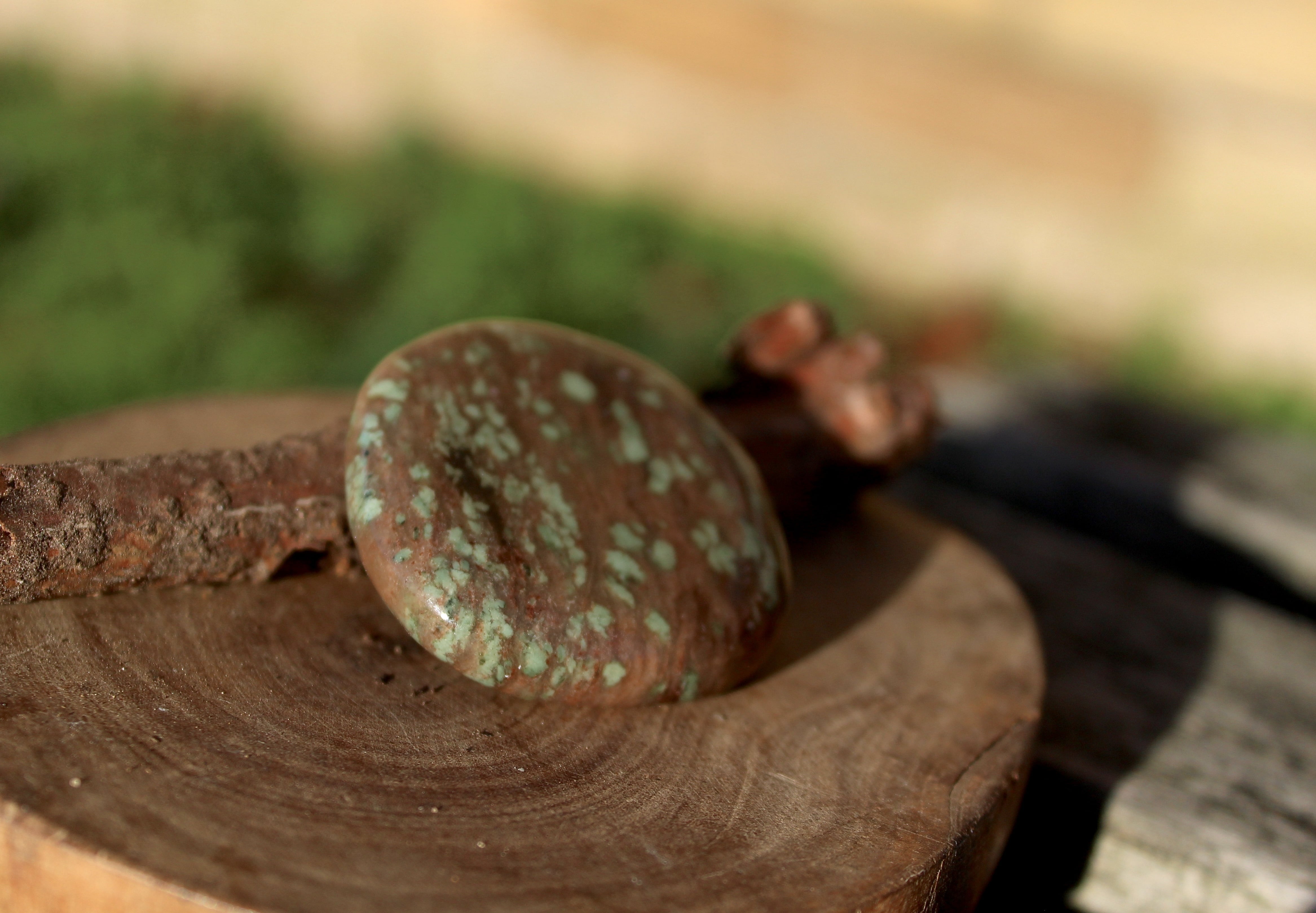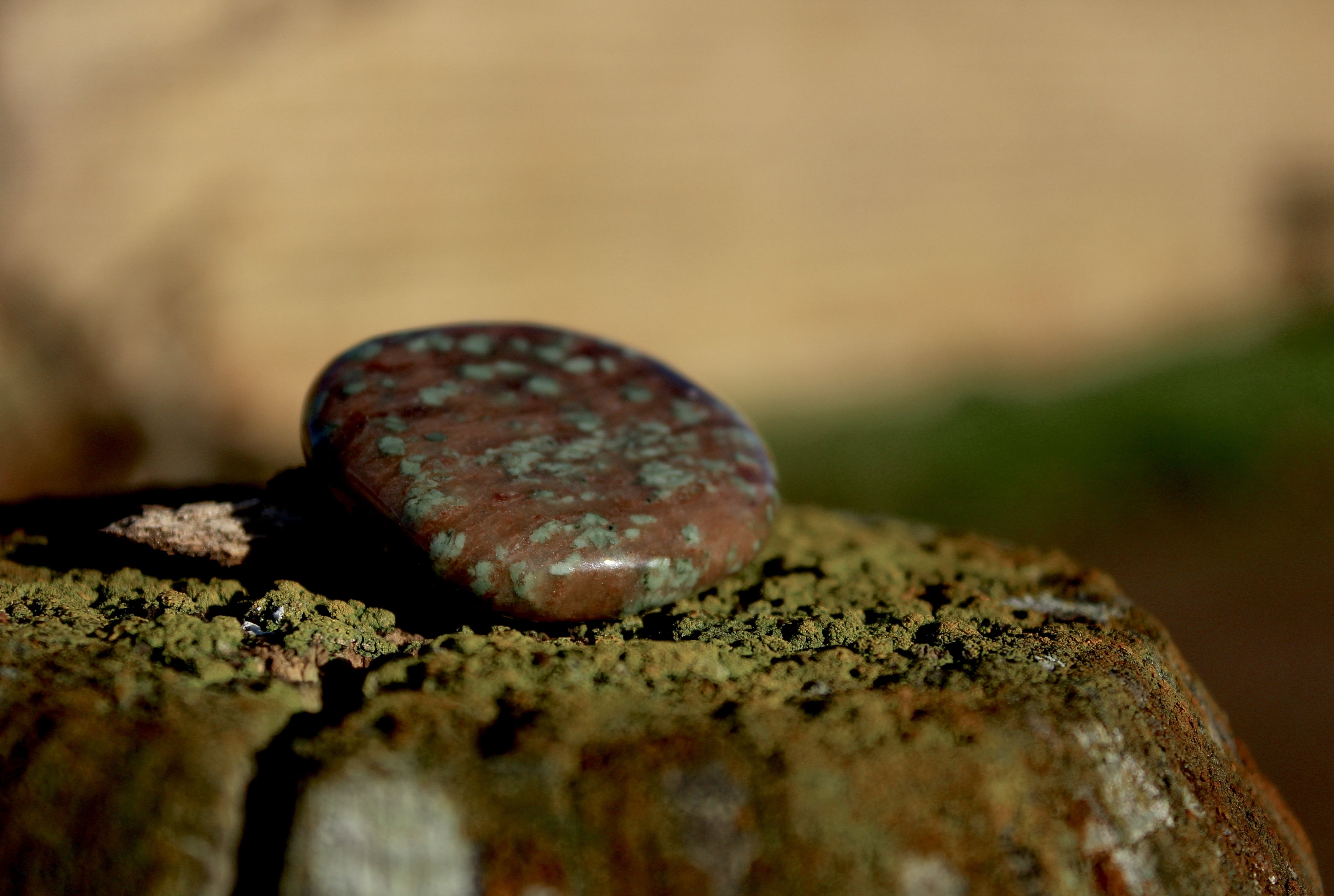 渋い茶色に鮮やかなグリーンが美しいナンドライトのパームストーンです。