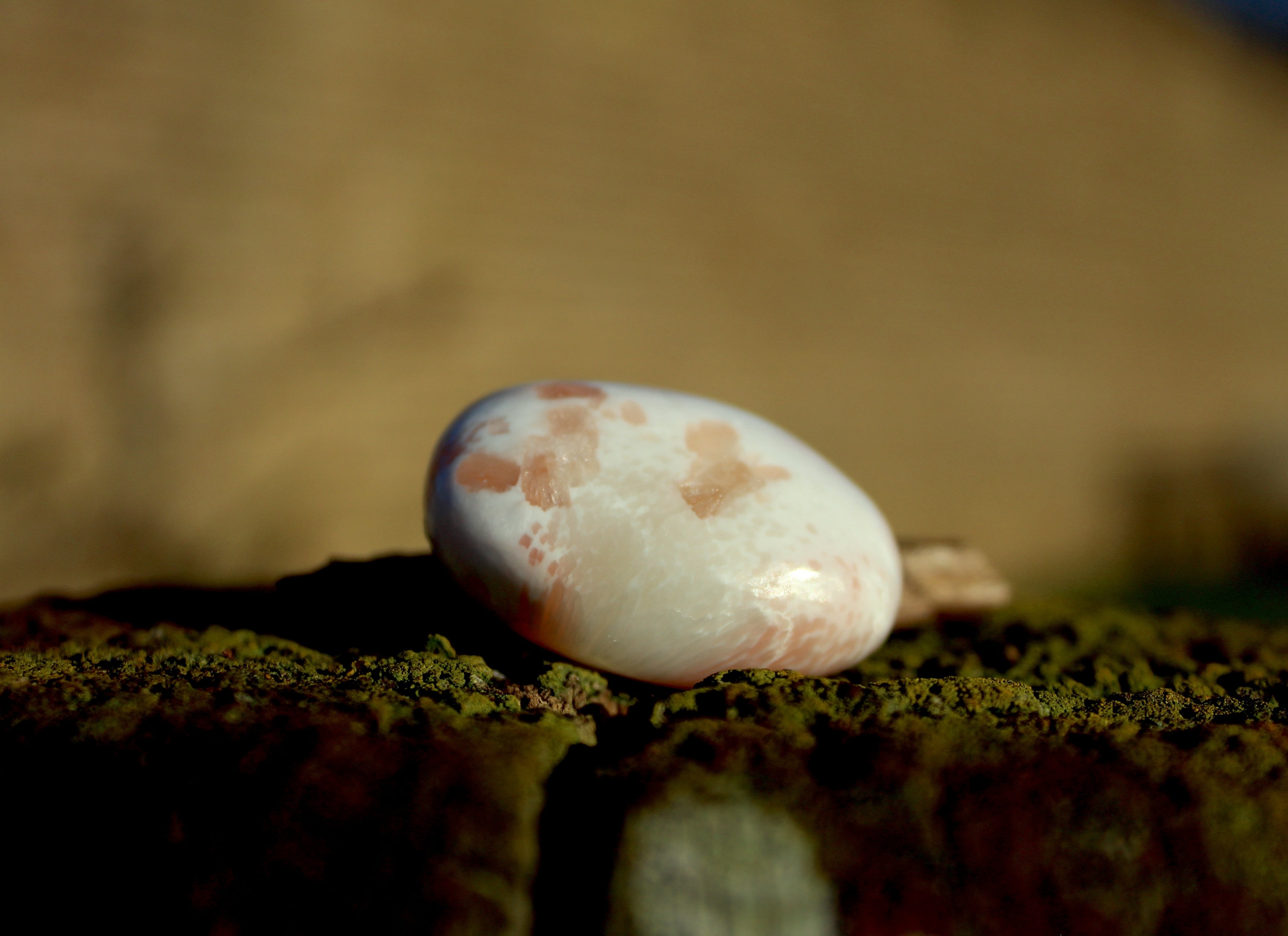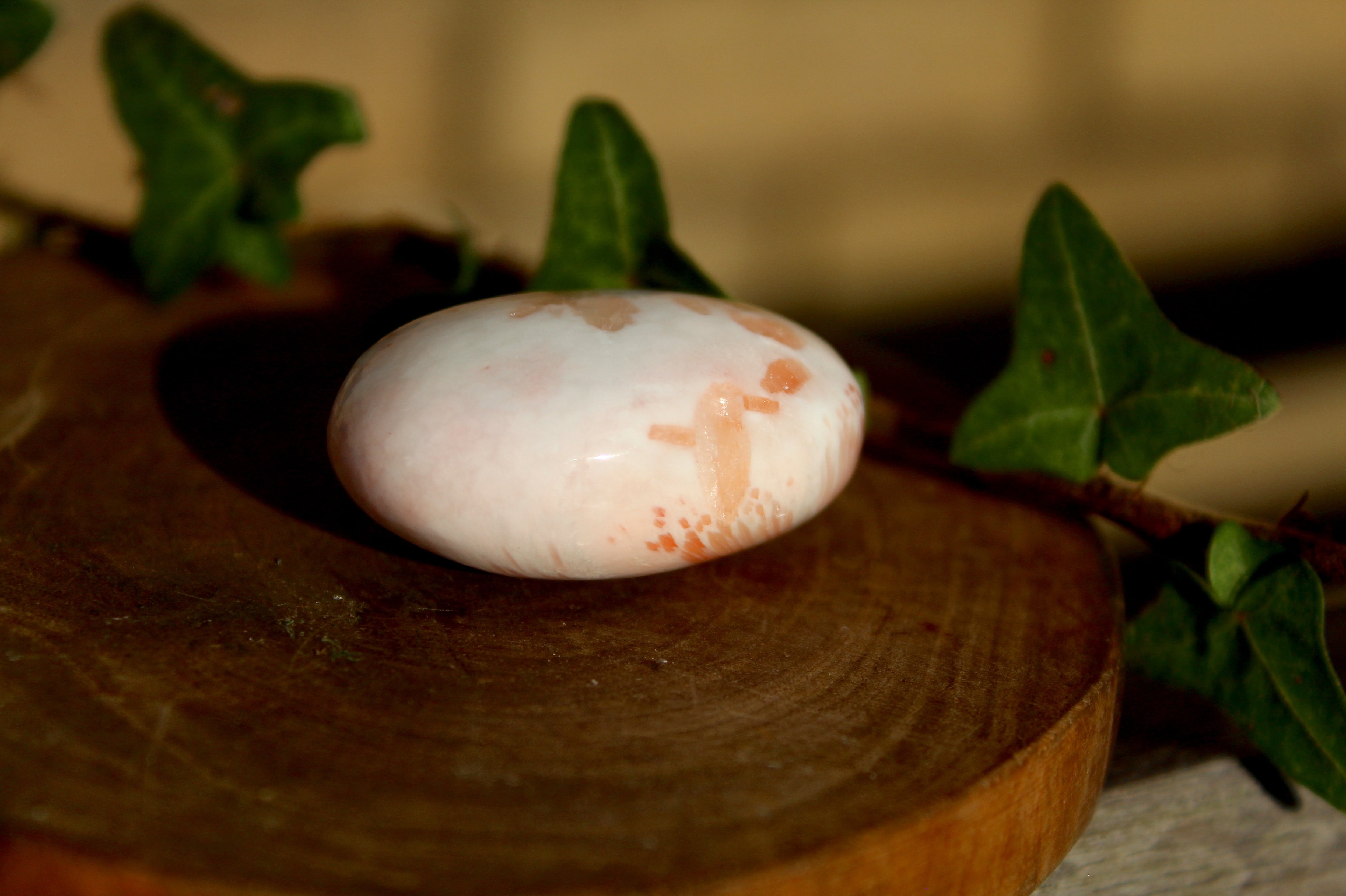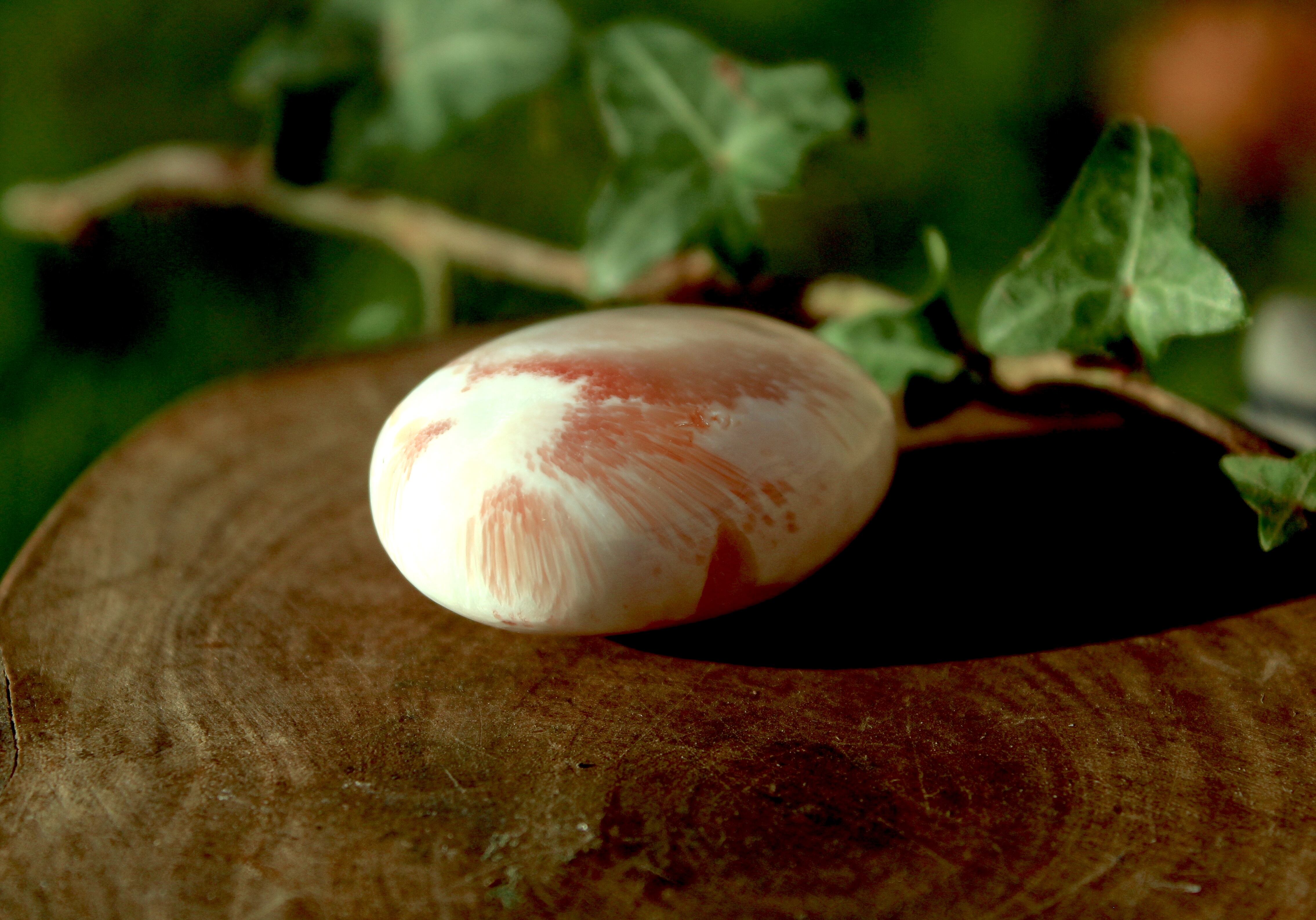 小さめですが、非常に美しいピーチスコレサイトのパームストーンです。
