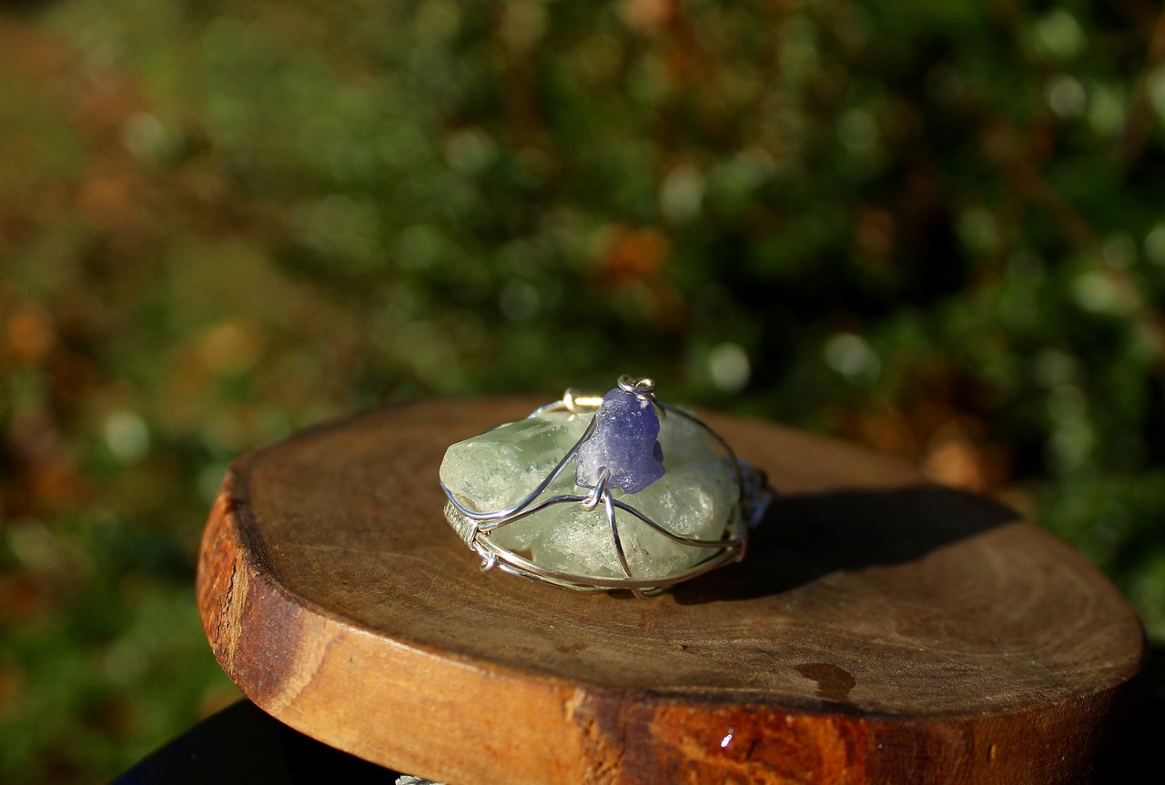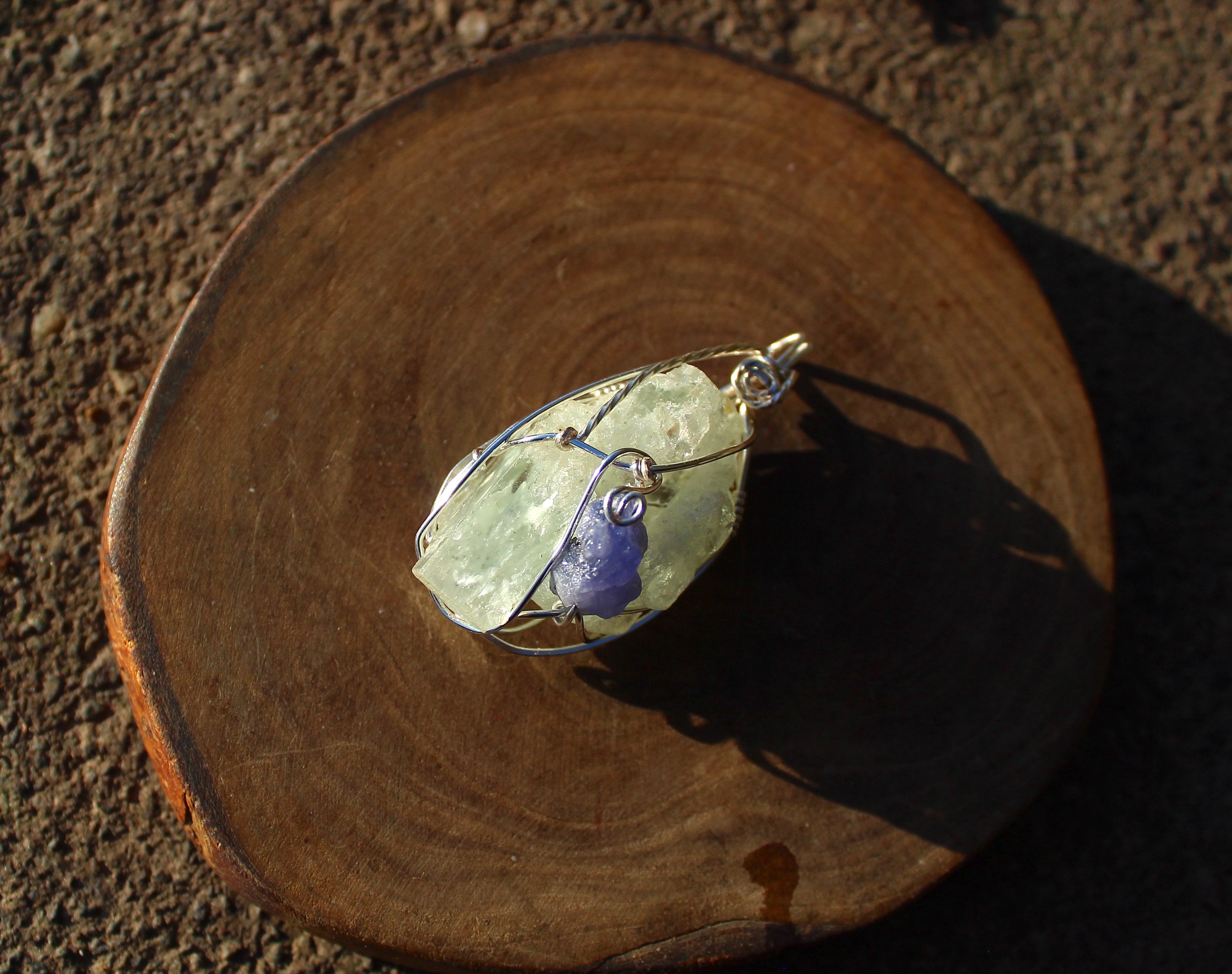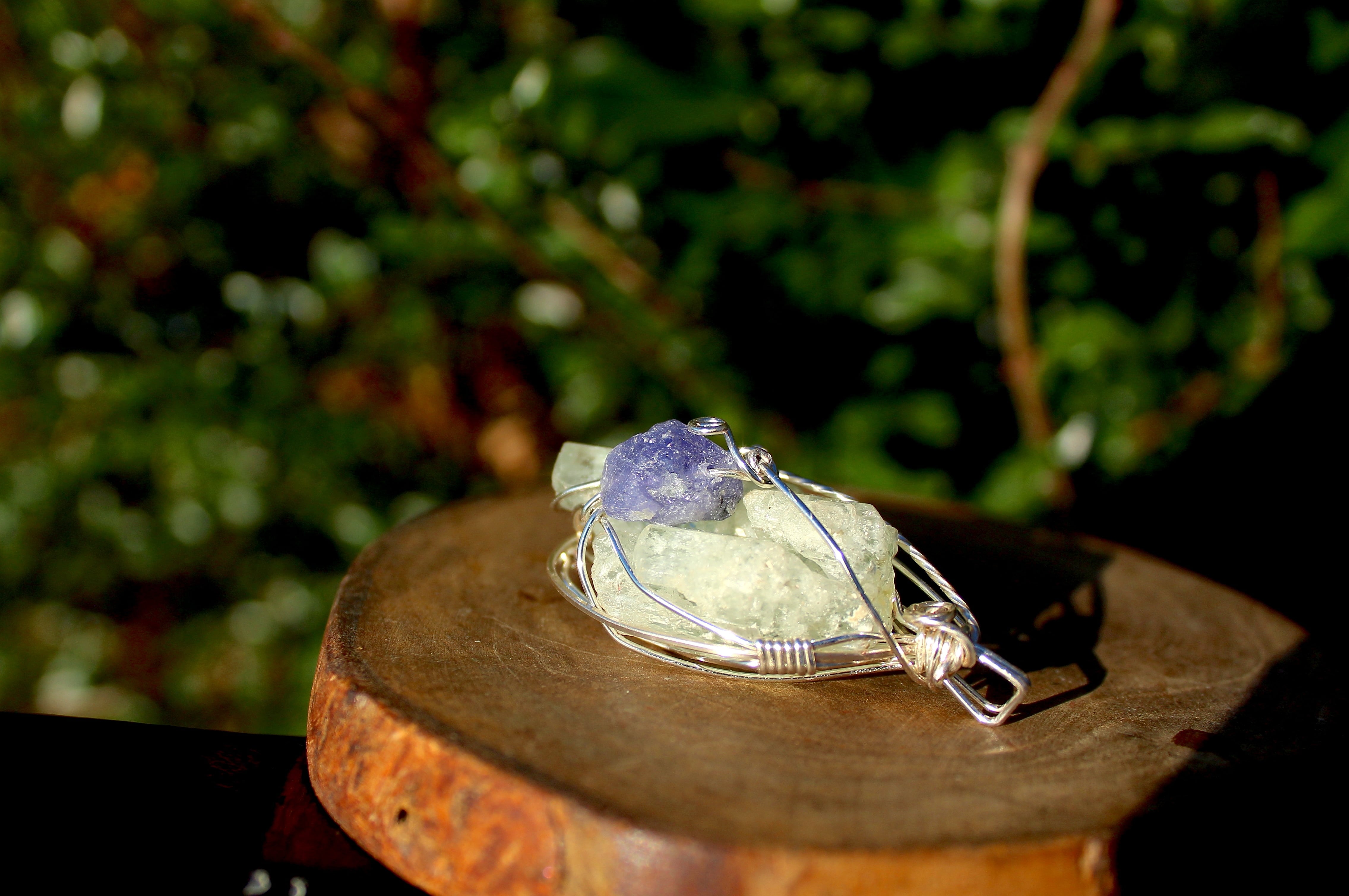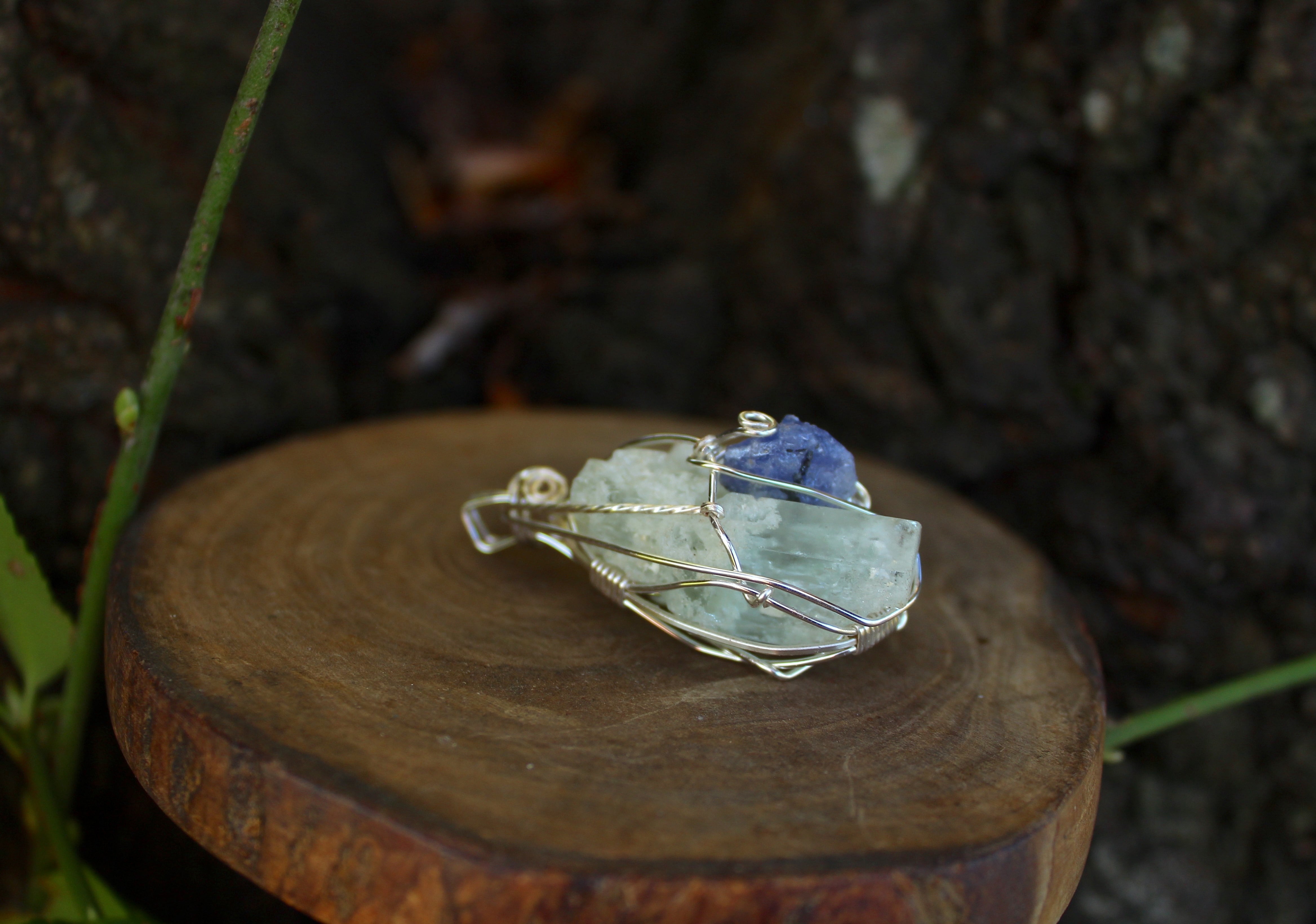 シルバーのワイヤーで巻きながら、タンザナイトのナチュラルラフビーズを留つけました。