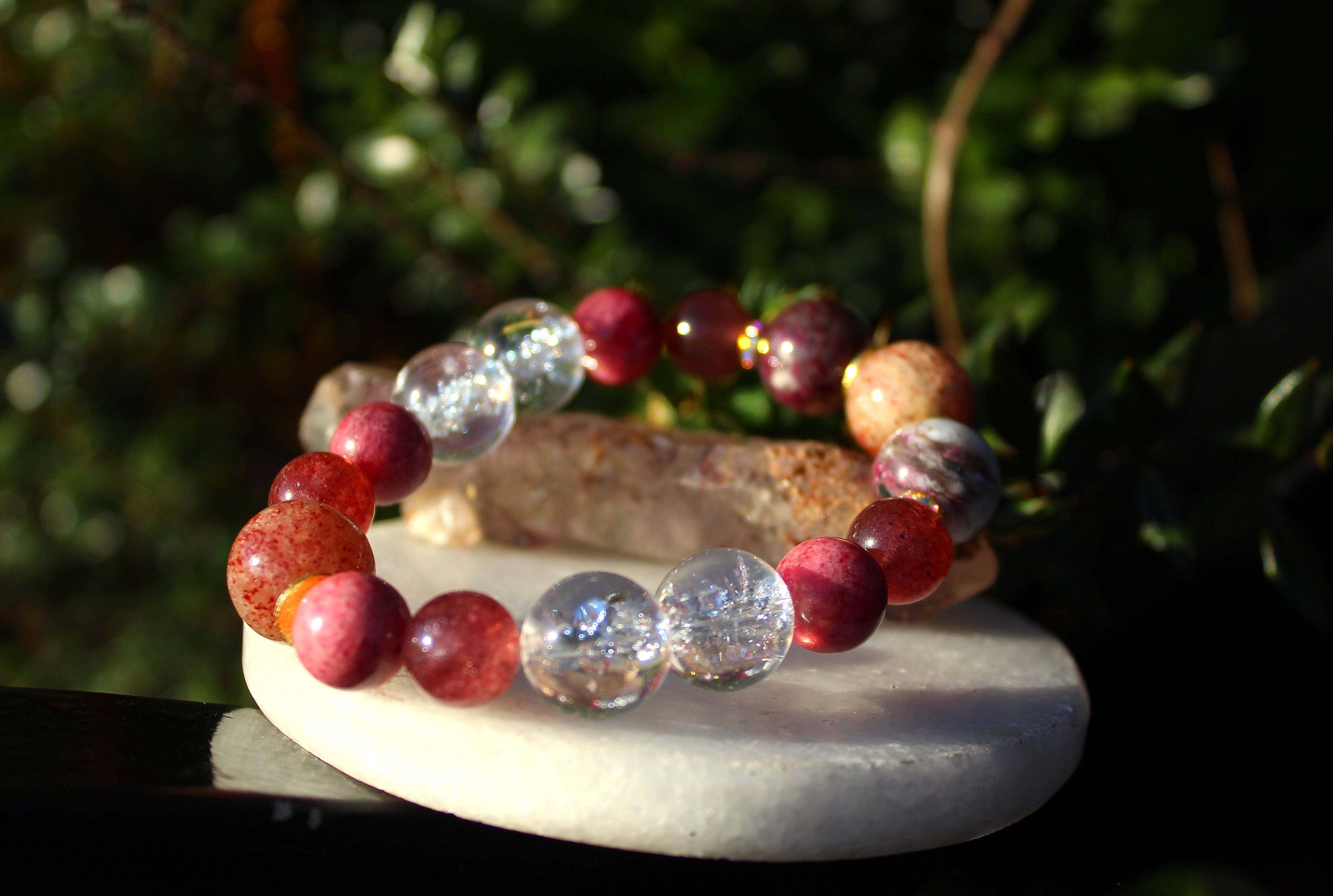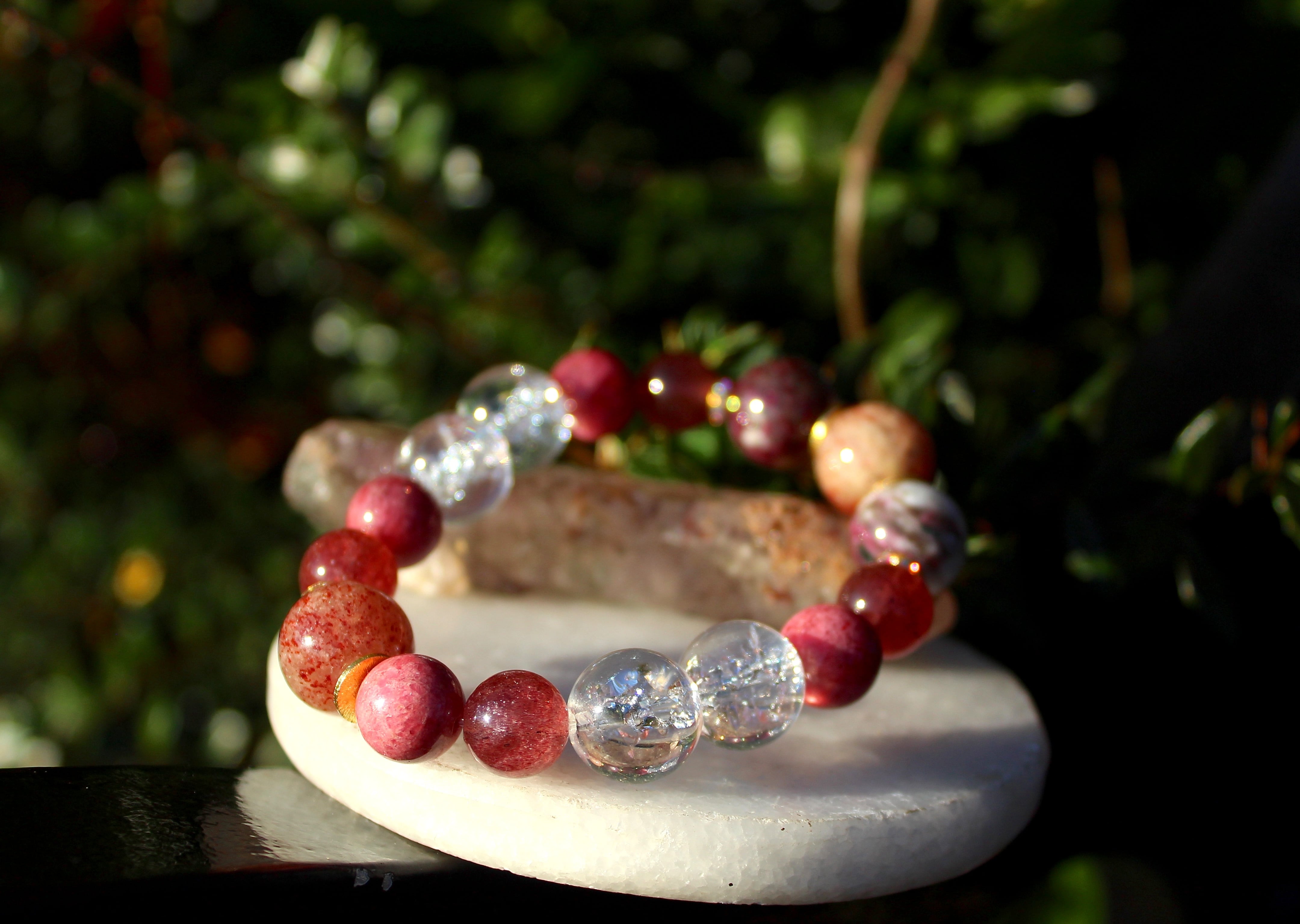 14ミリのオレンジストロベリーレピドクロサイトAAA、14ミリのレッドホワイトマダガスカルユーディアライトAAA、12ミリのストロベリークォーツ、12ミリのチューライトAAAの間に14ミリのナチュラルレインボークォーツAAA、最後に14ミリのオレンジストロベリーレピドクロサイトを組ませました。