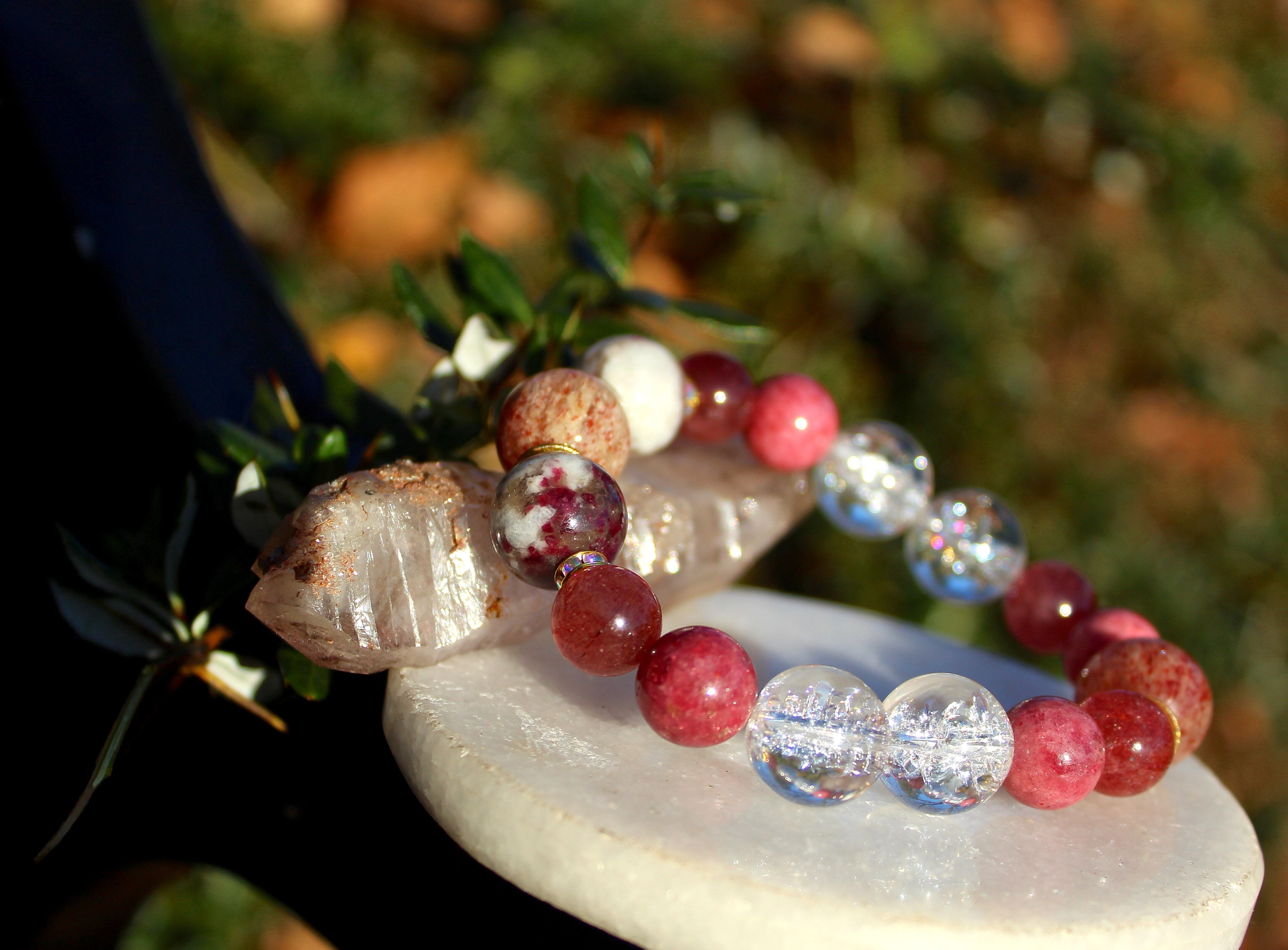 レピドクロサイトは、心身のバランスを整え、生命力を高めます。愛と理解へと向かう心の旅を象徴すると言われている石です。ユーディアライトは女性性を高め、愛情と女性らしさを育み、日常にシンクロニシティ呼び寄せ、人生に満足感、喜び、幸福と繁栄をもたらします。ストロベリークォーツは自尊心を高め、不安を和らげ、平静さを取り戻し、人生に喜びと幸せをもたらすと言われています。チューライトは女性性を象徴し、女性的な魅力を引き出し、母親のような優しさや慈愛を授けます。女性としての幸福感、母性愛を豊かにしてくれるでしょう。