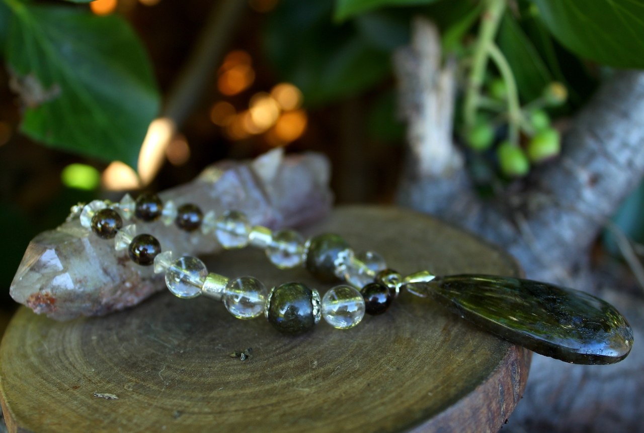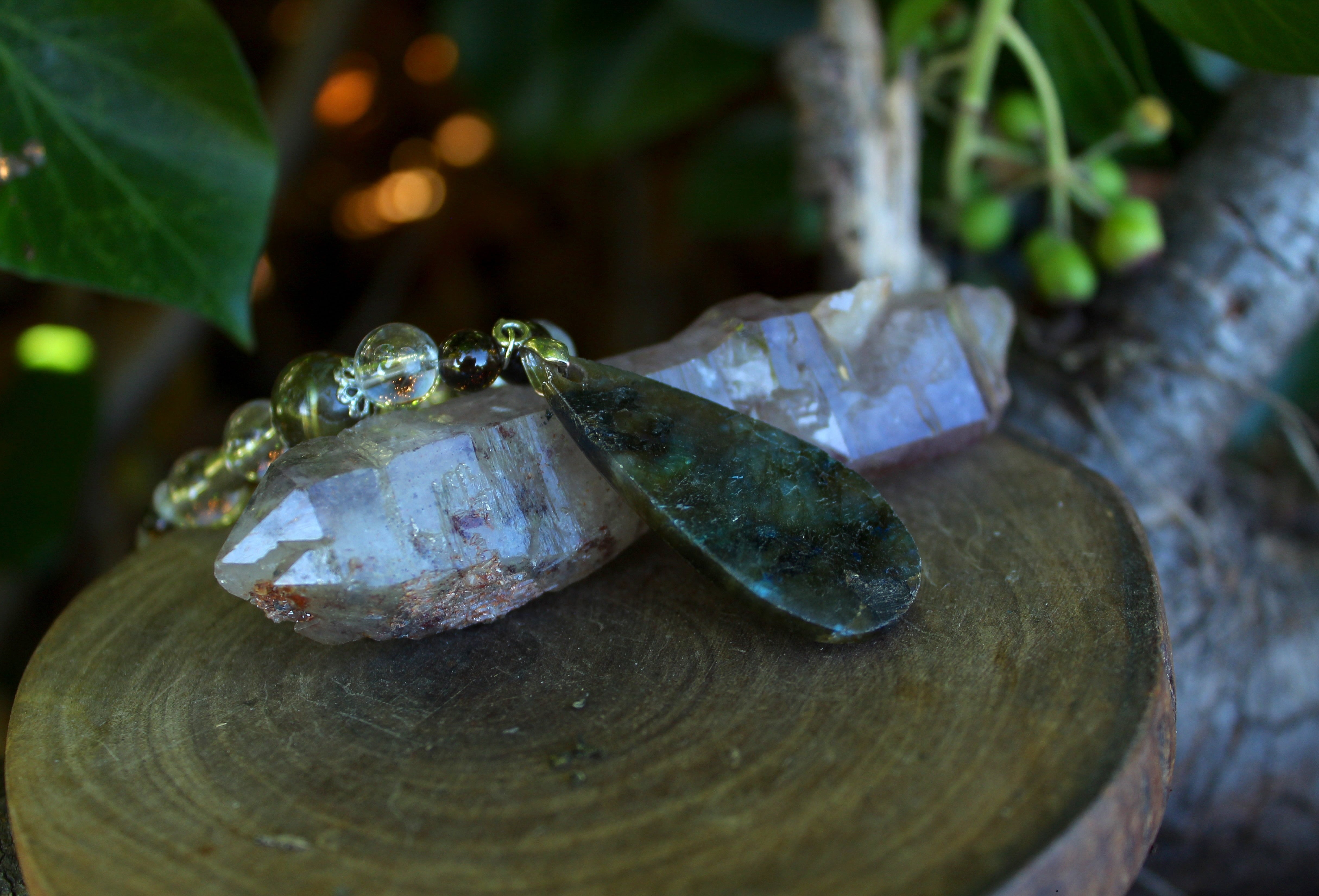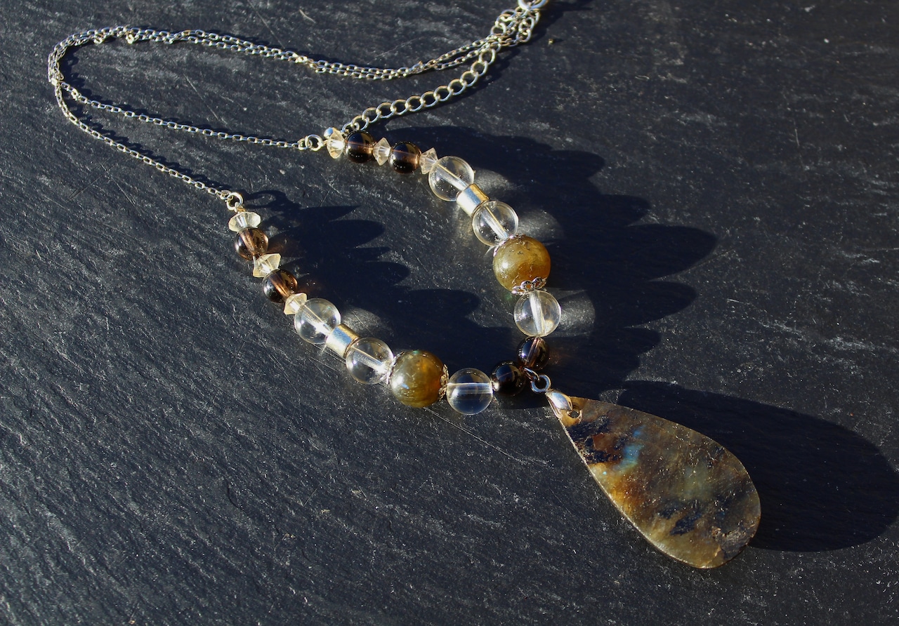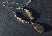 6ミリのスモーキークォーツ、8ミリの水晶の間に10ミリのラブラドライト、最後に6ミリのスモーキークォーツで組ませました。
