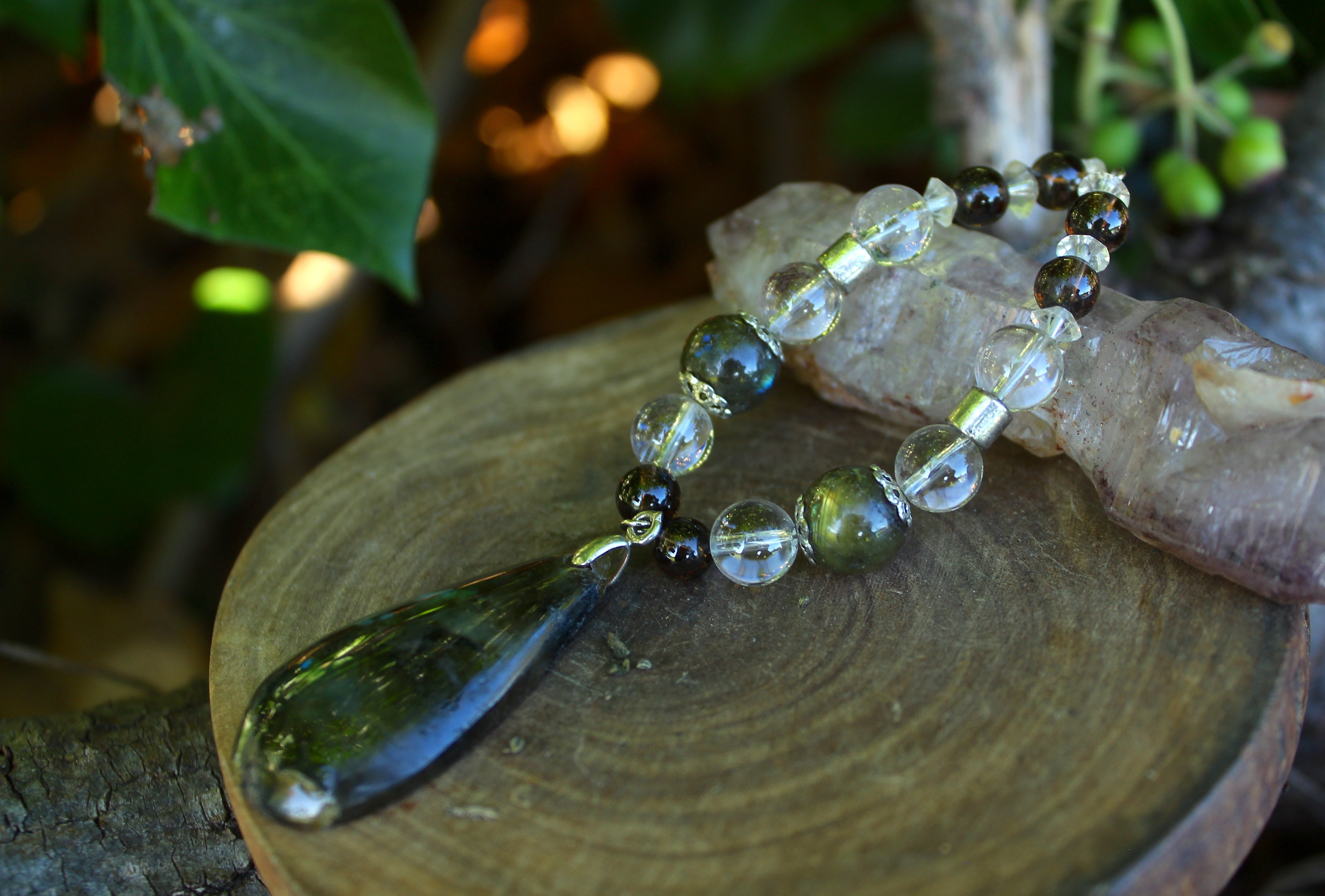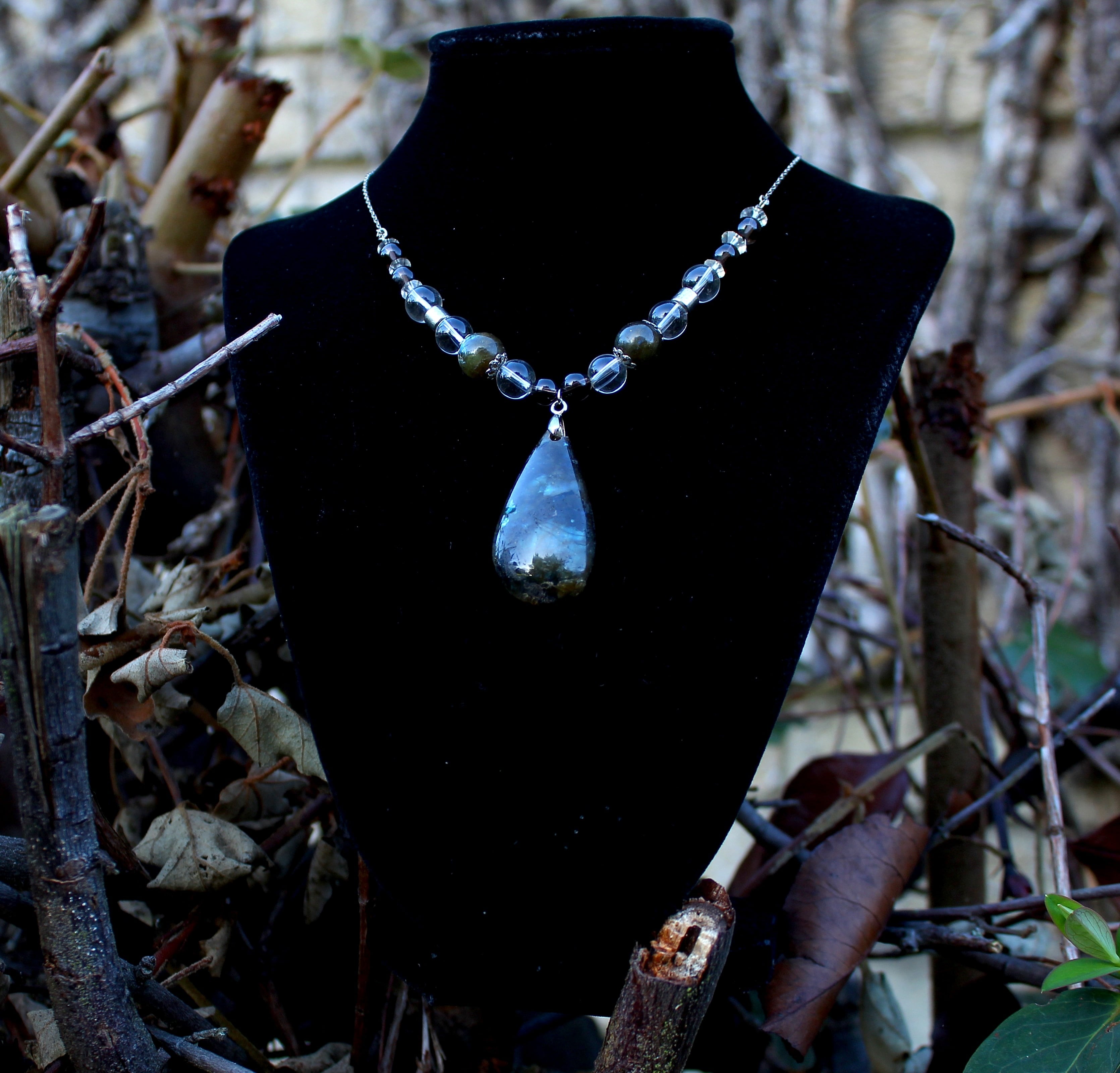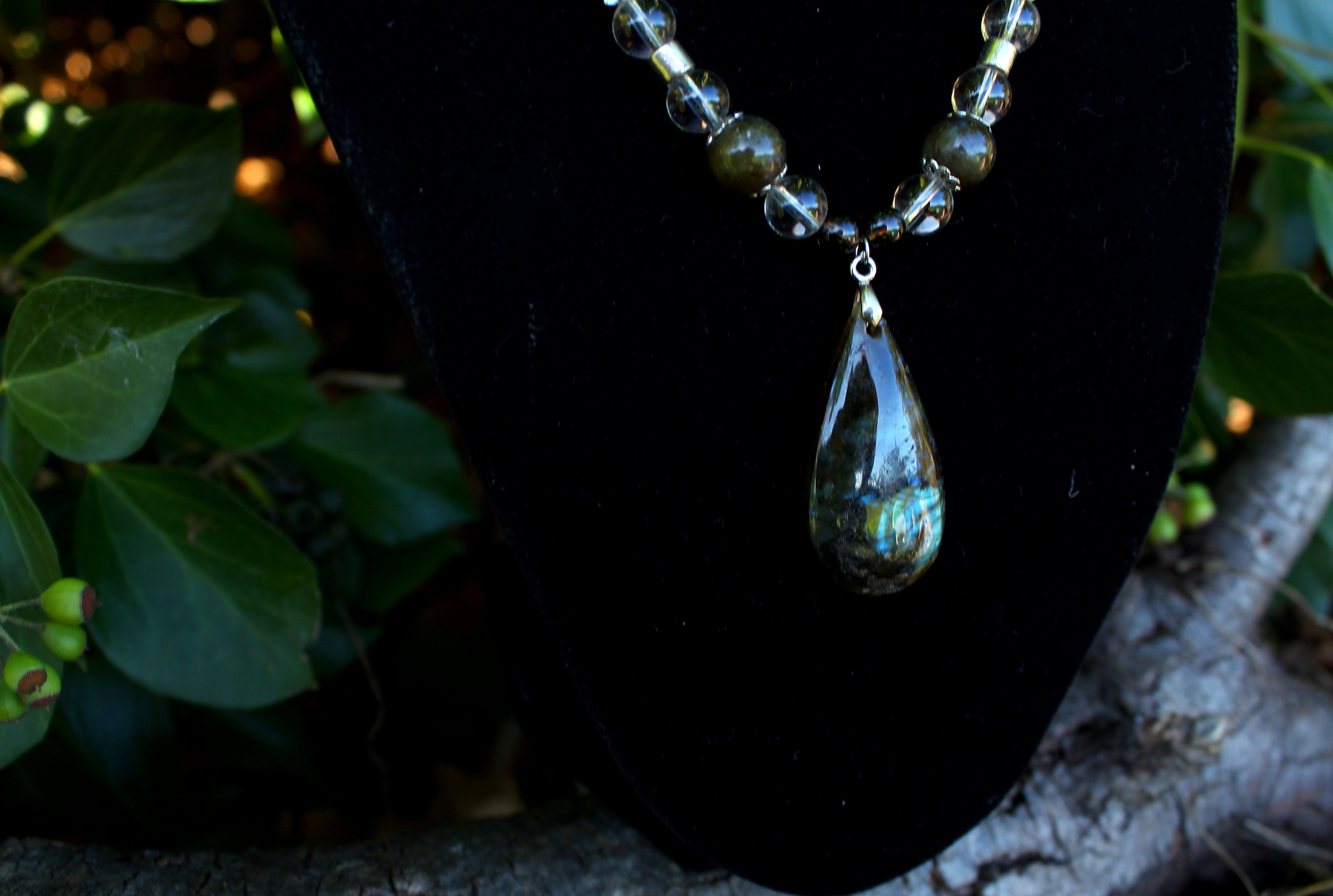 6ミリのスモーキークォーツ、8ミリの水晶の間に10ミリのラブラドライト、最後に6ミリのスモーキークォーツで組ませました。