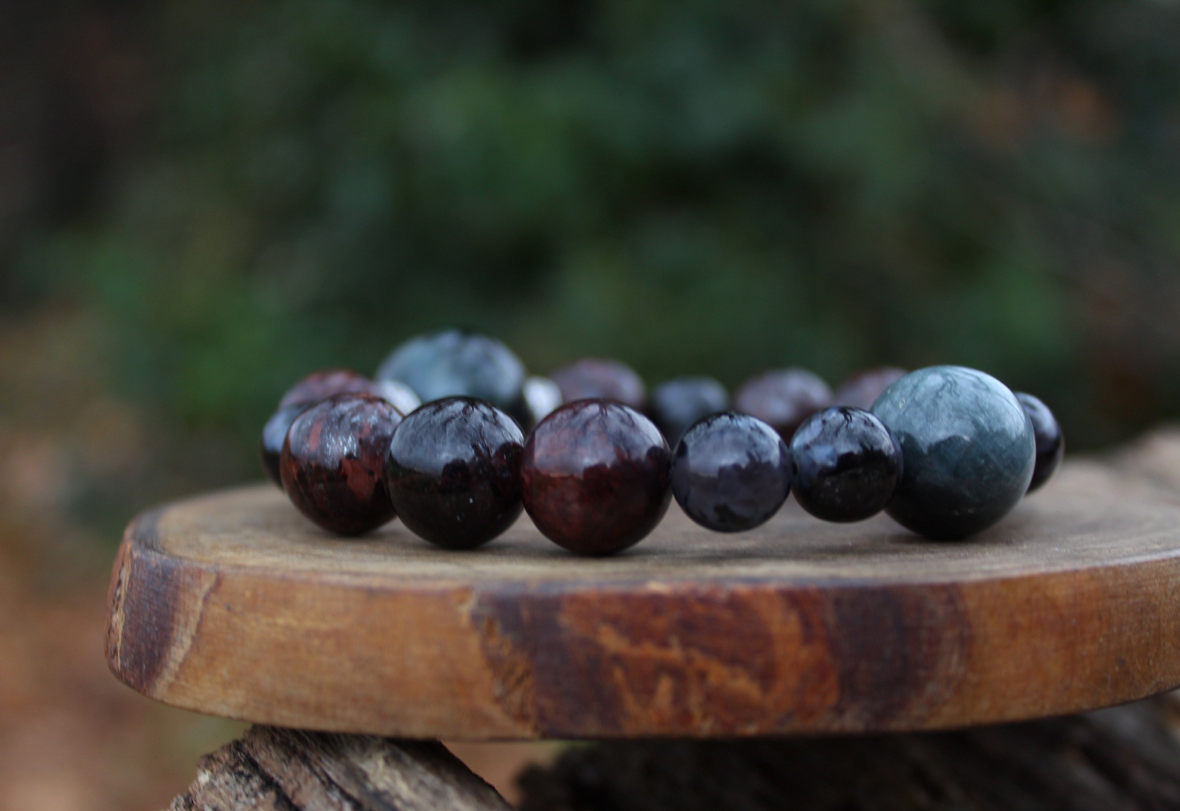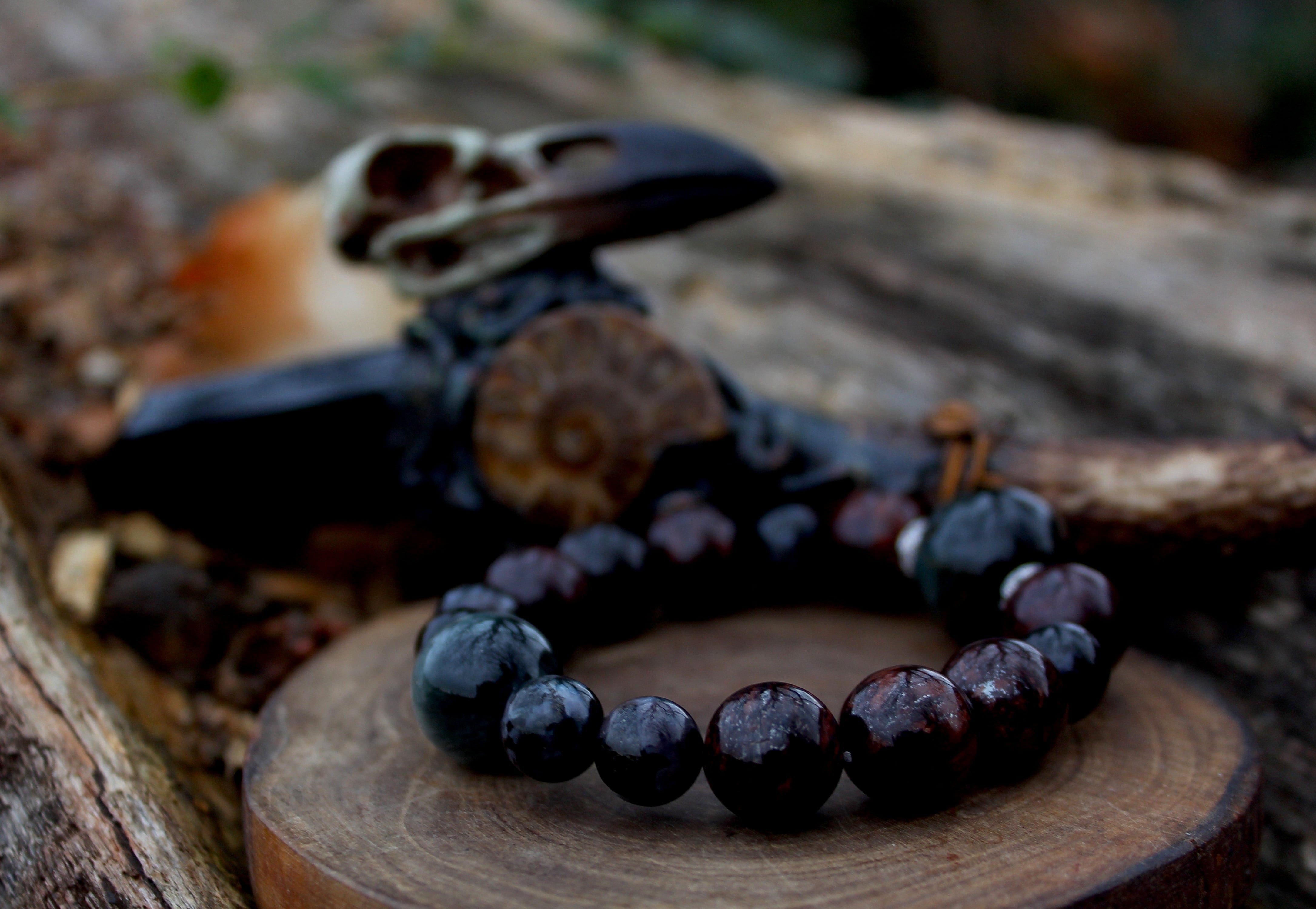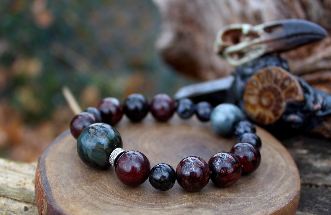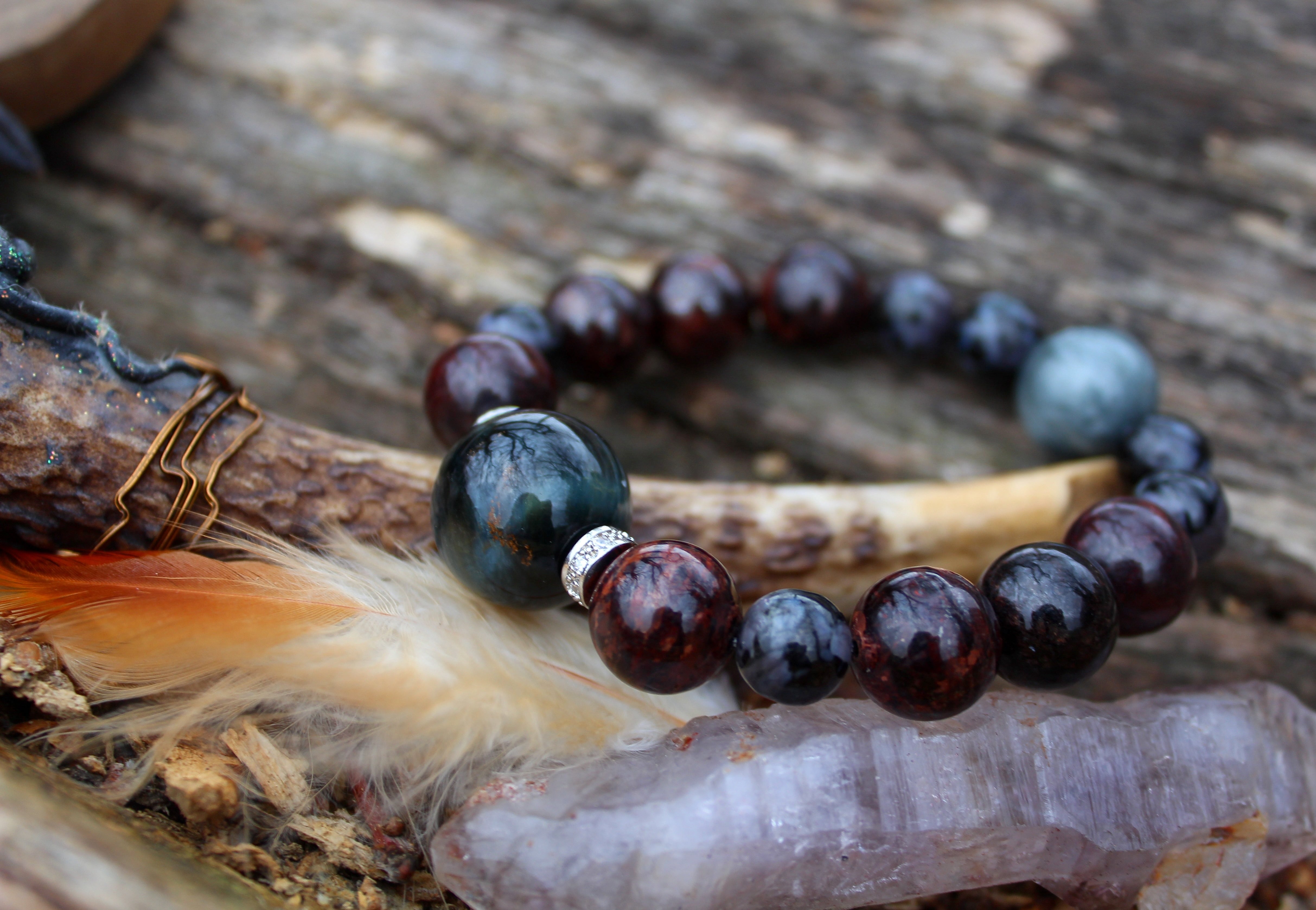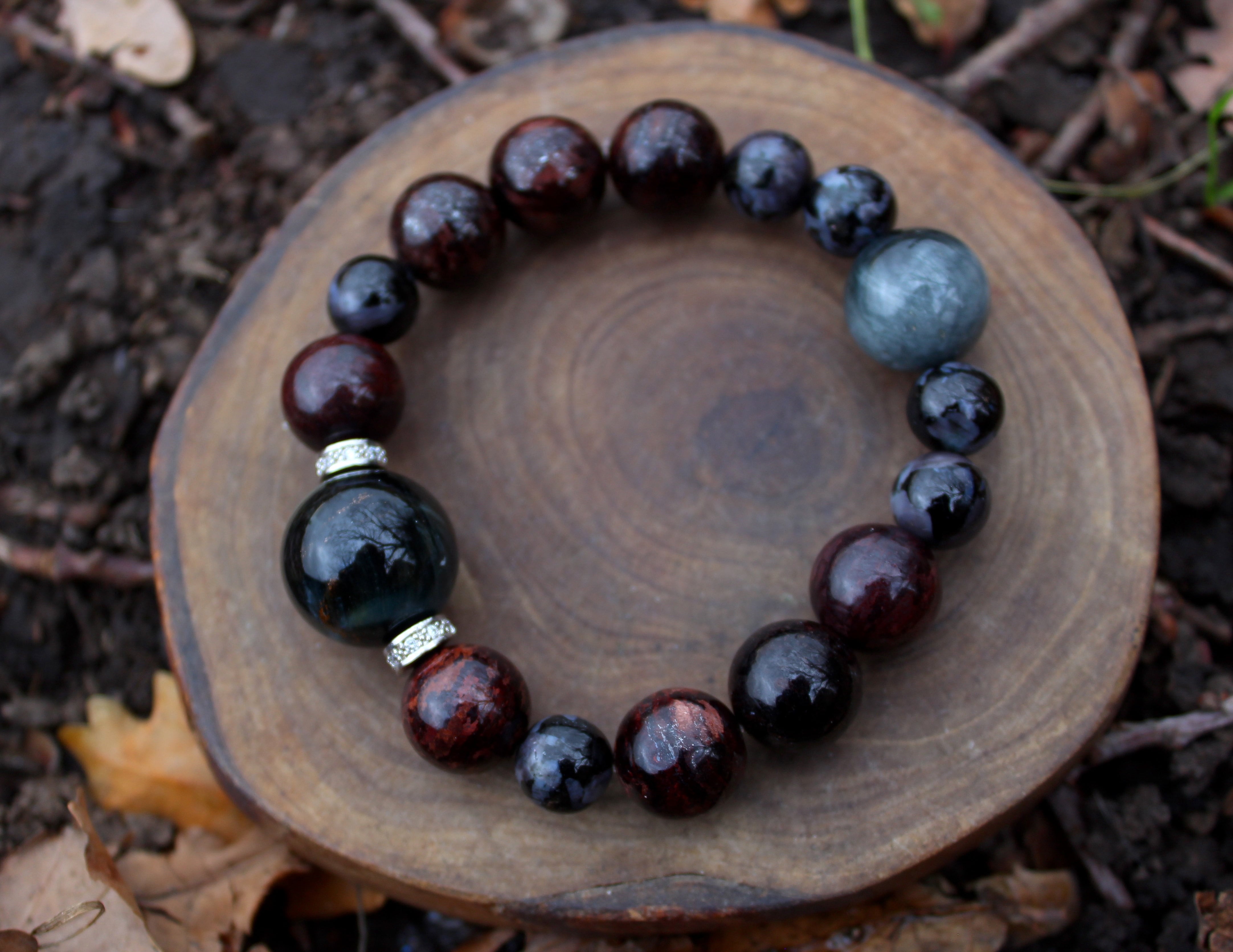 知性と叡智を授け、心眼を開く、保護作用も強く邪悪なものから守るホークスアイ、霊力を授け、悪魔の目から守るキャッアイ、邪眼を防ぎ、集中力、決断力、判断力魔術師の石といわれているヌーマイト、石事態が魔力を持つレアなヌーマイトゴールデンレッドAAA級、魔法や神秘的な経験を望む人に理想的なミスティックマーリナイトを使用しました。強力に魔力の高い、神秘のエネルギーを持つ、魔法使いの為のブレスレットです。
