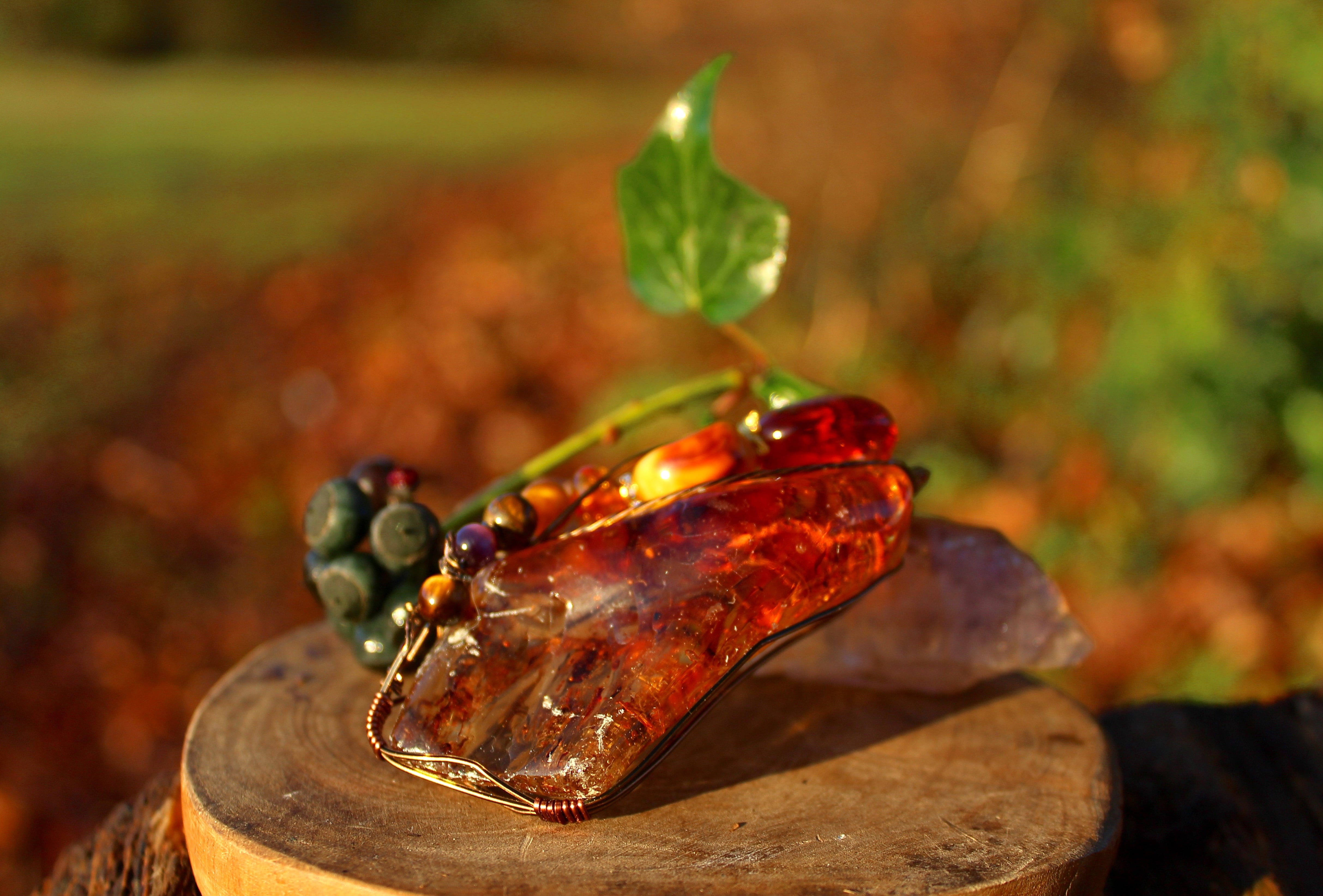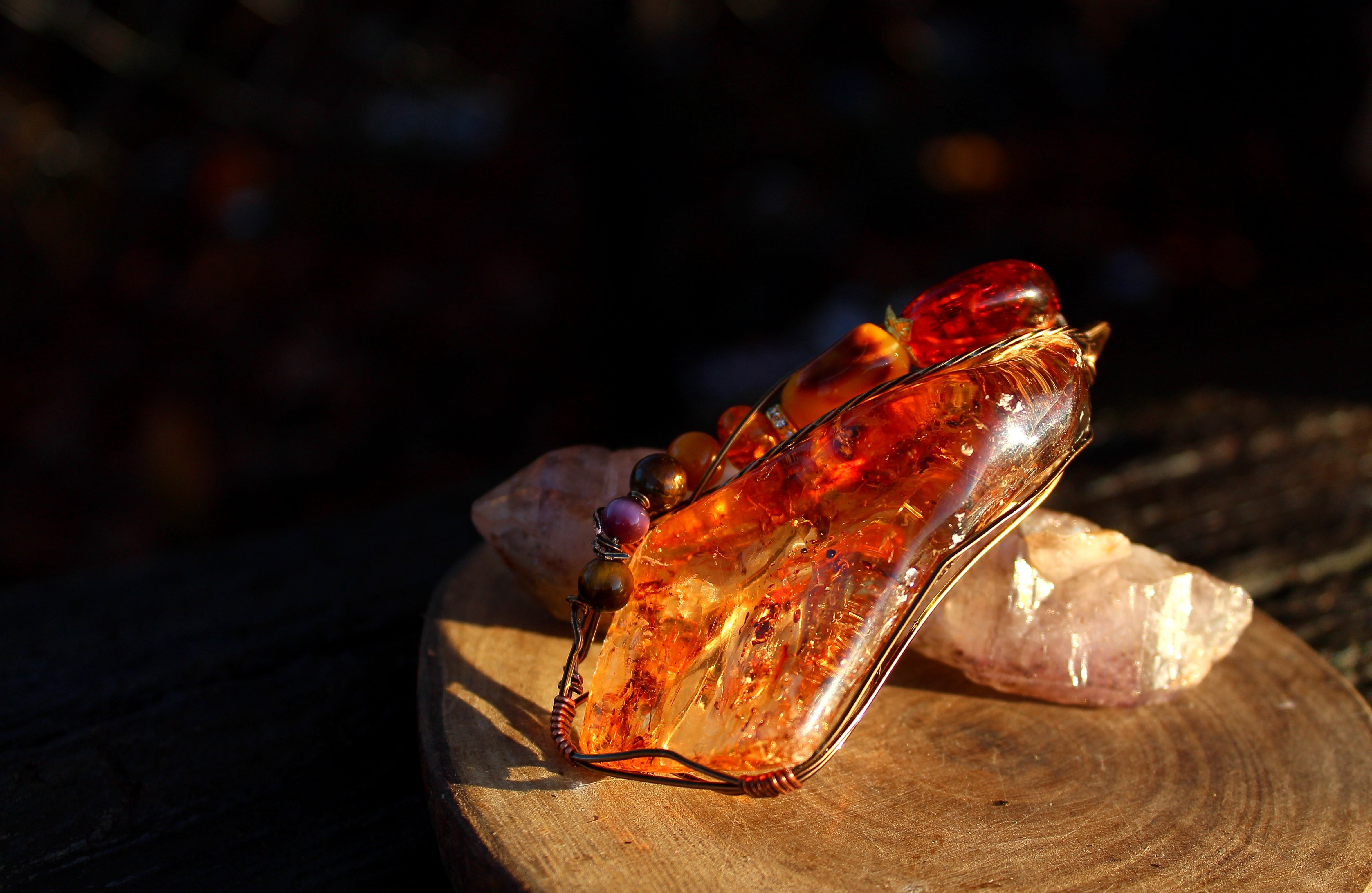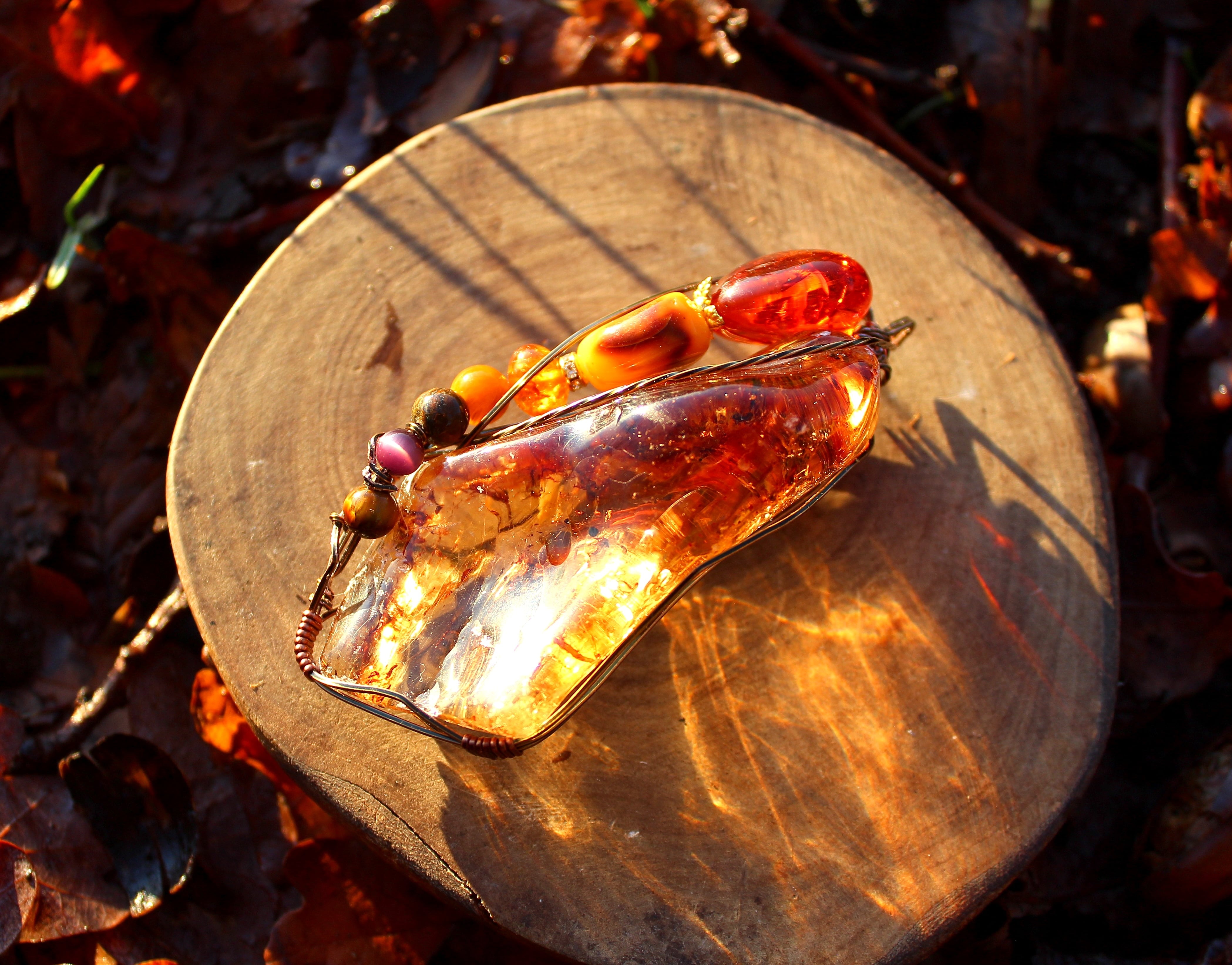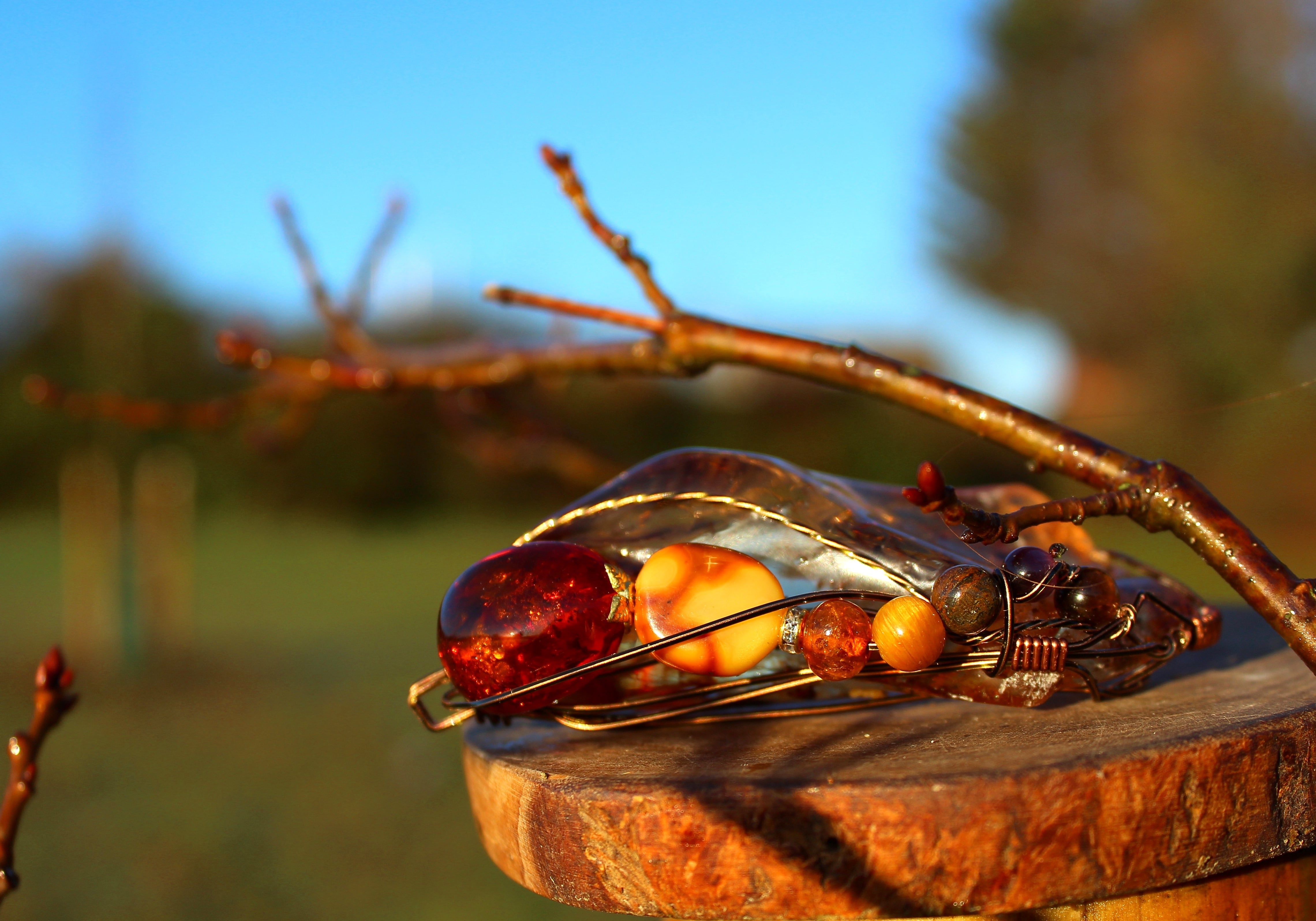 アンティークゴールドのワイヤーで巻いて、アンバーとタイガーズアイとキャッツアイのビーズをつけました。