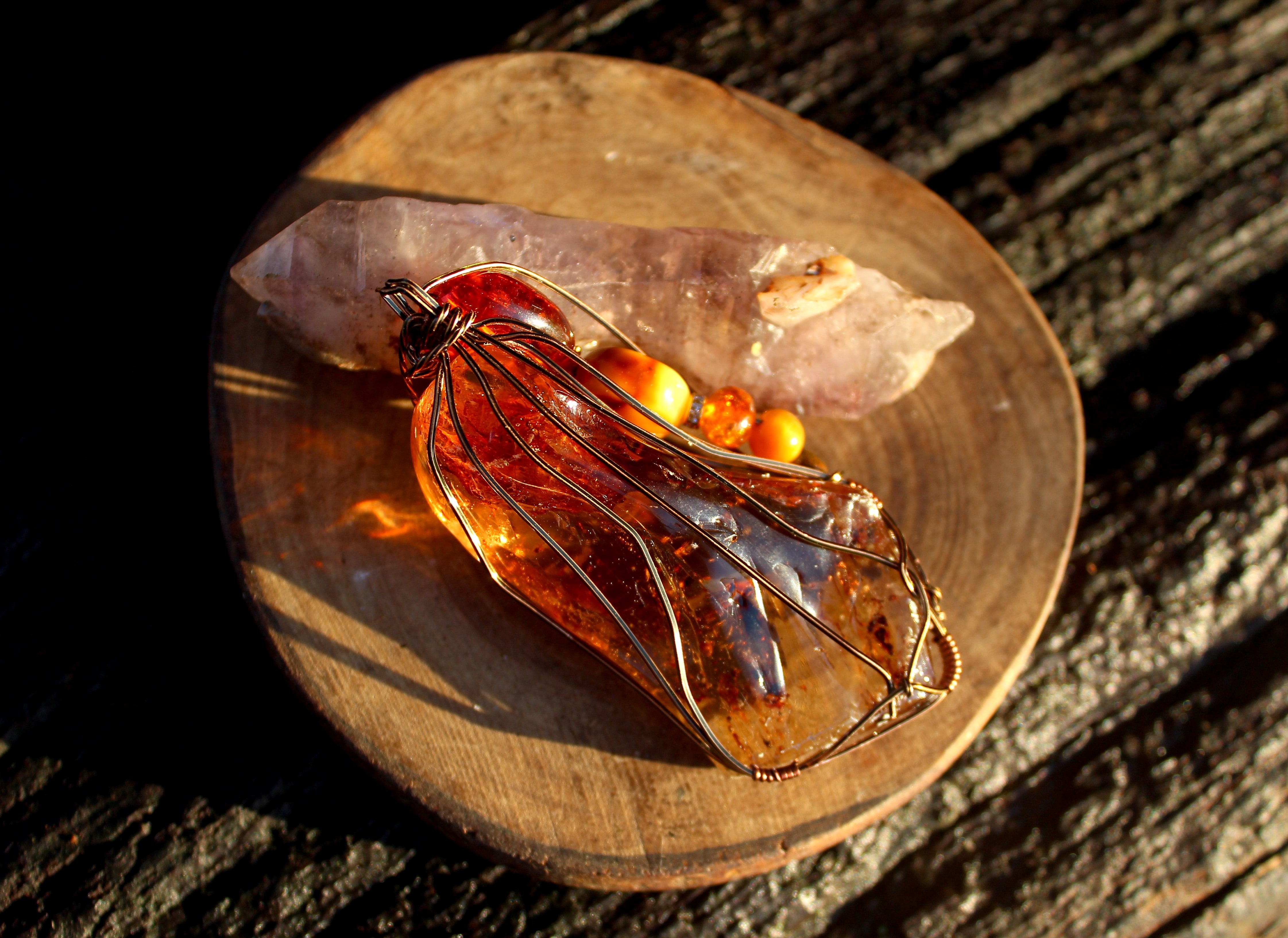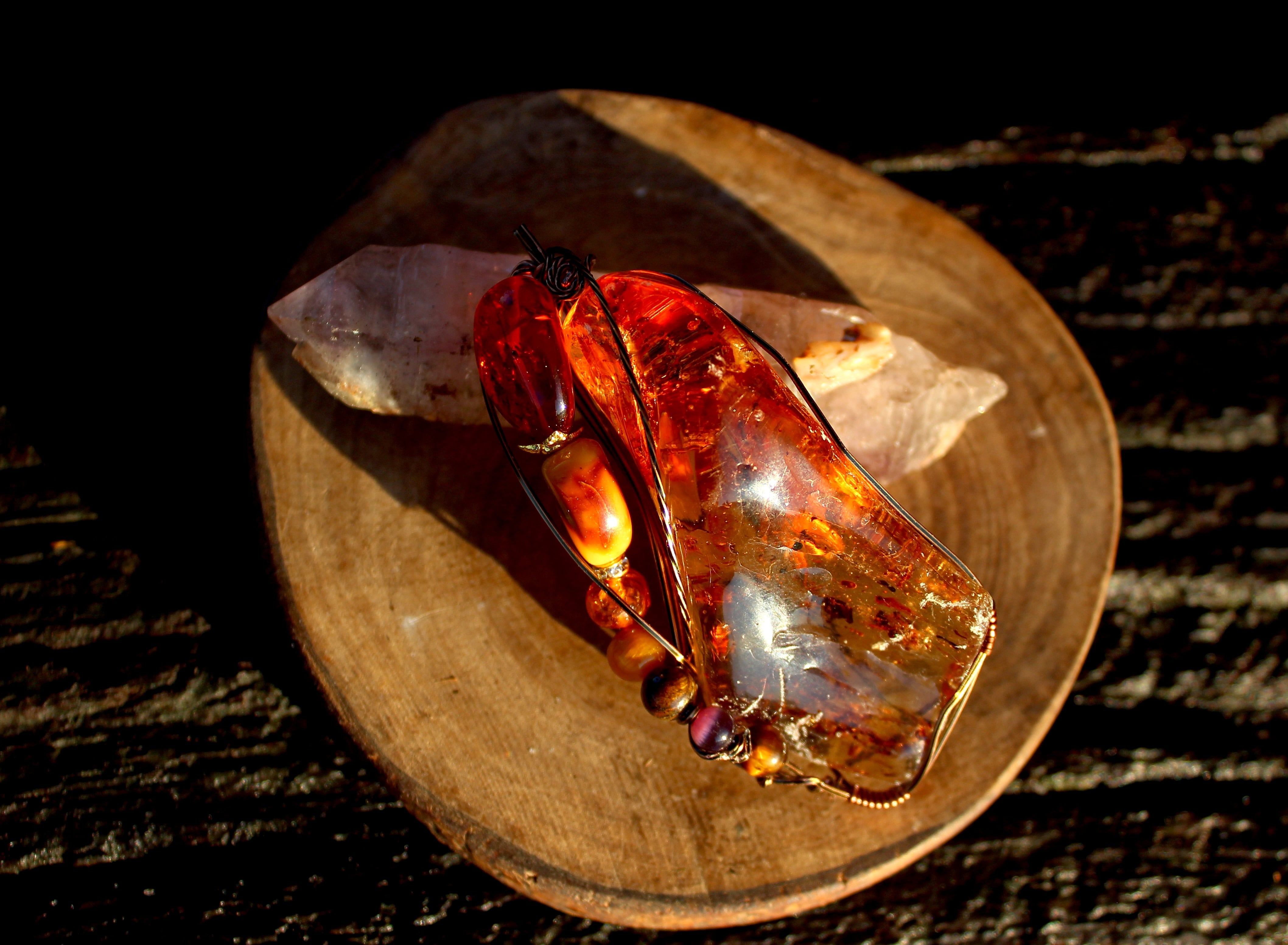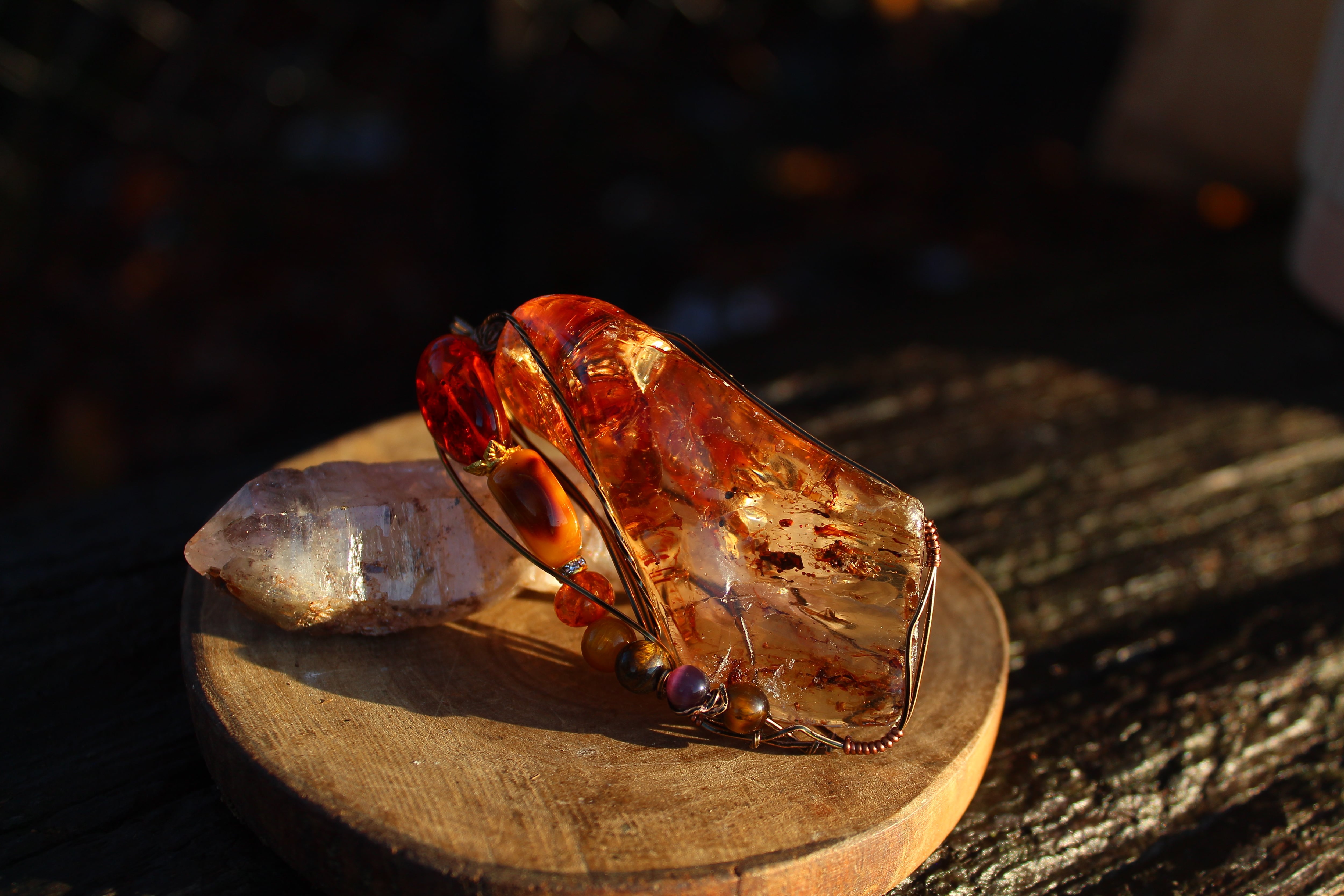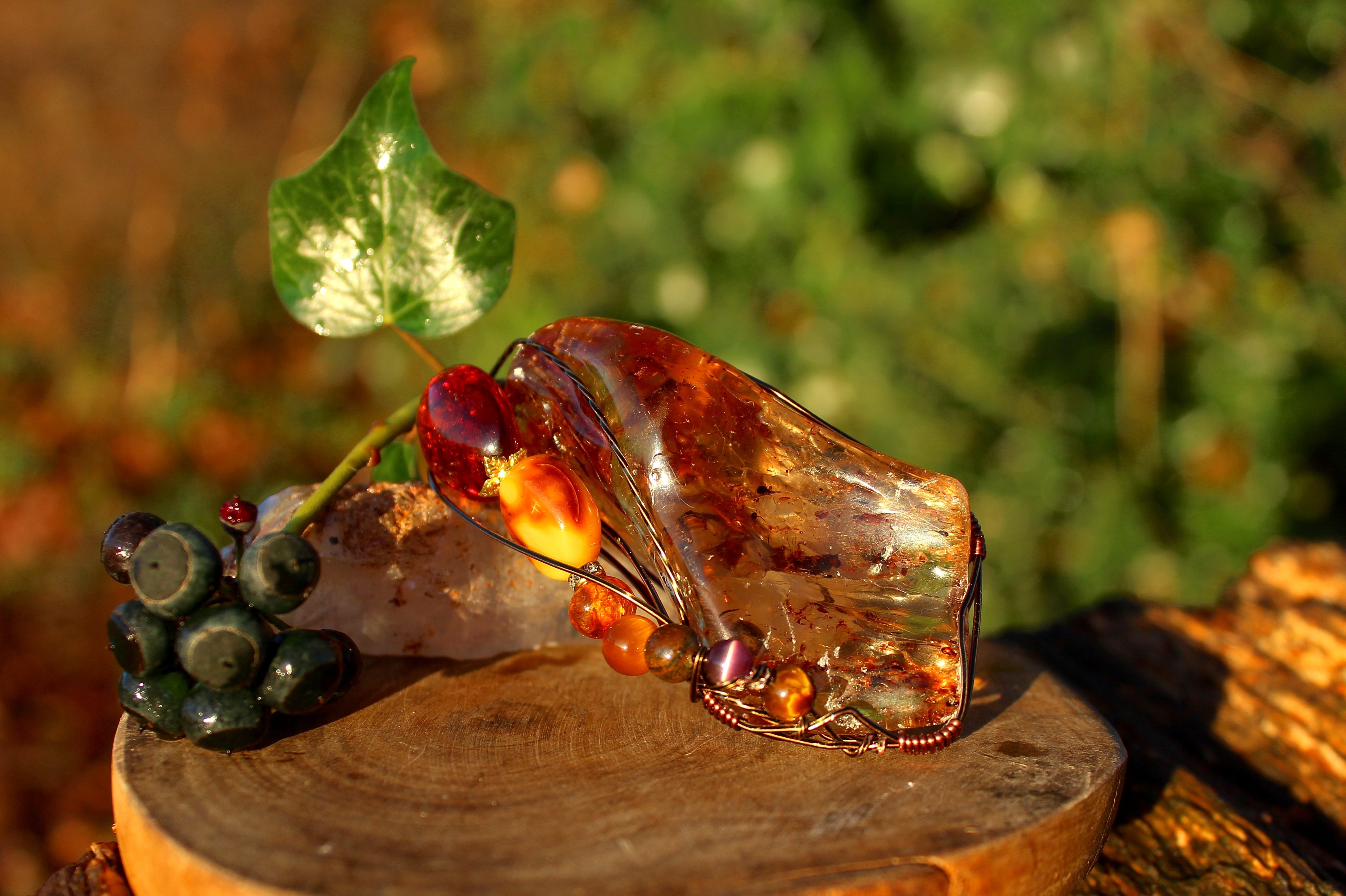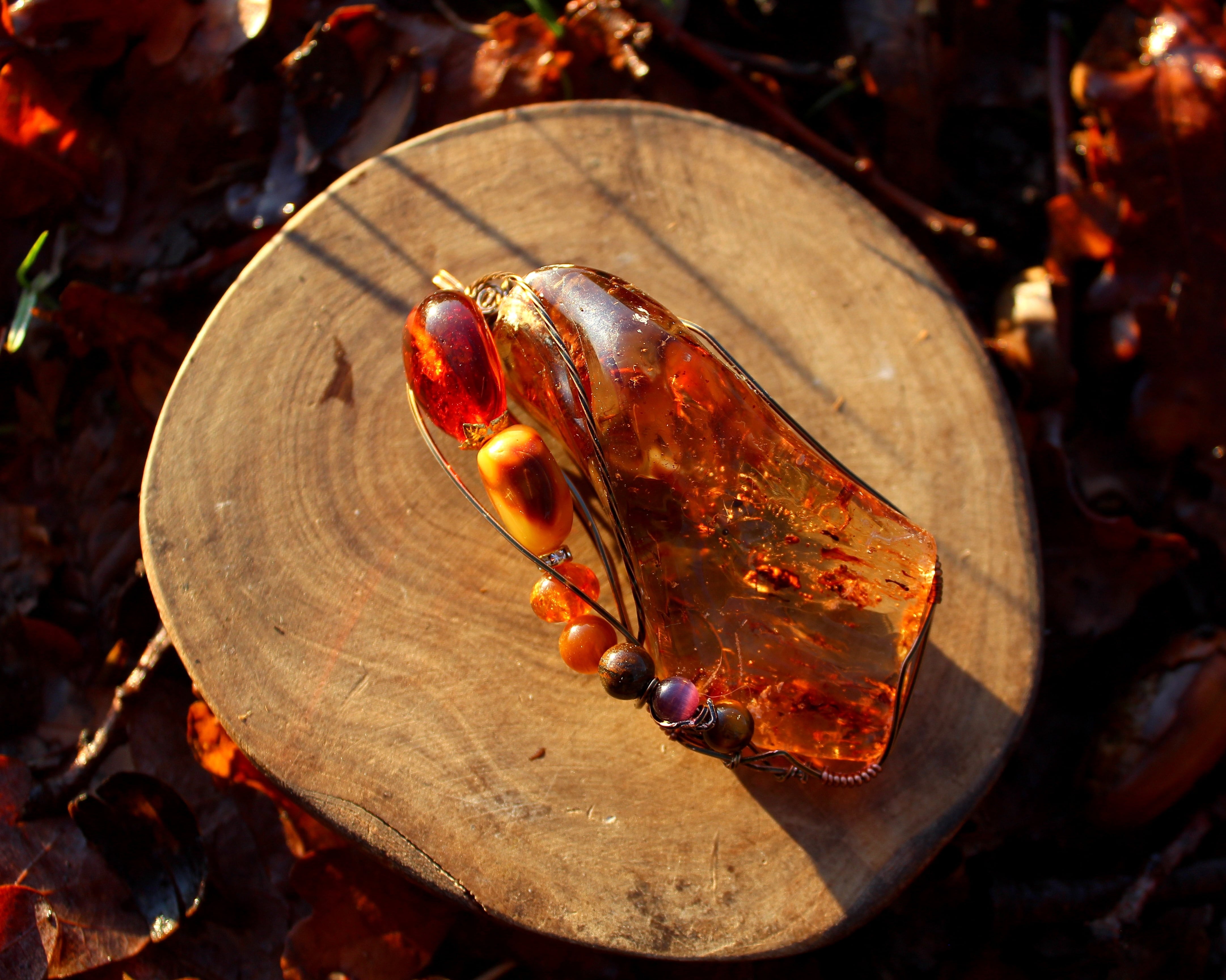 アンティークゴールドのワイヤーで巻いて、アンバーとタイガーズアイとキャッツアイのビーズをつけました。