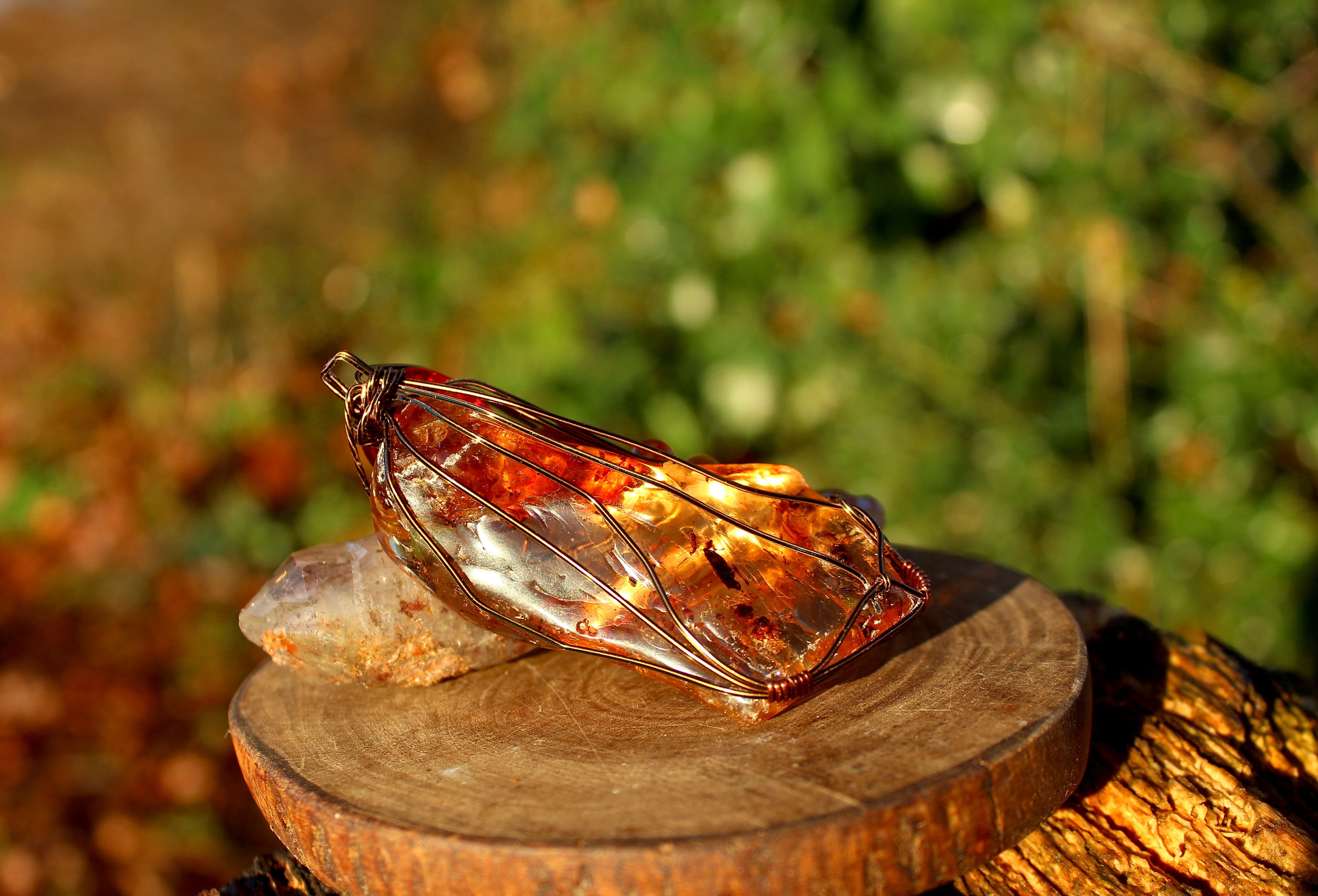 「コパル 虫入り」とは、木の樹脂が固まったコパルという半化石の中に、太古の昆虫や植物などが閉じ込められて化石化したものを指します。琥珀に比べると年代が若く柔らかいといった特徴があります。太古の生命力や神秘的なパワーを持つとされ、 貴重でコレクターに非常に人気があります。琥珀は3000万年以上かけて完全に化石化したものであるのに対し、コパルは約100万年〜数千万年前の若い樹脂が固まったもの。琥珀よりも年代が若く、柔らかく、透明感があり、色が明るいのが特徴です。樹脂が固まる際に、ハエ、アリ、蚊などの昆虫や、小さなトカゲなどが巻き込まれてそのまま閉じ込められ、化石化した状態を「虫いりコパル」といいます。希少価値が高く、内包される虫や生物が鮮明に見えるほど価値が高まります。太古の生命力を感じさせ、心を落ち着かせ、集中力や粘り強さを養うお守りとされます。古代から邪気を払い、身を守る力があると珍重されてきました。