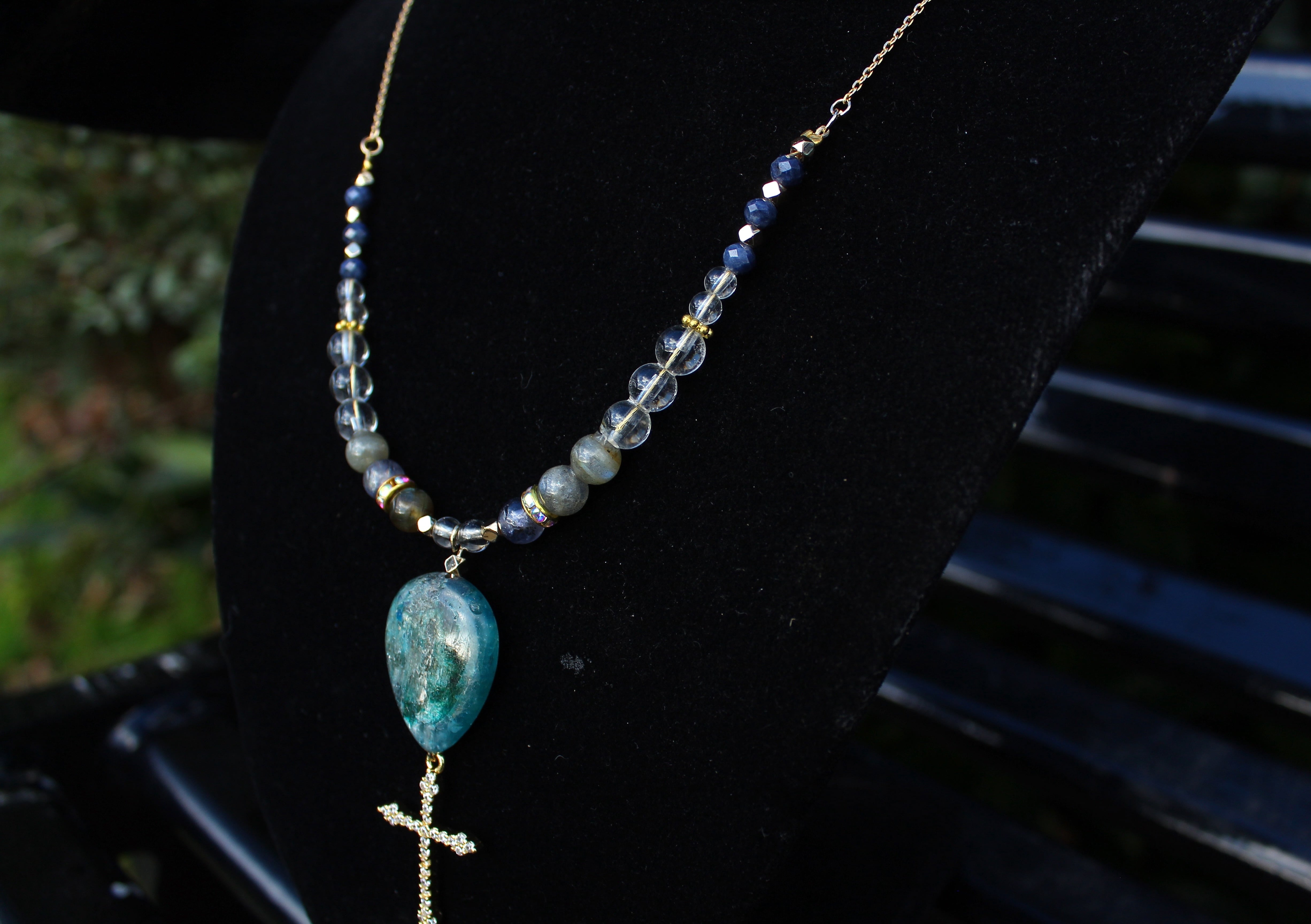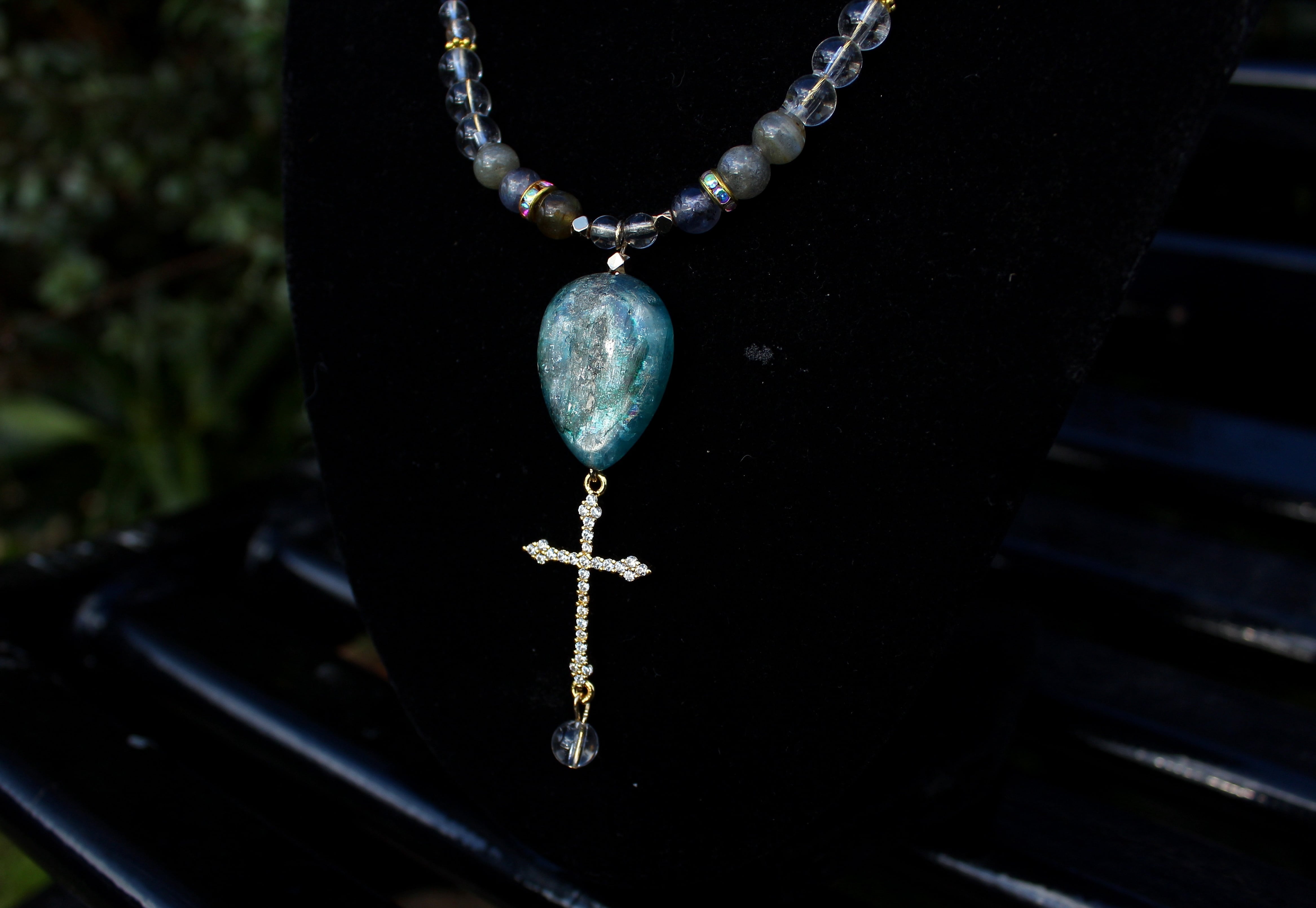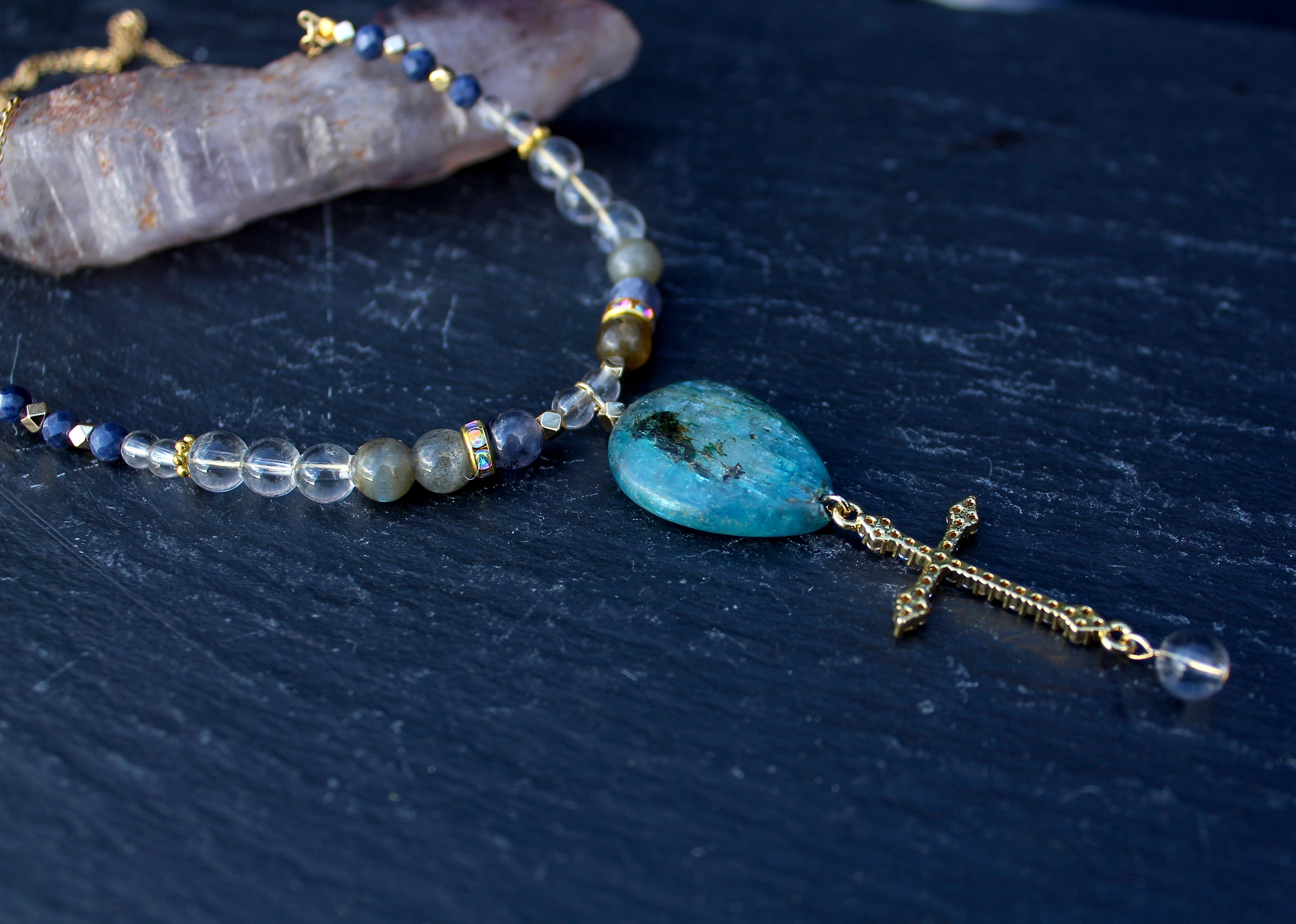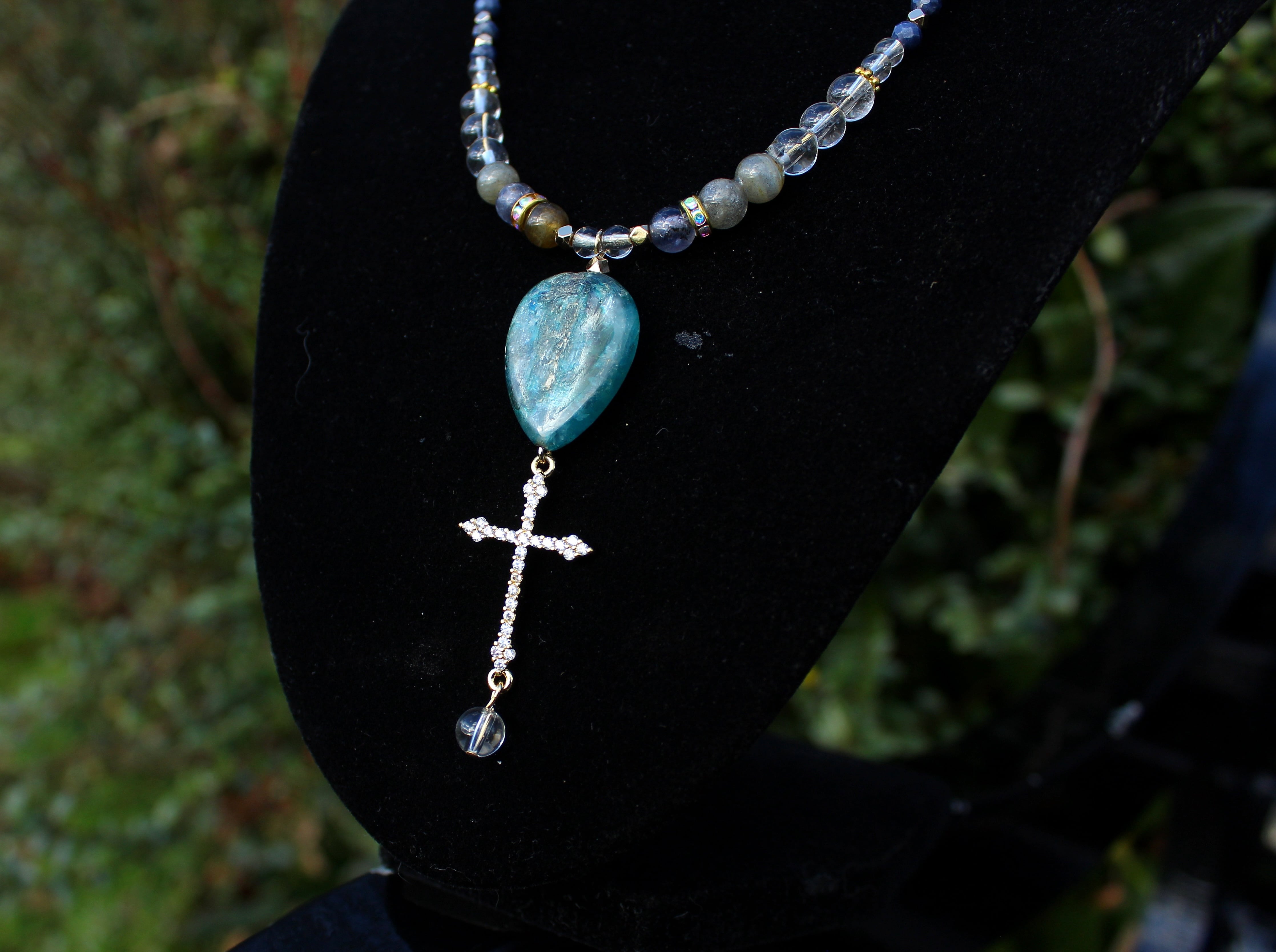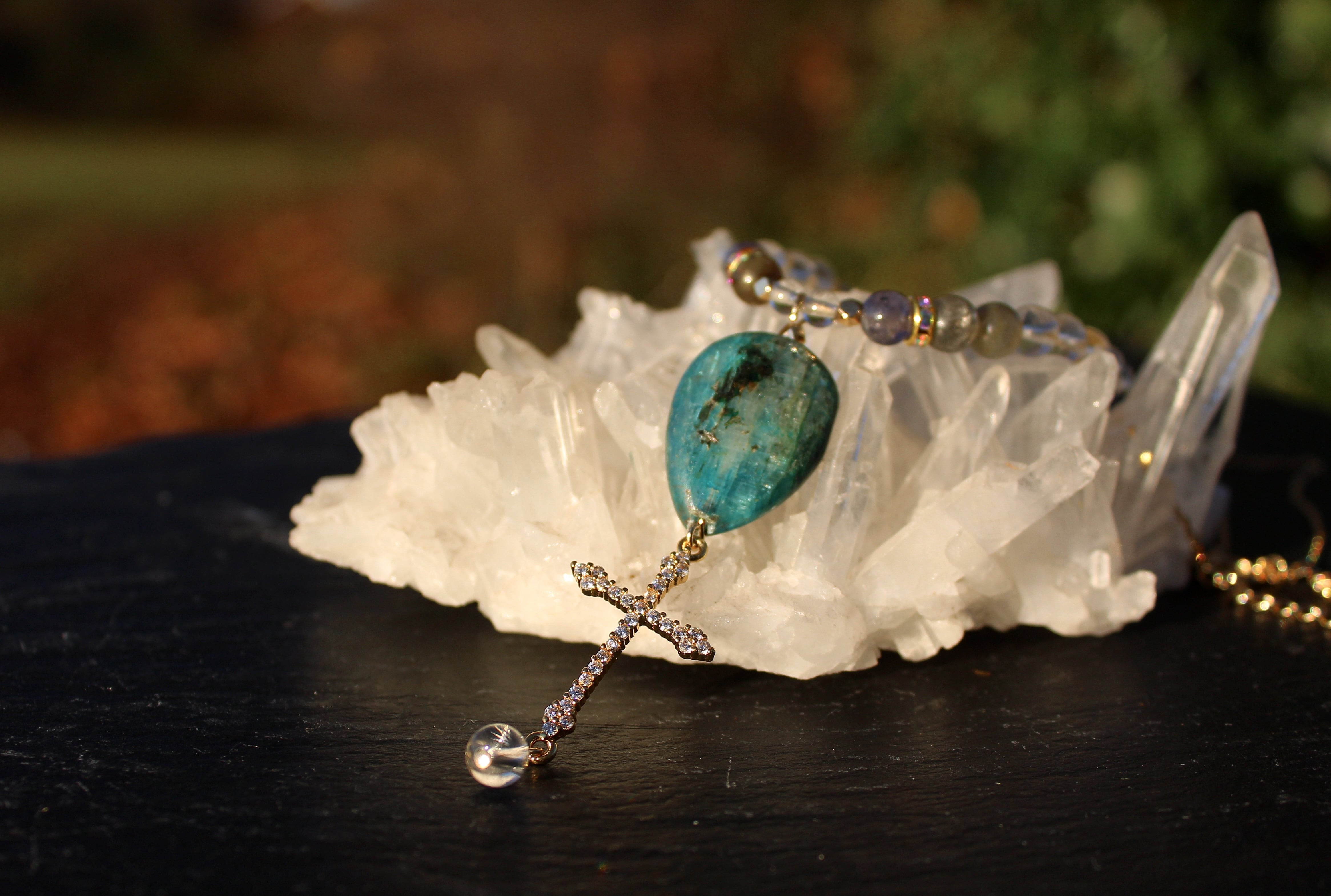 輝きが美しいブルーカイヤナイトのポリッシュに、キラキラのラインストーンが美しいクロスのパーツを組み合わせ、6ミリの水晶をつけました。