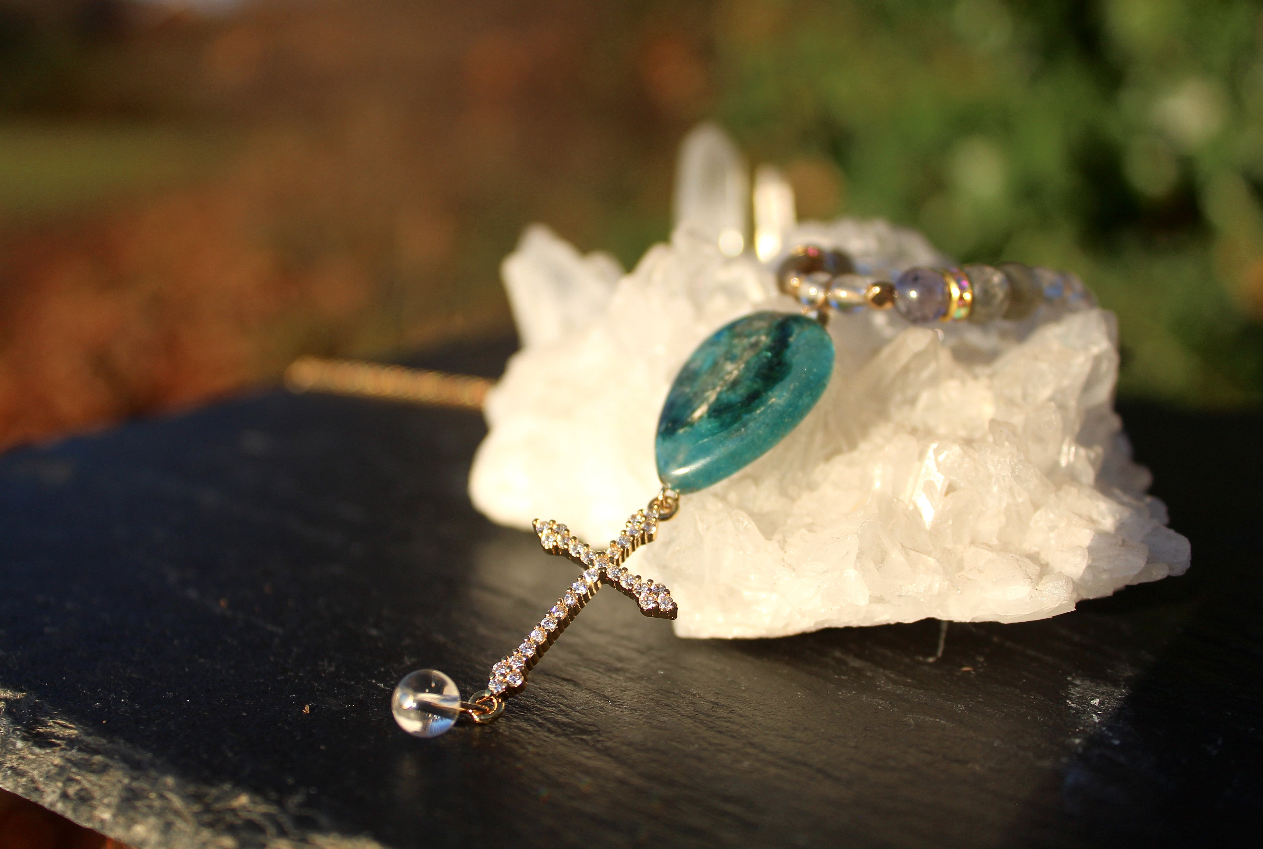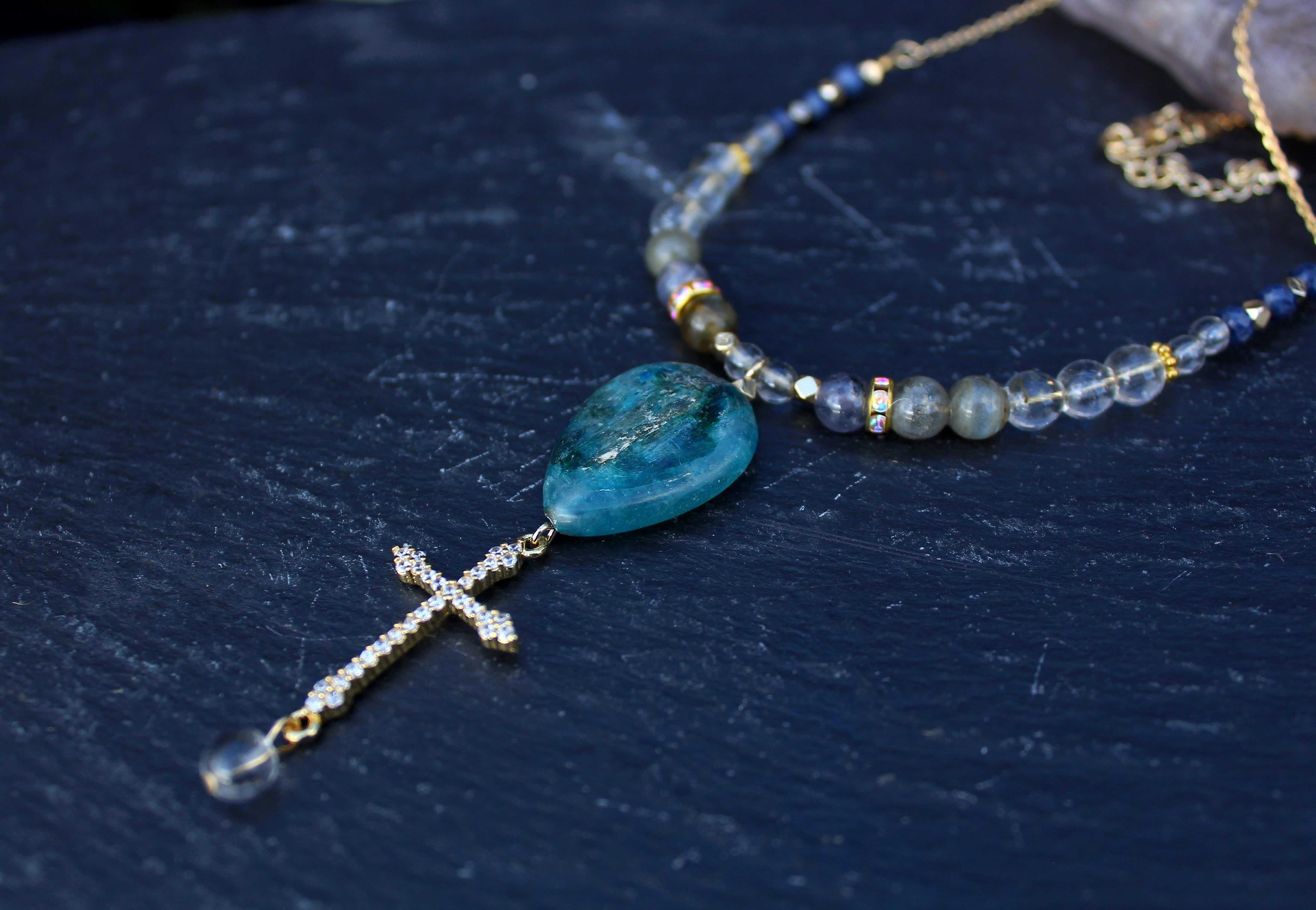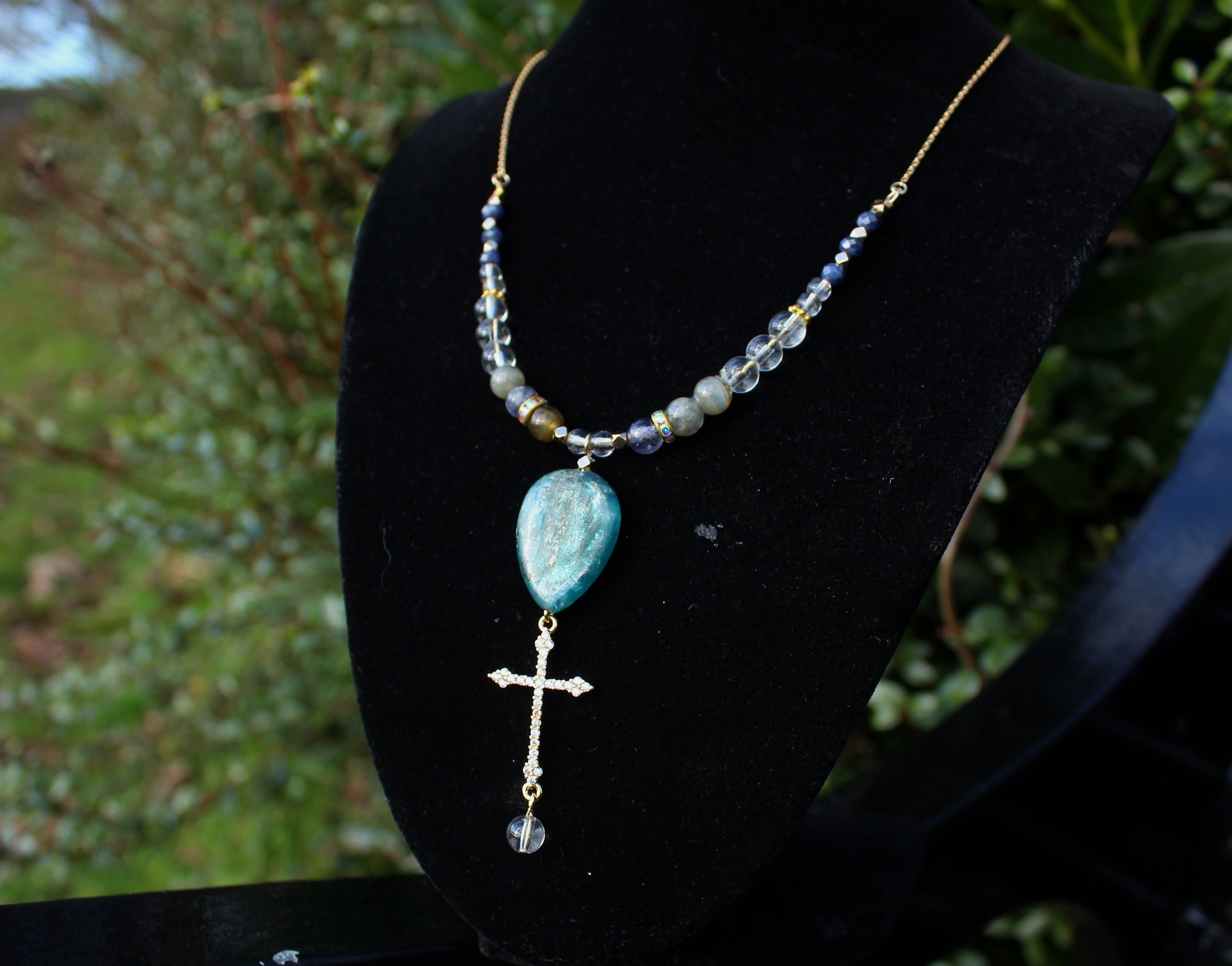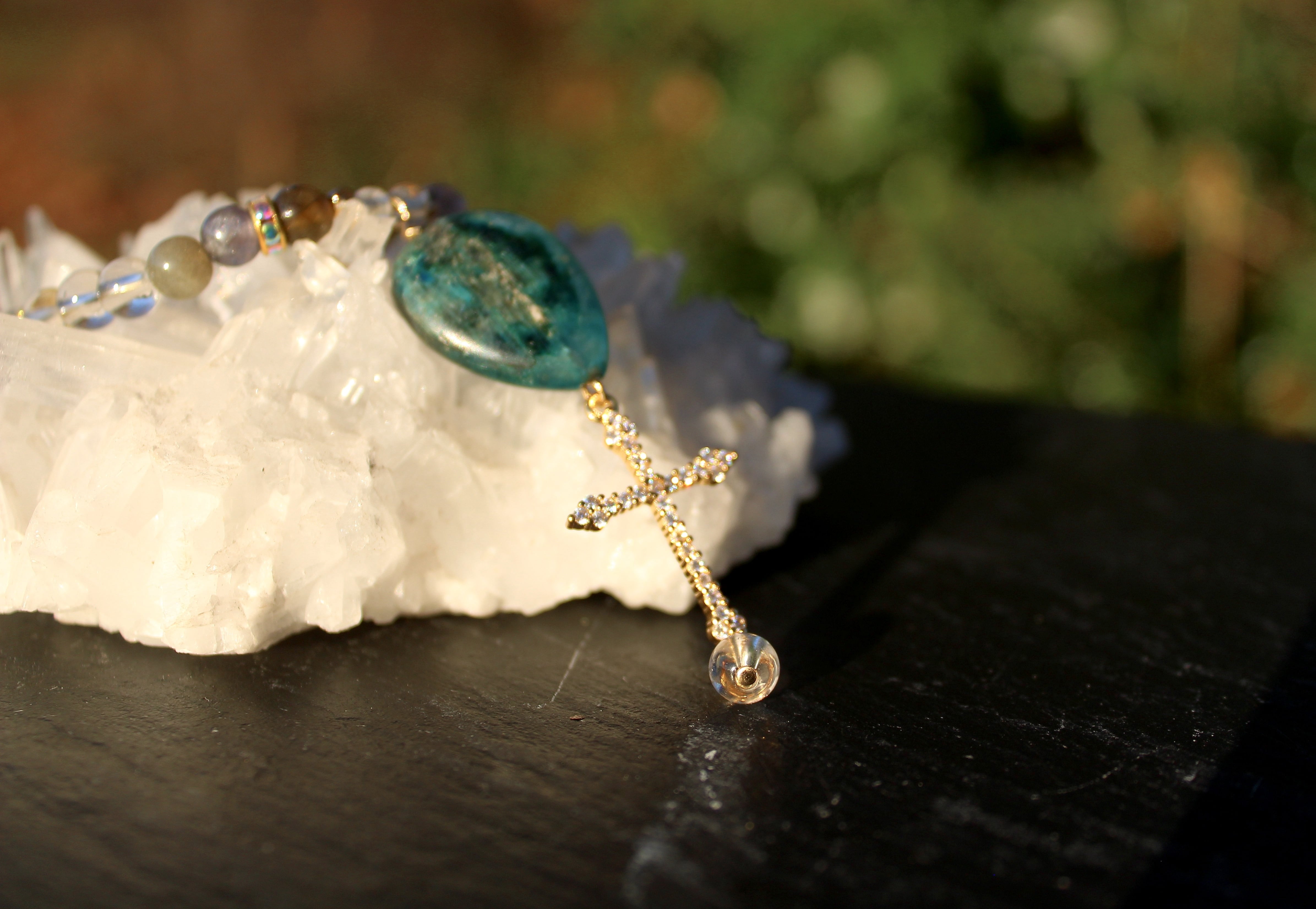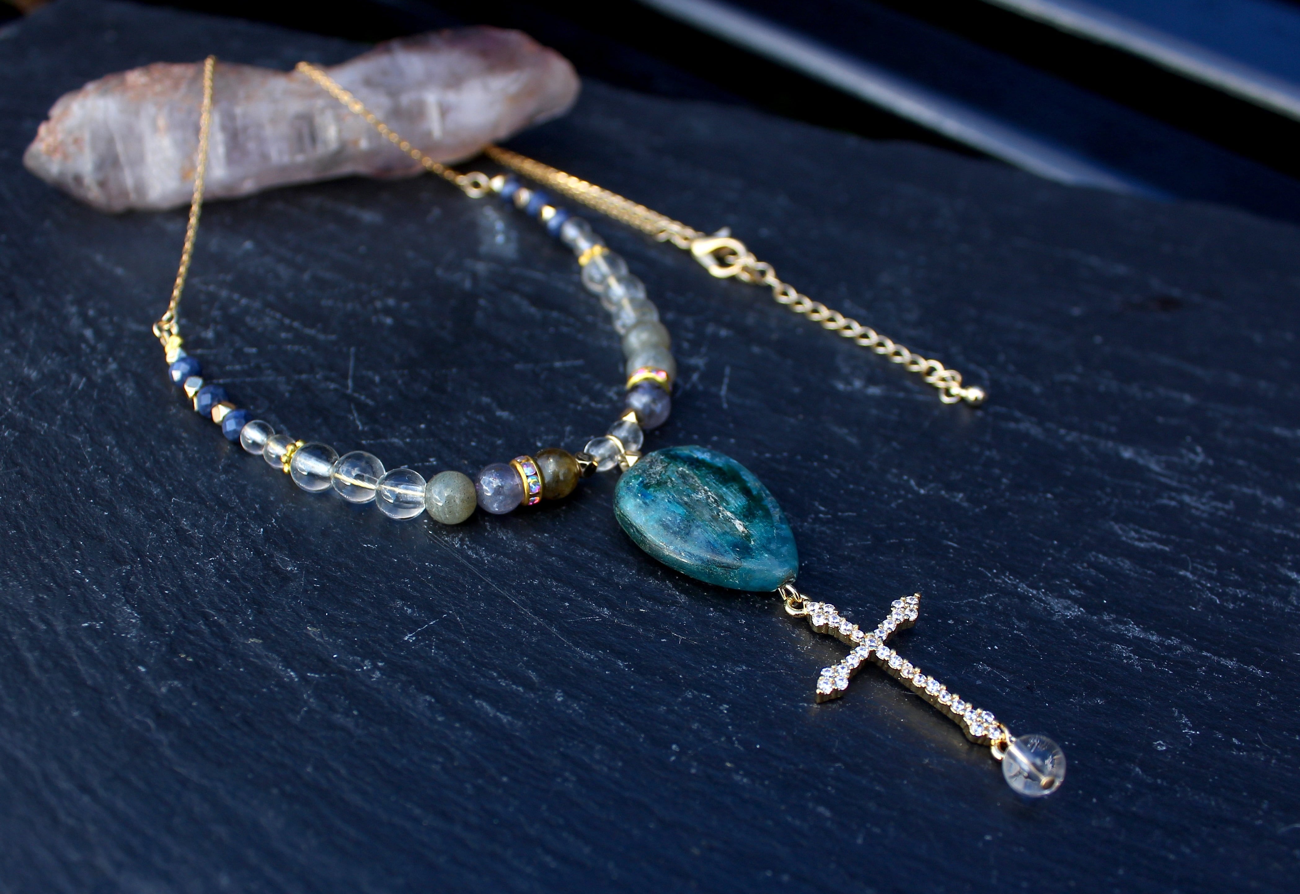 輝きが美しいブルーカイヤナイトのポリッシュに、キラキラのラインストーンが美しいクロスのパーツを組み合わせ、6ミリの水晶をつけました。