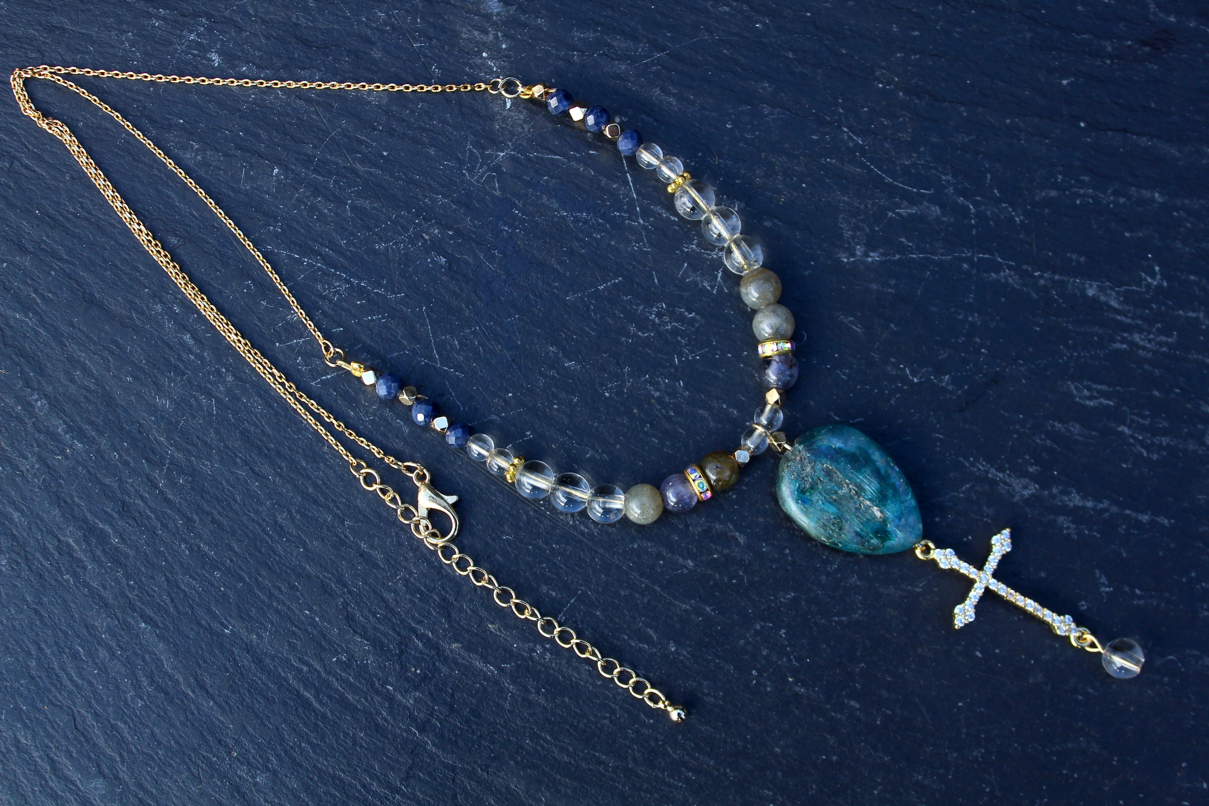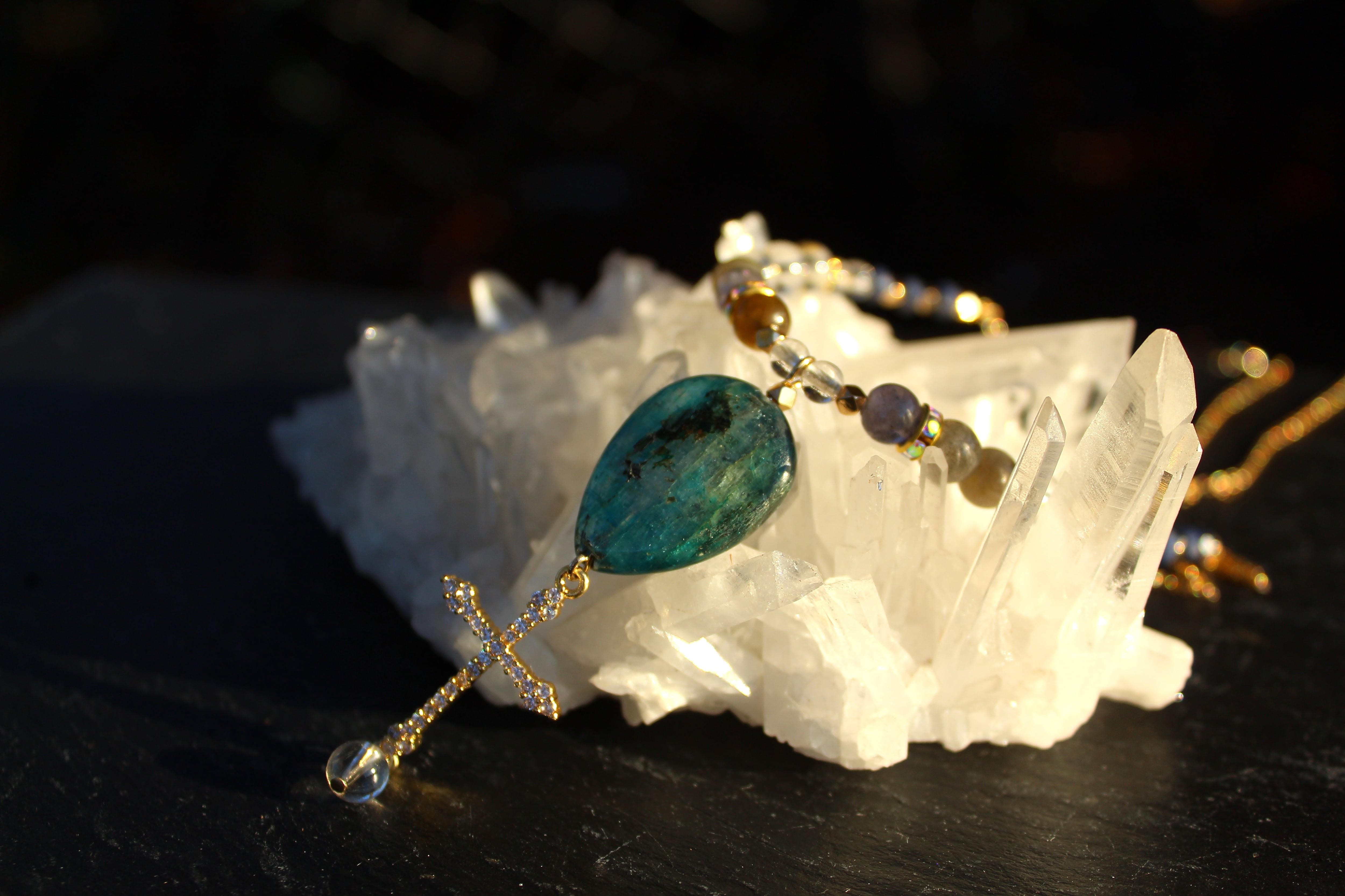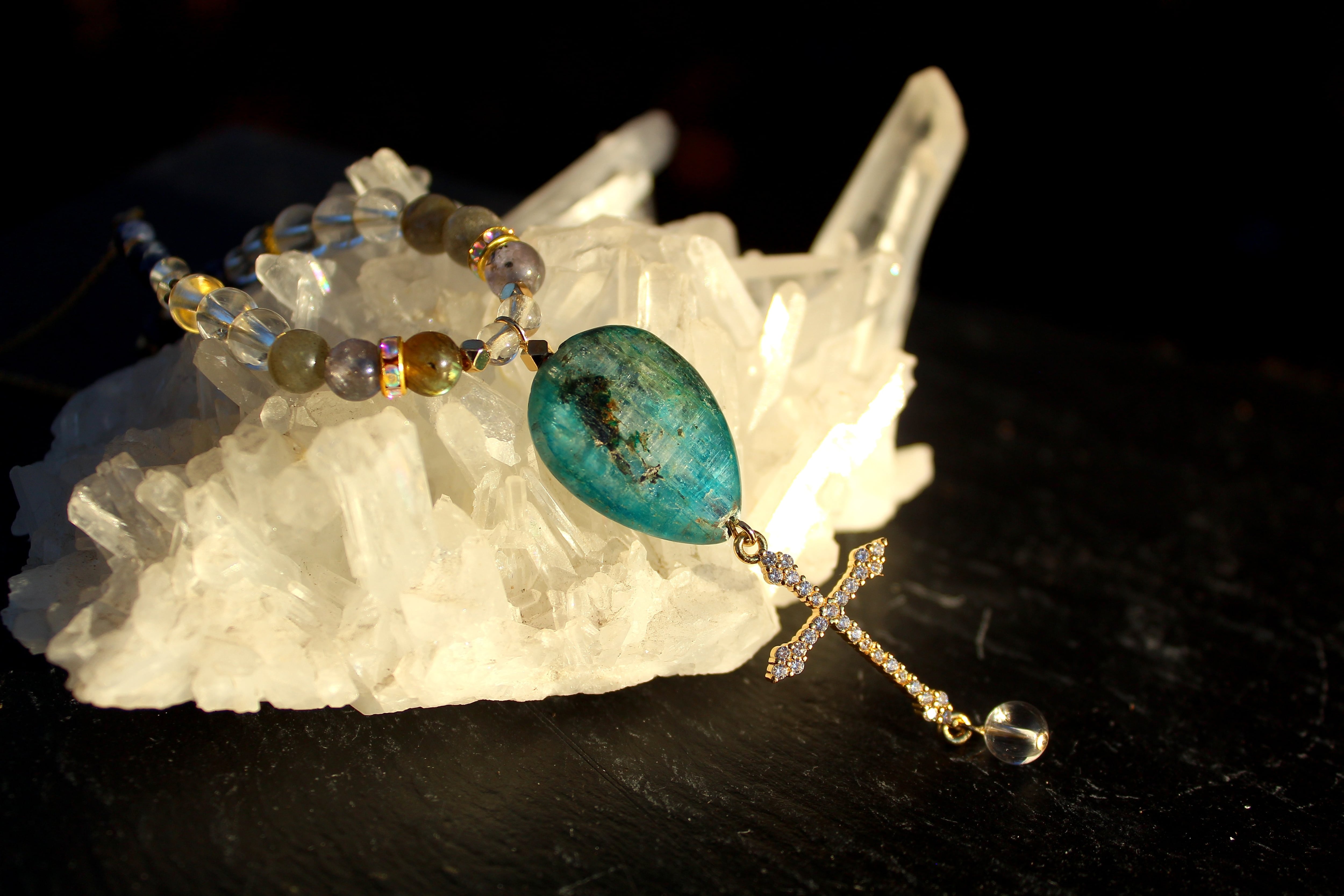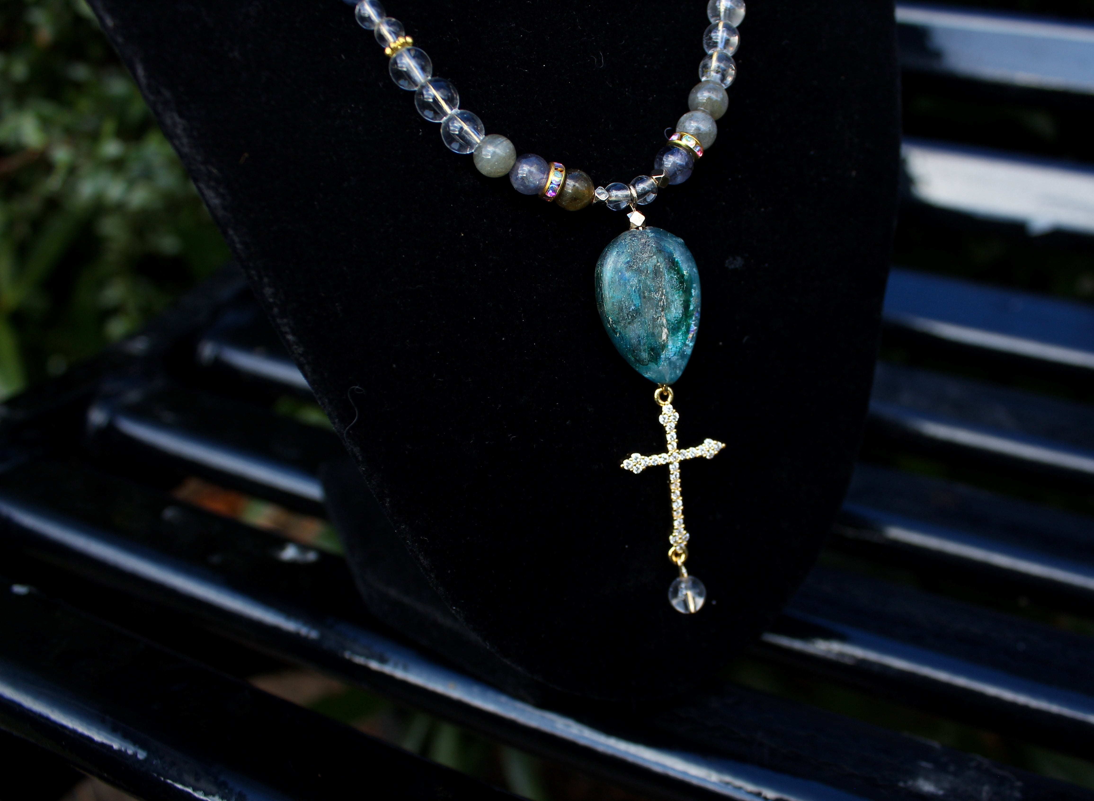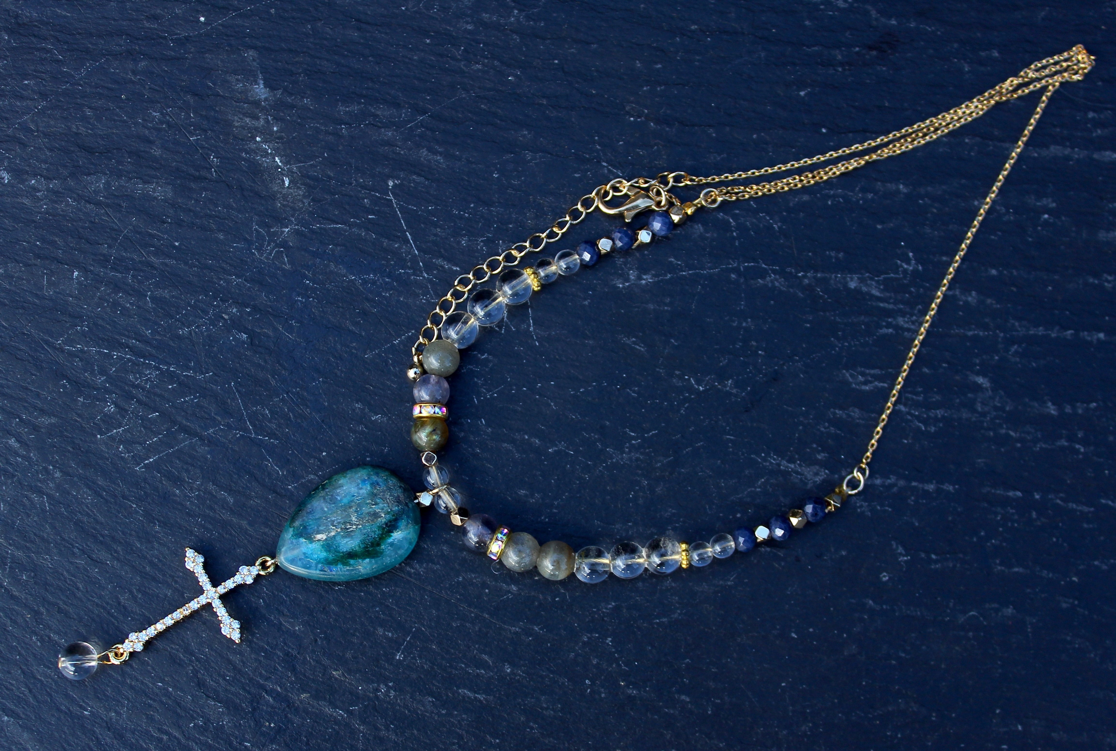 輝きが美しいブルーカイヤナイトのポリッシュに、キラキラのラインストーンが美しいクロスのパーツを組み合わせ、6ミリの水晶をつけました。