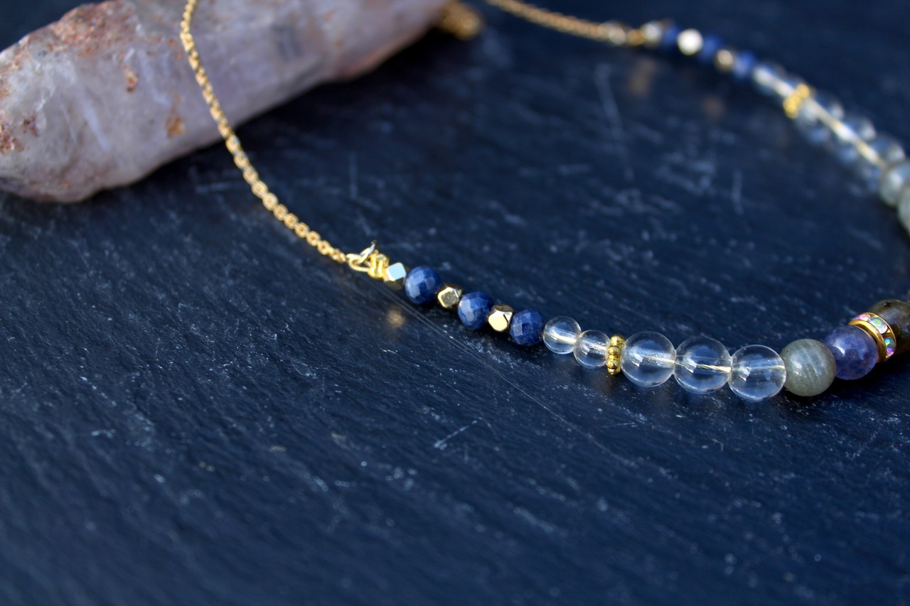4ミリの水晶、6ミリのラブラドライト、6ミリと4ミリの水晶、最後に4ミリのカッティングサファイアで仕上げてあります。