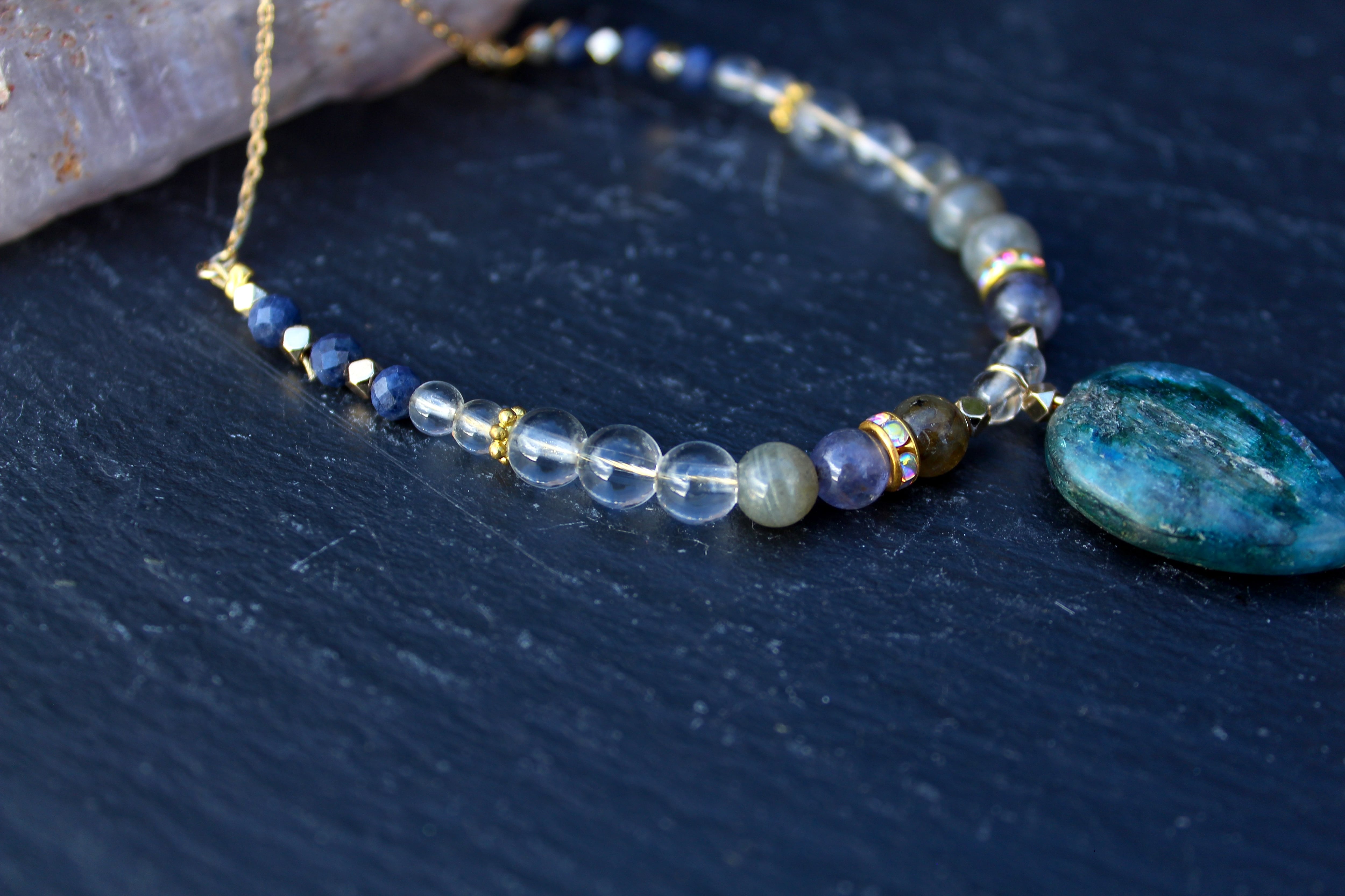 喉のチャクラを開いて自己表現とコミュニケーションを促進します。特にブルーカイヤナイトは声を強化し、喉と咽頭を癒します。演奏や演技をする人や演説や講演をする人に有用です。