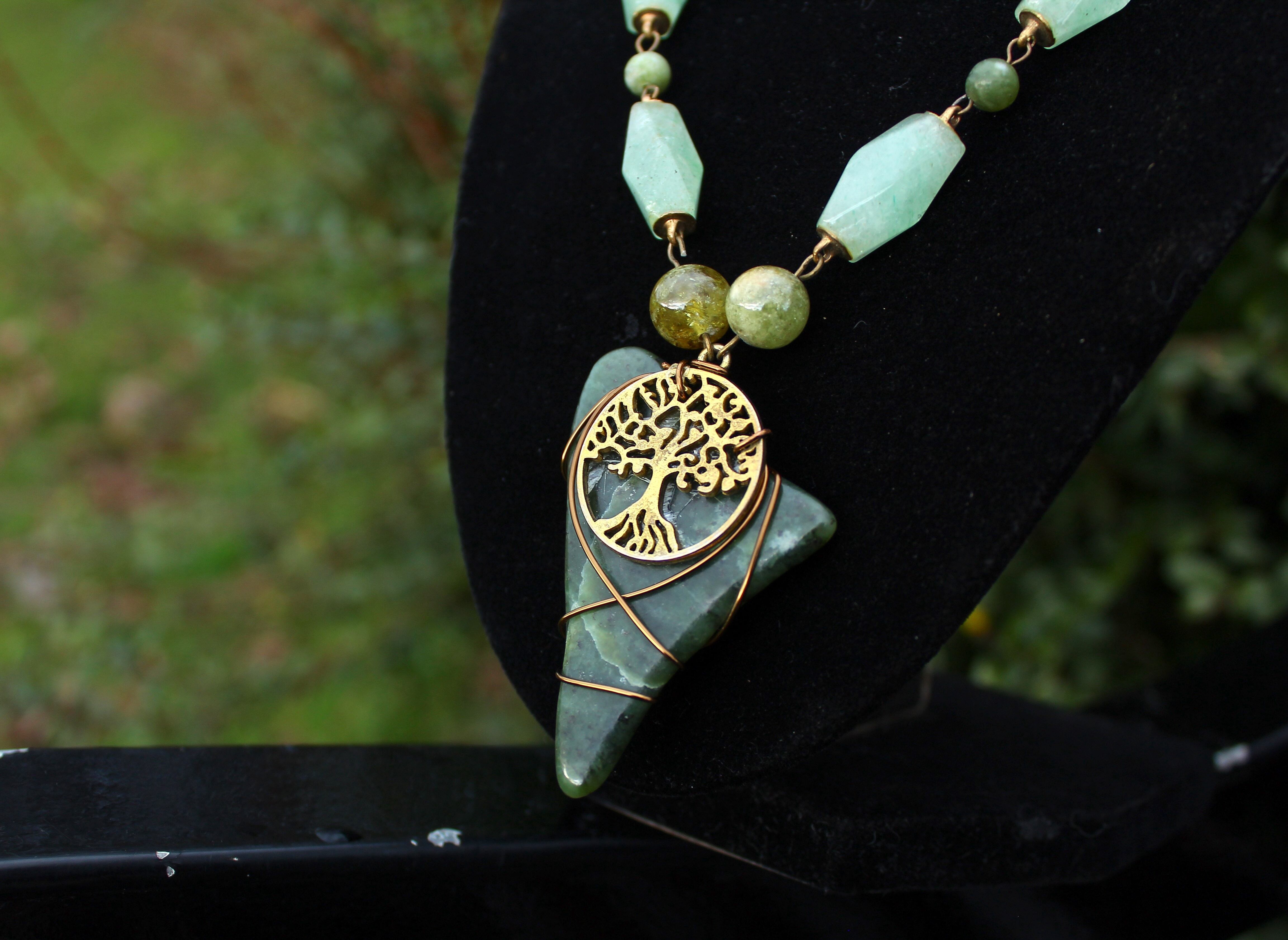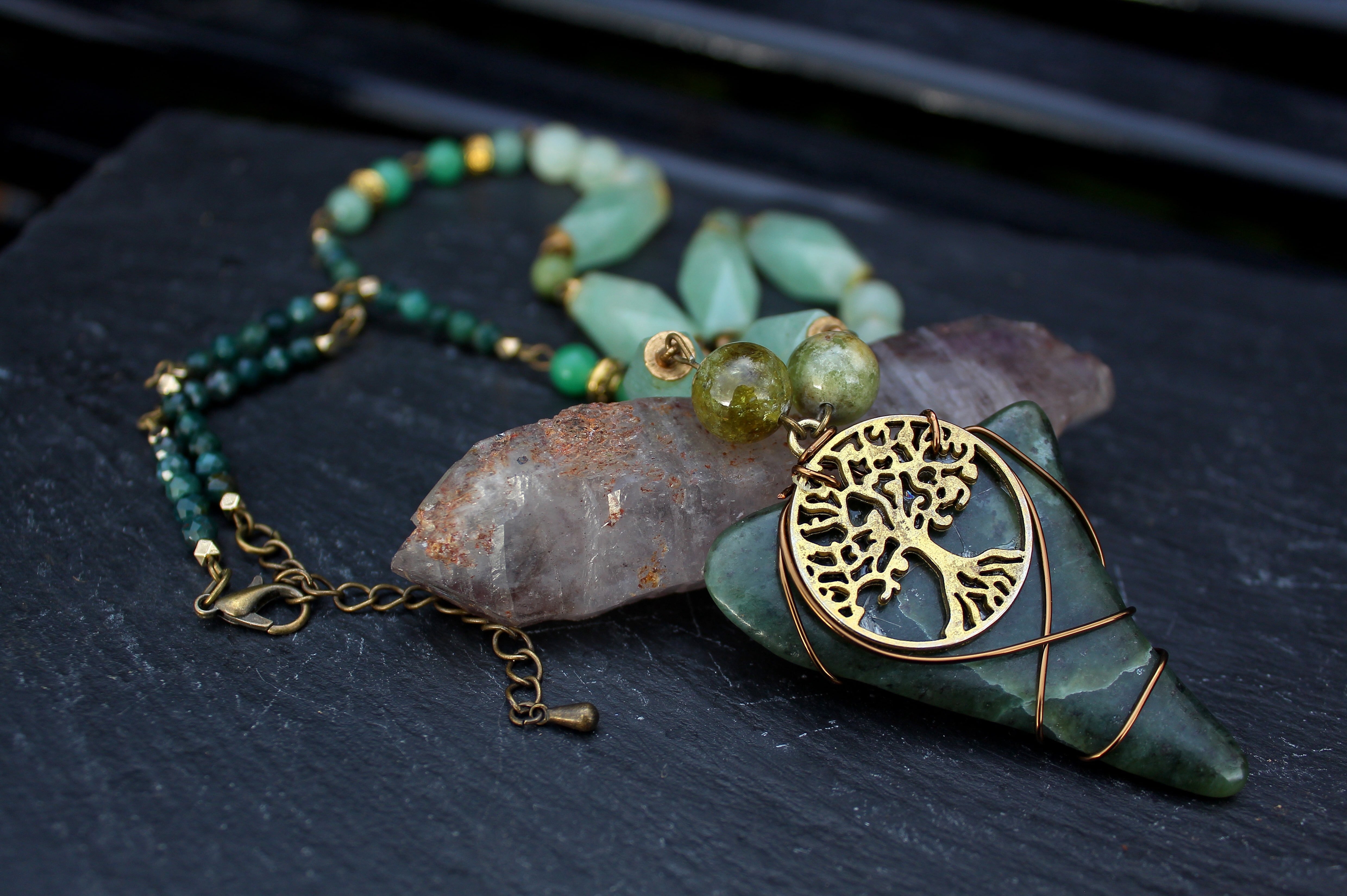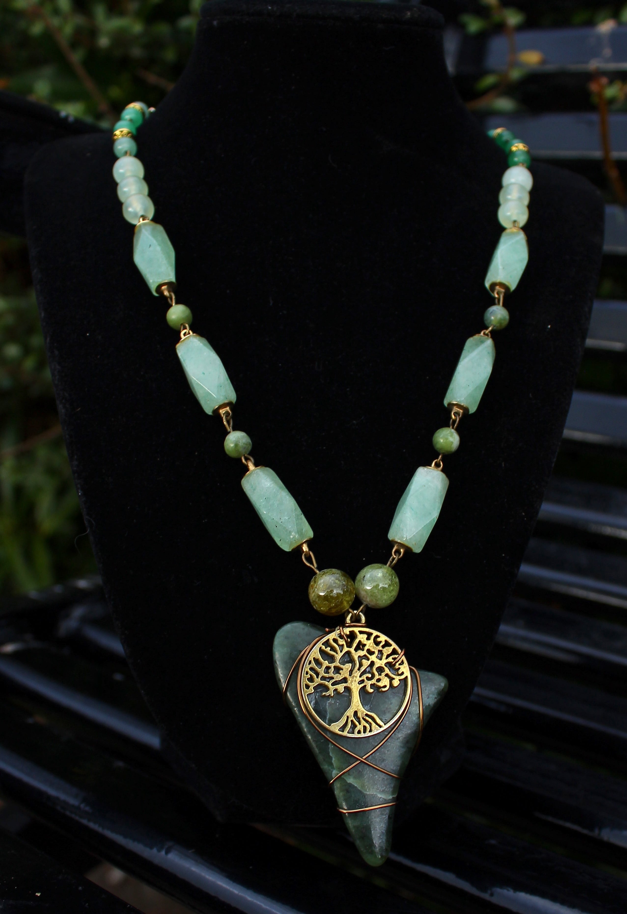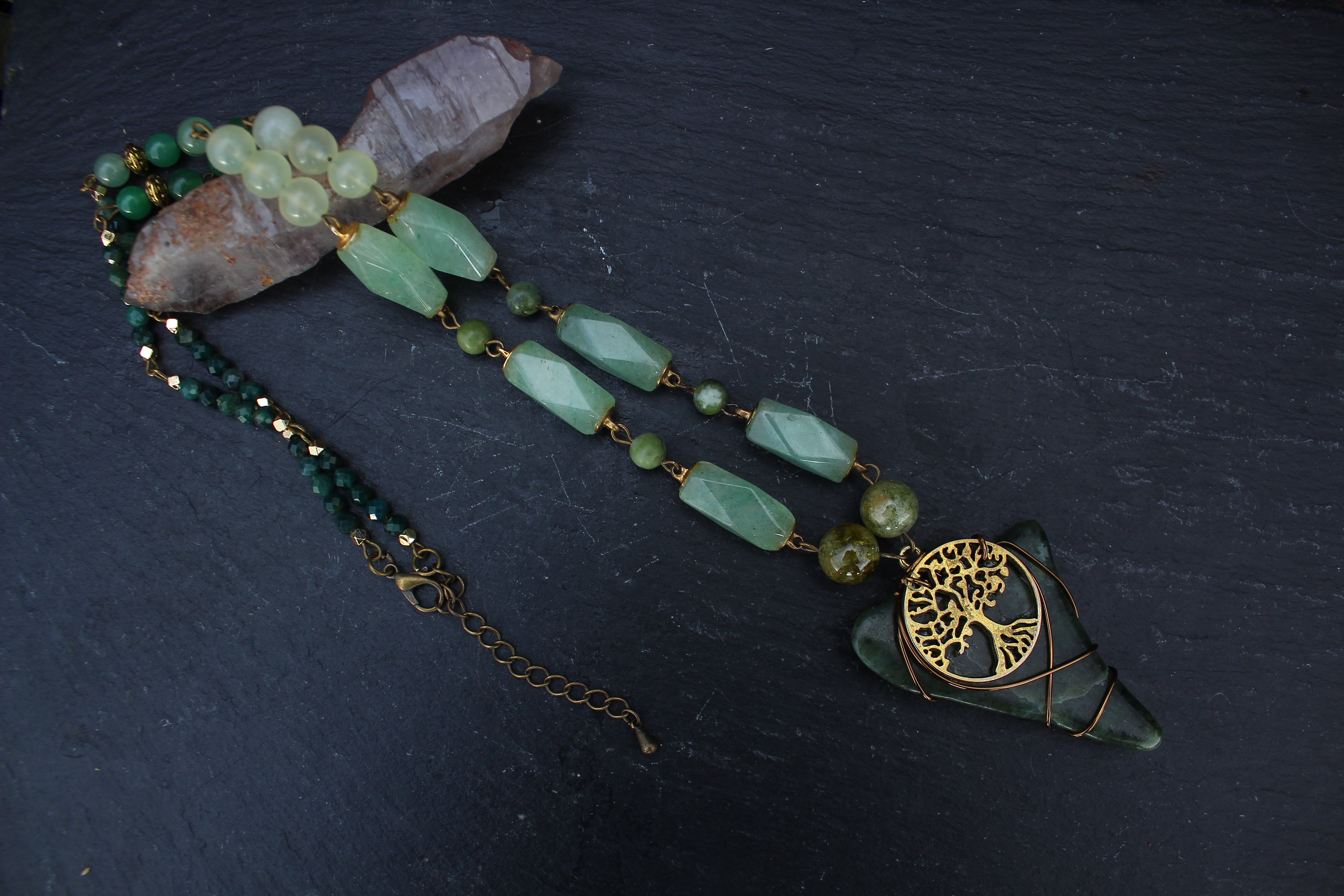 アンティークゴールドとツリー・オブ・ライフのパーツで装飾されたワイオミングジェイドに、10ミリのツァボライト、20x10ミリのネフライトジェイド、6ミリのジェイド、8ミリのニュージェイド、6ミリのアベンチュリン、4ミリのカッティングのモスアゲートを組ませました。