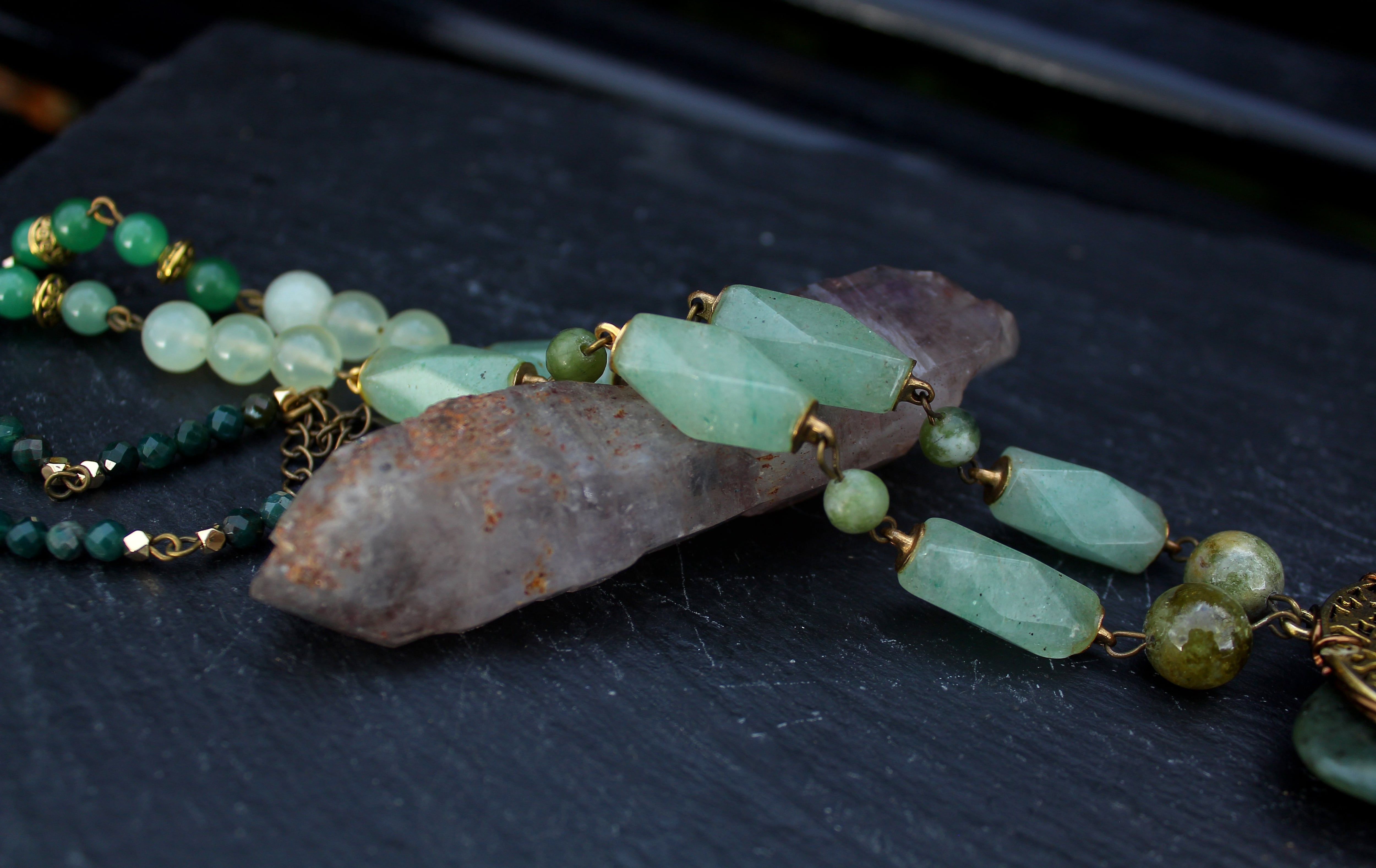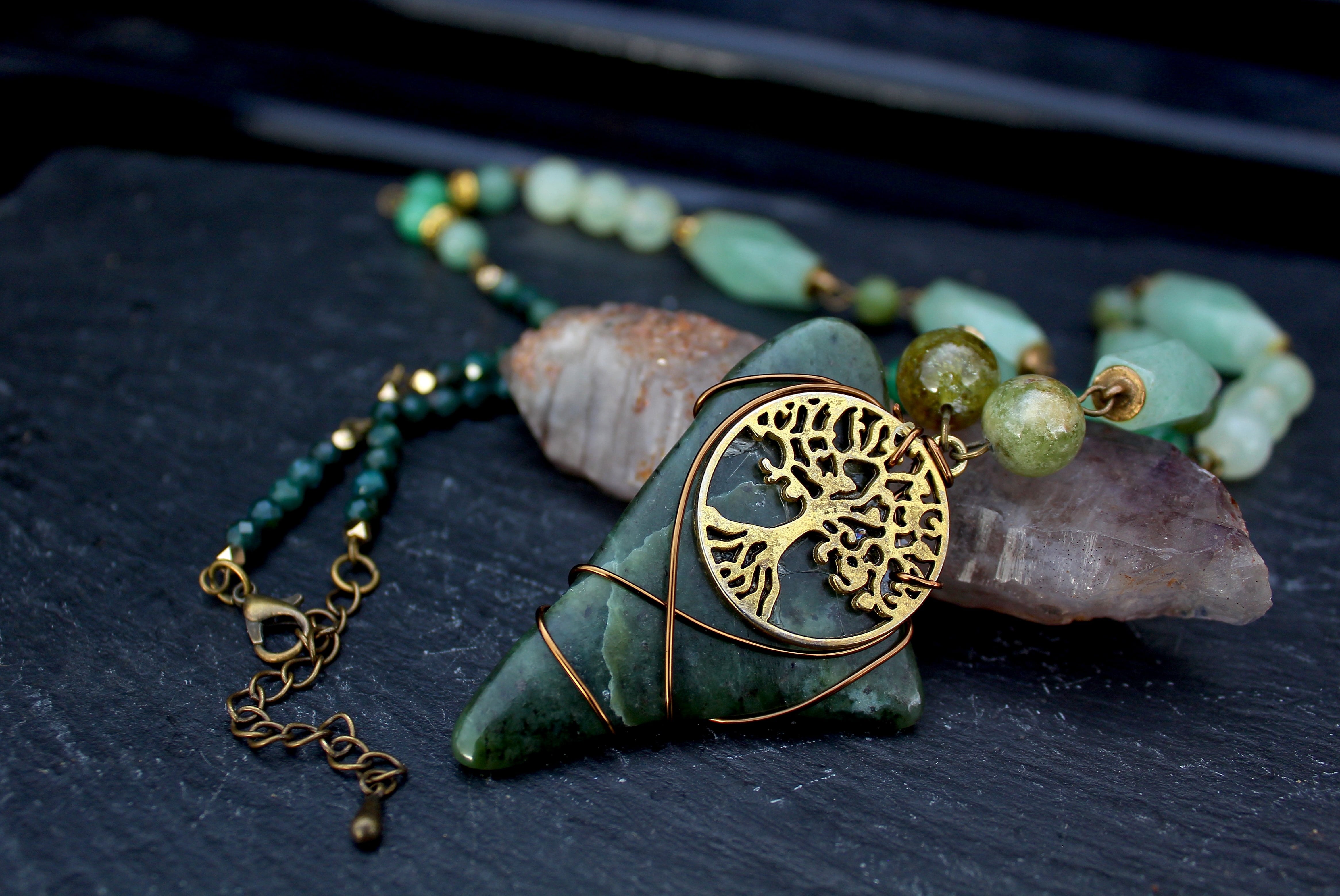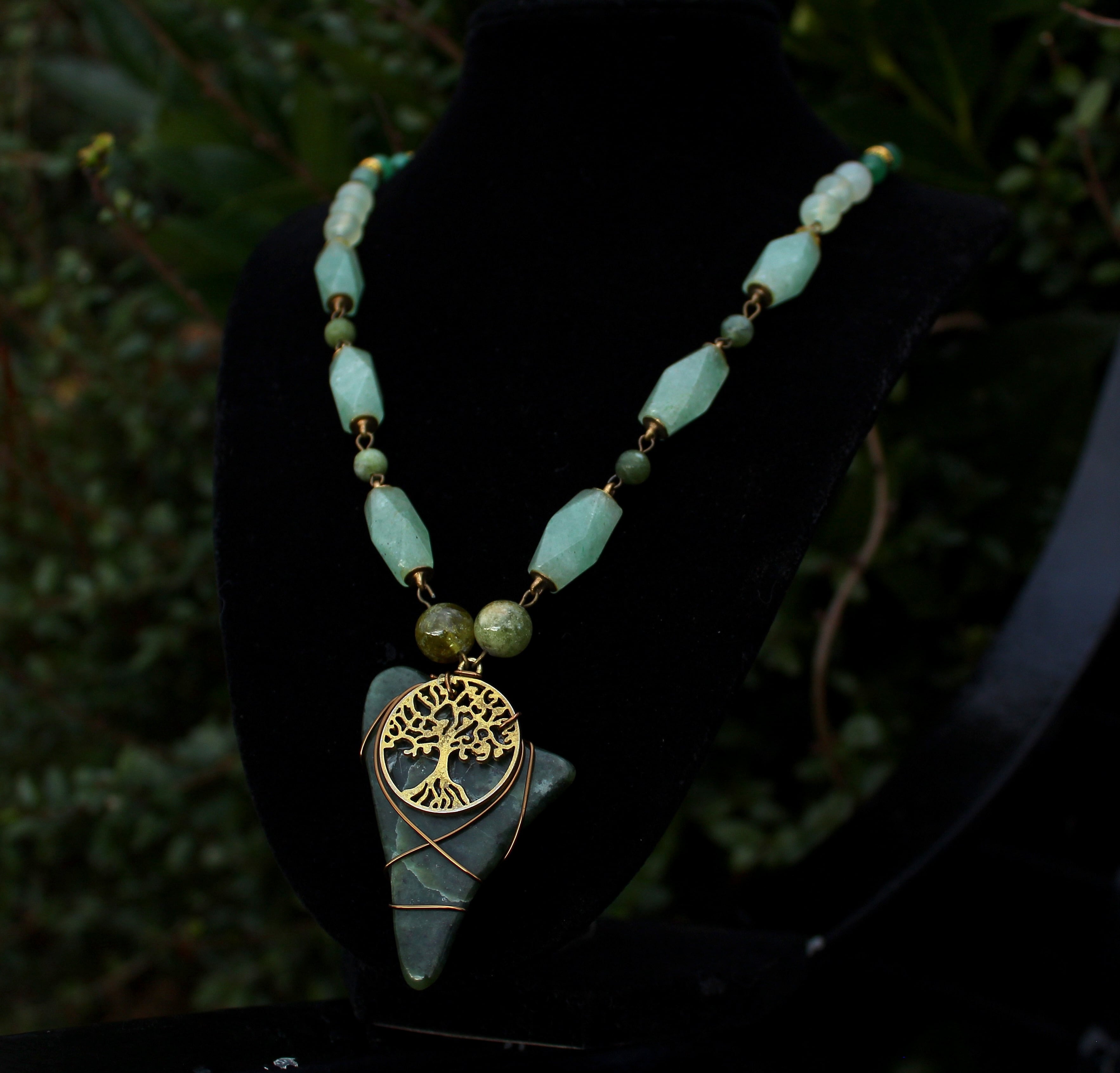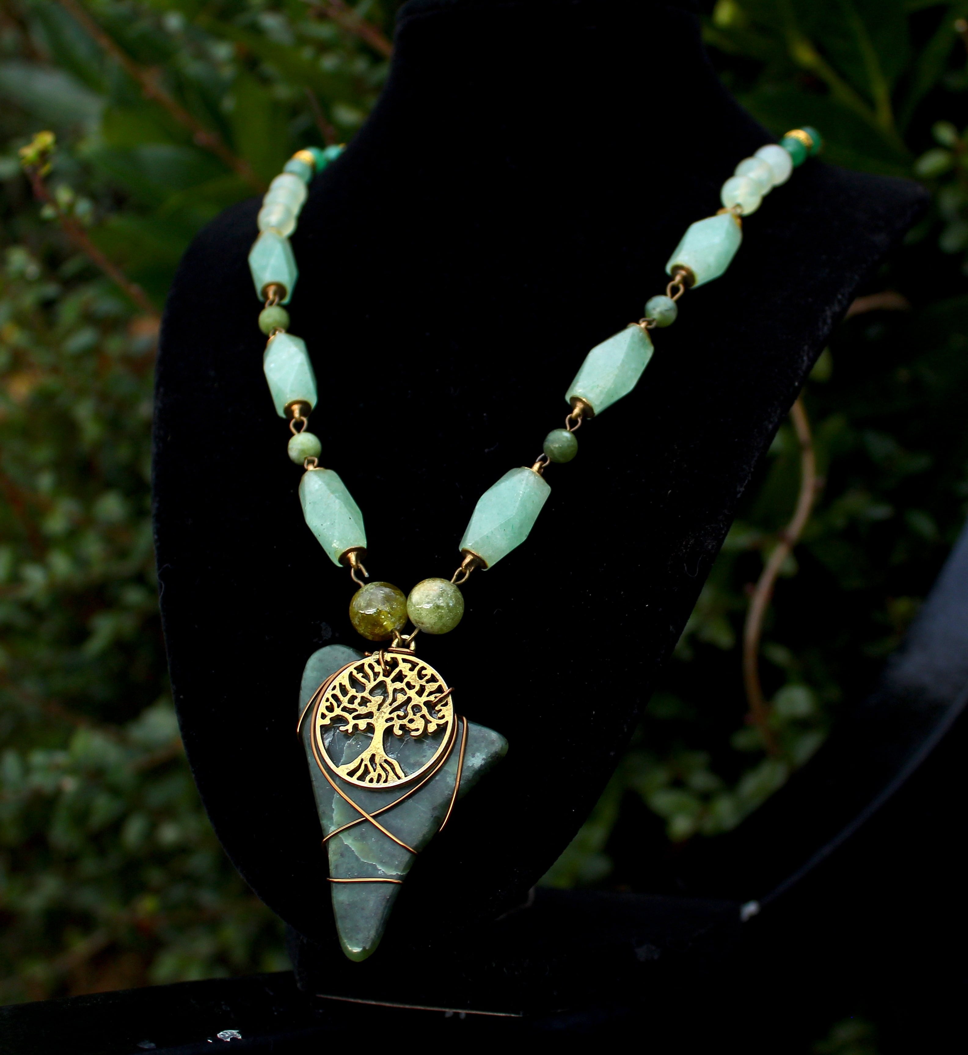 アンティークゴールドとツリー・オブ・ライフのパーツで装飾されたワイオミングジェイドに、10ミリのツァボライト、20x10ミリのネフライトジェイド、6ミリのジェイド、8ミリのニュージェイド、6ミリのアベンチュリン、4ミリのカッティングのモスアゲートを組ませました。