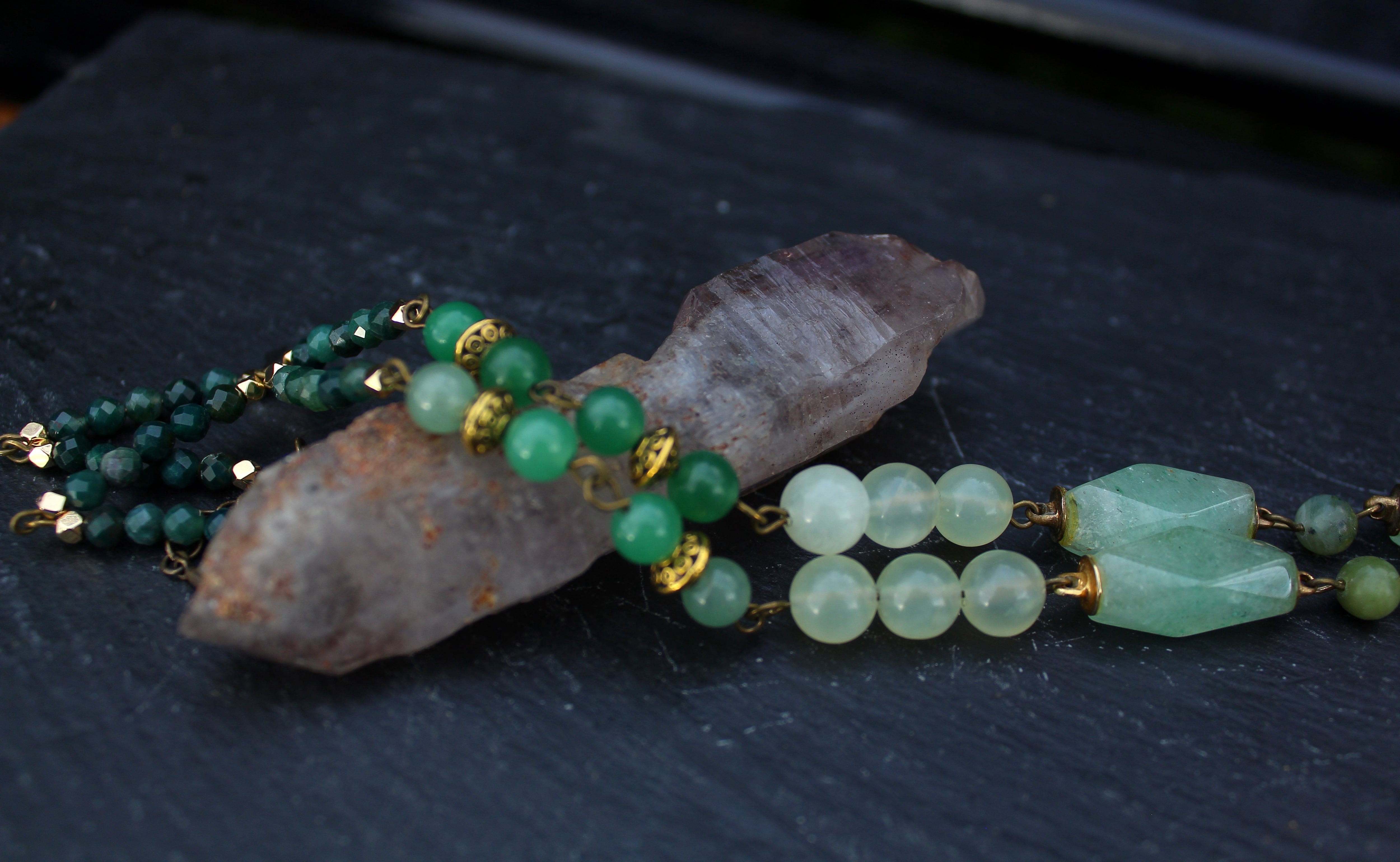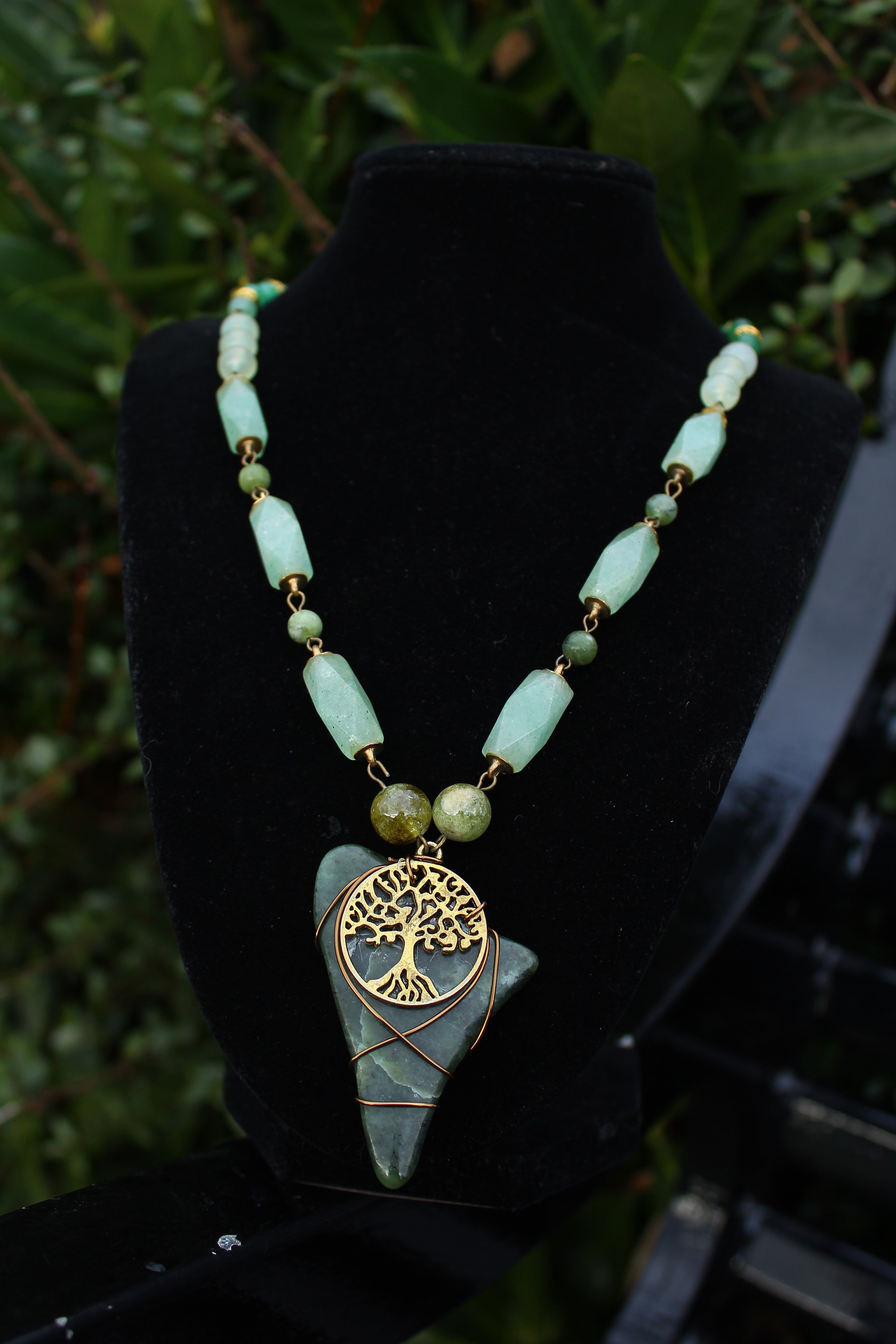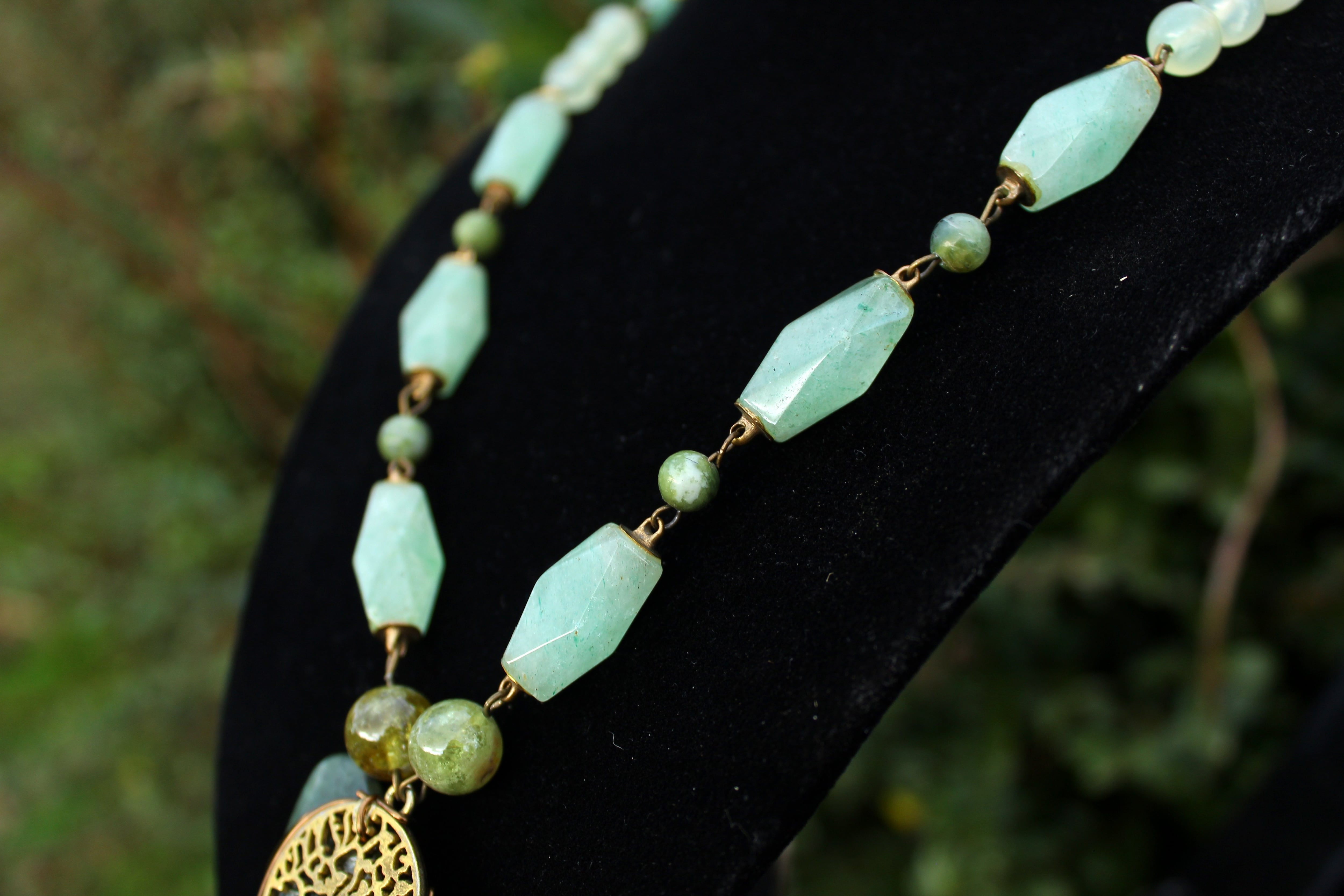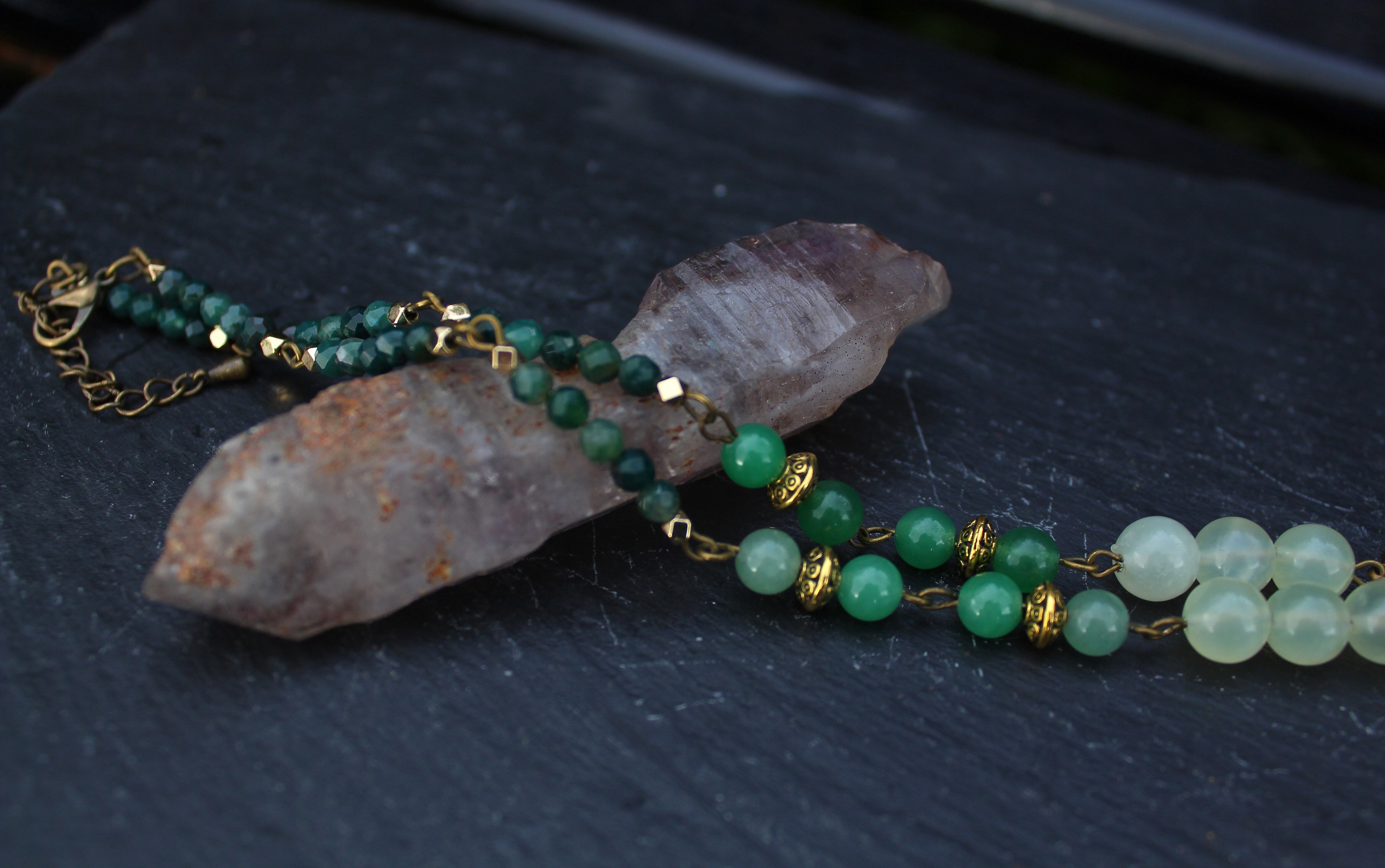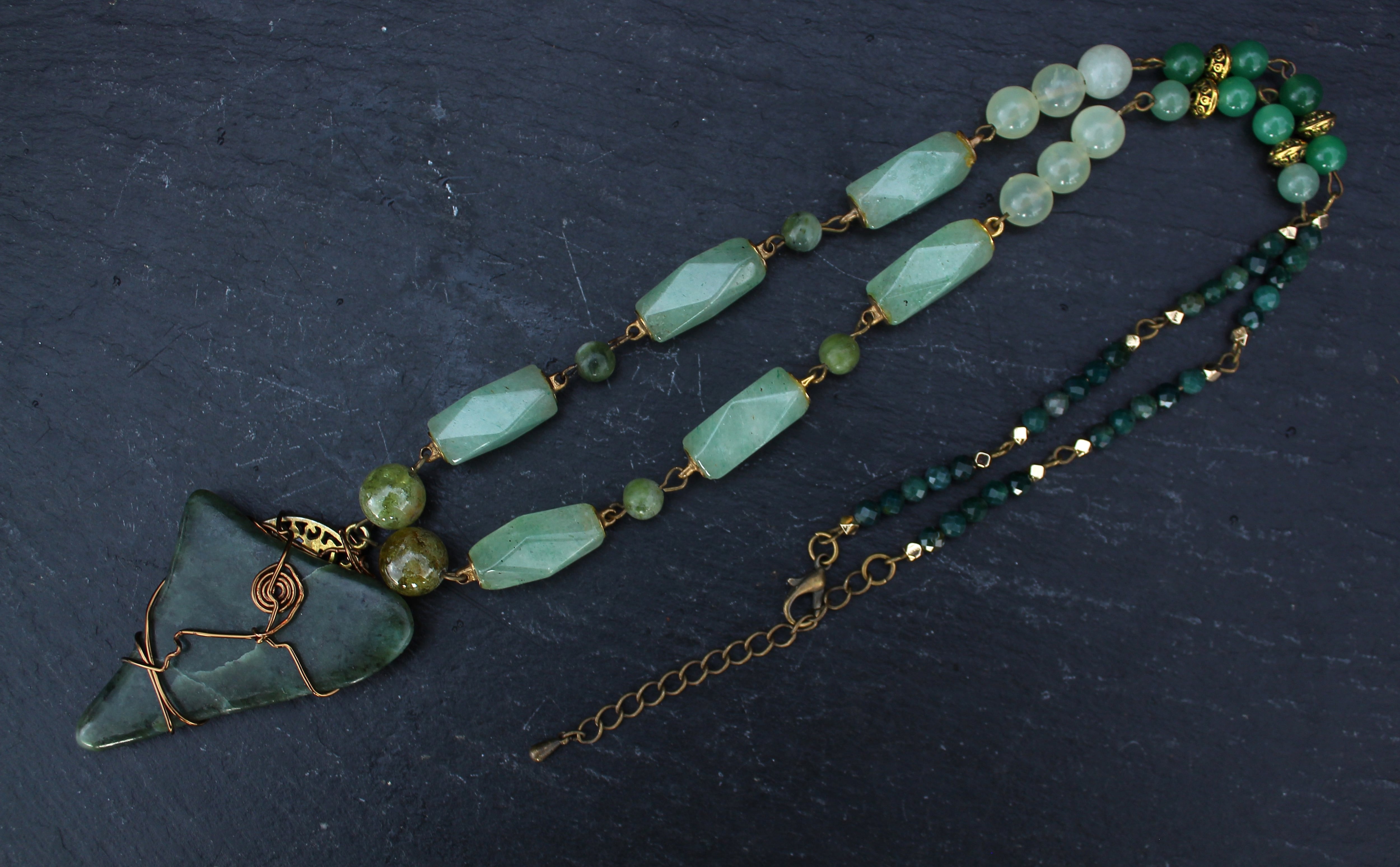 アンティークゴールドとツリー・オブ・ライフのパーツで装飾されたワイオミングジェイドに、10ミリのツァボライト、20x10ミリのネフライトジェイド、6ミリのジェイド、8ミリのニュージェイド、6ミリのアベンチュリン、4ミリのカッティングのモスアゲートを組ませました。