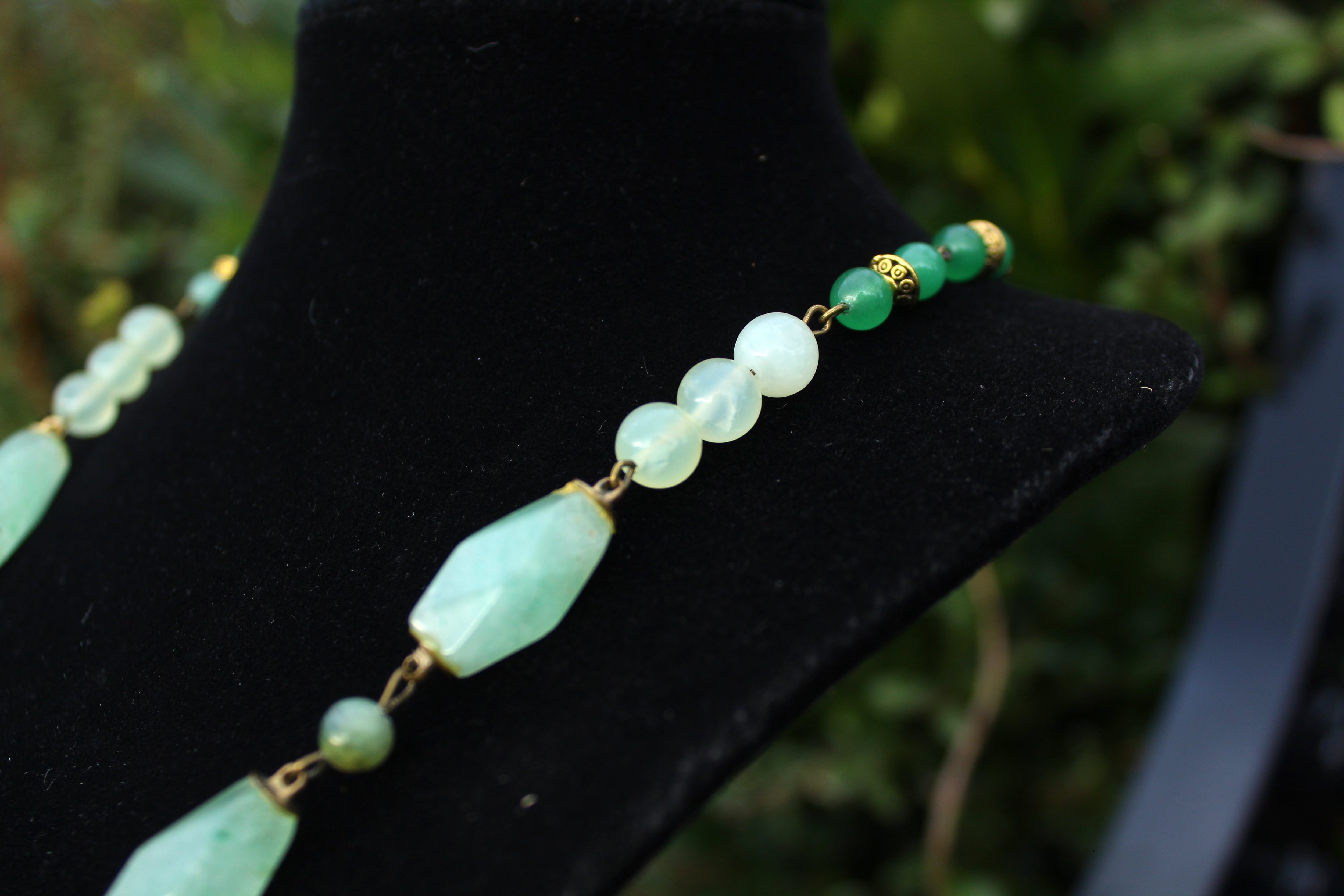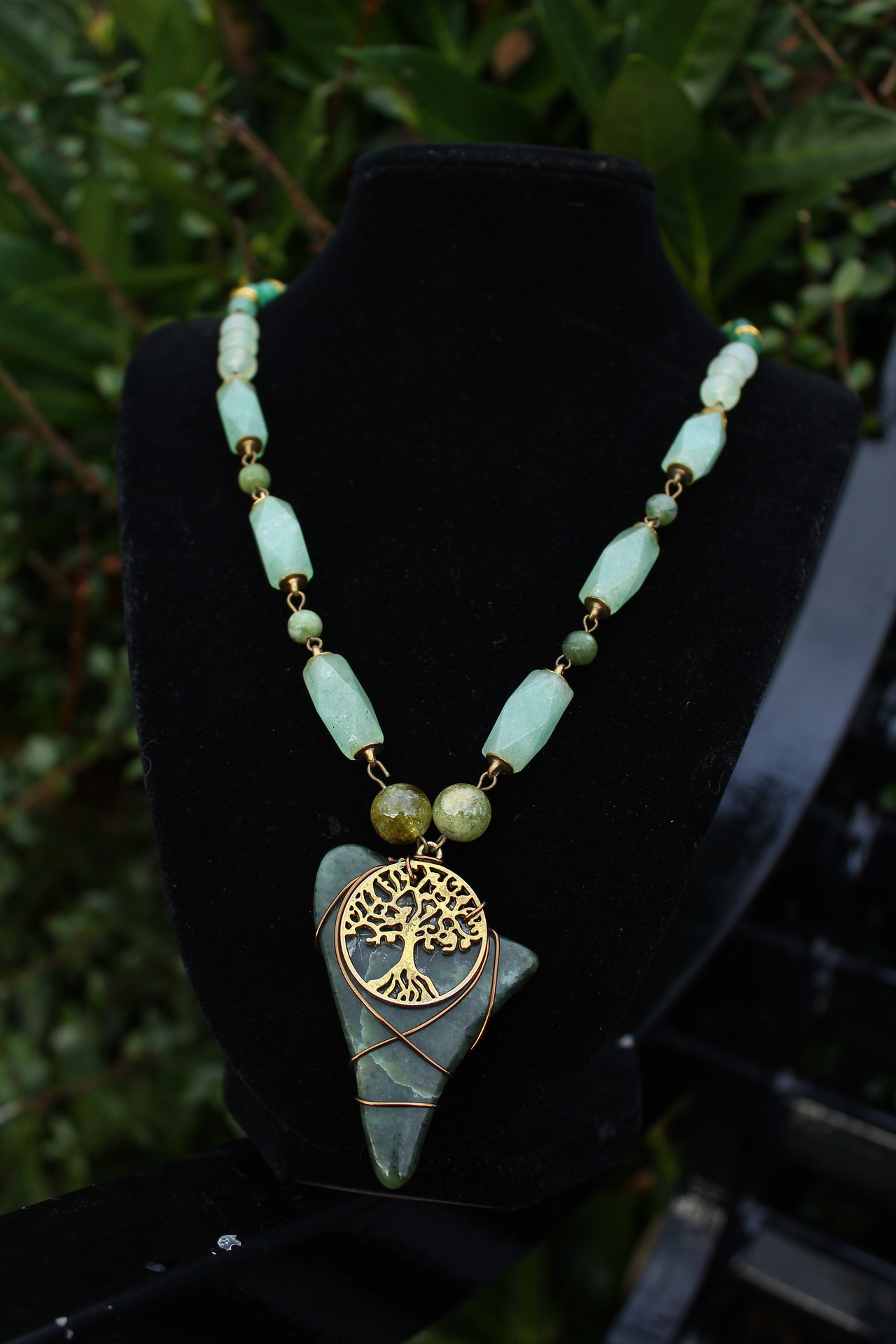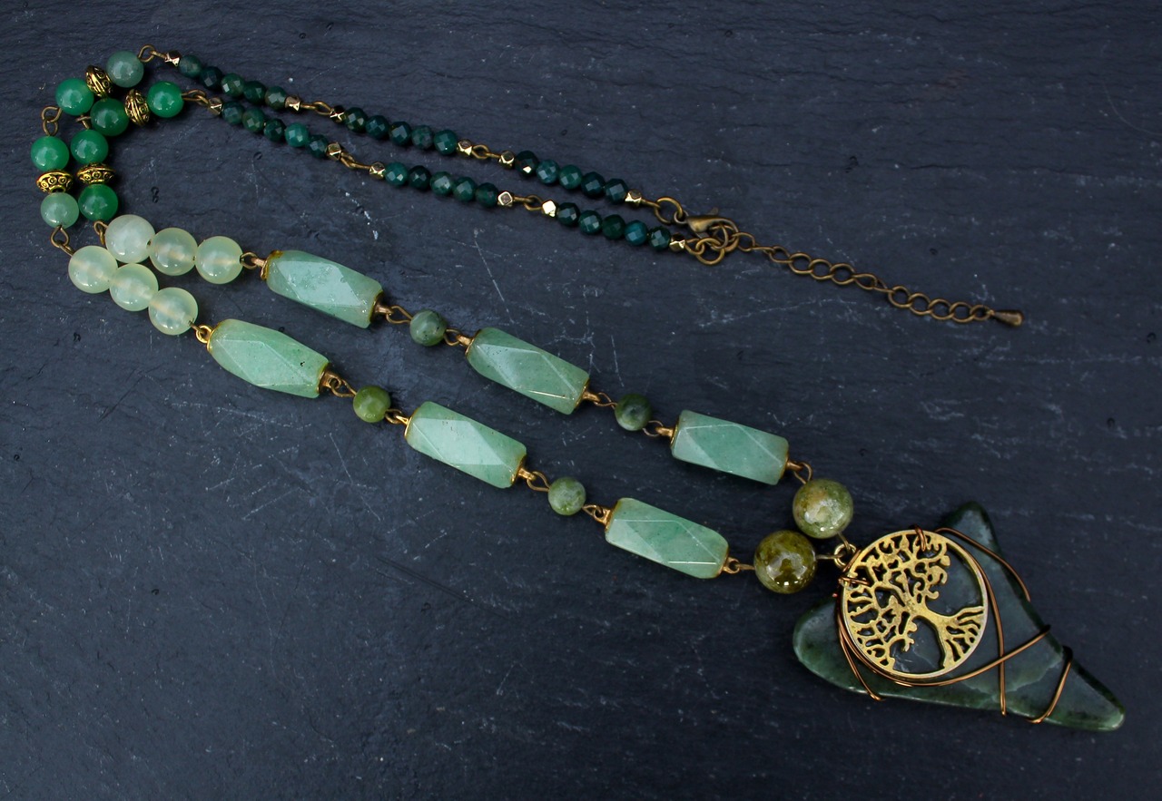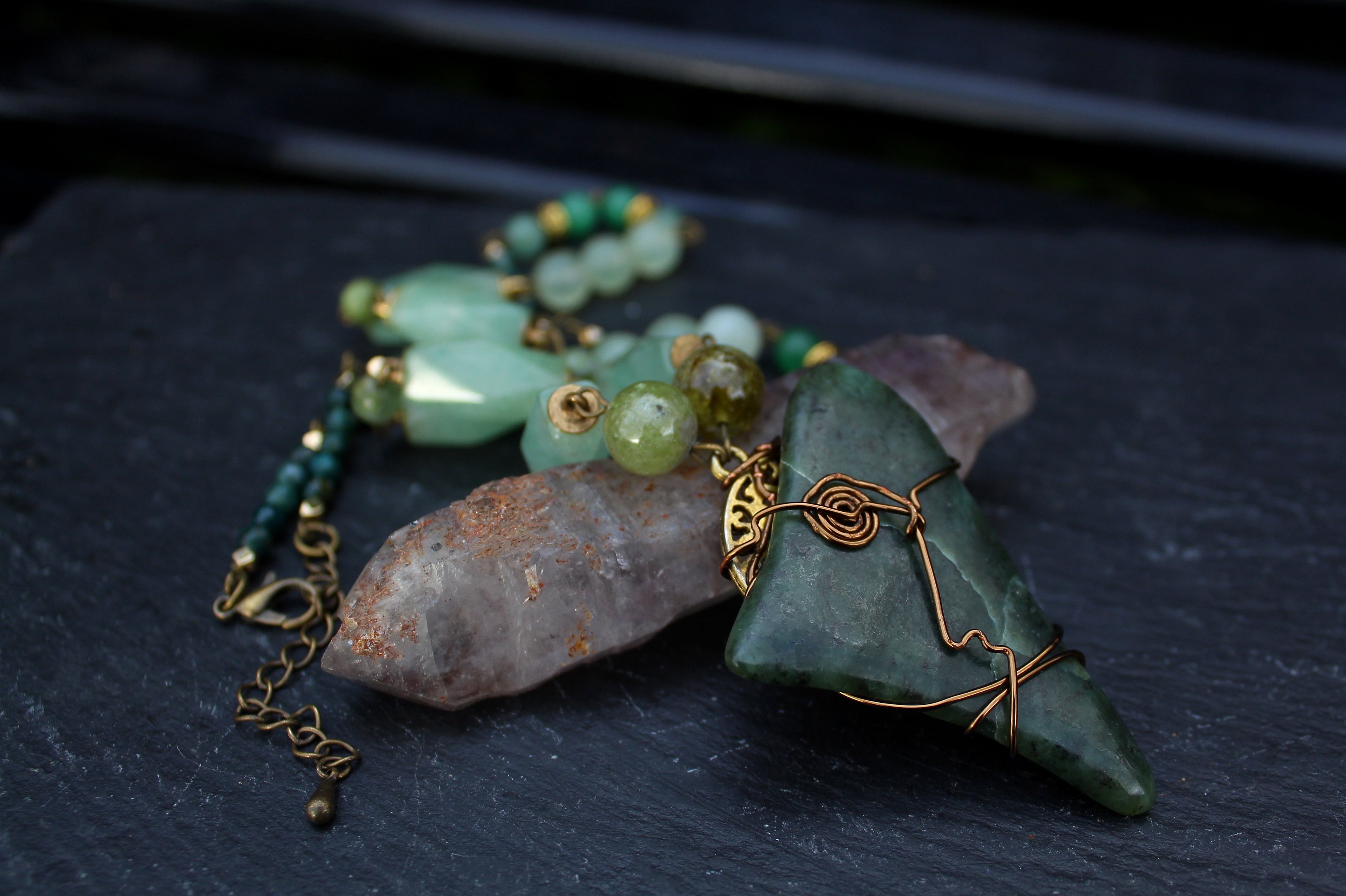 アンティークゴールドとツリー・オブ・ライフのパーツで装飾されたワイオミングジェイドに、10ミリのツァボライト、20x10ミリのネフライトジェイド、6ミリのジェイド、8ミリのニュージェイド、6ミリのアベンチュリン、4ミリのカッティングのモスアゲートを組ませました。
