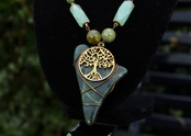 深みのある色合いの、貴重なワイオミングジェイドのポリッシュです。アンティークゴールドのワイヤーで巻いて、自然のシンボルであるゴールドのツリー・オブ・ライフのパーツをつけました。