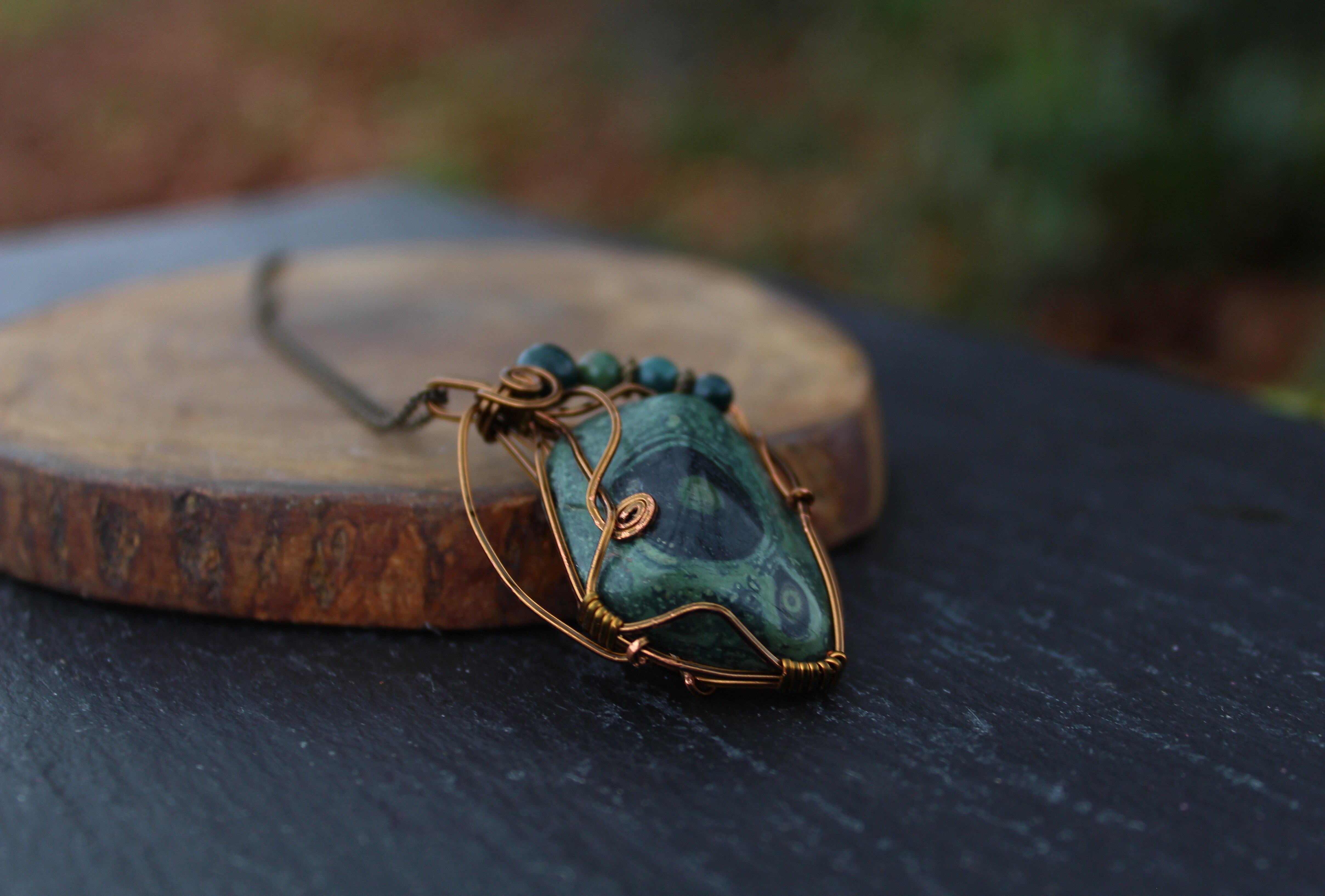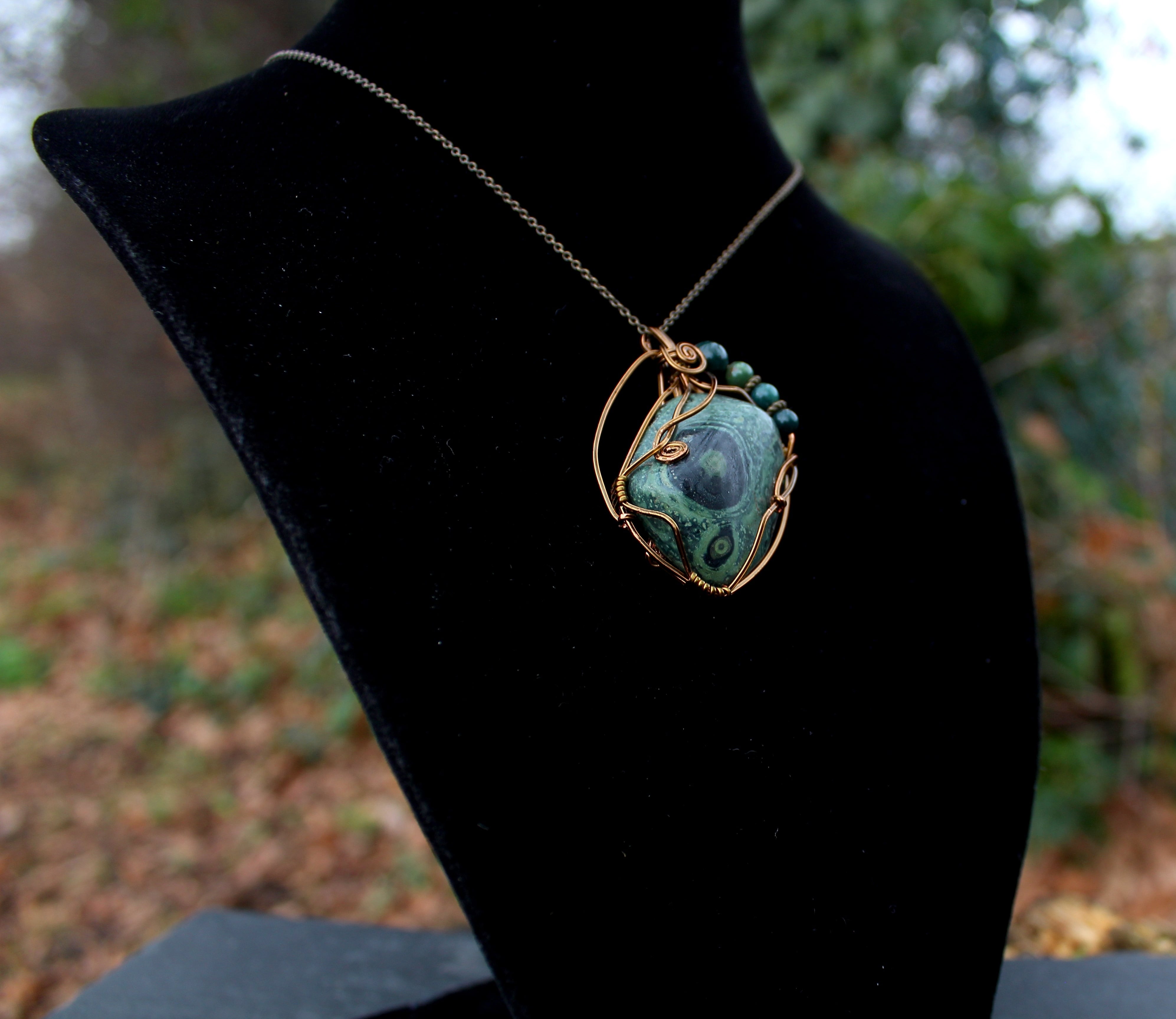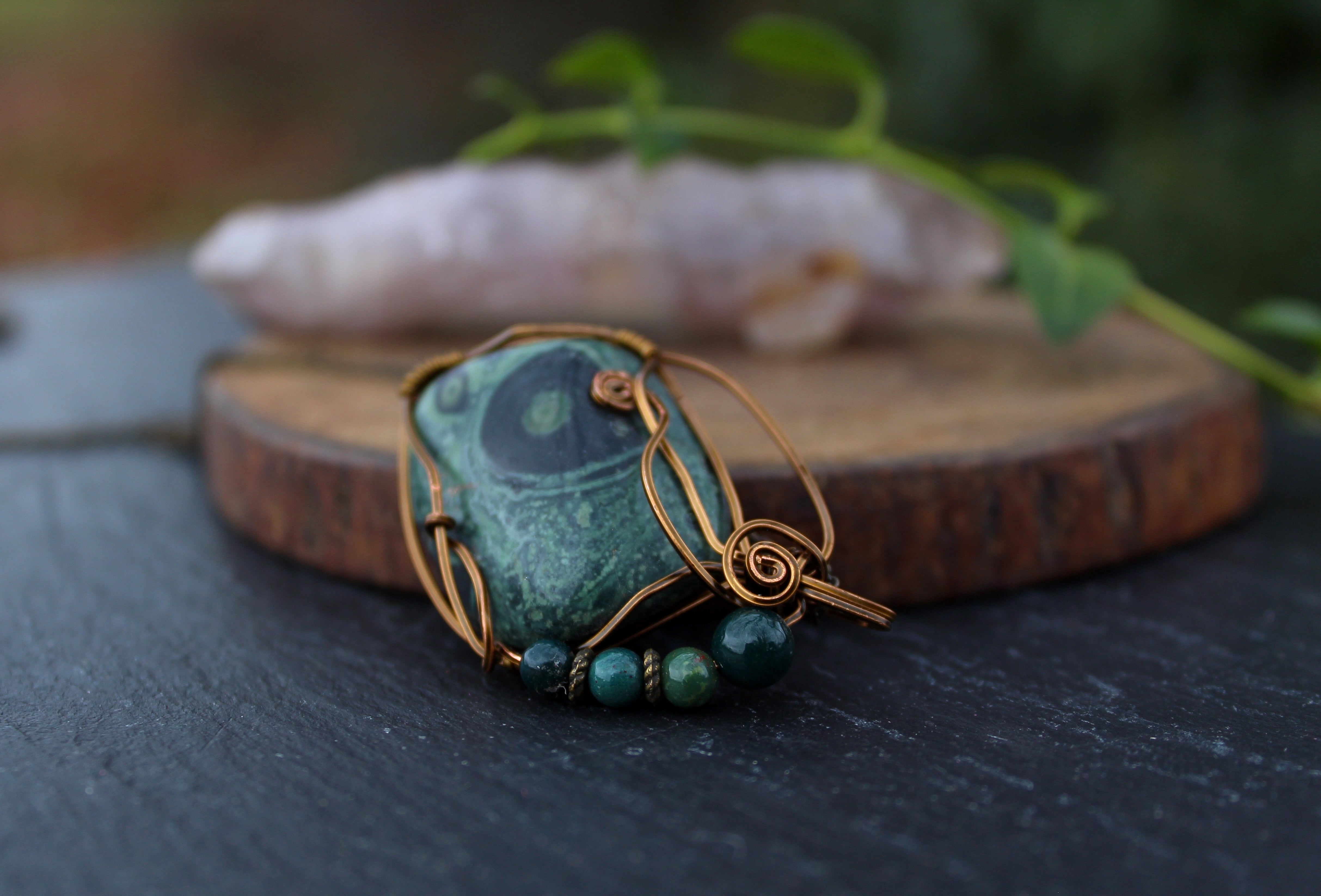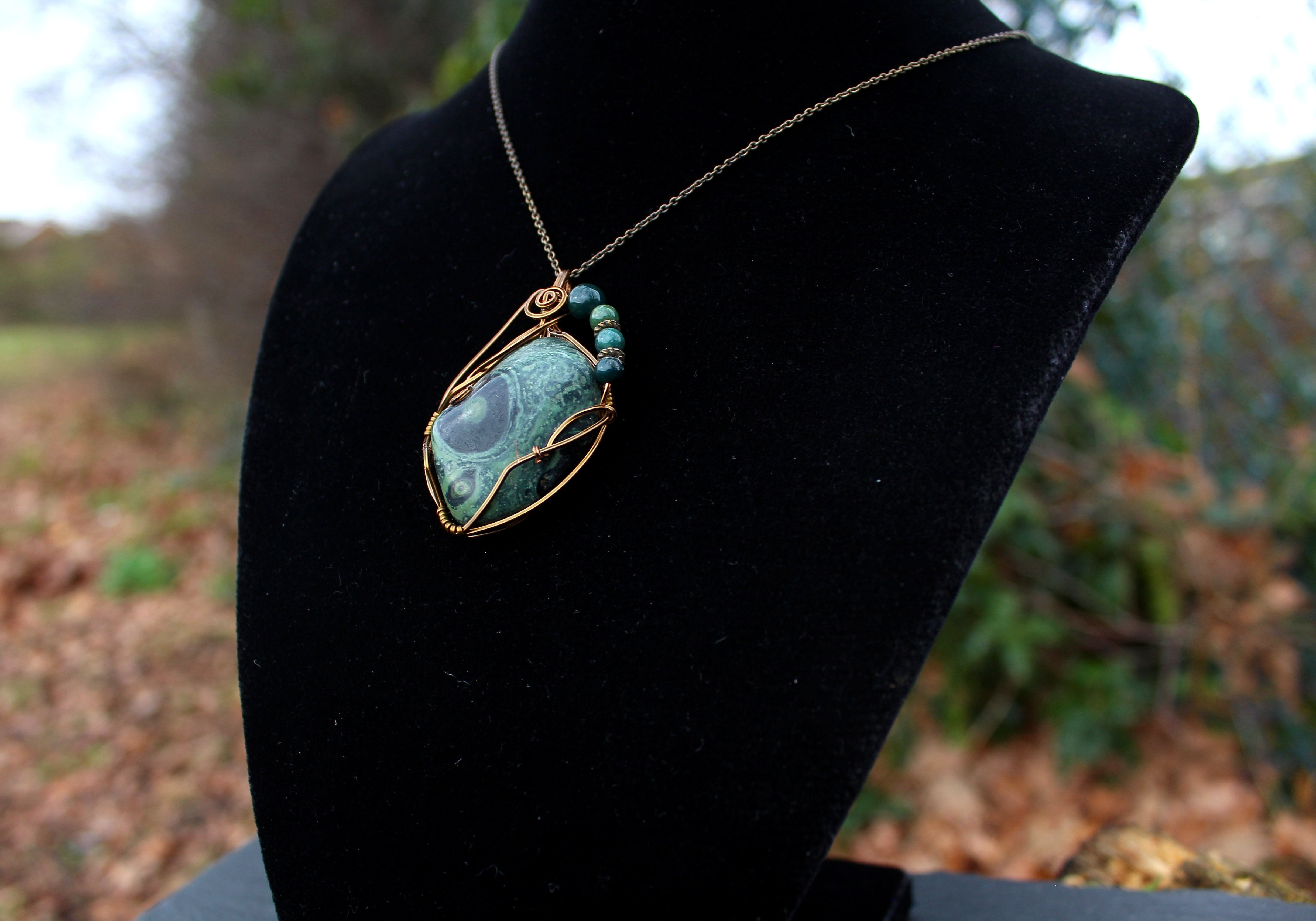 アンティークゴールドのワイヤーで巻いて、ブラッドストーンのビーズをあしらいました。