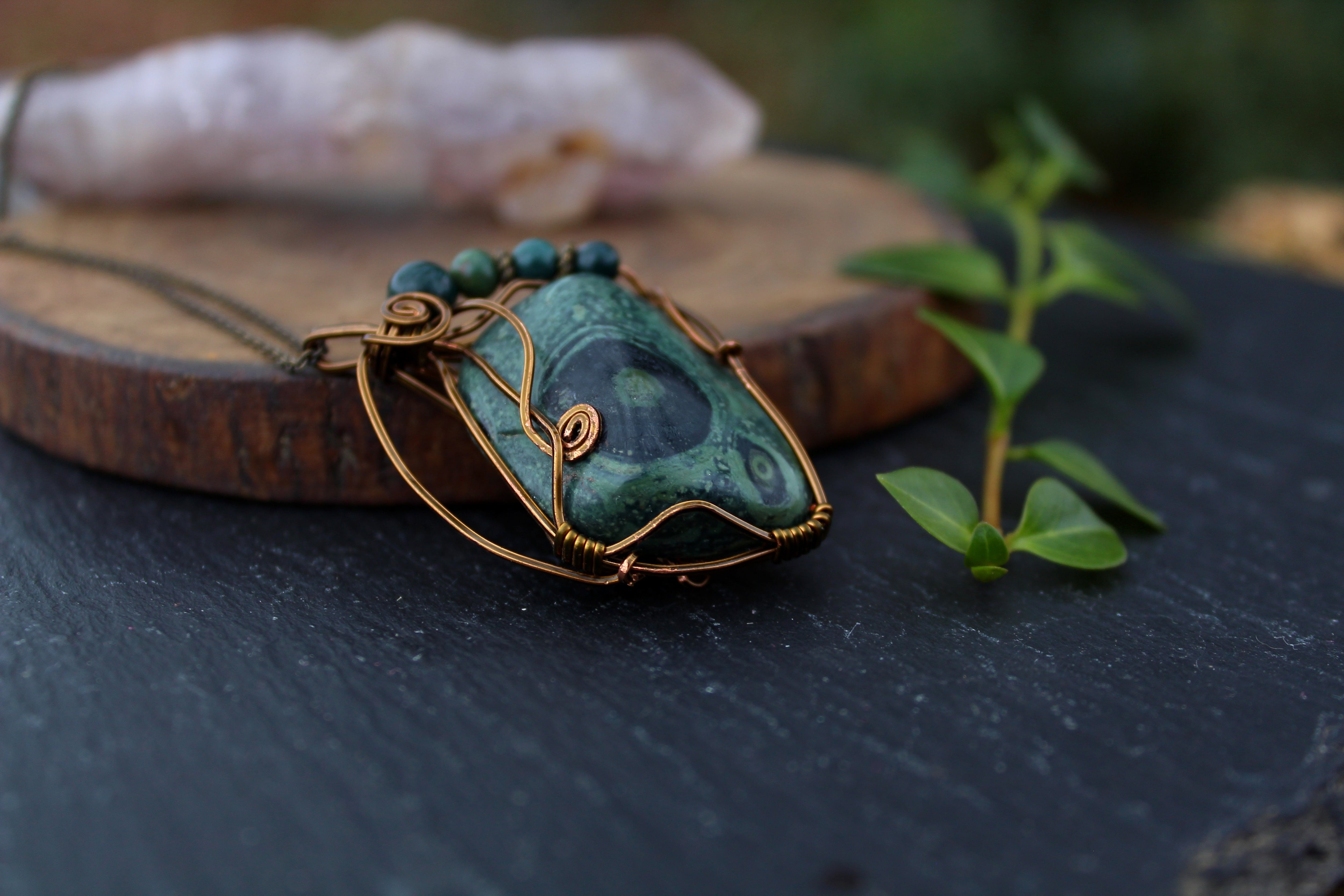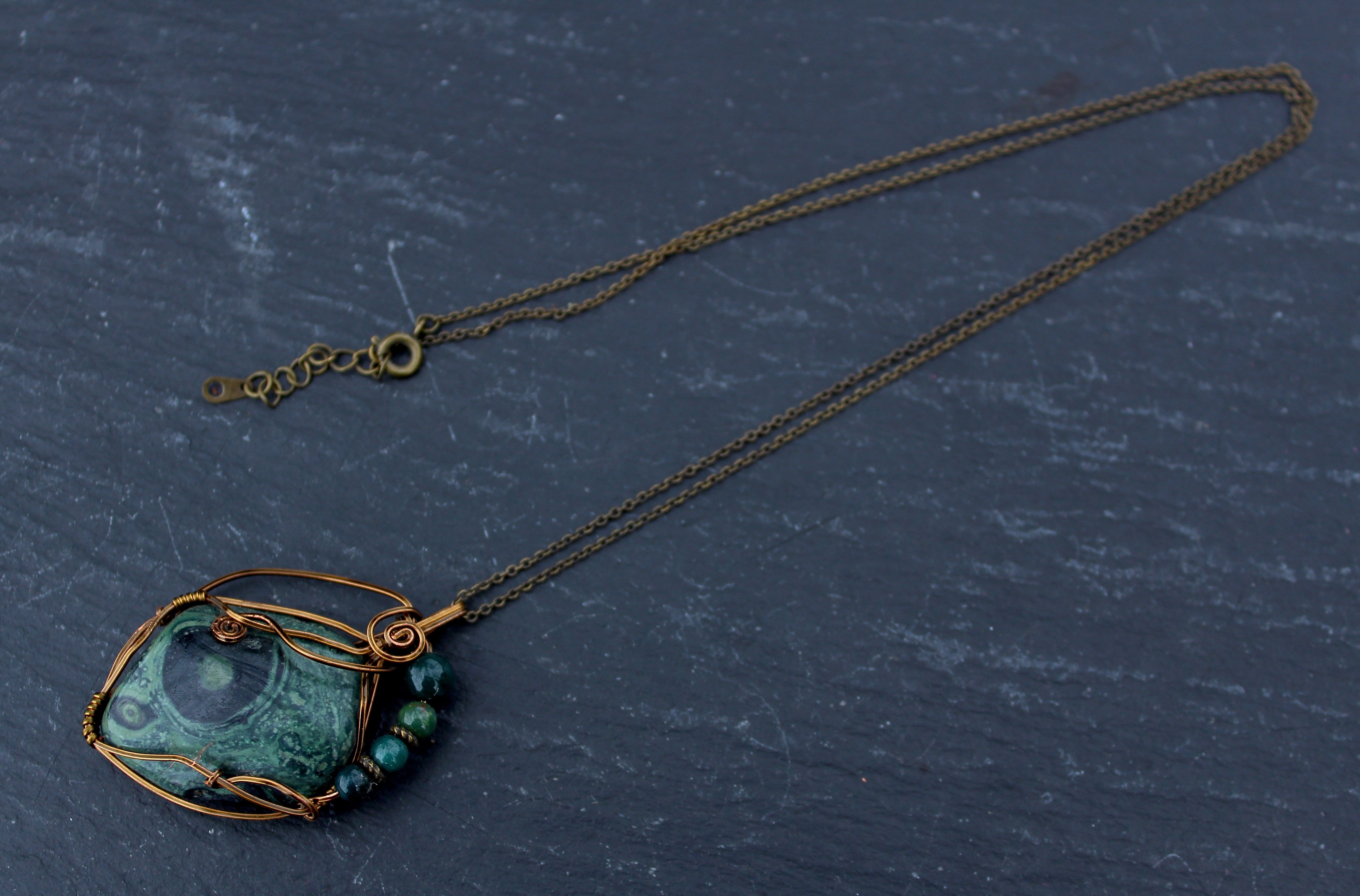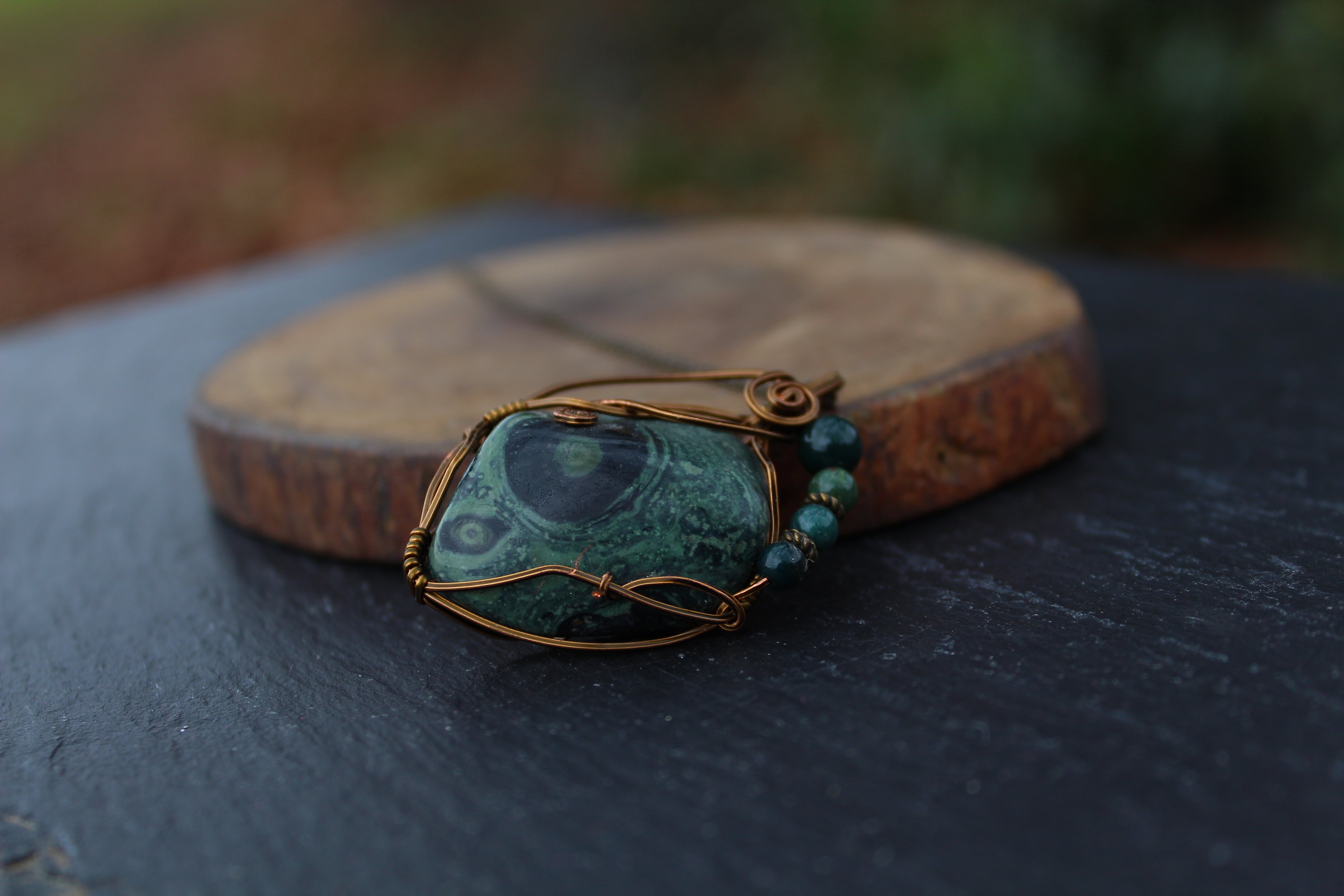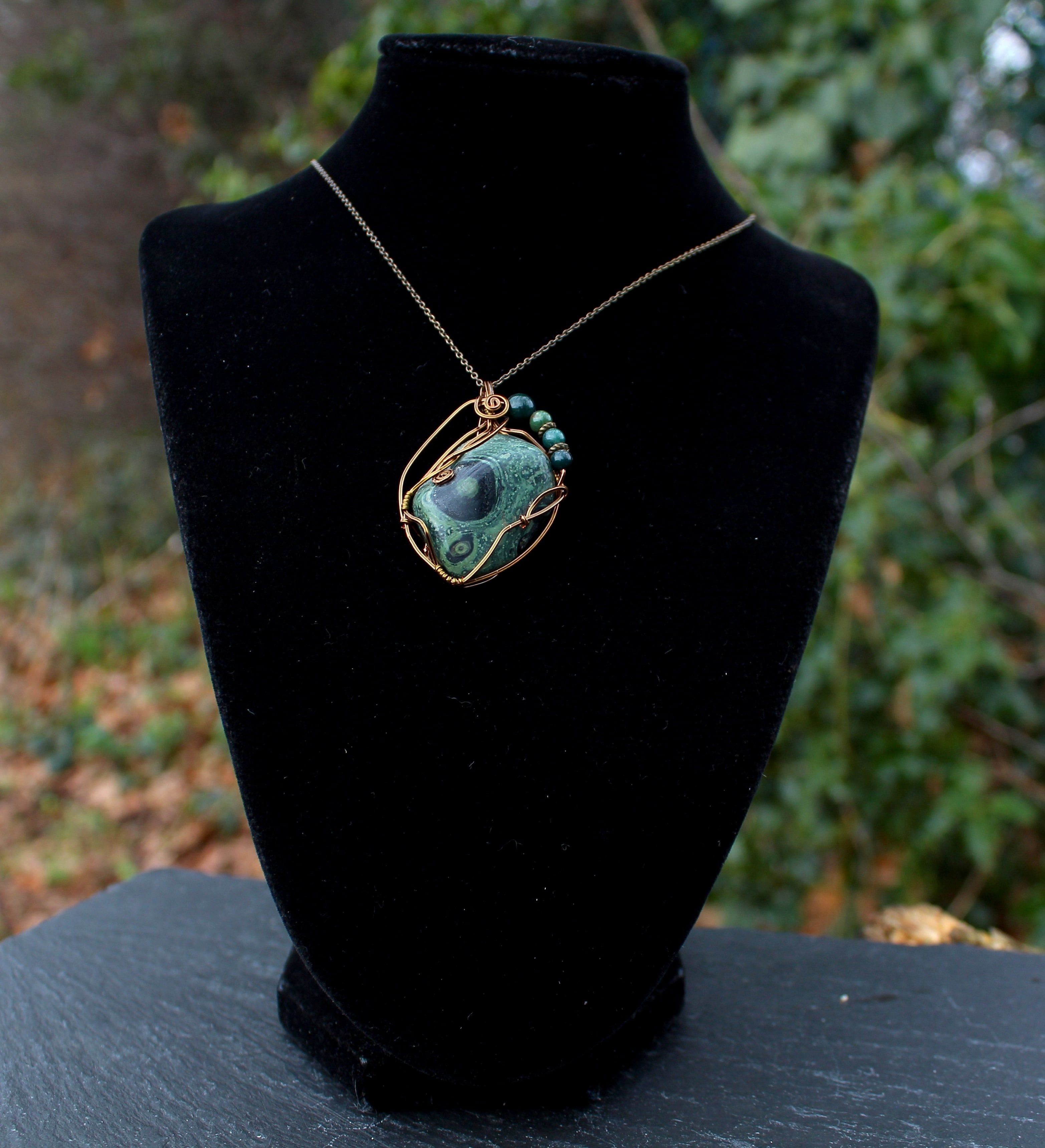アンティークゴールドのワイヤーで巻いて、ブラッドストーンのビーズをあしらいました。