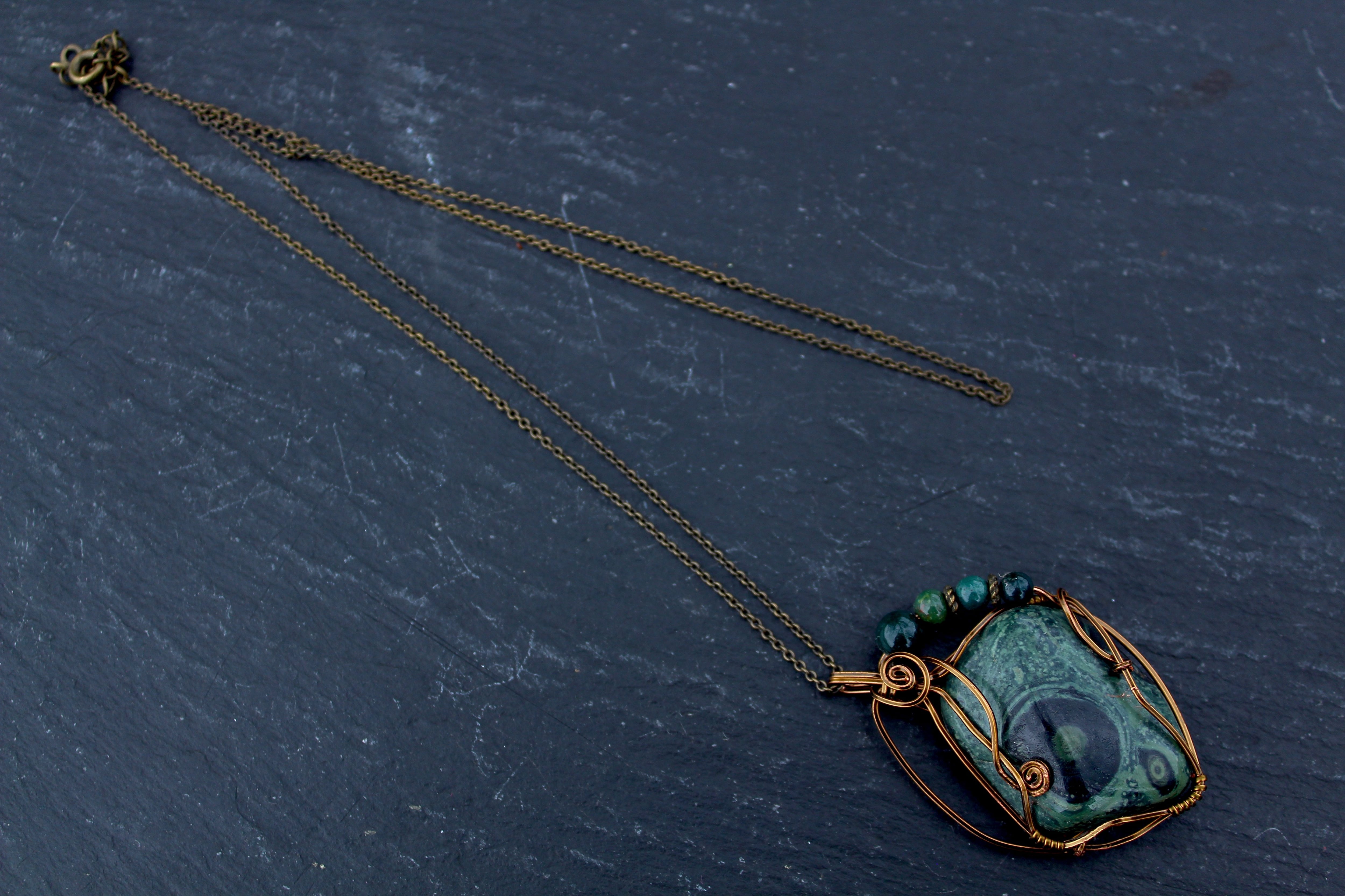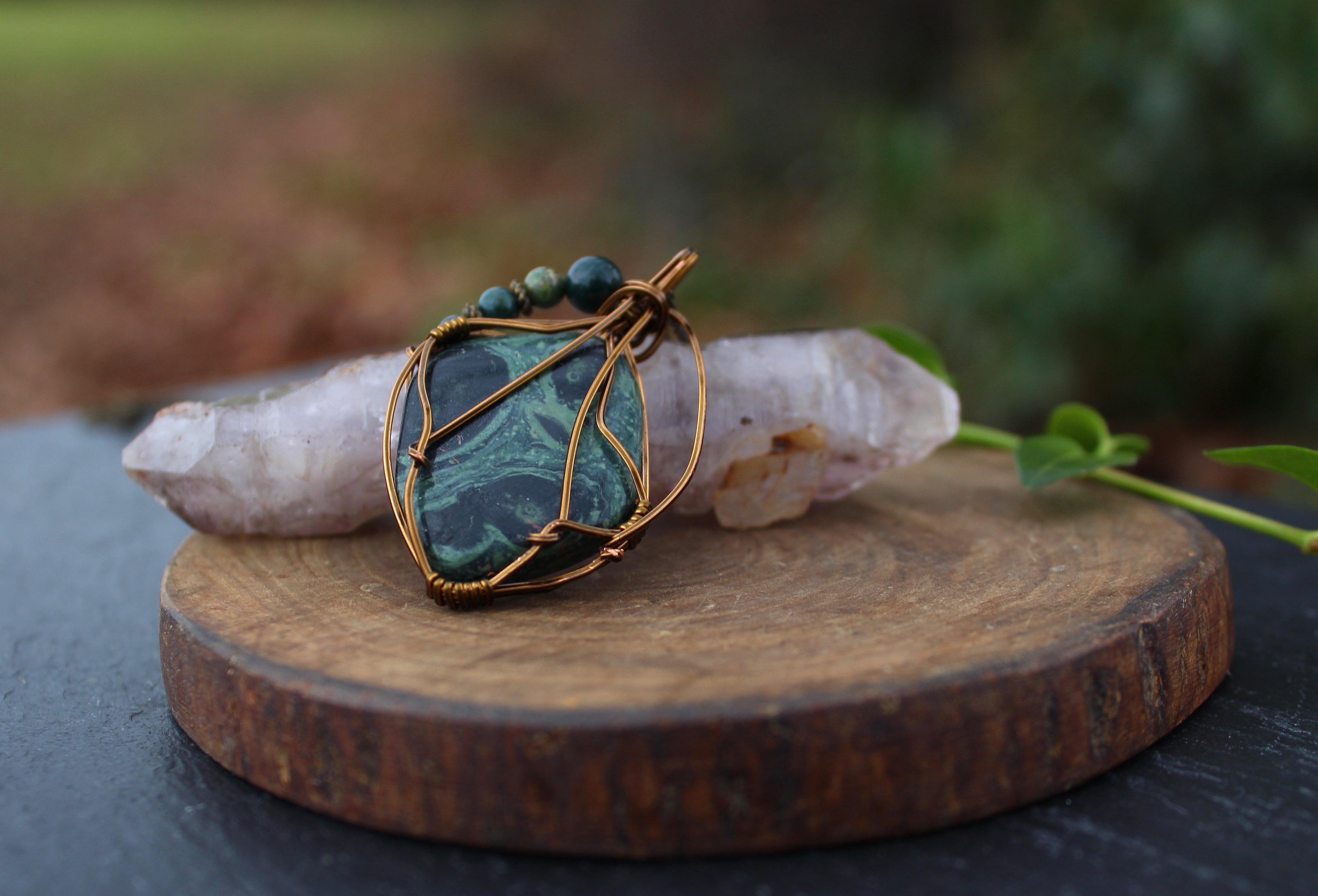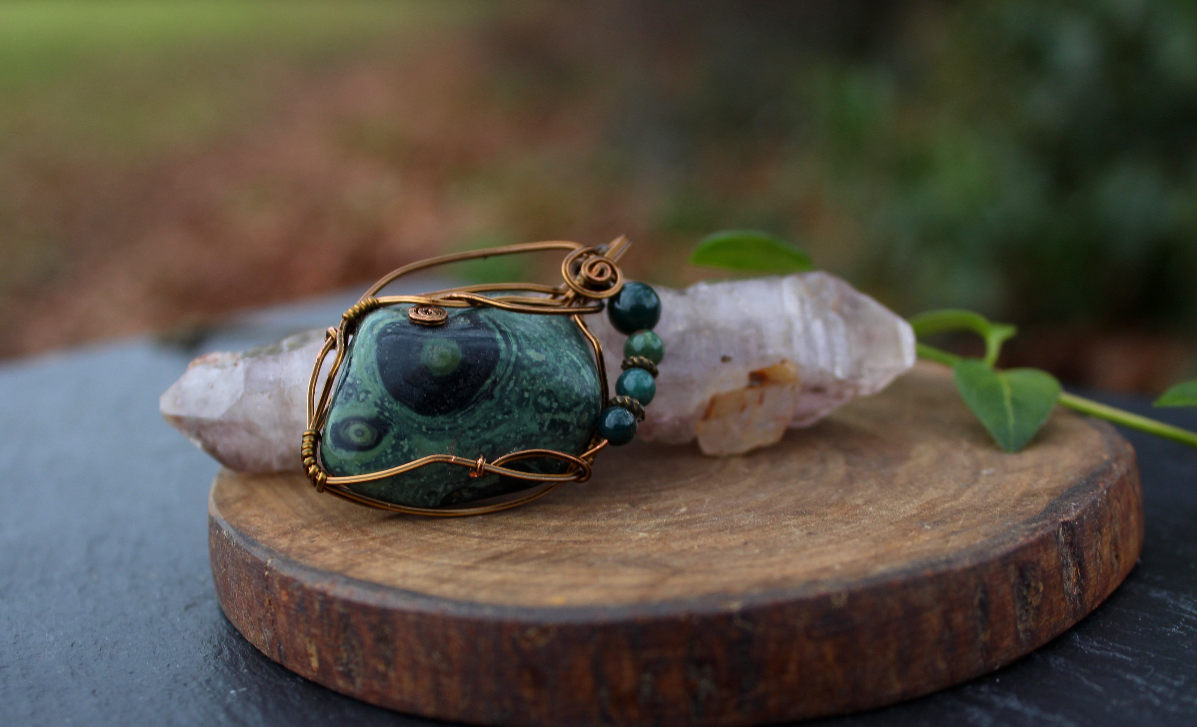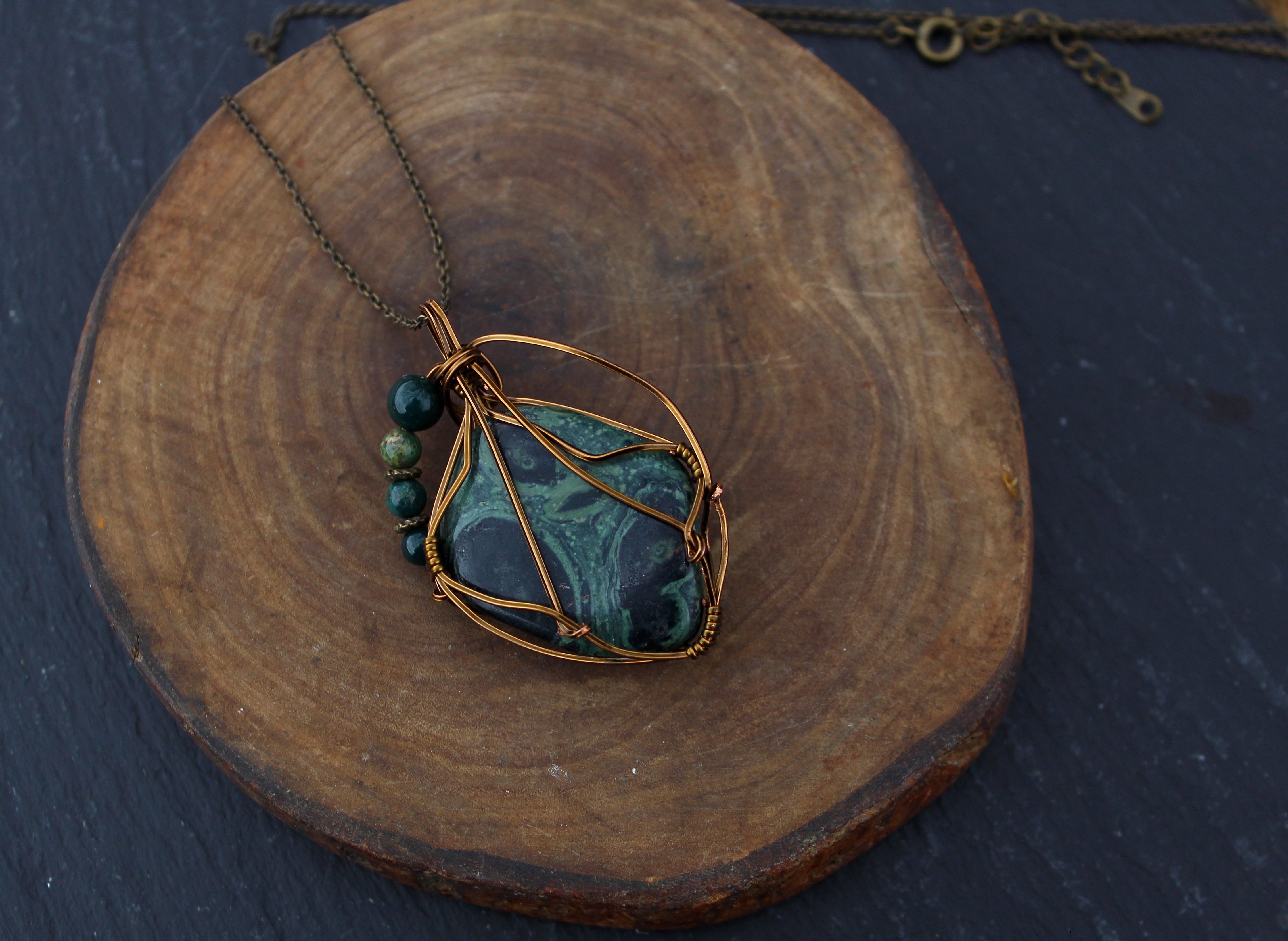 アンティークゴールドのワイヤーで巻いて、ブラッドストーンのビーズをあしらいました。