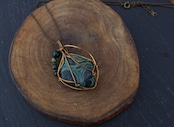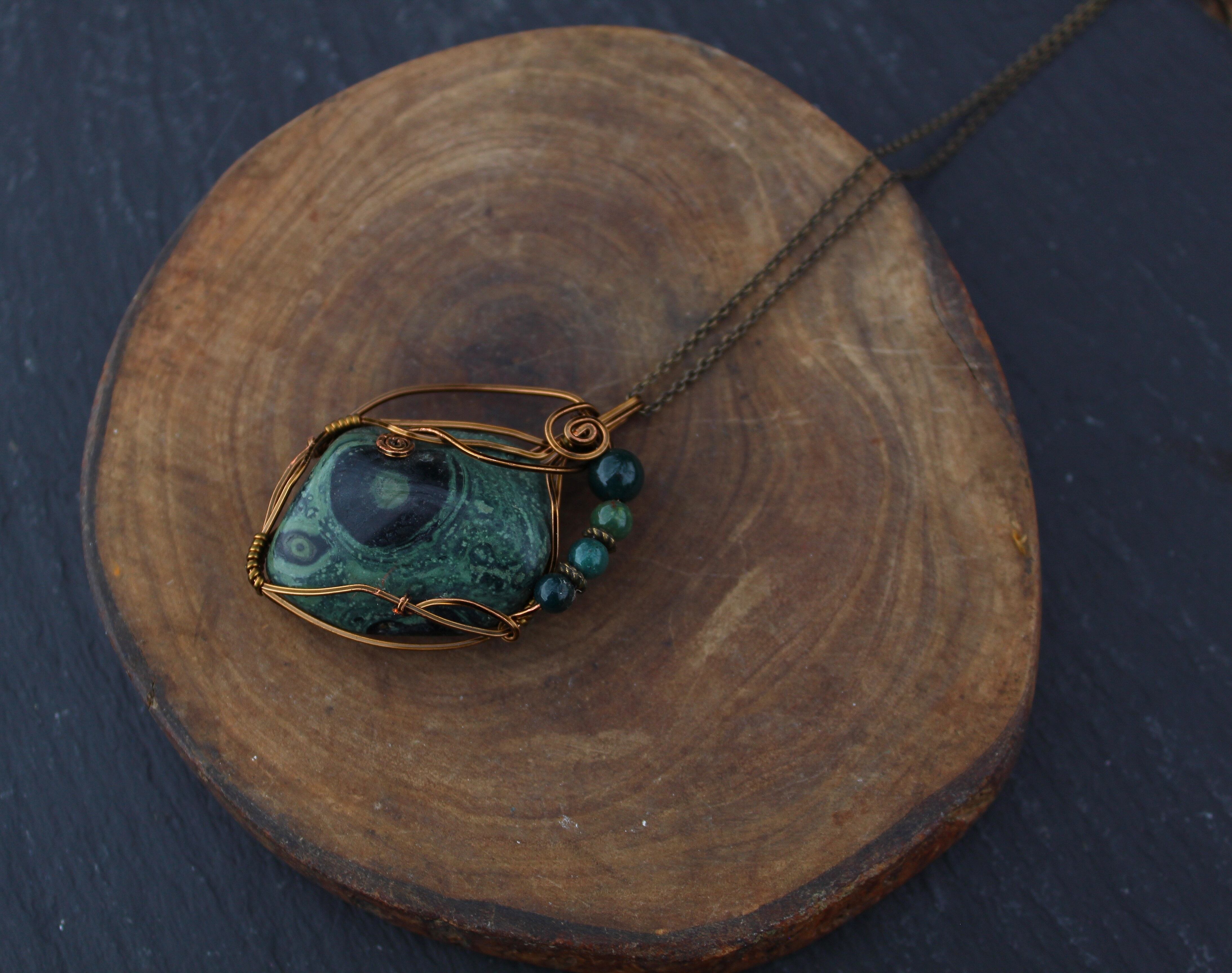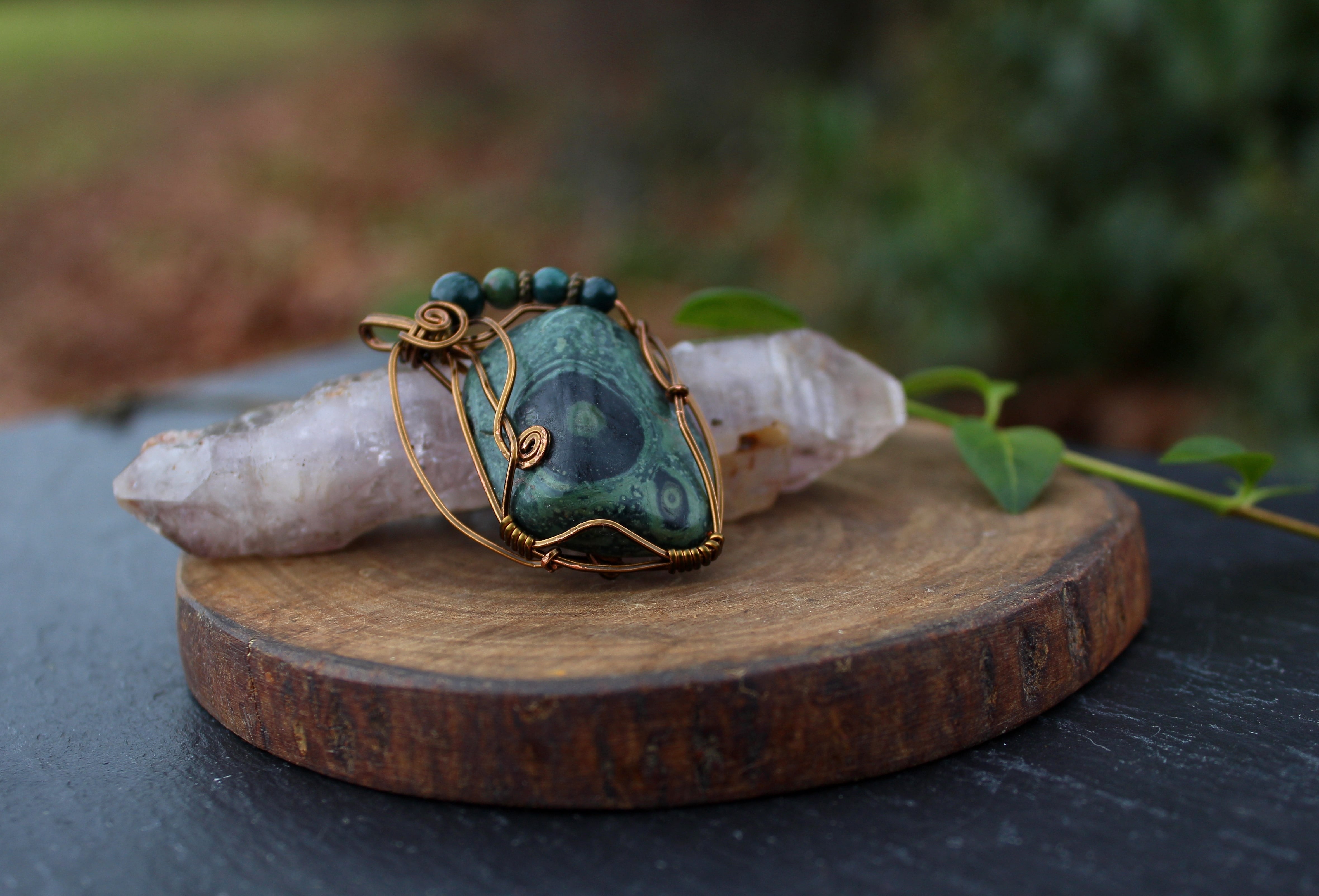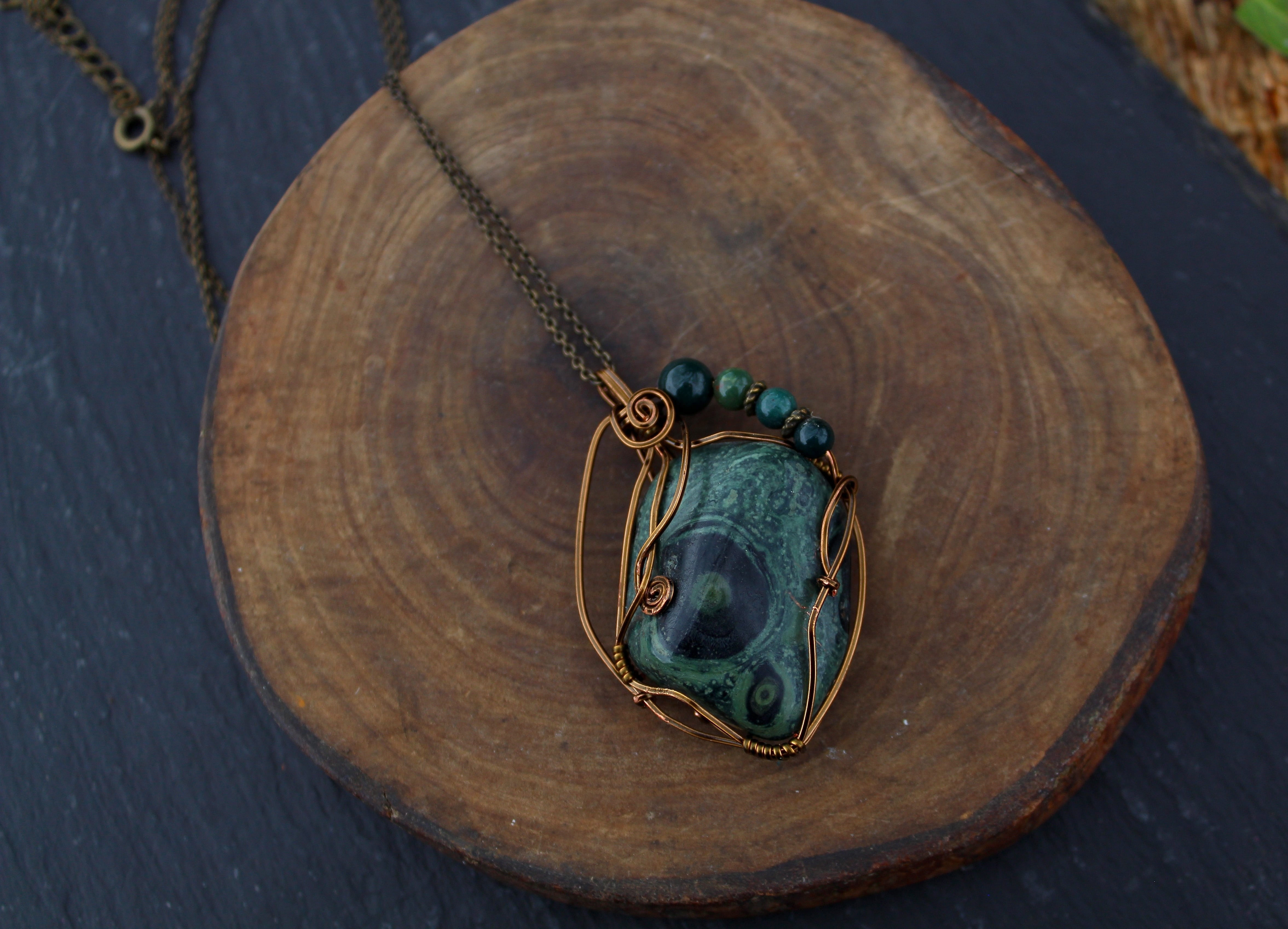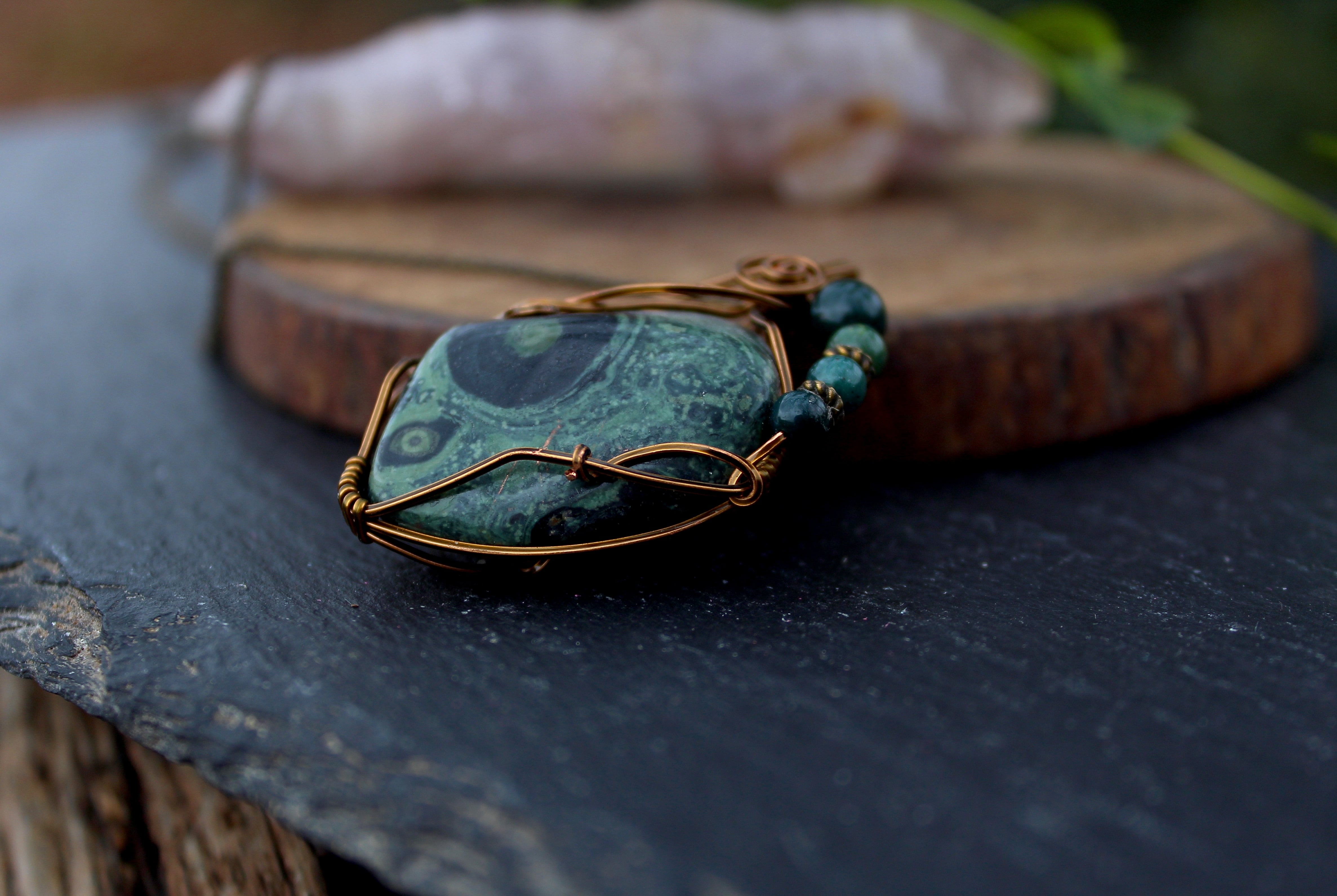 アンティークゴールドのワイヤーで巻いて、ブラッドストーンのビーズをあしらいました。