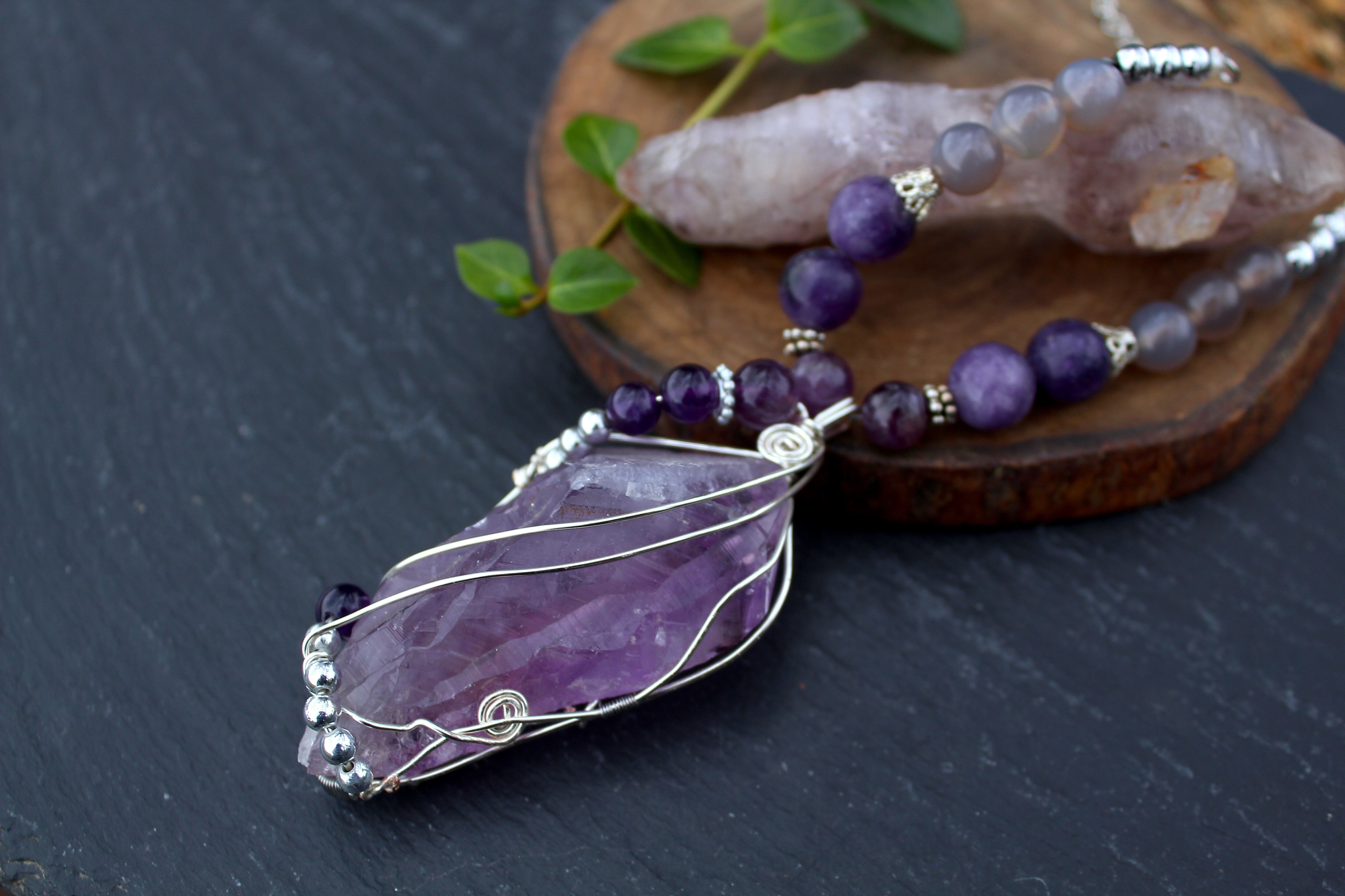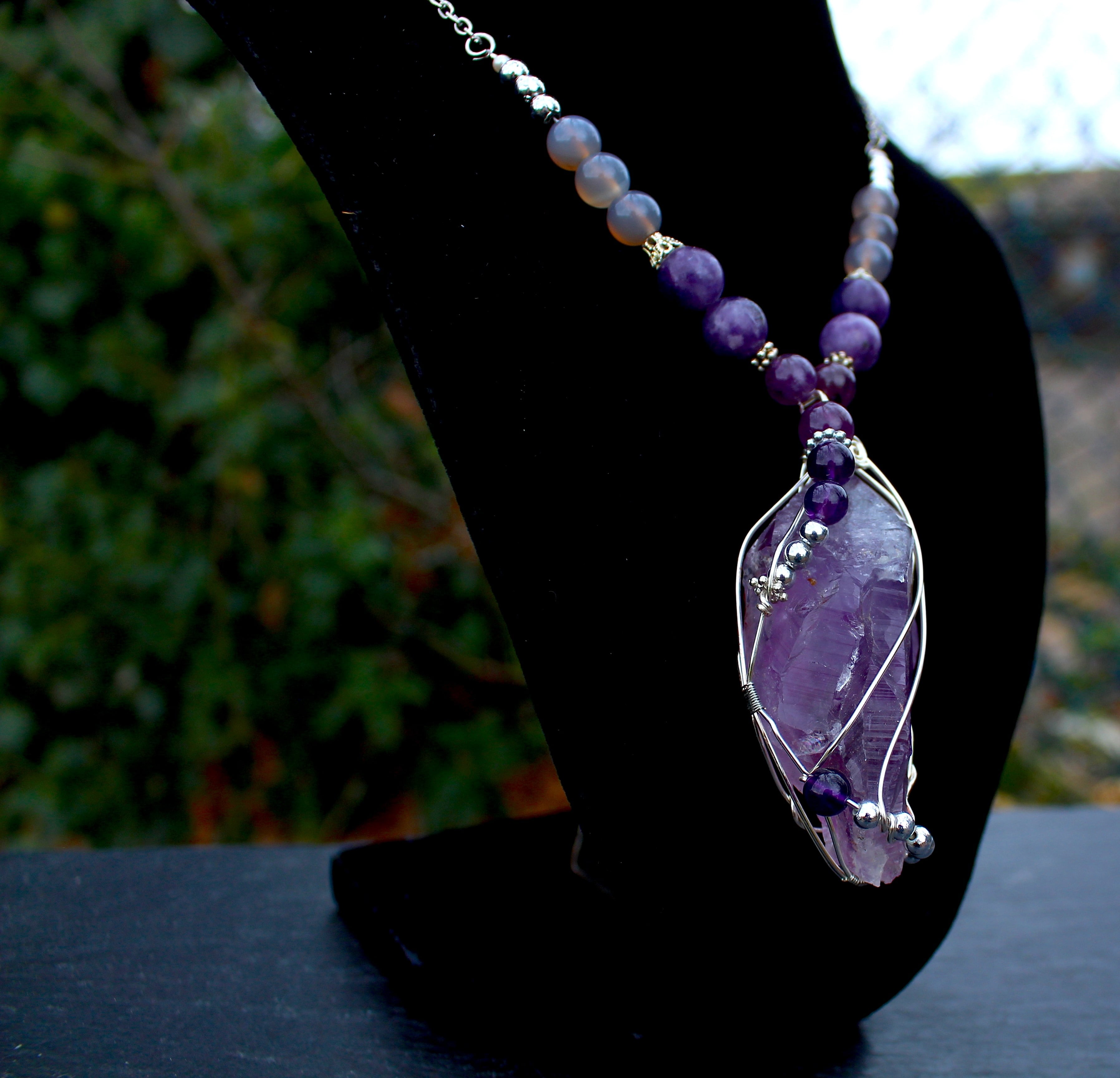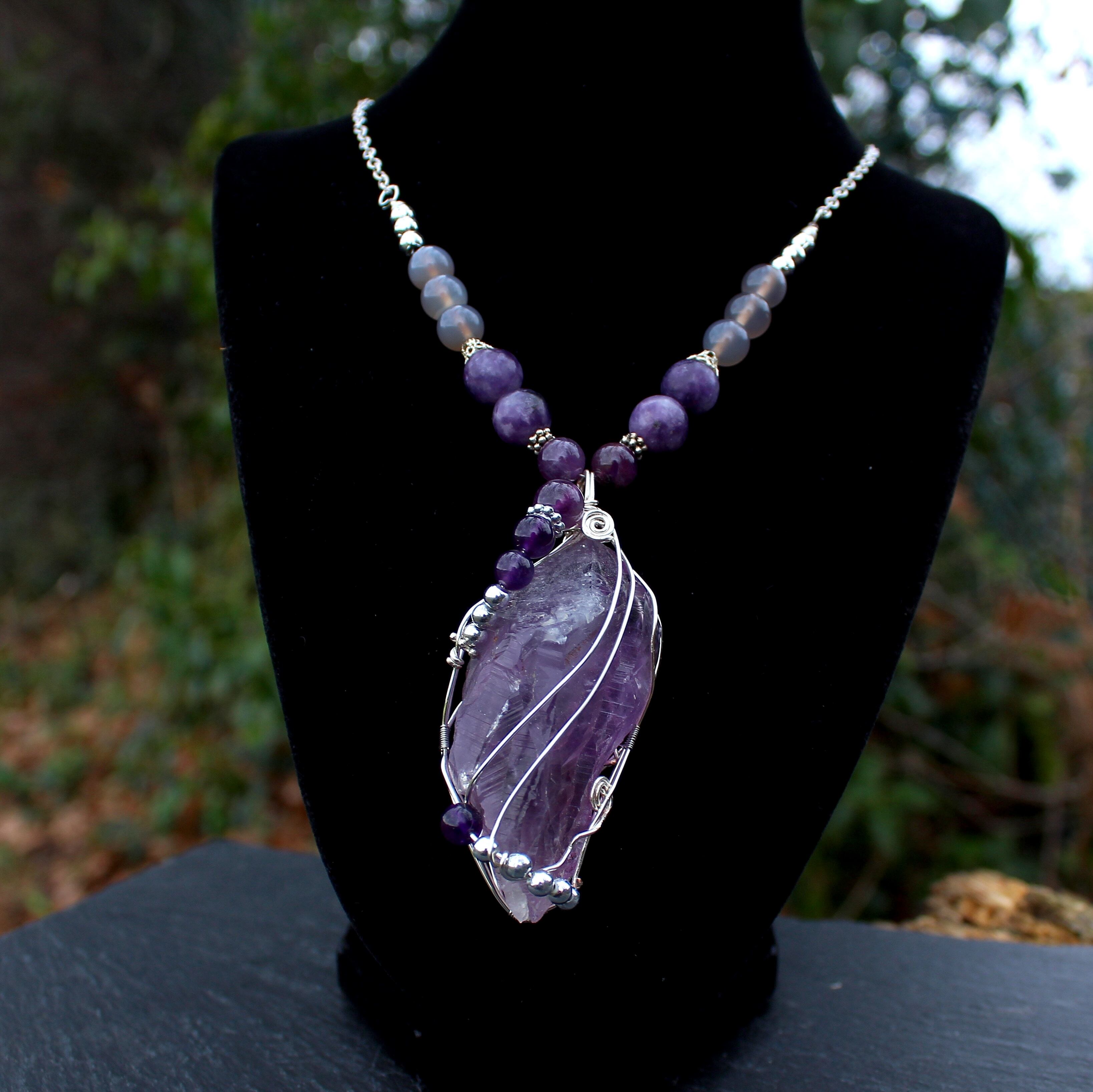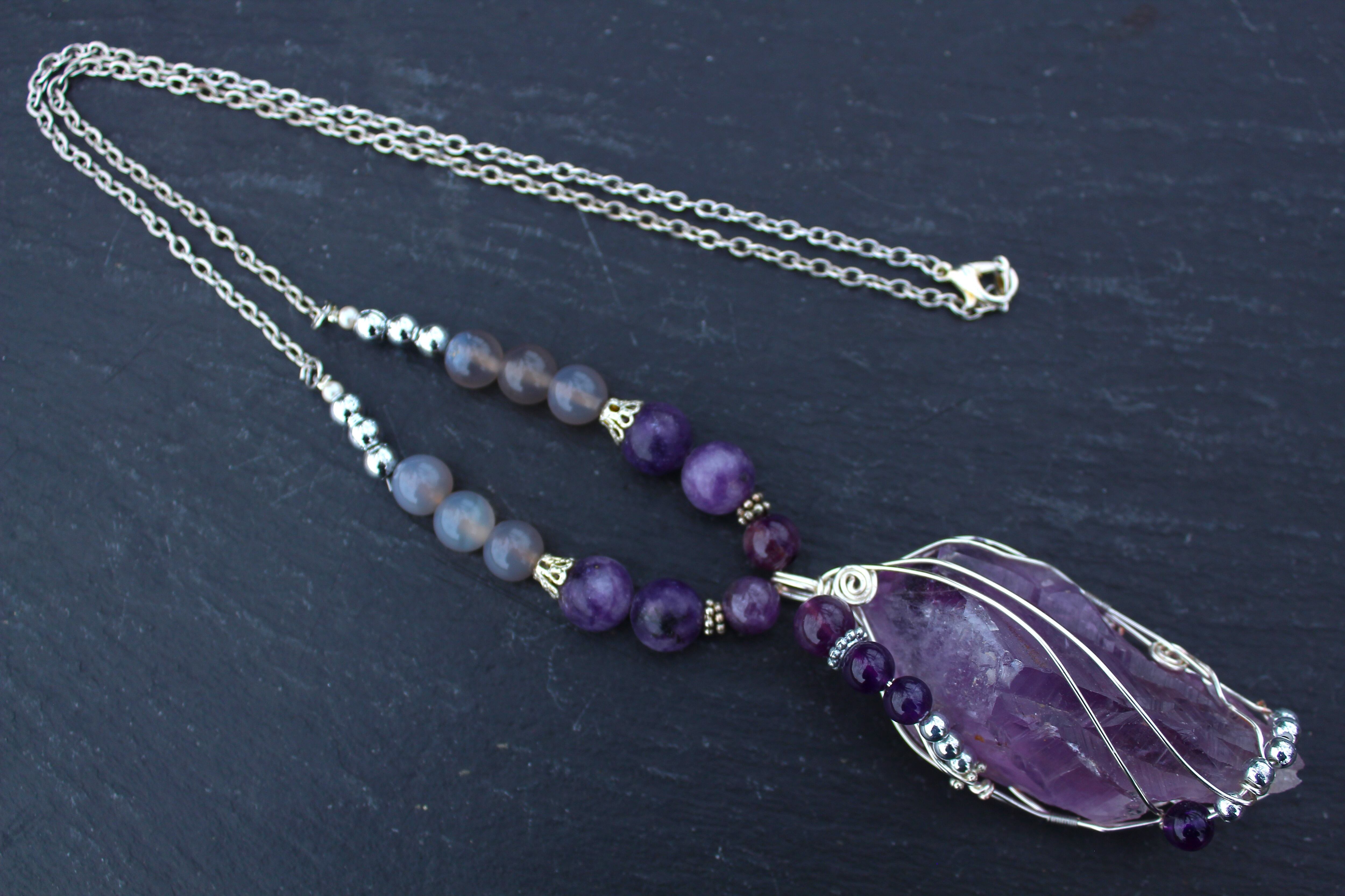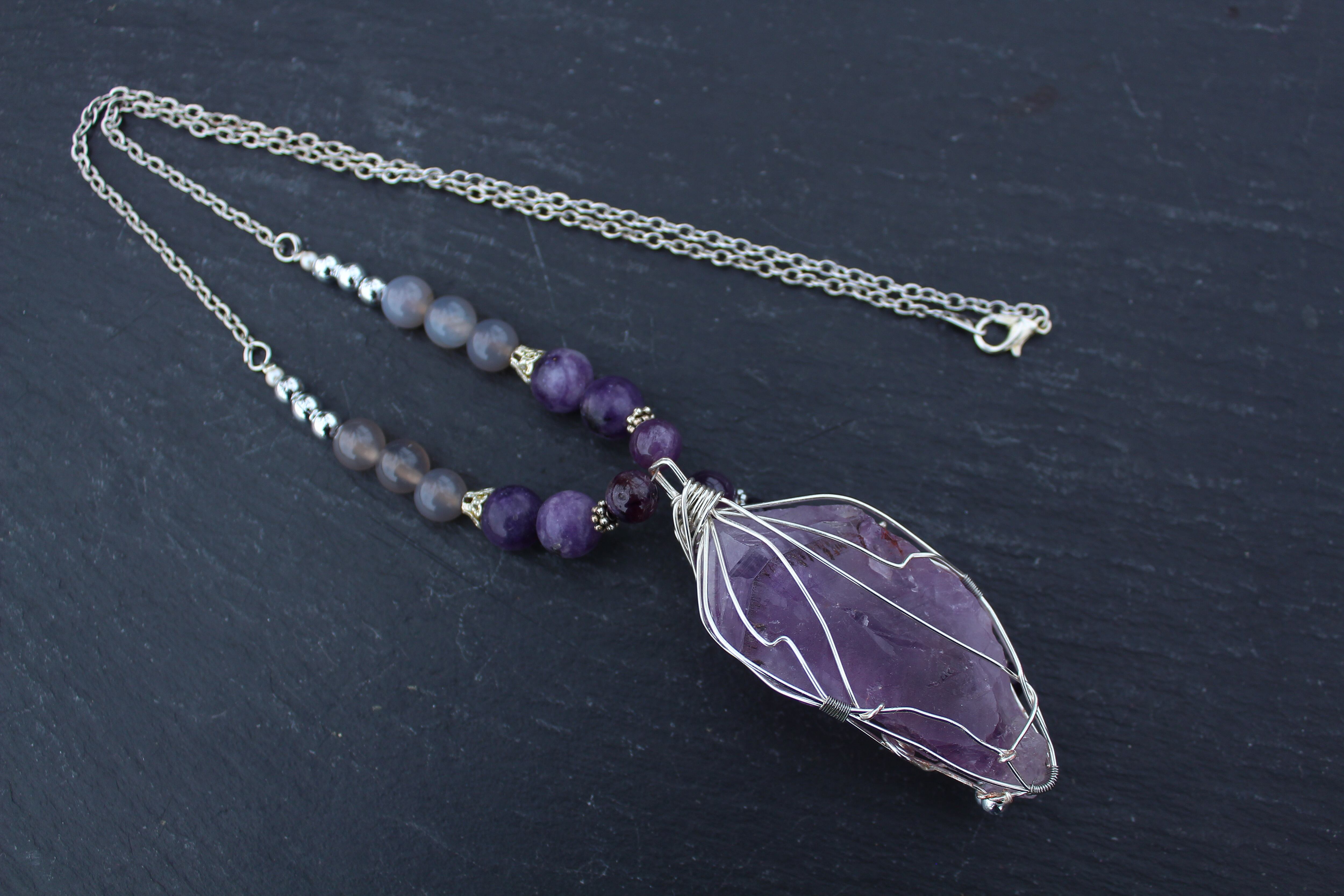 ラベンダーアメジストをシルバーのワイヤーで巻きながら、6ミリと8ミリのアメジストとシルバーのビーズを止めつけました。8ミリのアメジスト、10ミリのレピドライト、最後に8ミリのグレイアゲートを組ませました。
