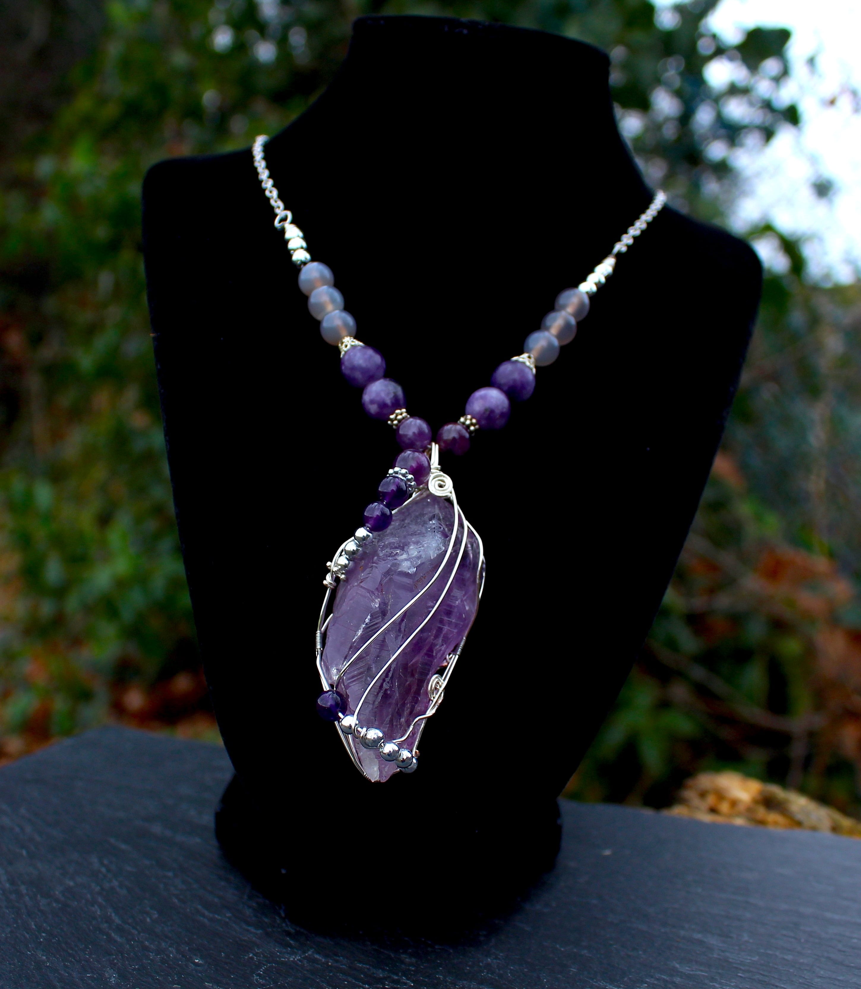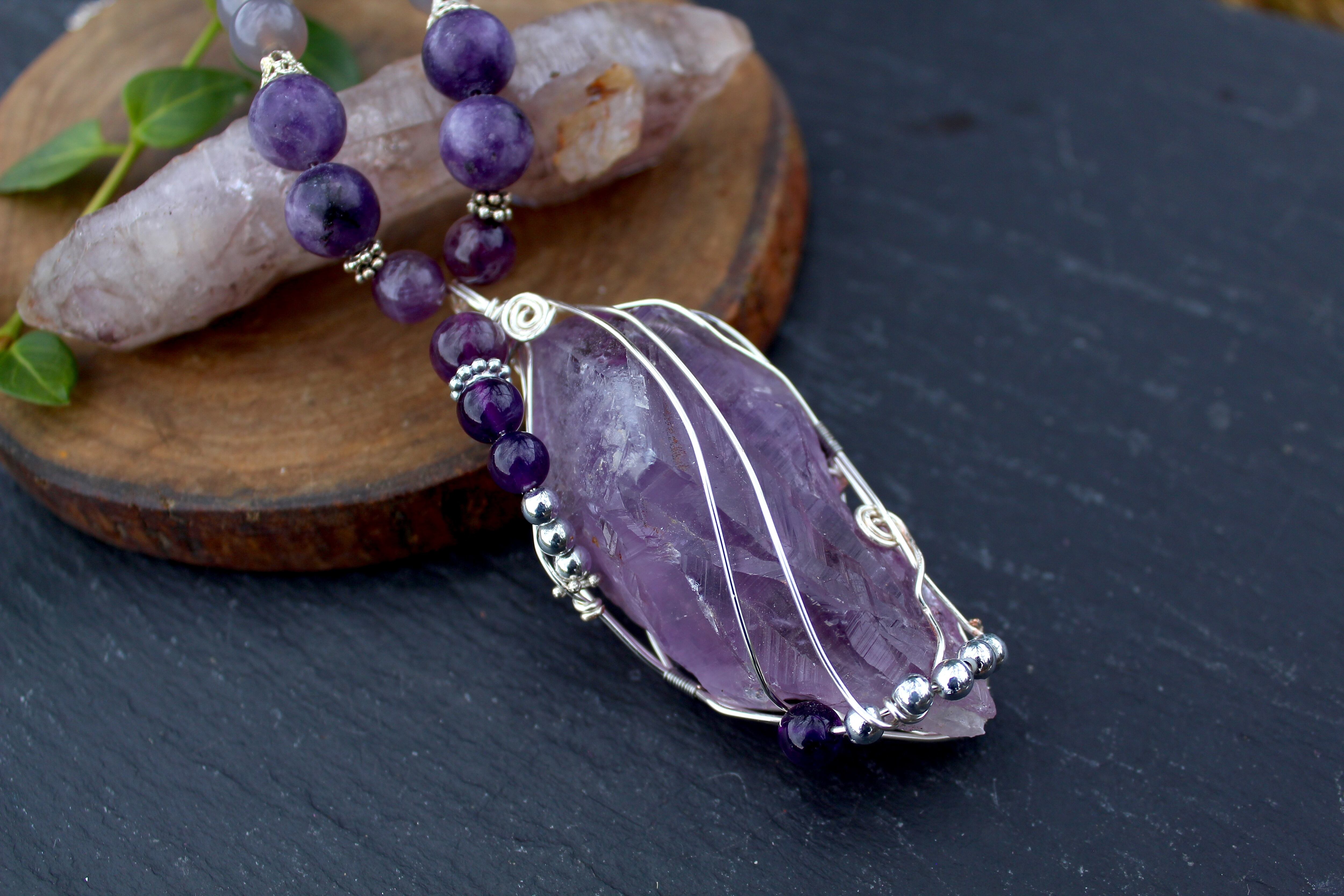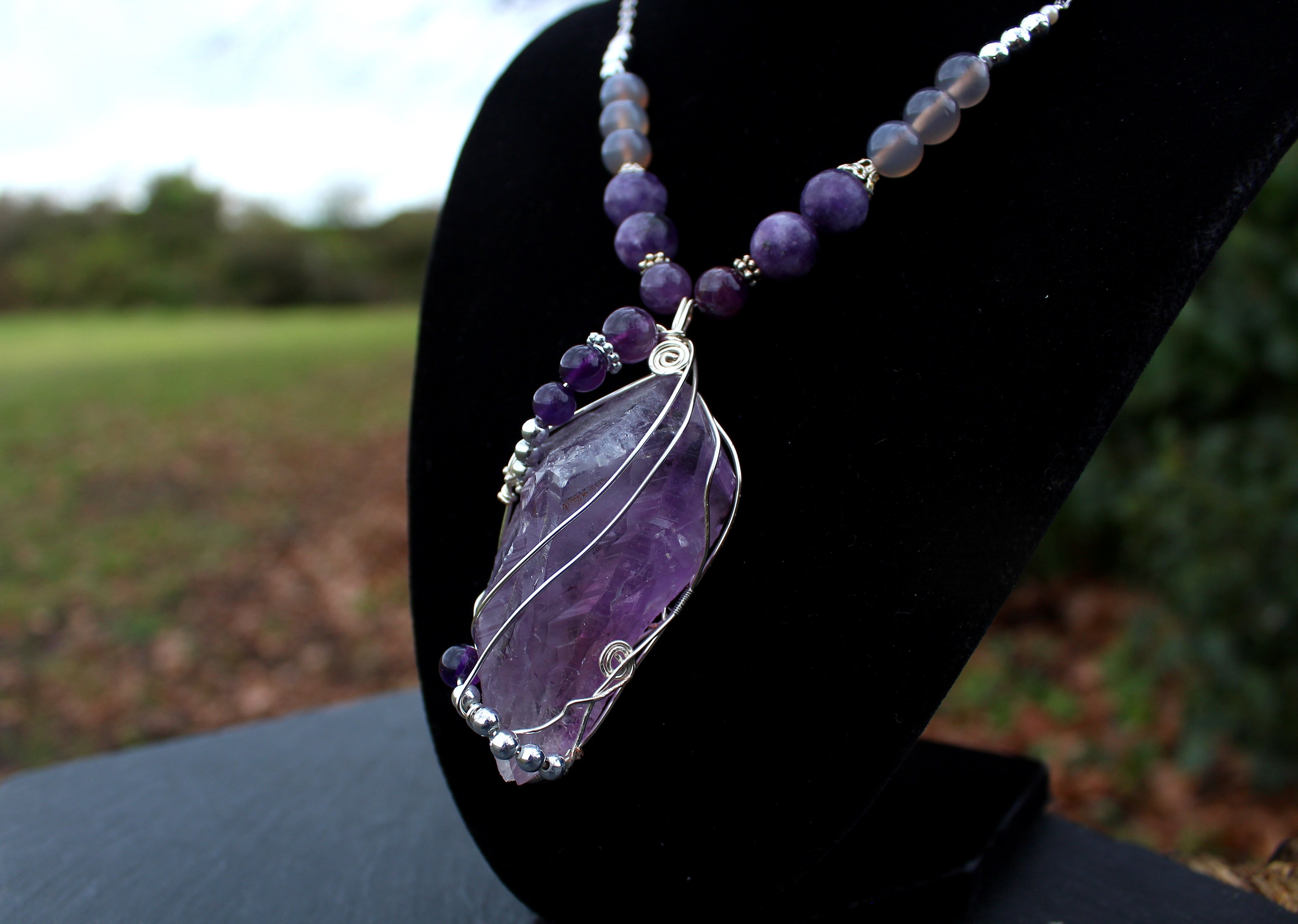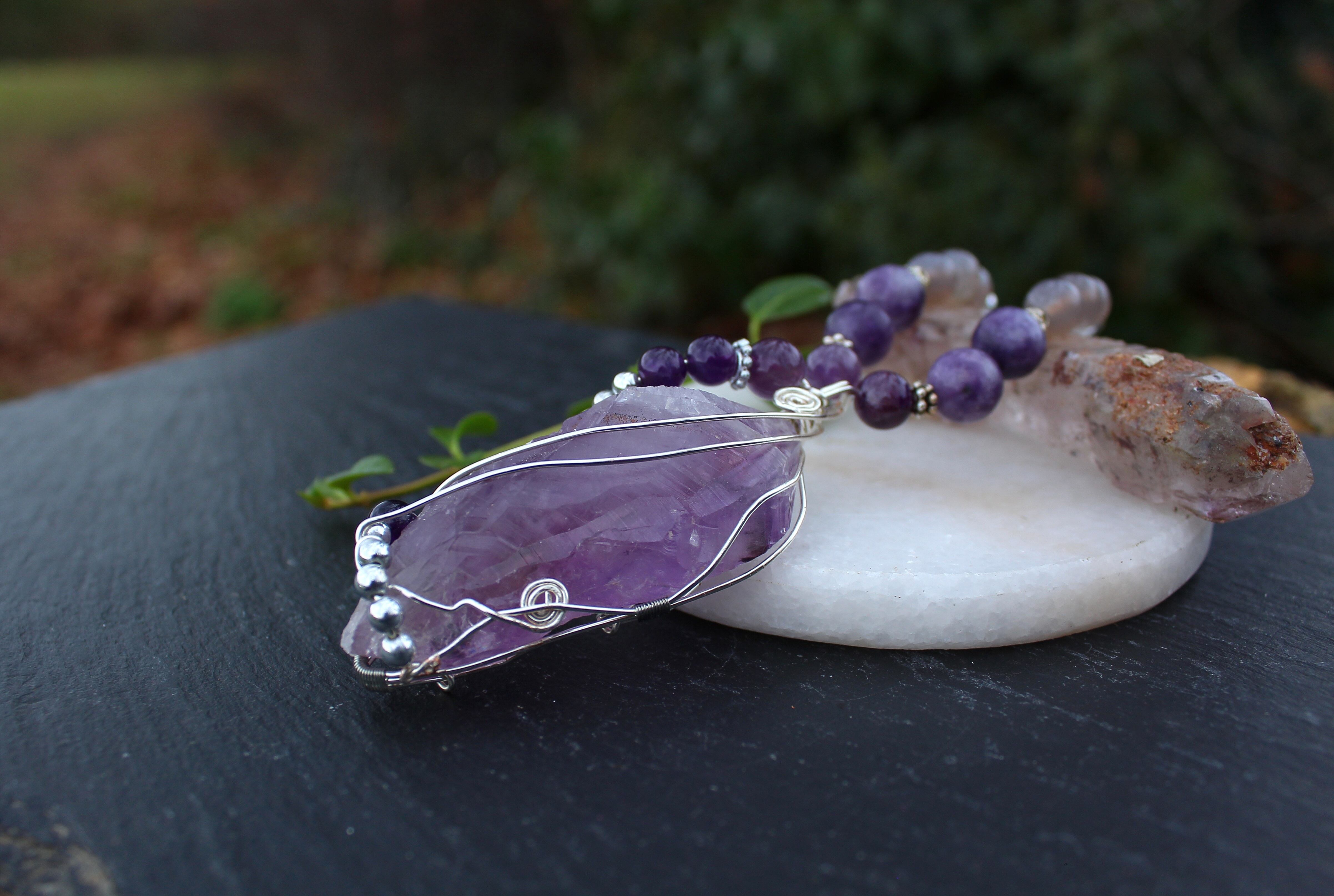 ラベンダーアメジストをシルバーのワイヤーで巻きながら、6ミリと8ミリのアメジストとシルバーのビーズを止めつけました。8ミリのアメジスト、10ミリのレピドライト、最後に8ミリのグレイアゲートを組ませました。