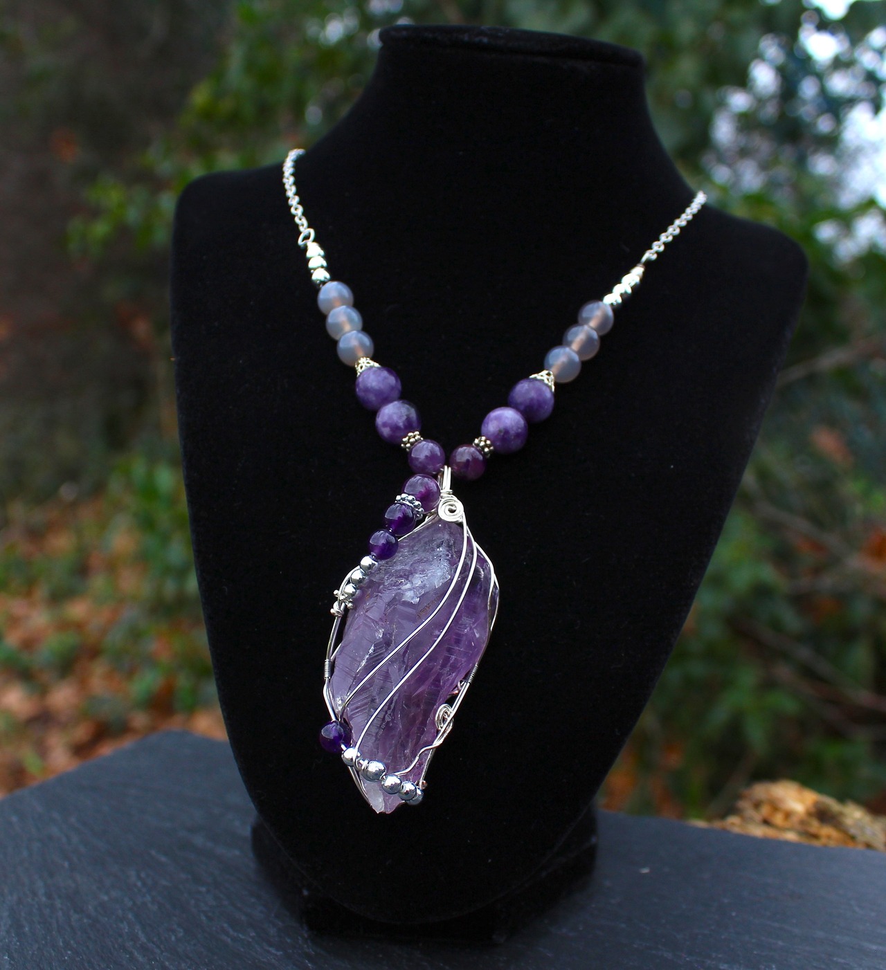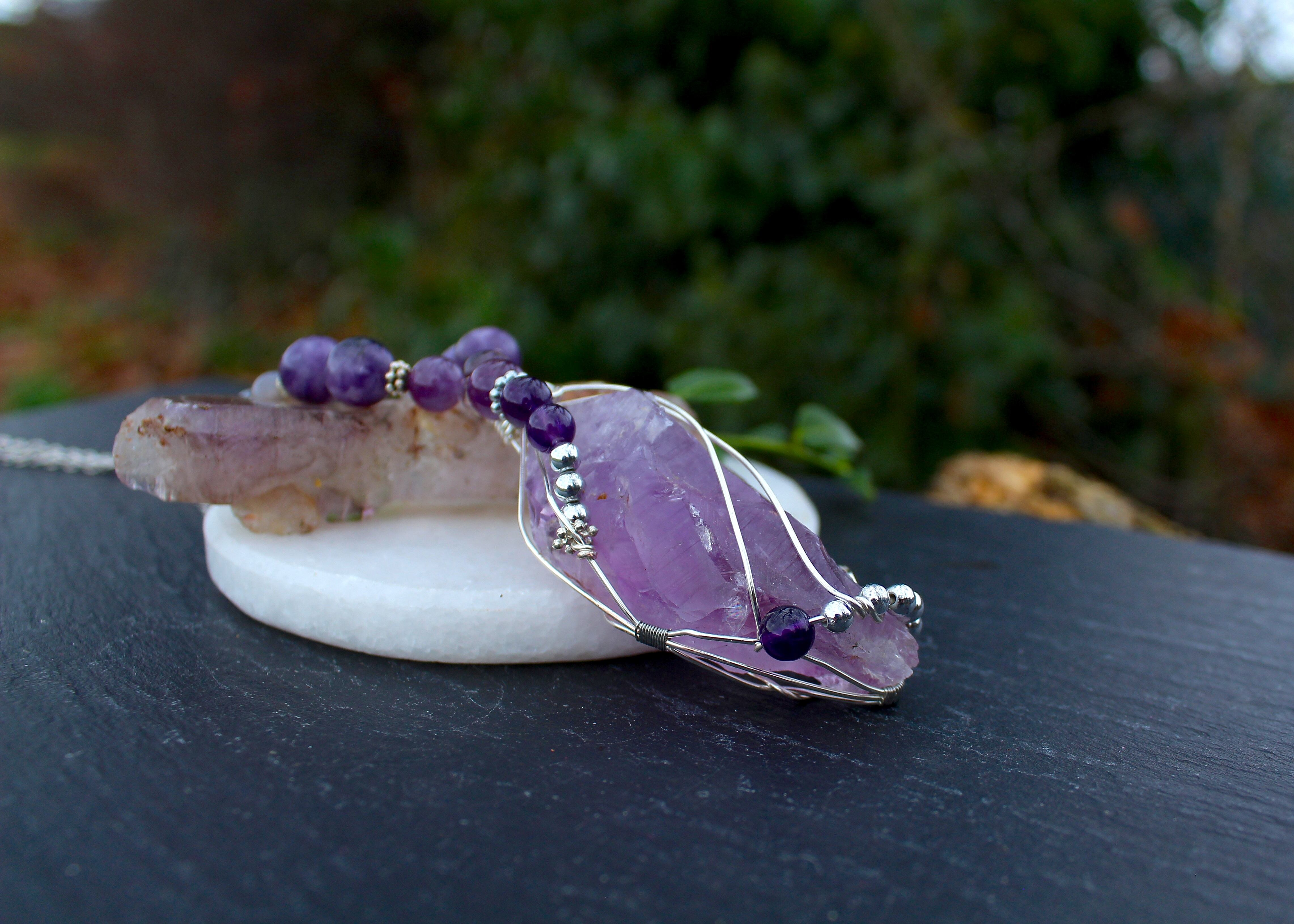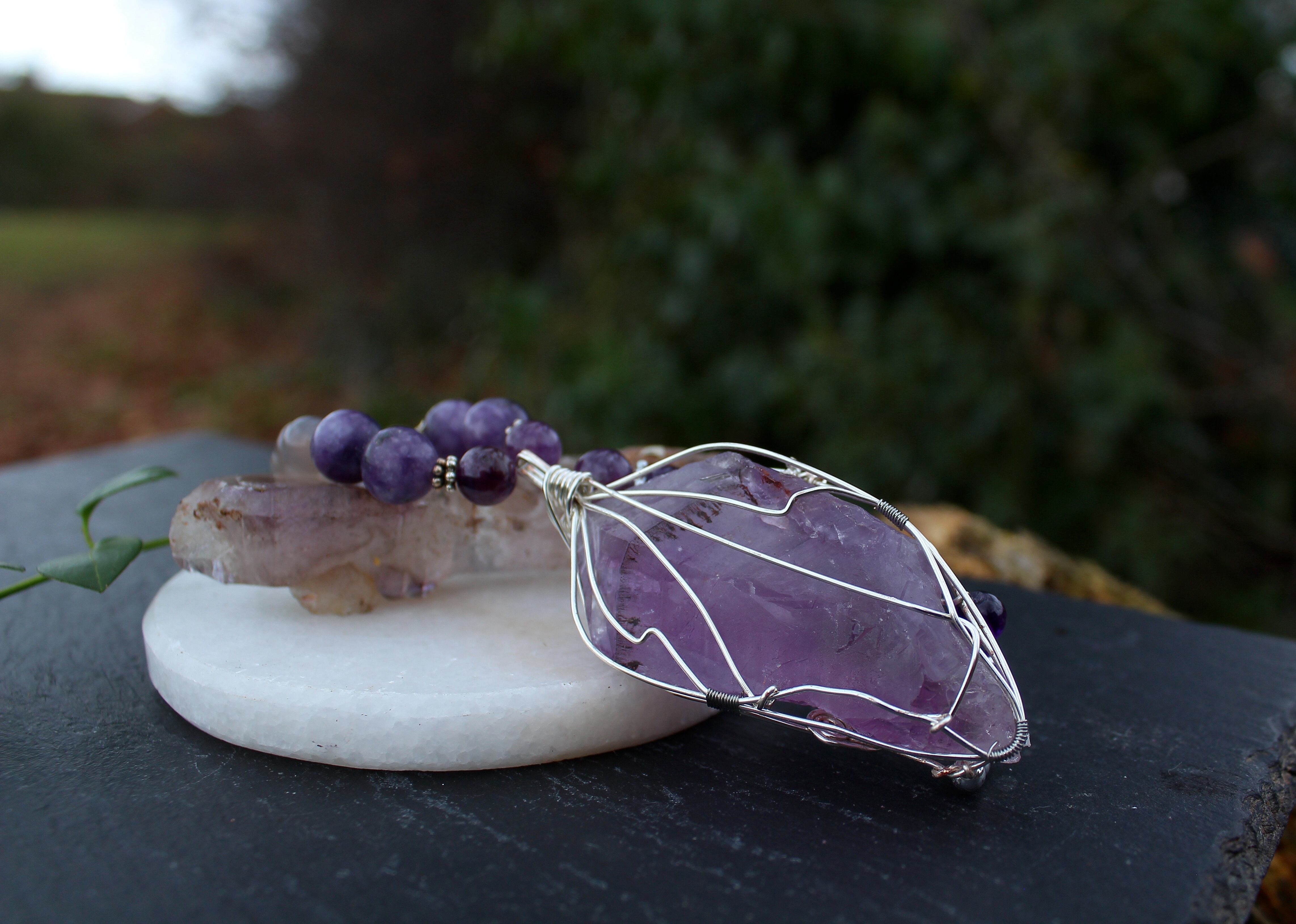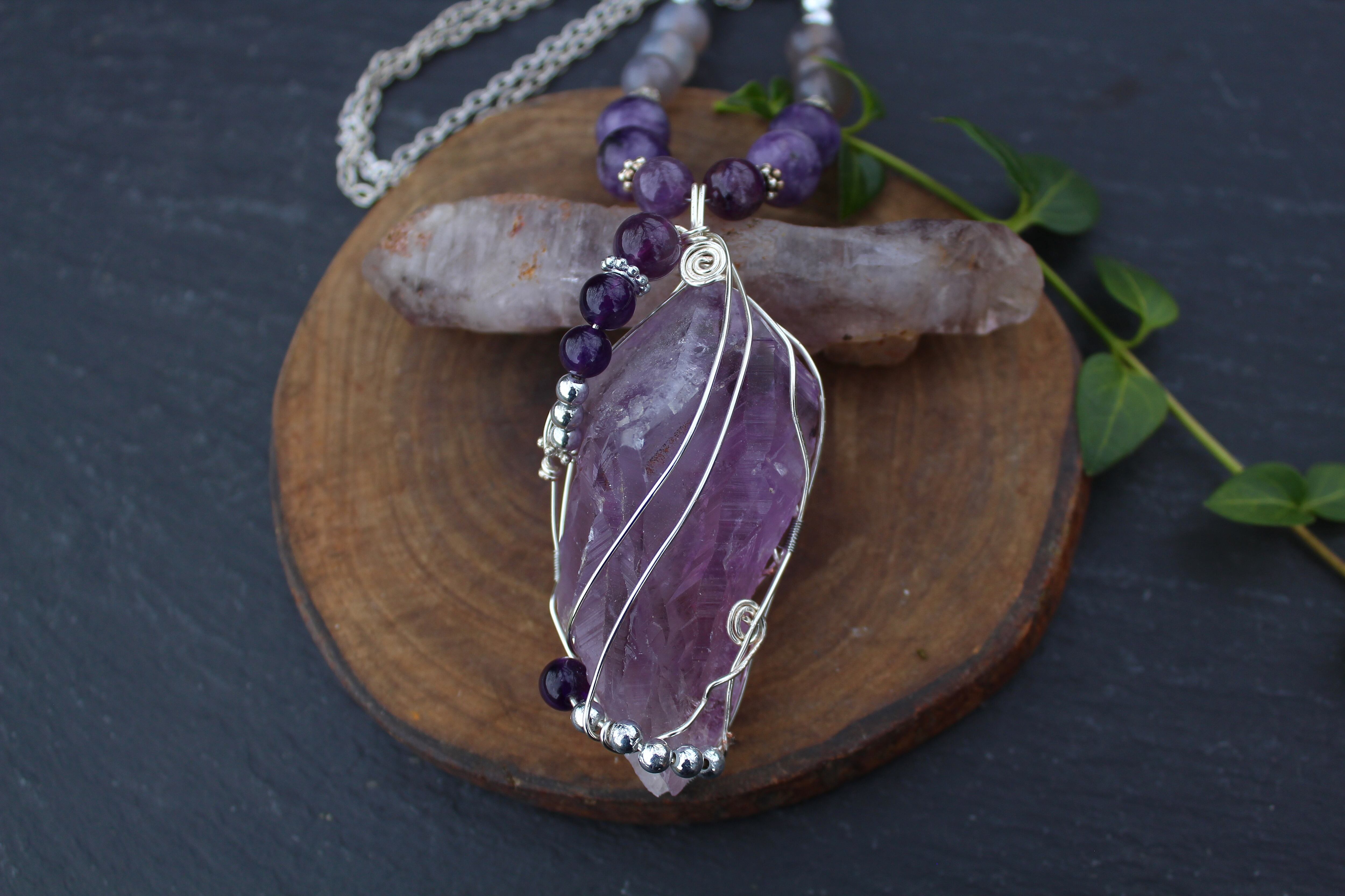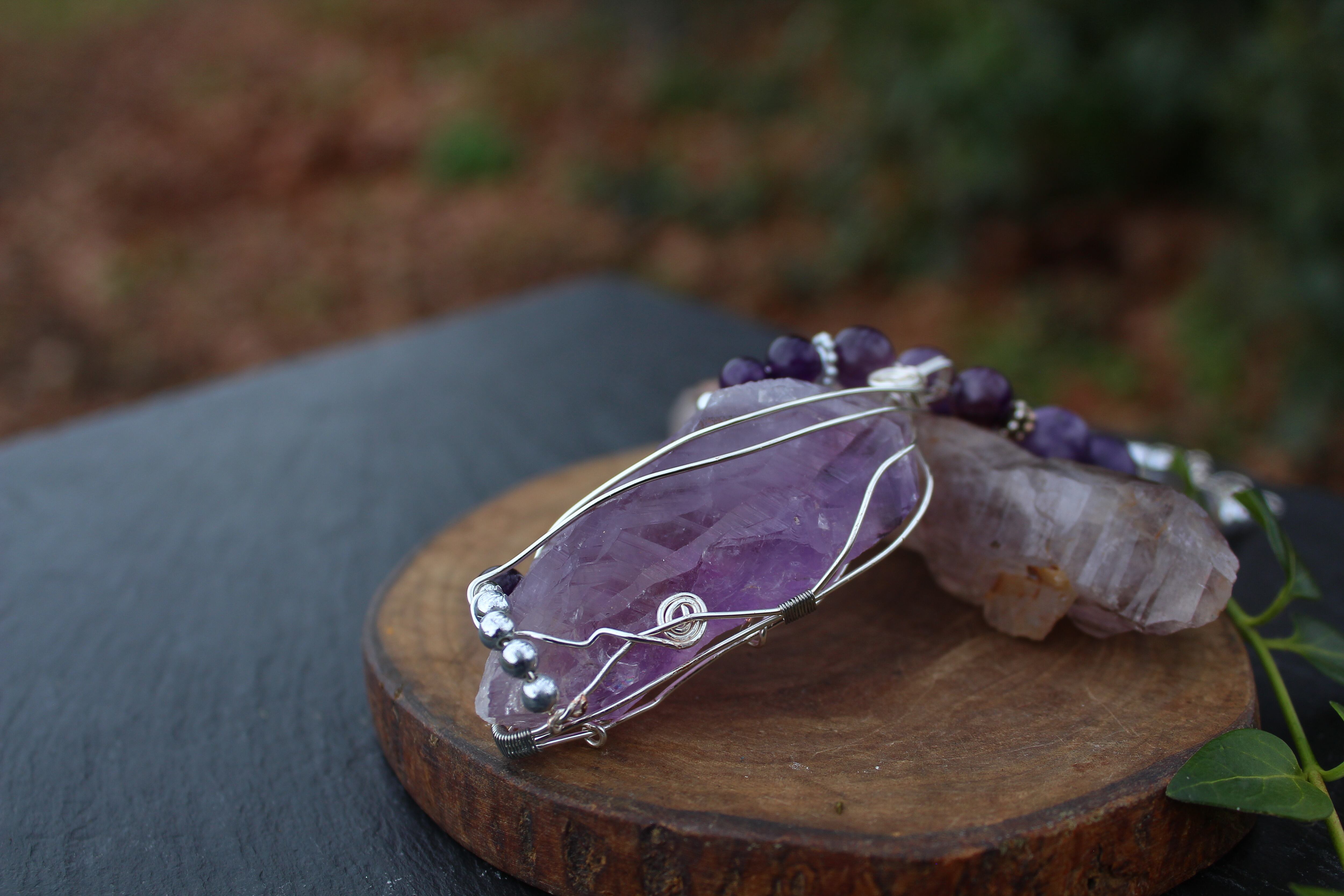 ラベンダーアメジストをシルバーのワイヤーで巻きながら、6ミリと8ミリのアメジストとシルバーのビーズを止めつけました。8ミリのアメジスト、10ミリのレピドライト、最後に8ミリのグレイアゲートを組ませました。