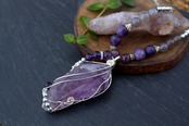 ラフで素朴な印象のラベンダーアメジストの原石です。淡い紫のアメジストをラベンダーアメジストと呼び、不眠に良い石と信じられてきました。レピドライトも精神の安定をもたらし、安眠に効果があると言われています。心を落ち着かせ、不安やストレスを軽減し、穏やかなリラクゼーションをもたらす素晴らしいエネルギーのネックレスです。