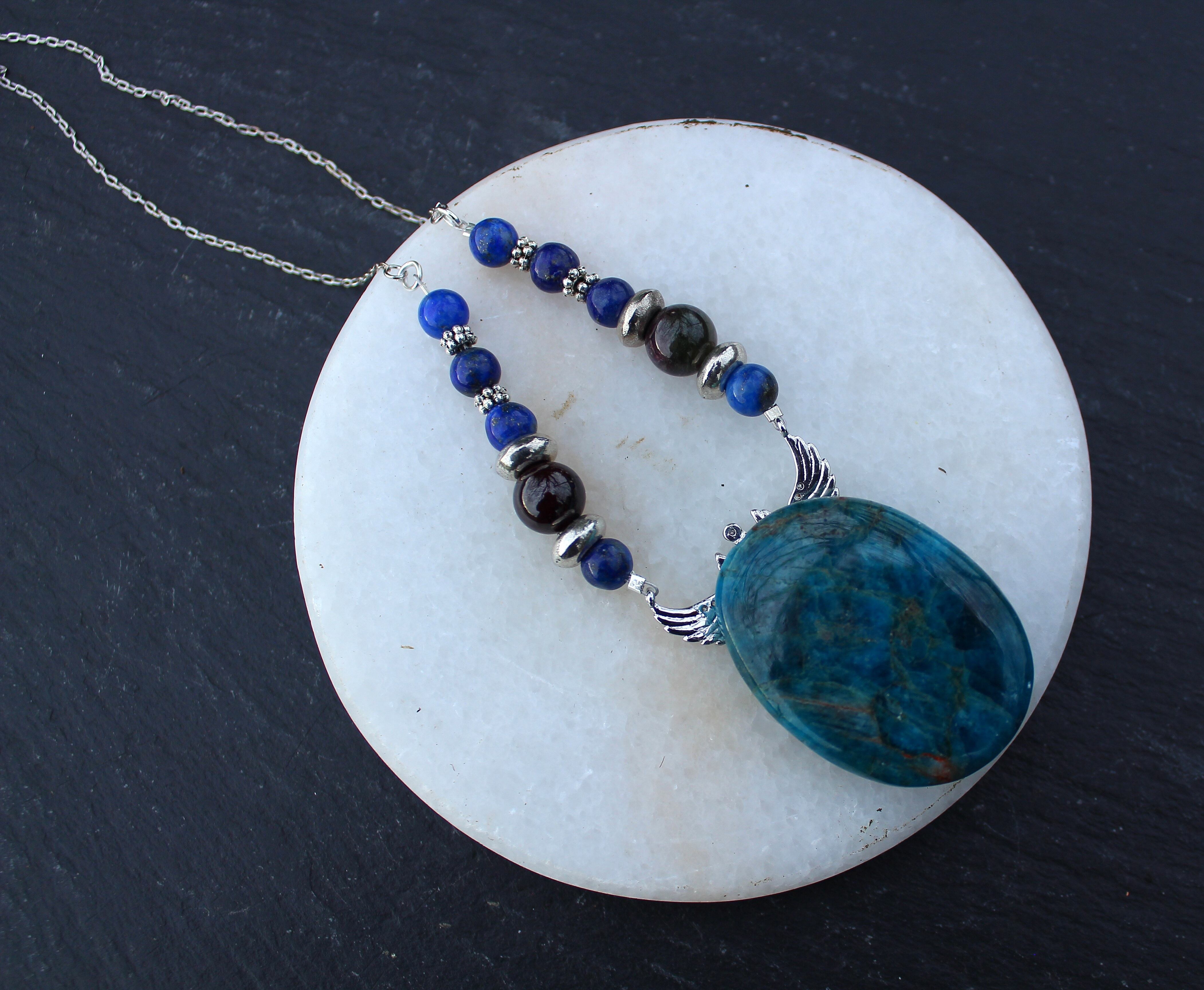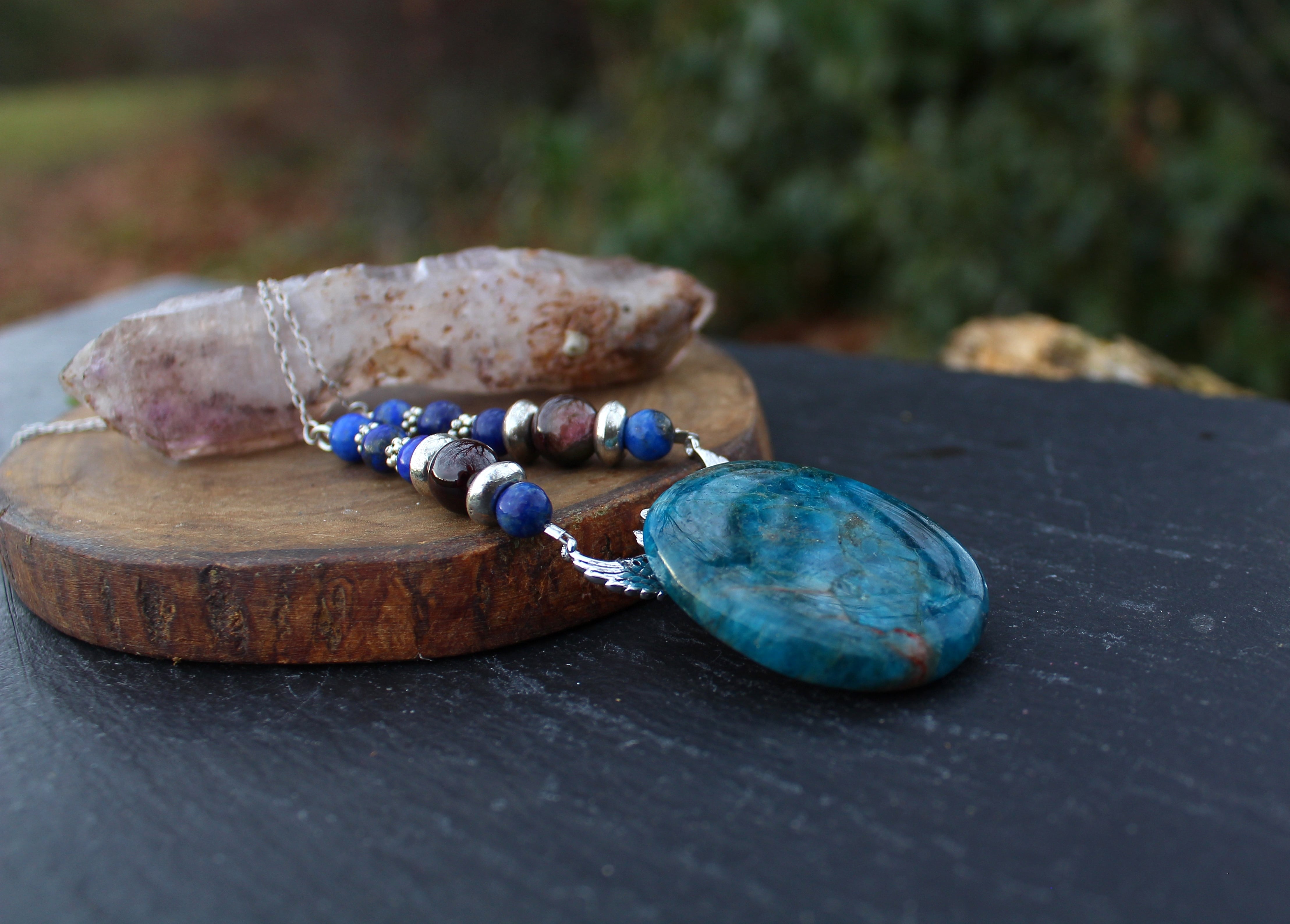 普通に見られるアパタイトは弗素燐灰石を指し、燐酸カルシウムに弗素が加わったものですが、フッ素が塩素に置き換わった塩素燐灰石という種類も存在しています。また、その両方が混ざった固体も存在しており、種類の判別が難しいことがあります。含有元素によって無色・ピンク・赤・黄・緑・青・紫など様々な色がありますが、アクセサリーとして一般的なのは、ブルーアパタイトです。同じブルーアパタイトでも、深い青色のものから、透き通るような透明感の青緑色をしたものまで様々です。アパタイトの名称は、この鉱物の形状が様々であり、晶癖も一定していないことから、ごまかし、トリック、策略の意味のギリシャ語、“apate ”に由来します。これは、アクアマリン・クリソタイル・紫水晶・蛍石・トルマリンなど他の鉱物と見間違えやすかったためと言われています。(A.G.Werner, 1786)