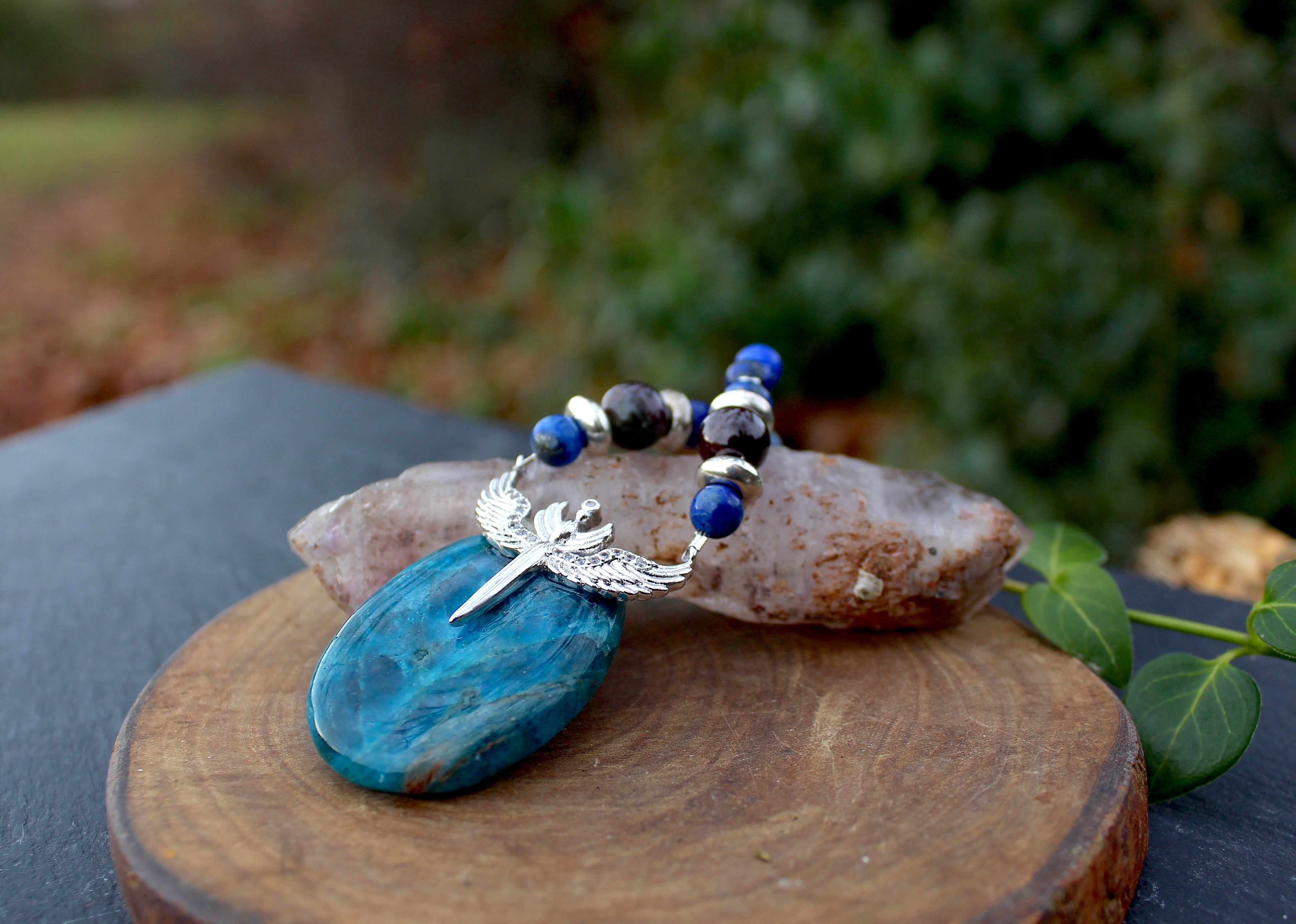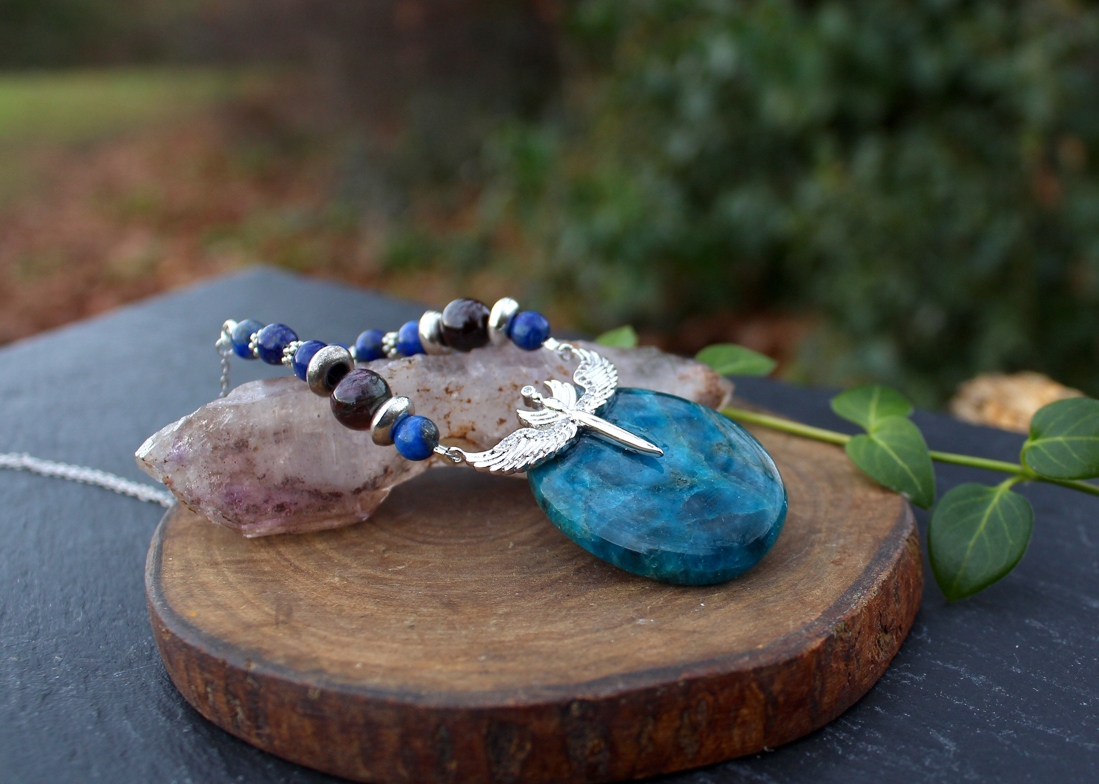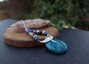 アパタイトは恋愛を守り、相手との絆を深めてくれる石。さらに幸運を引き寄せる6ミリのラピスラズリ、その間にAAA級のアイオライト。アイオライトは一途に愛を貫いて、結婚に結びつける石と言われています。