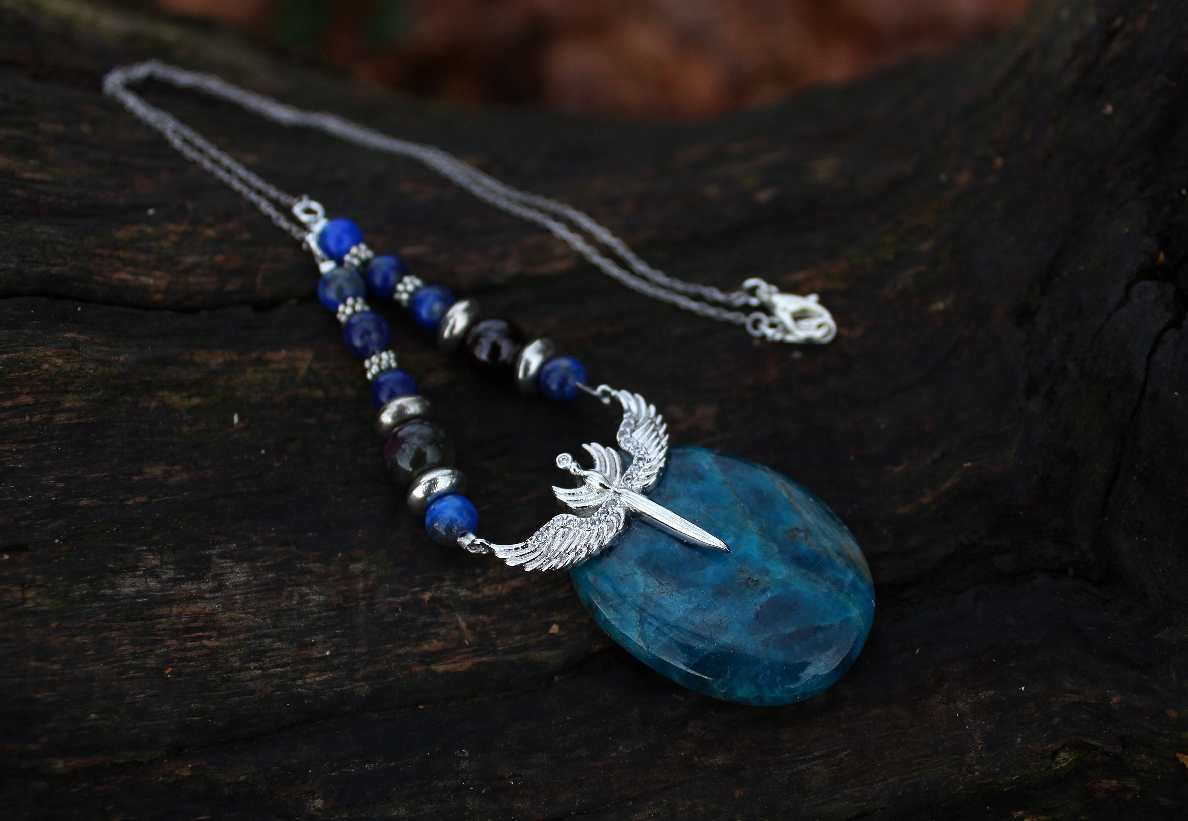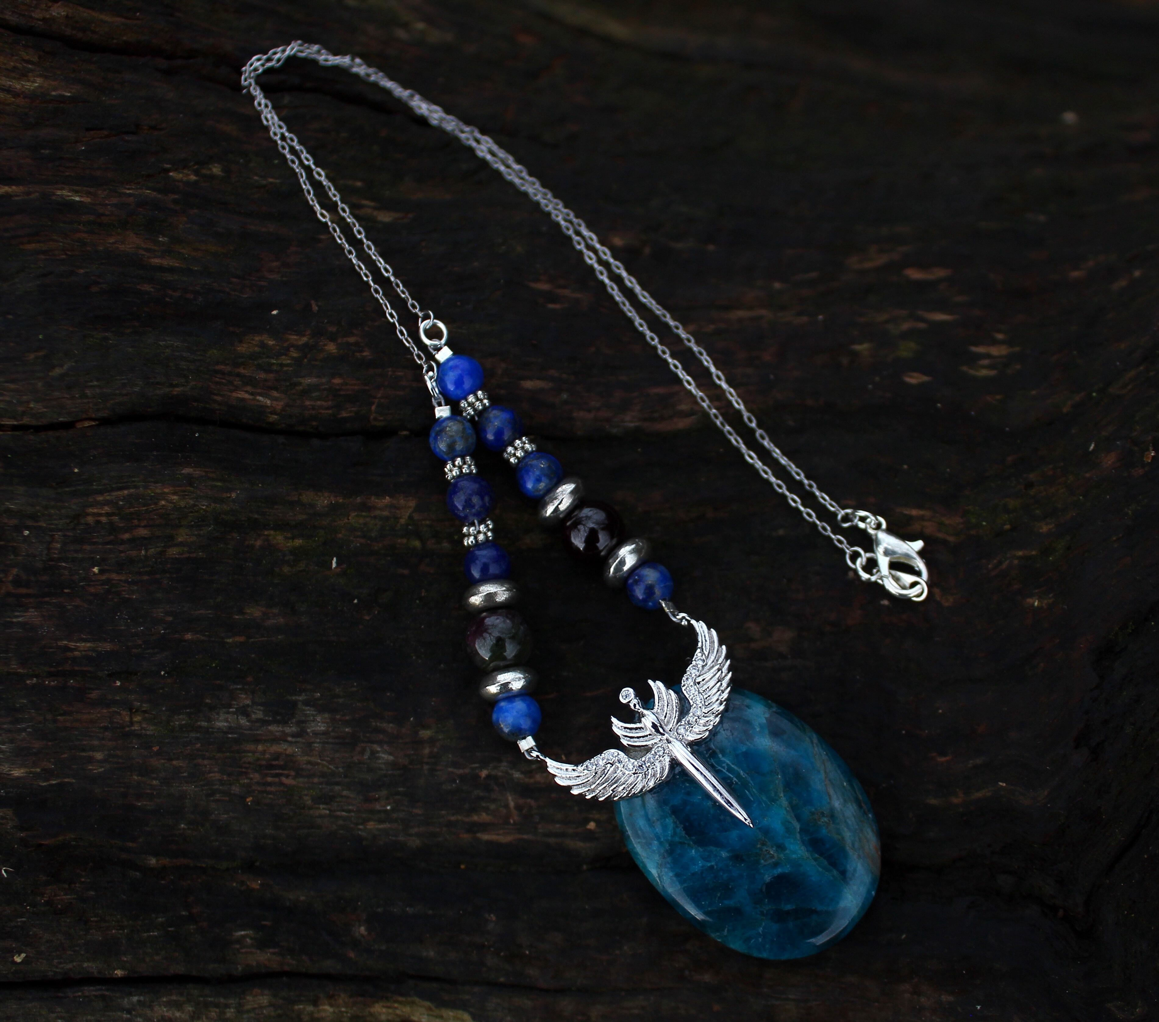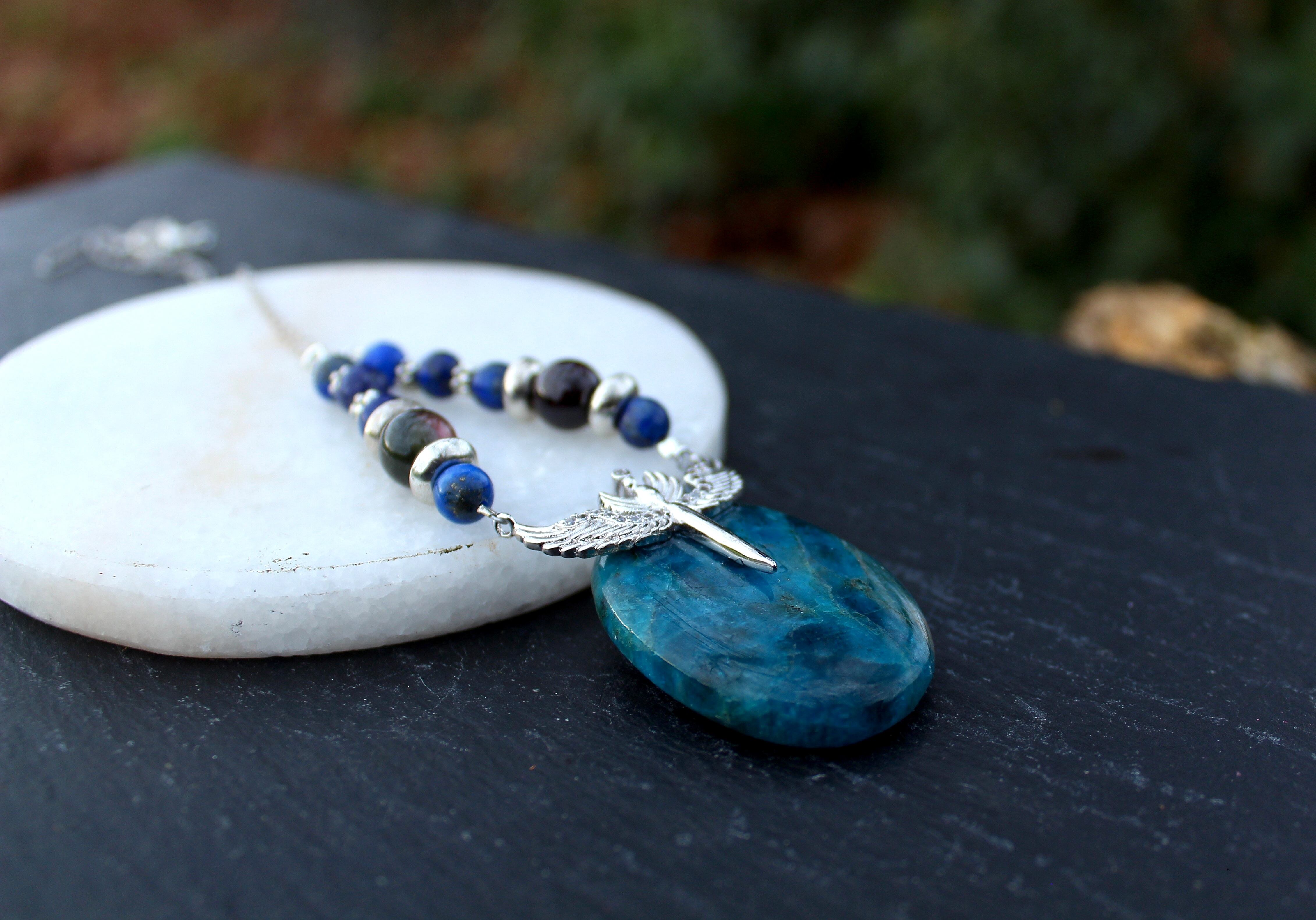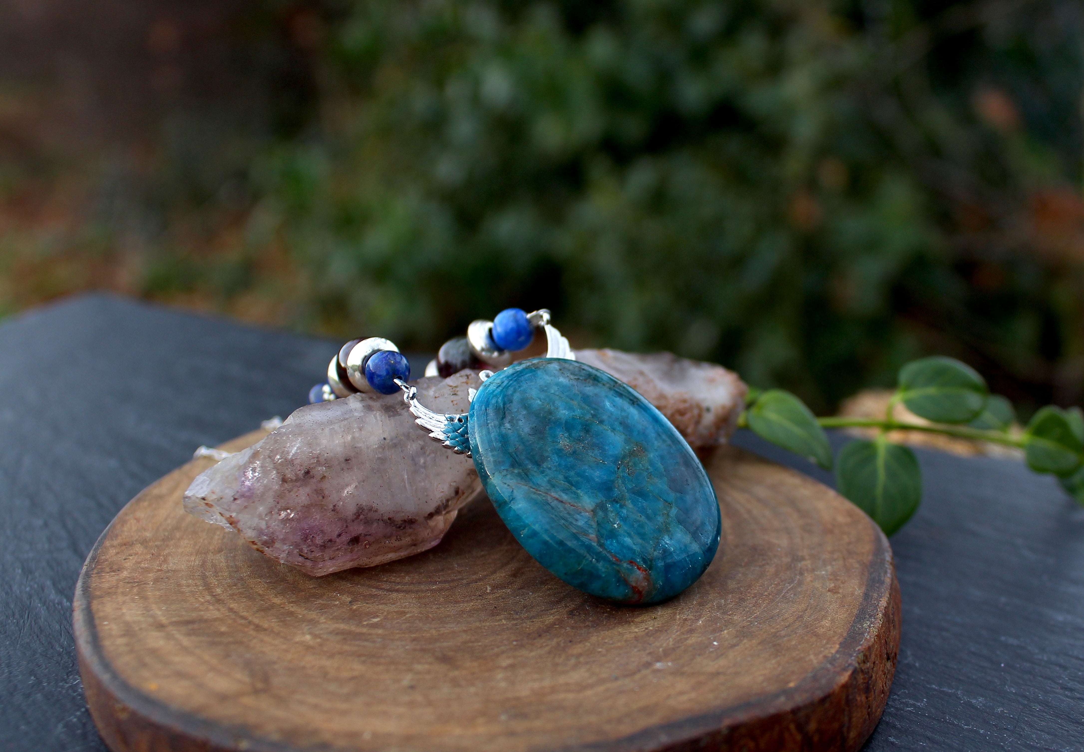 ブルーが美しいアパタイトのパームストーンです。シルバーのエンジェルウイングのパーツを止めつけました。