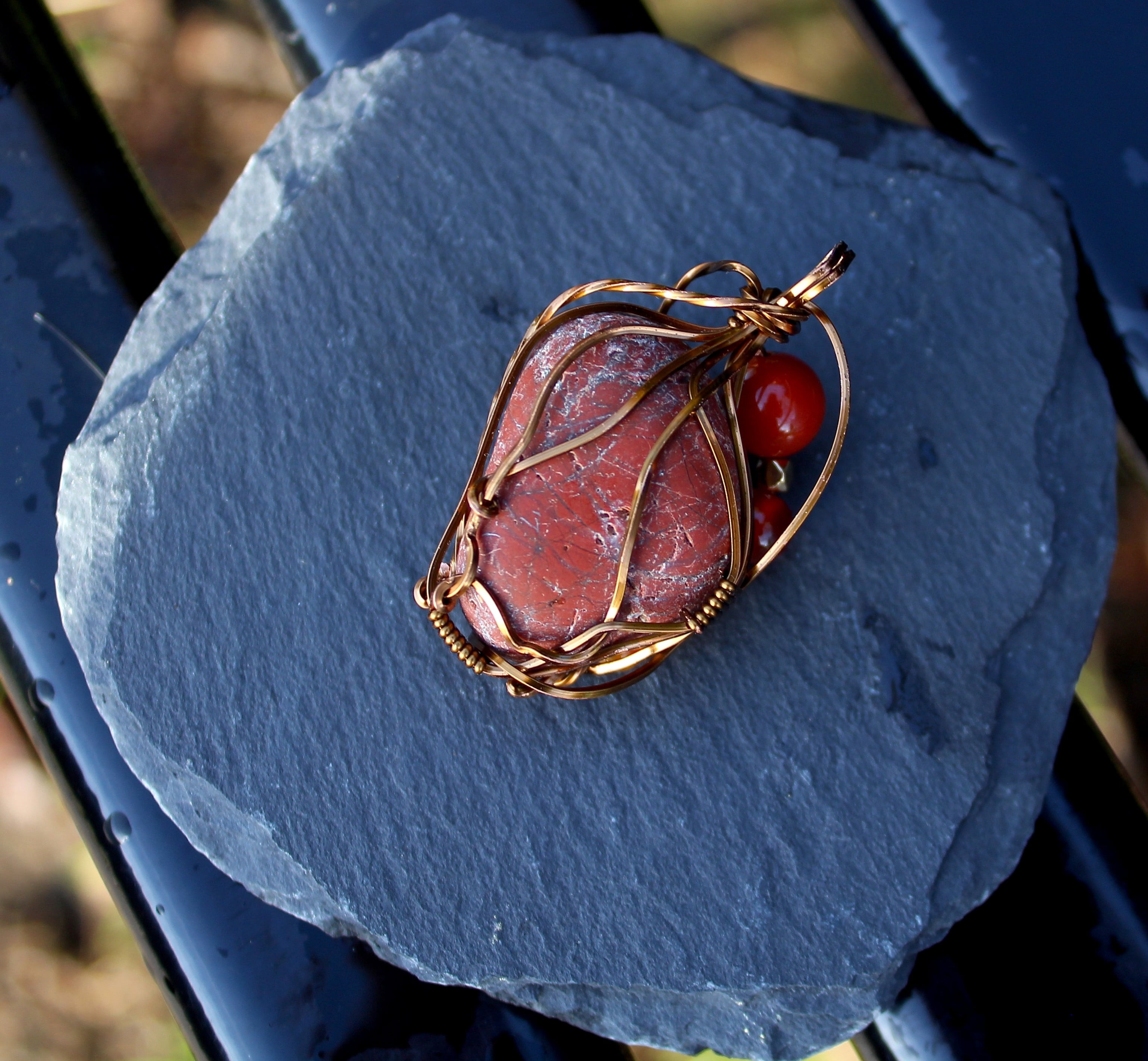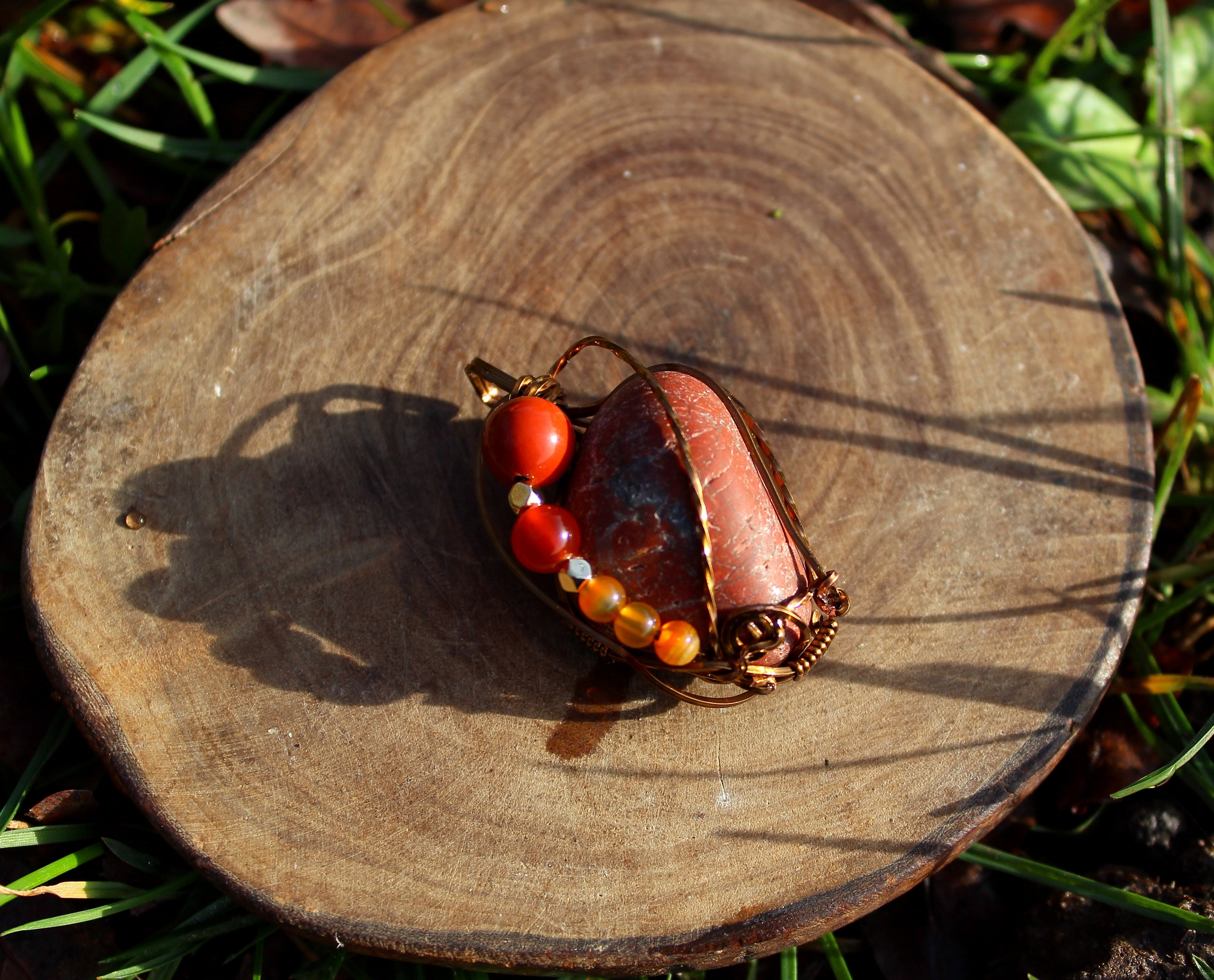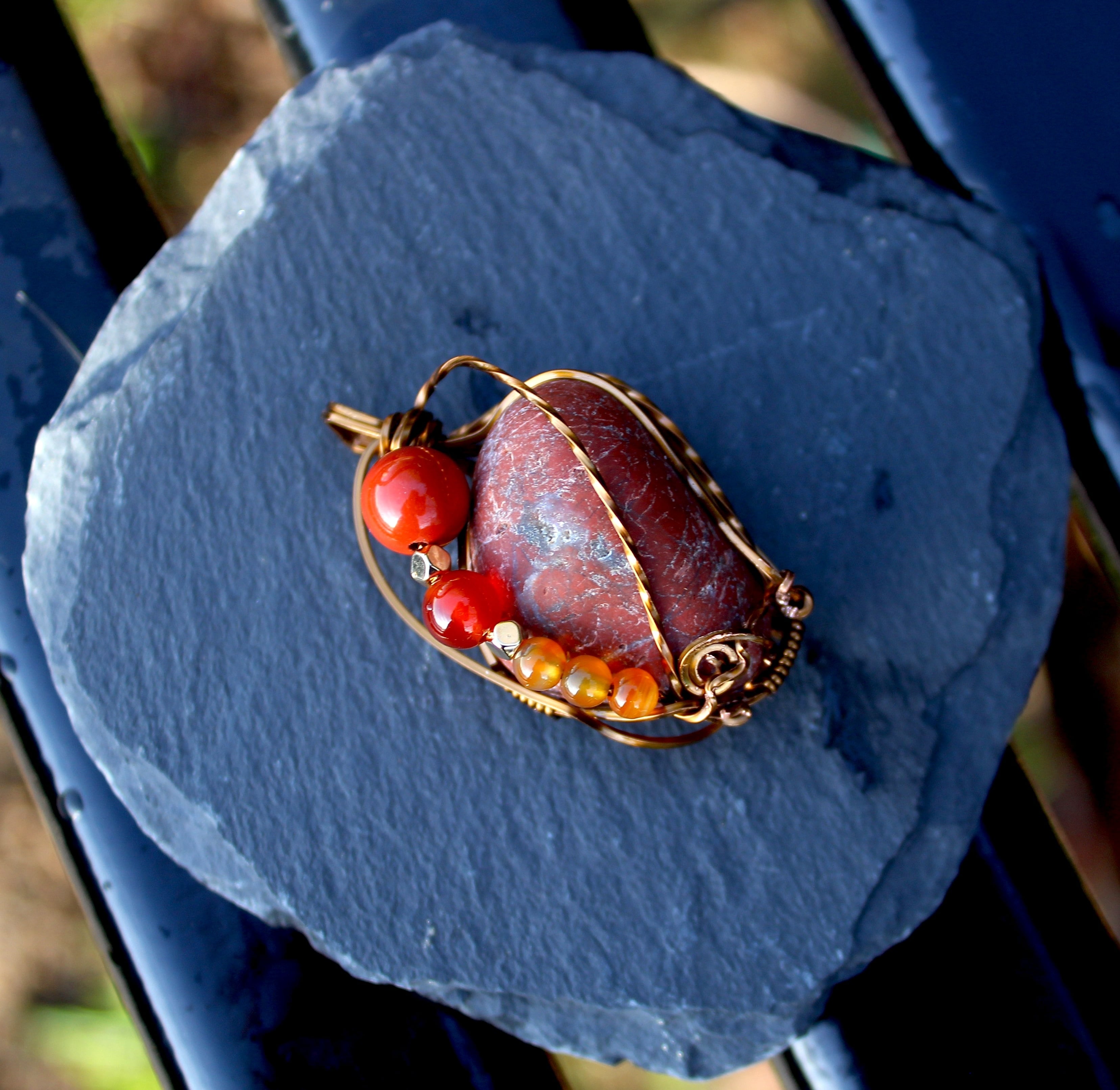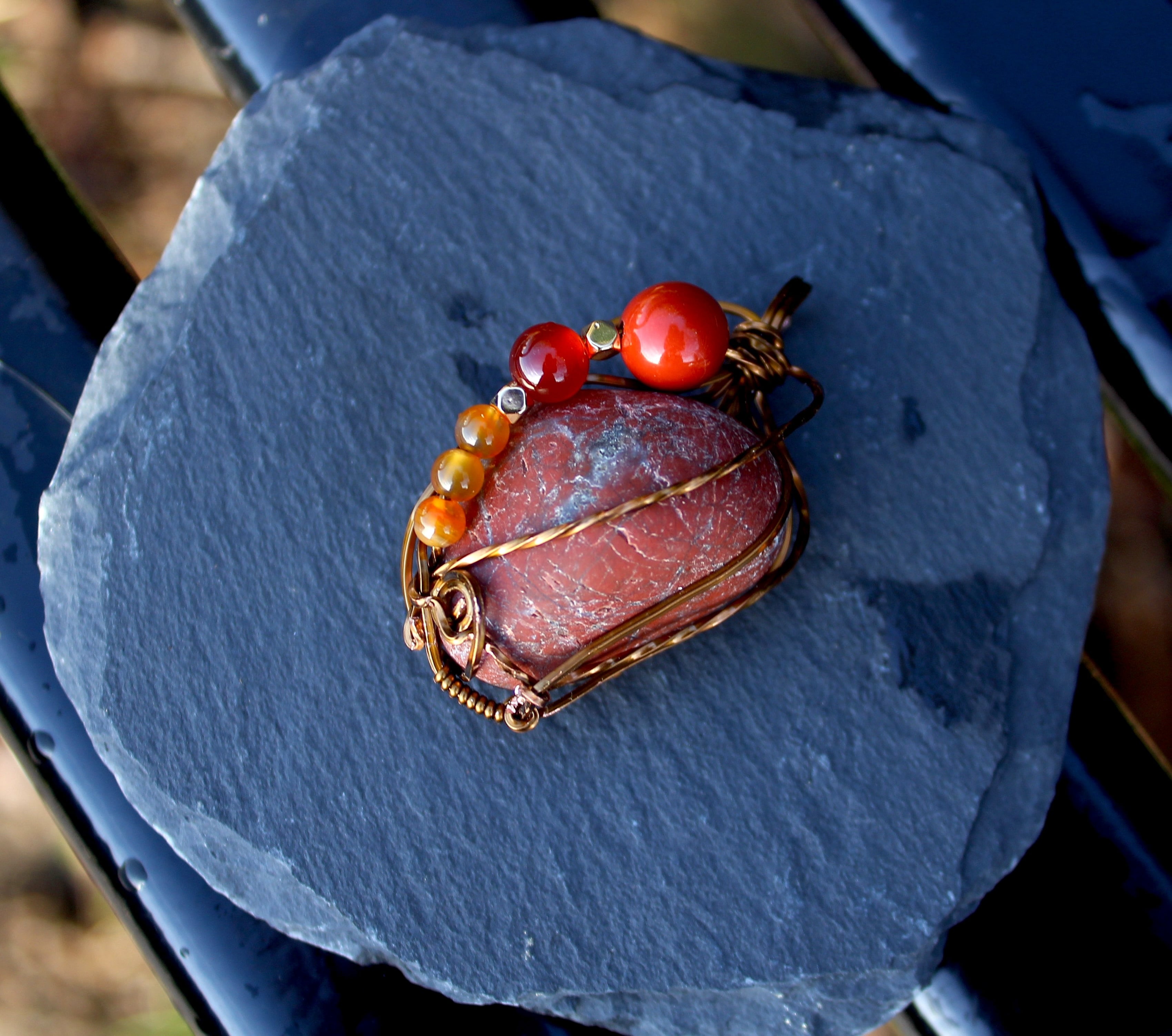 8ミリのレッドジャスパーと4ミリと6ミリのカーネリアンのビーズをあしらいました。