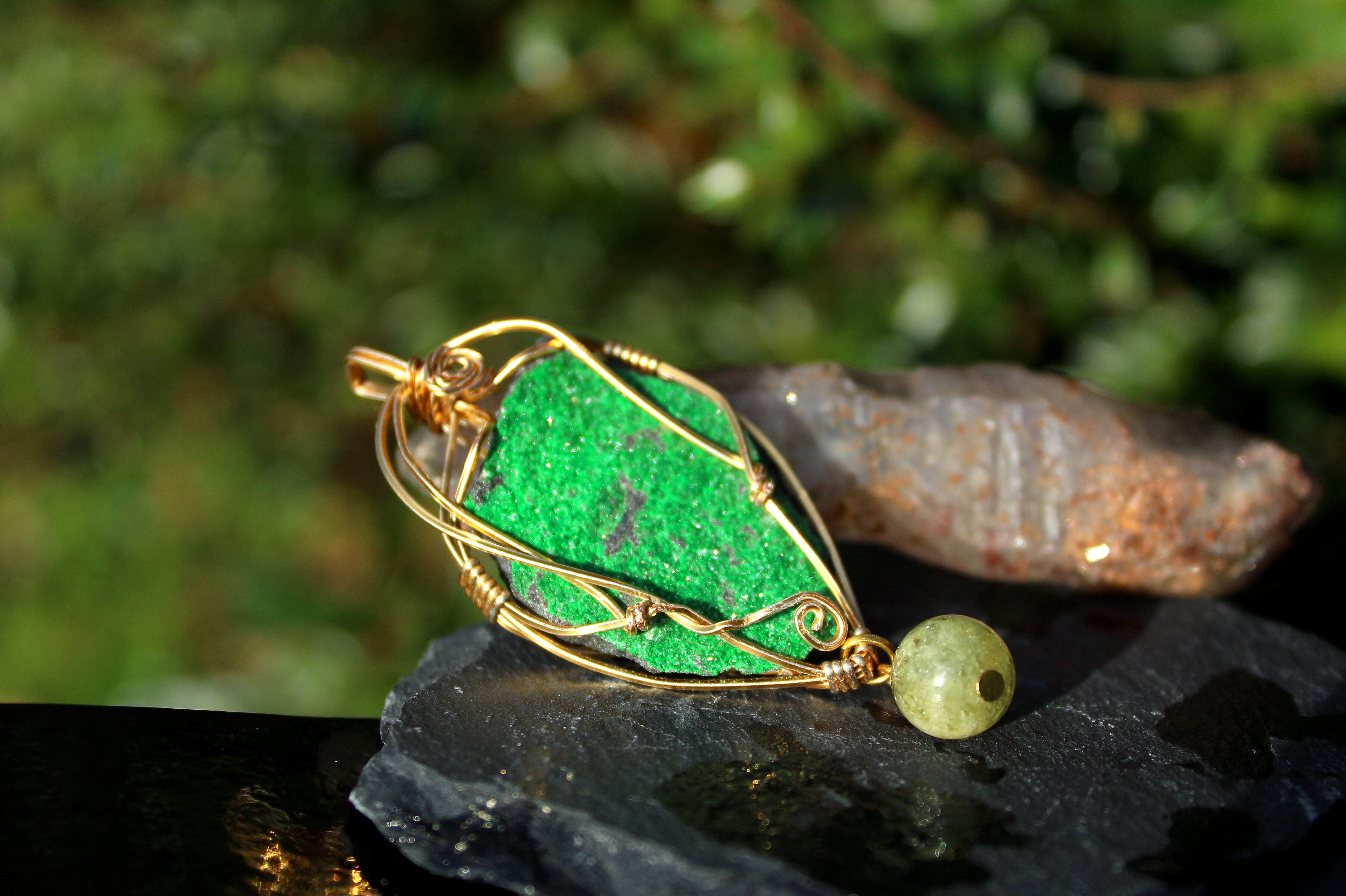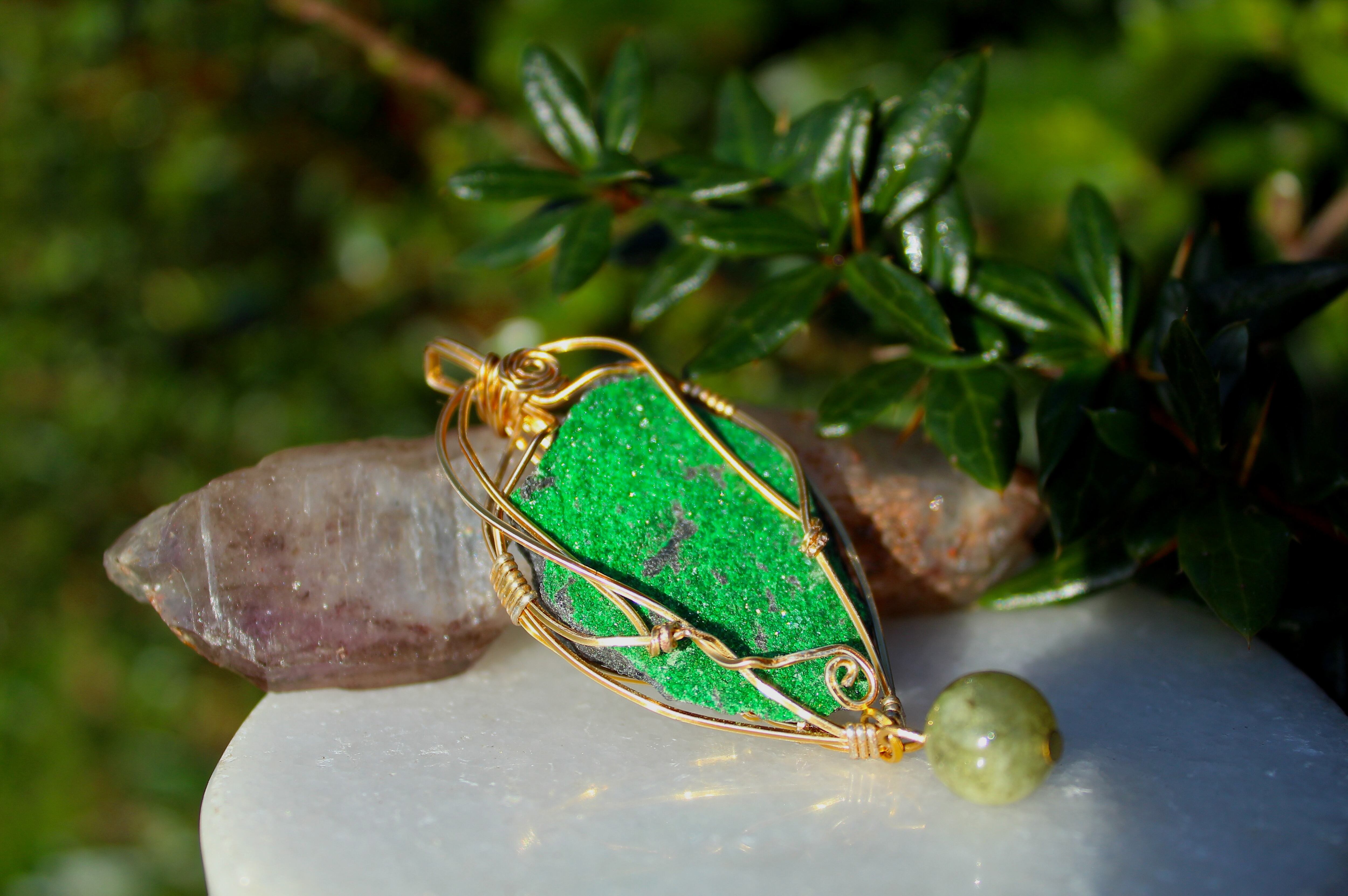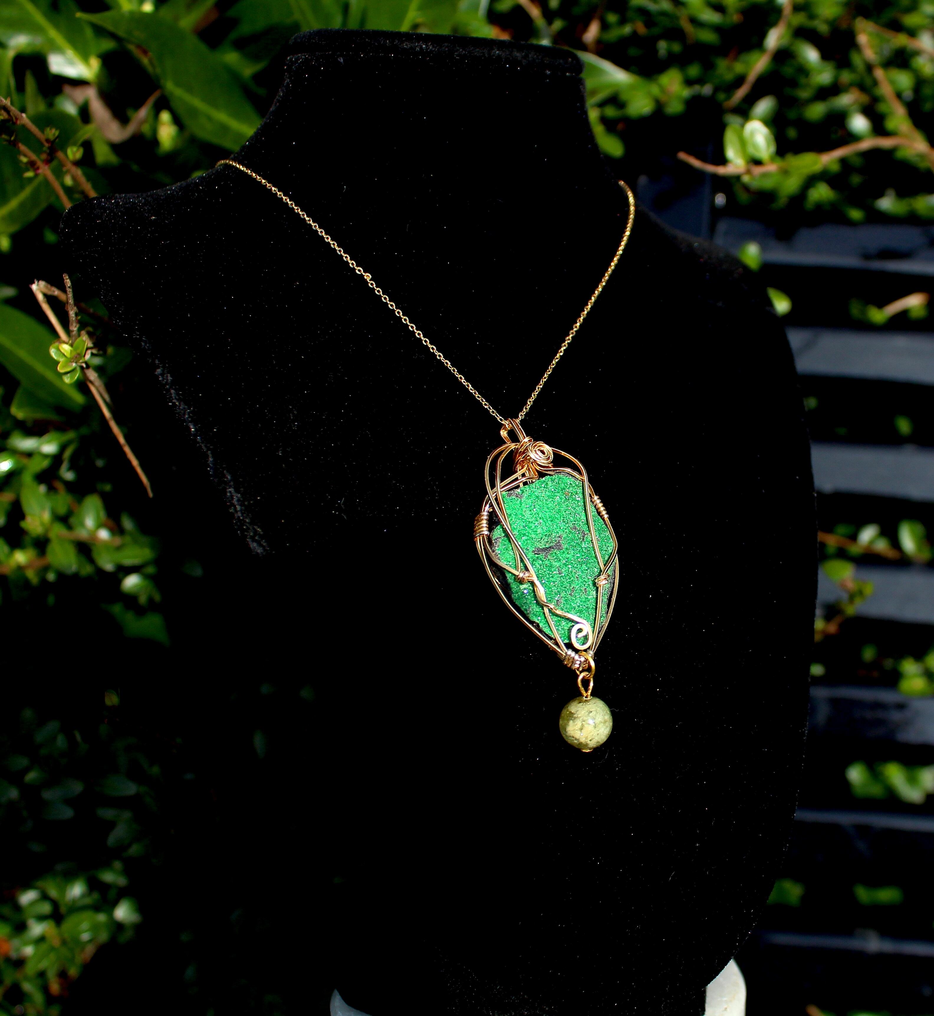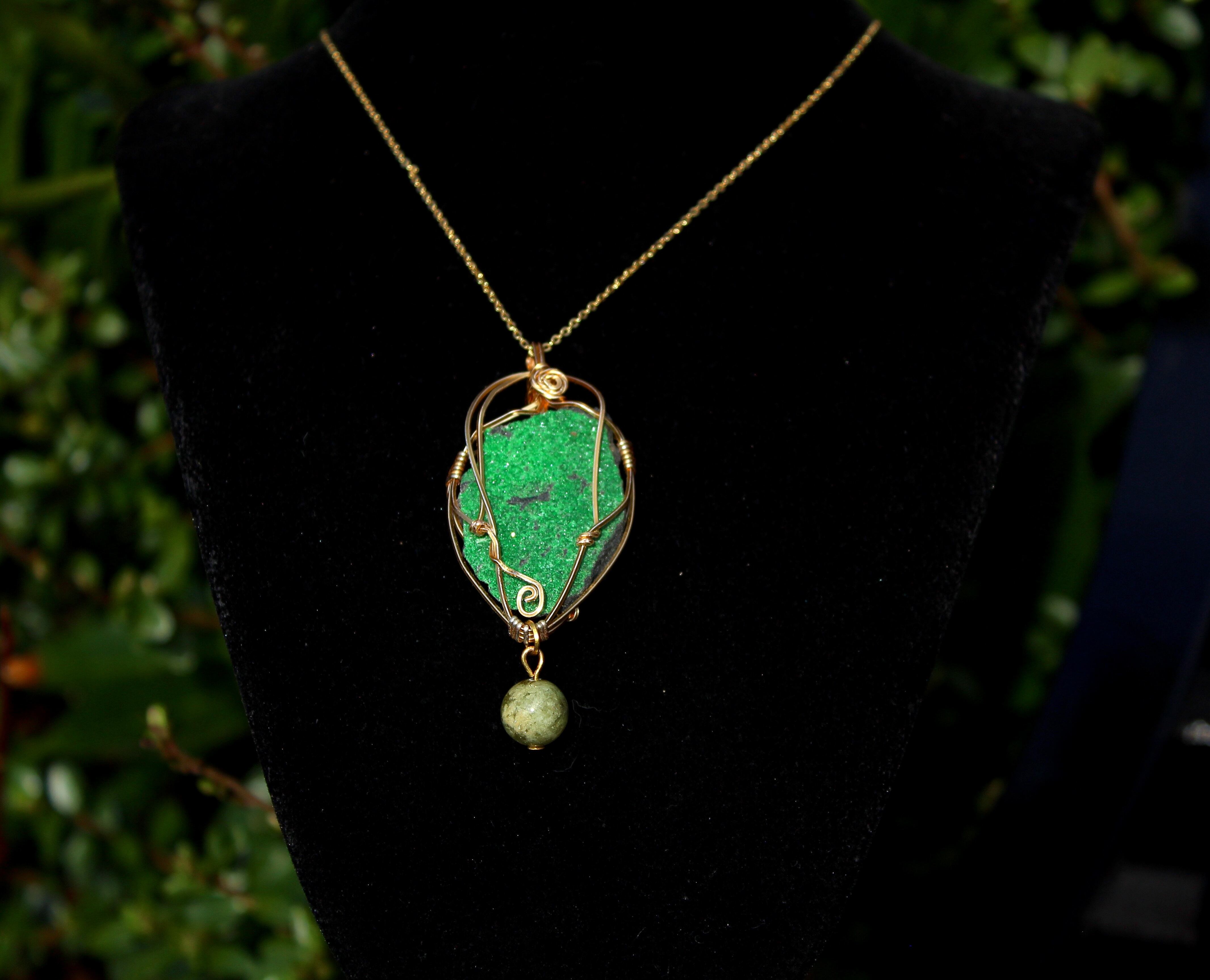 キラキラとした結晶が非常に美しいウバロバイトの原石です。ゴールドのワイヤーで巻いて、ツァボライトのビーズを付けました。