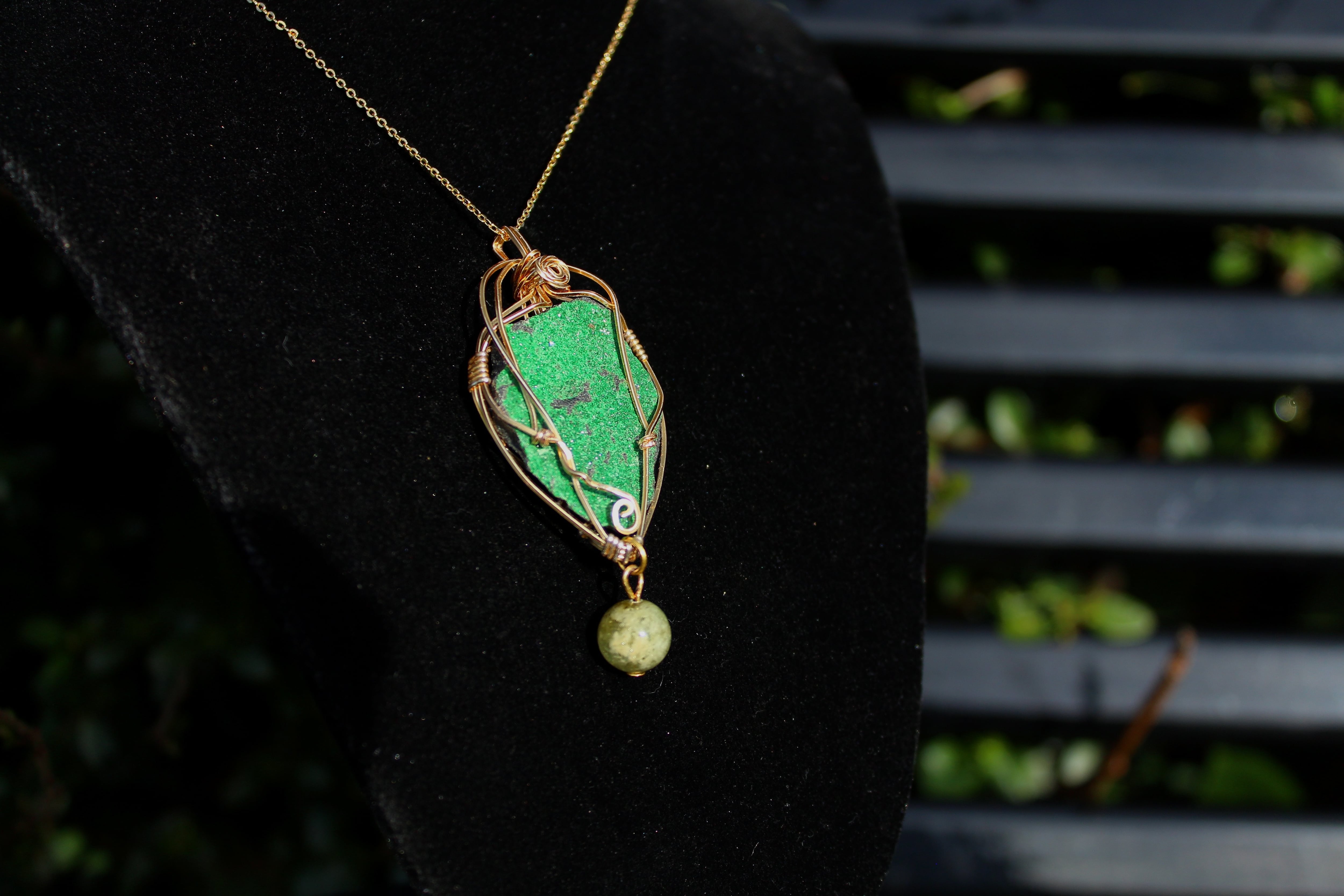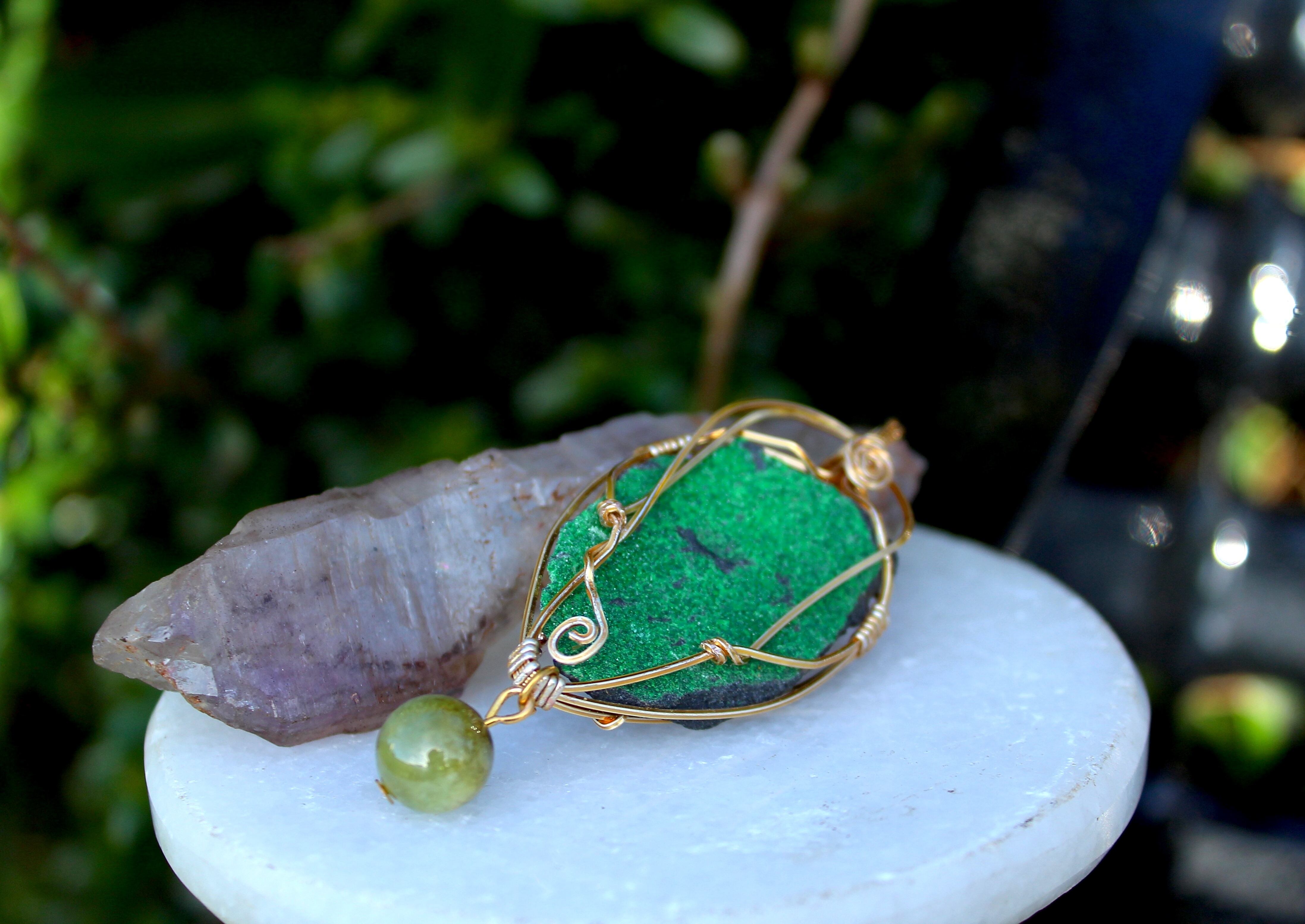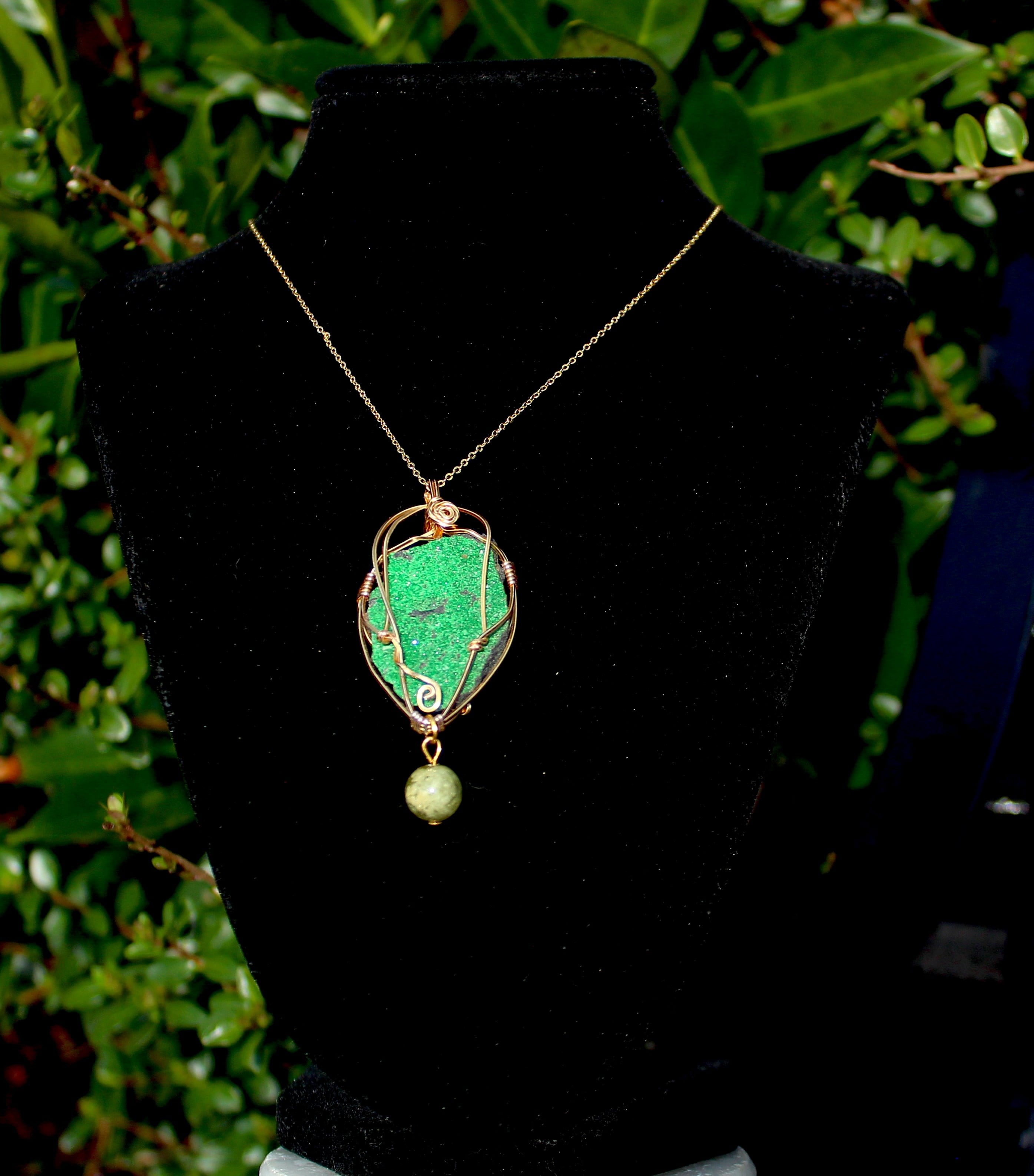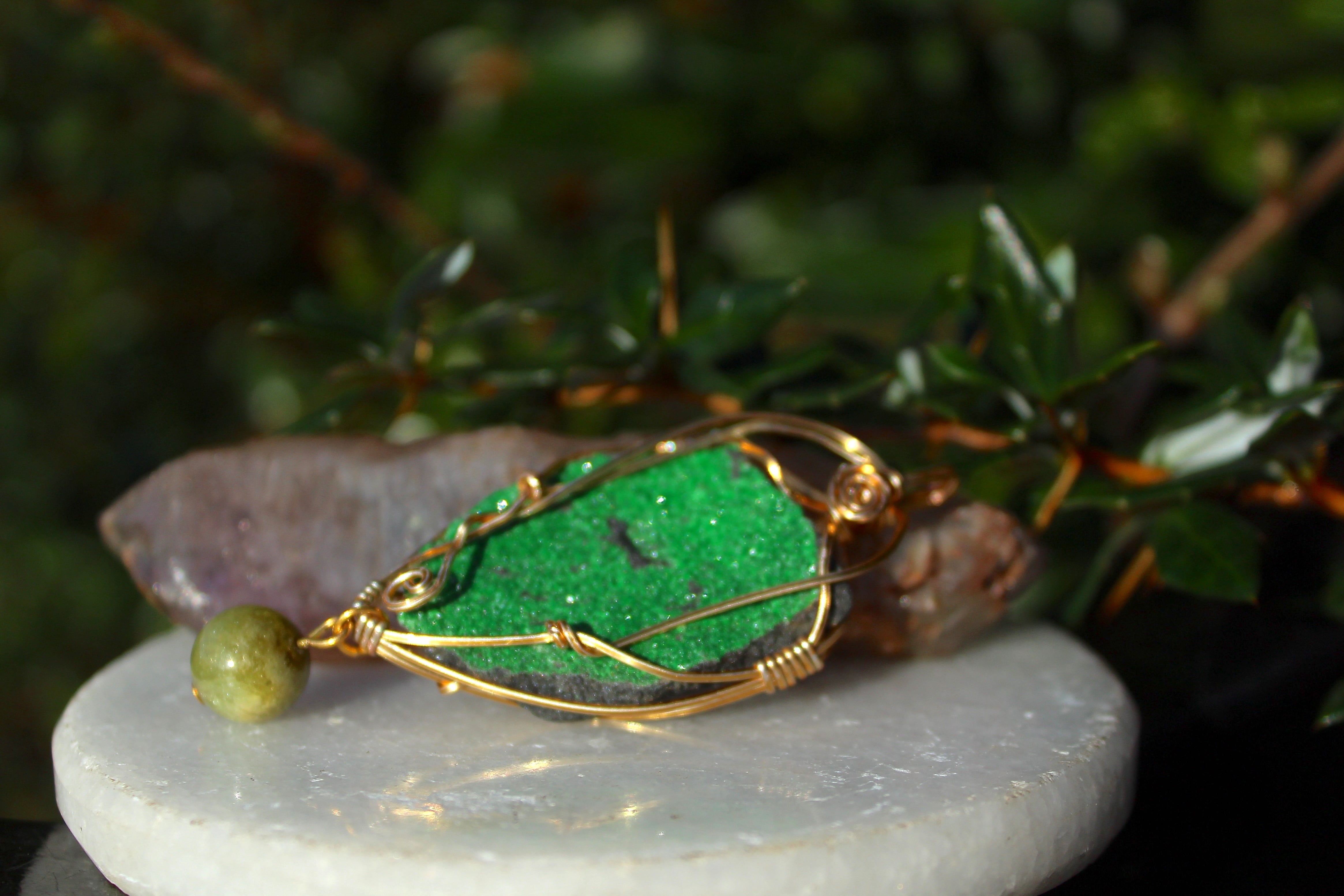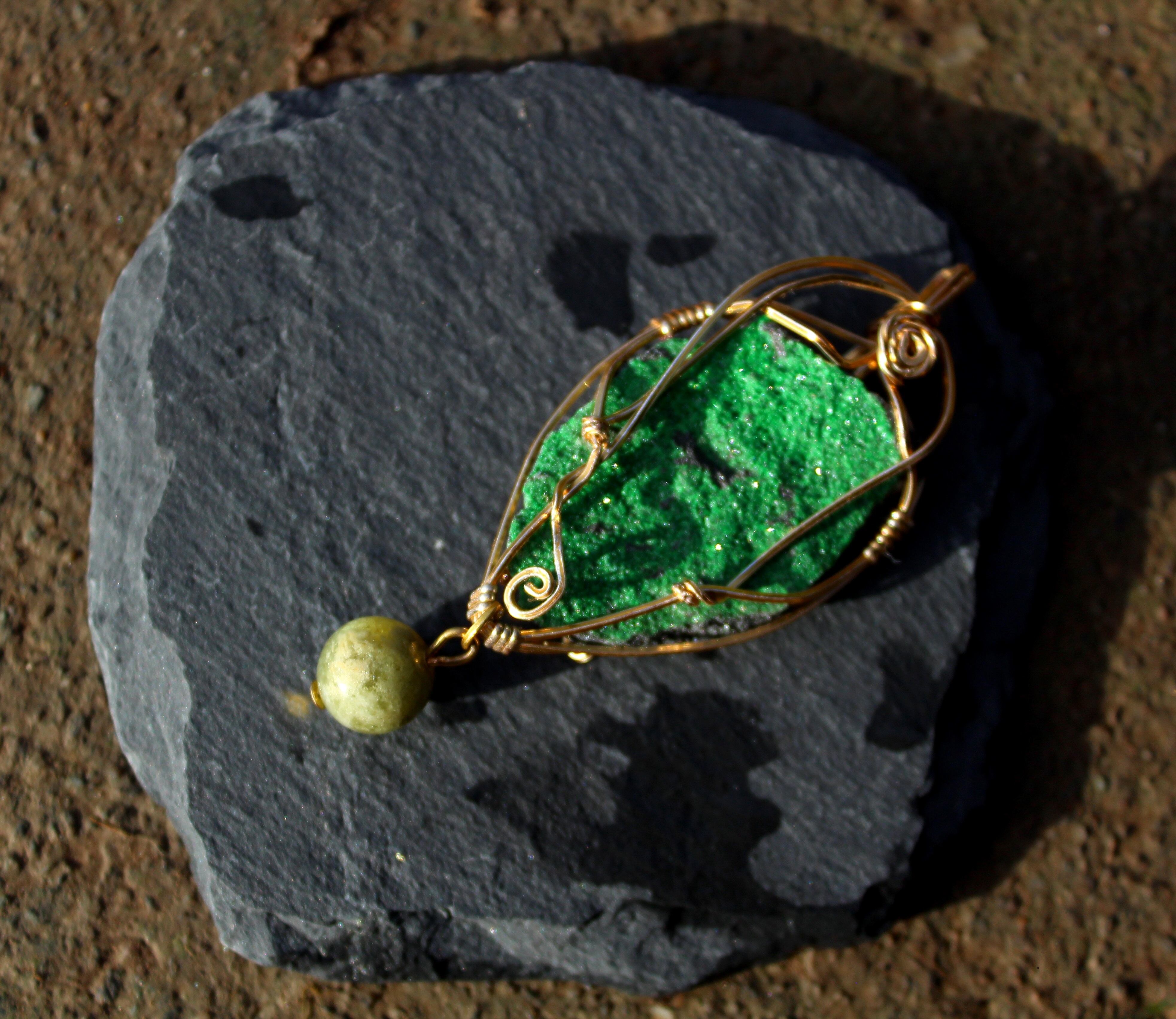 キラキラとした結晶が非常に美しいウバロバイトの原石です。ゴールドのワイヤーで巻いて、ツァボライトのビーズを付けました。